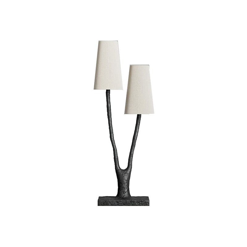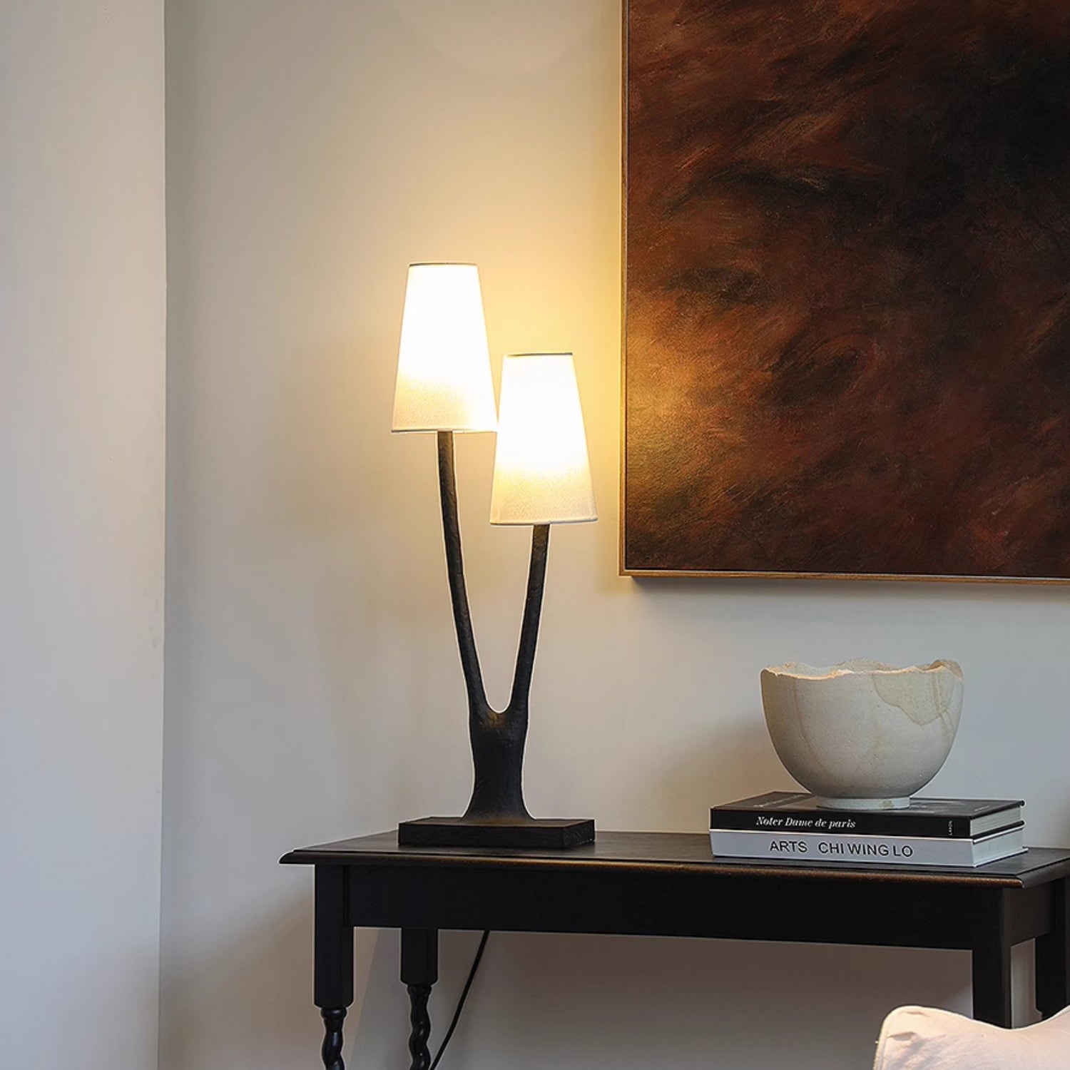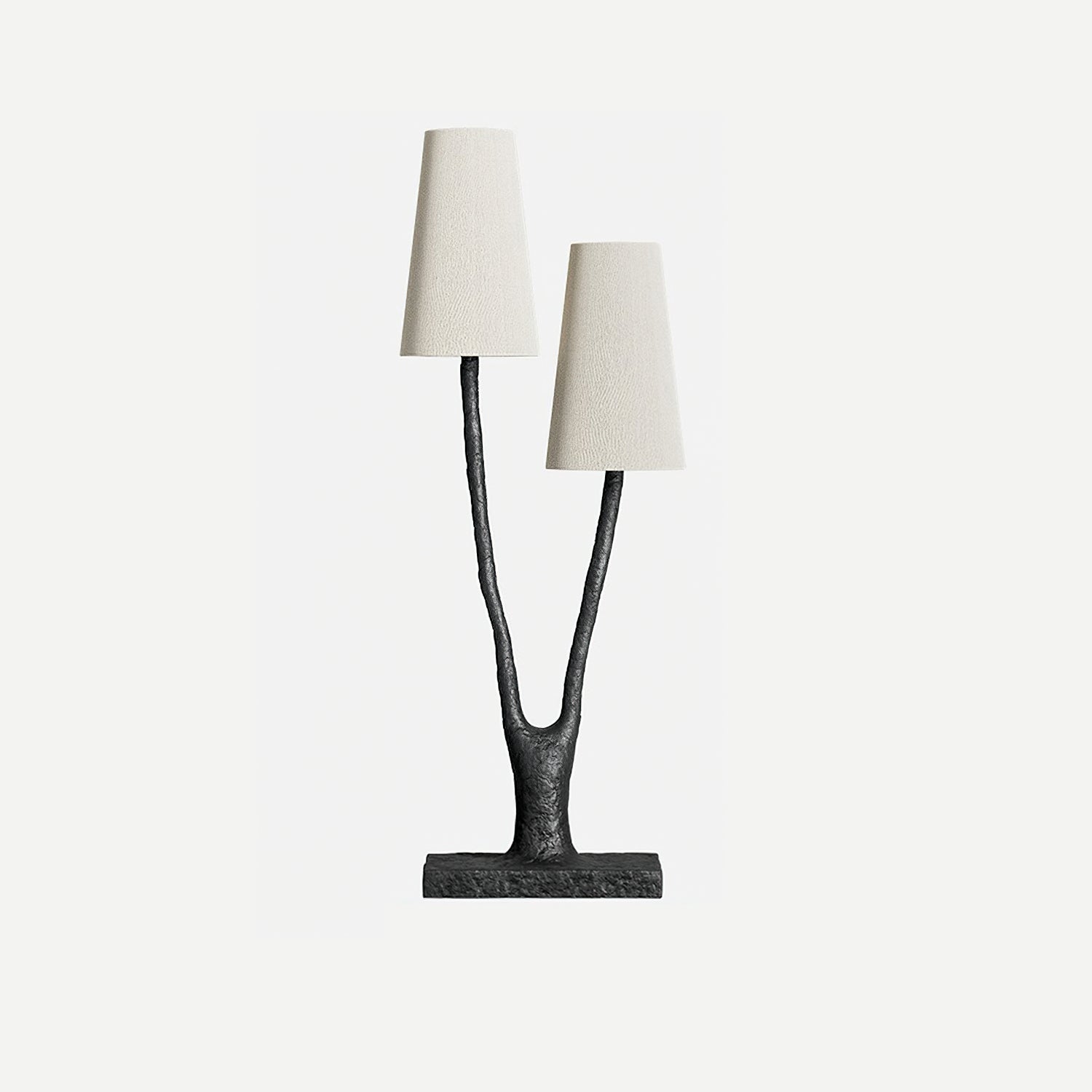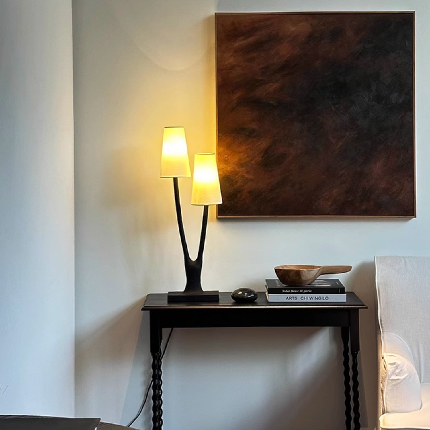 The Lofer Table Lamp from Mooijane draws inspiration from natural branches, combining sculptural form with refined materials. Crafted from hand-polished copper in a rich black bronze finish, its twin rods evoke the silhouette of branching limbs. Two slender, conical fabric shades are asymmetrically positioned to create visual rhythm and contrast. Emitting a soft, understated glow, this piece functions as both a light source and a work of modern art—perfect for studies, entryways, or living spaces seeking a calm, poetic atmosphere.
