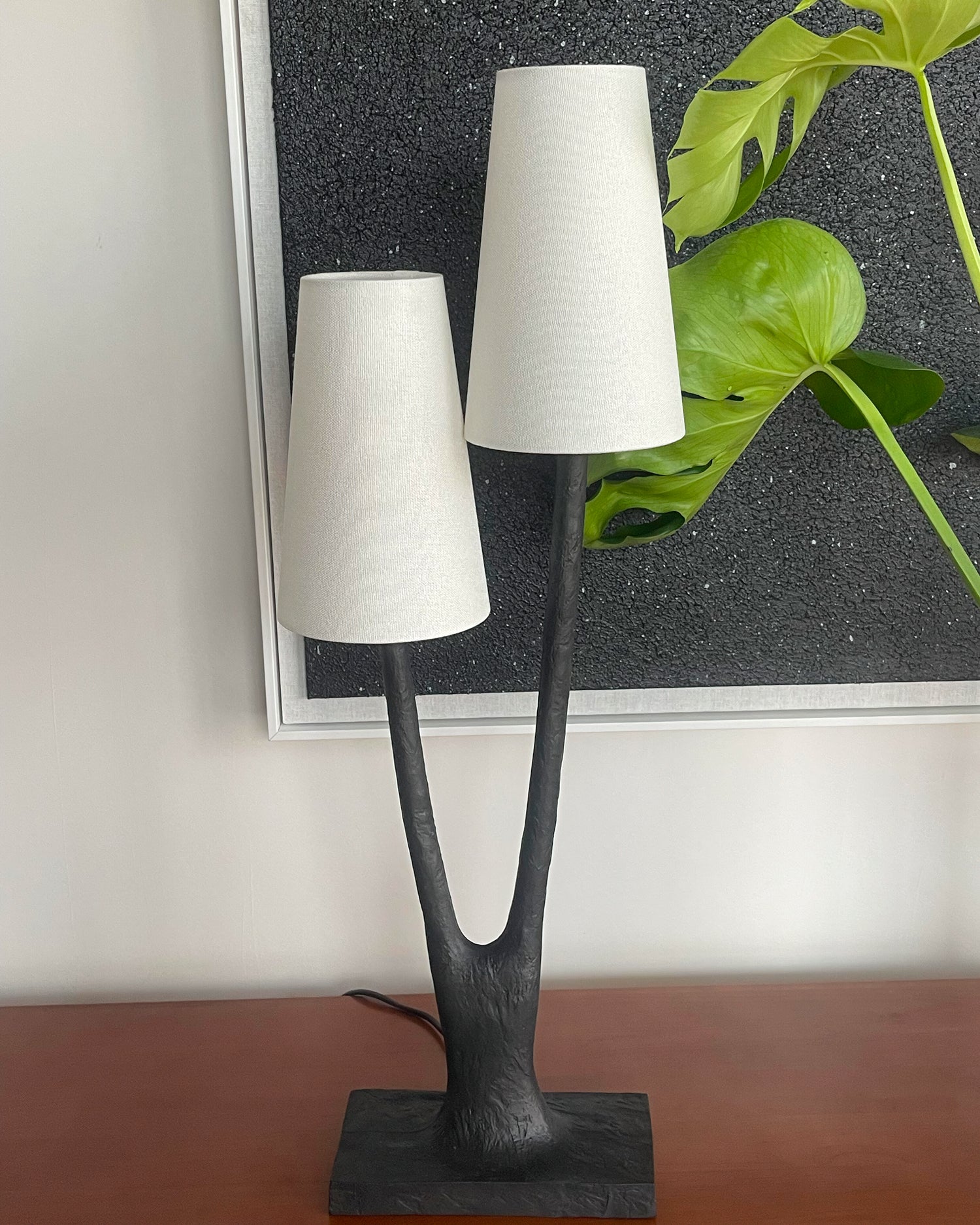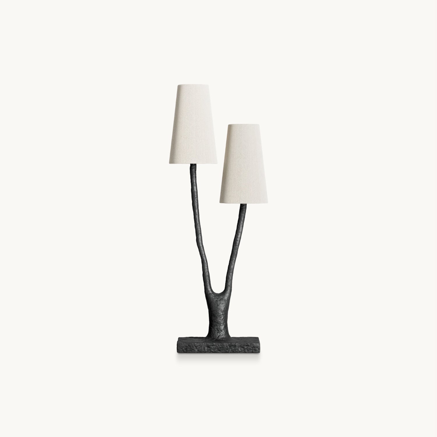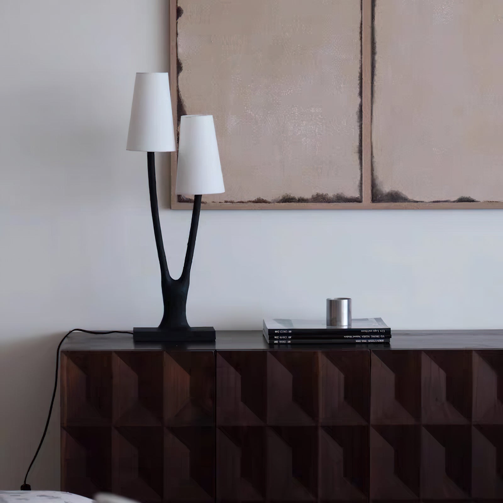 The Lofer Table Lamp from Mooijane draws inspiration from natural branches, combining sculptural form with refined materials. Crafted from hand-polished copper in a rich black bronze finish, its twin rods evoke the silhouette of branching limbs. Two slender, conical fabric shades are asymmetrically positioned to create visual rhythm and contrast. Emitting a soft, understated glow, this piece functions as both a light source and a work of modern art—perfect for studies, entryways, or living spaces seeking a calm, poetic atmosphere.