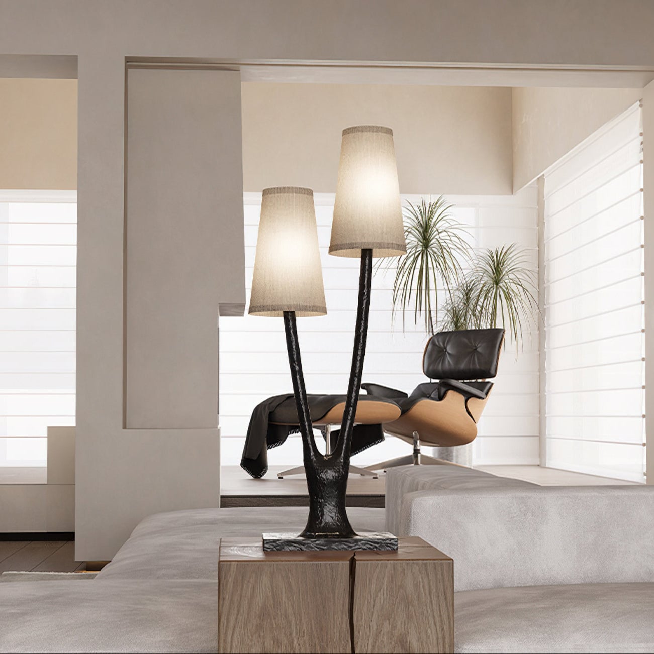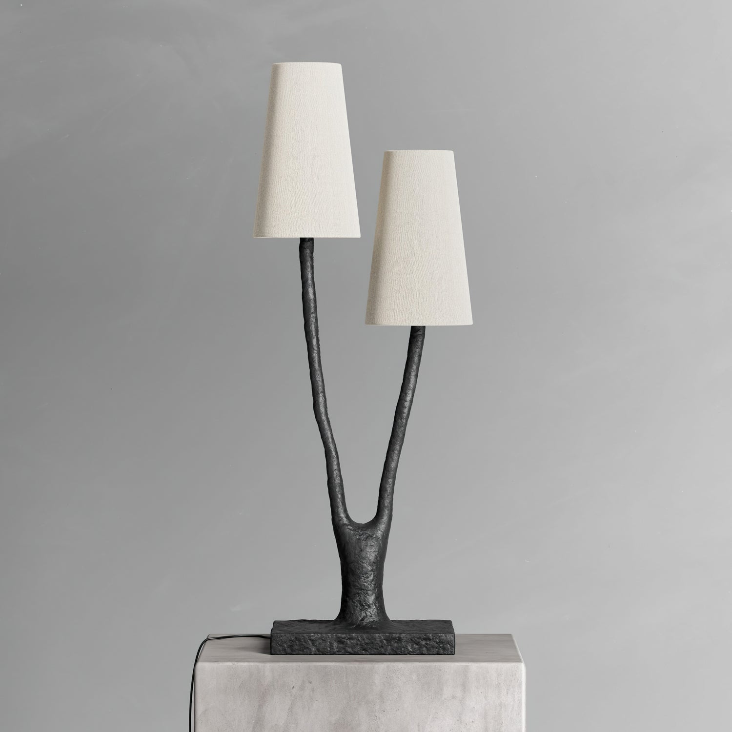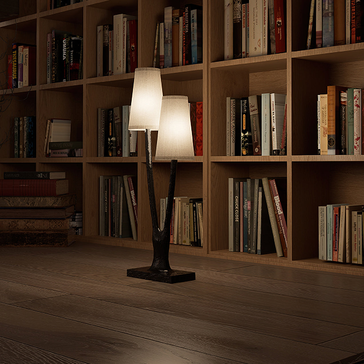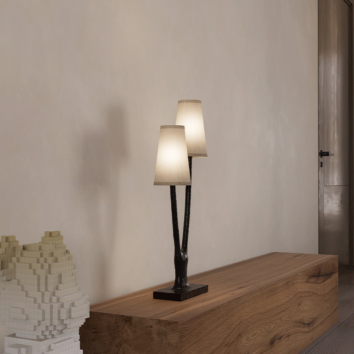 The Lofer Table Lamp from Mooijane draws inspiration from natural branches, combining sculptural form with refined materials. Crafted from hand-polished copper in a rich black bronze finish, its twin rods evoke the silhouette of branching limbs. Two slender, conical fabric shades are asymmetrically positioned to create visual rhythm and contrast. Emitting a soft, understated glow, this piece functions as both a light source and a work of modern art—perfect for studies, entryways, or living spaces seeking a calm, poetic atmosphere.