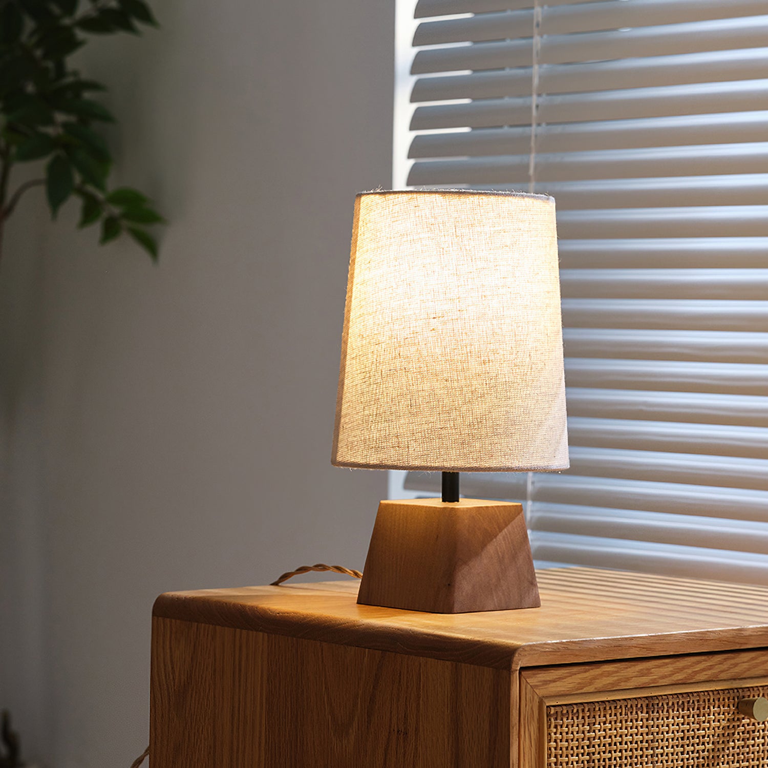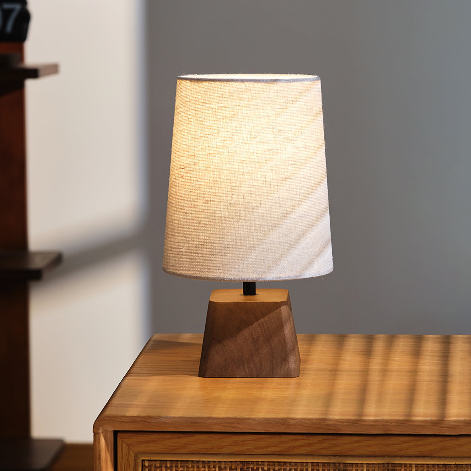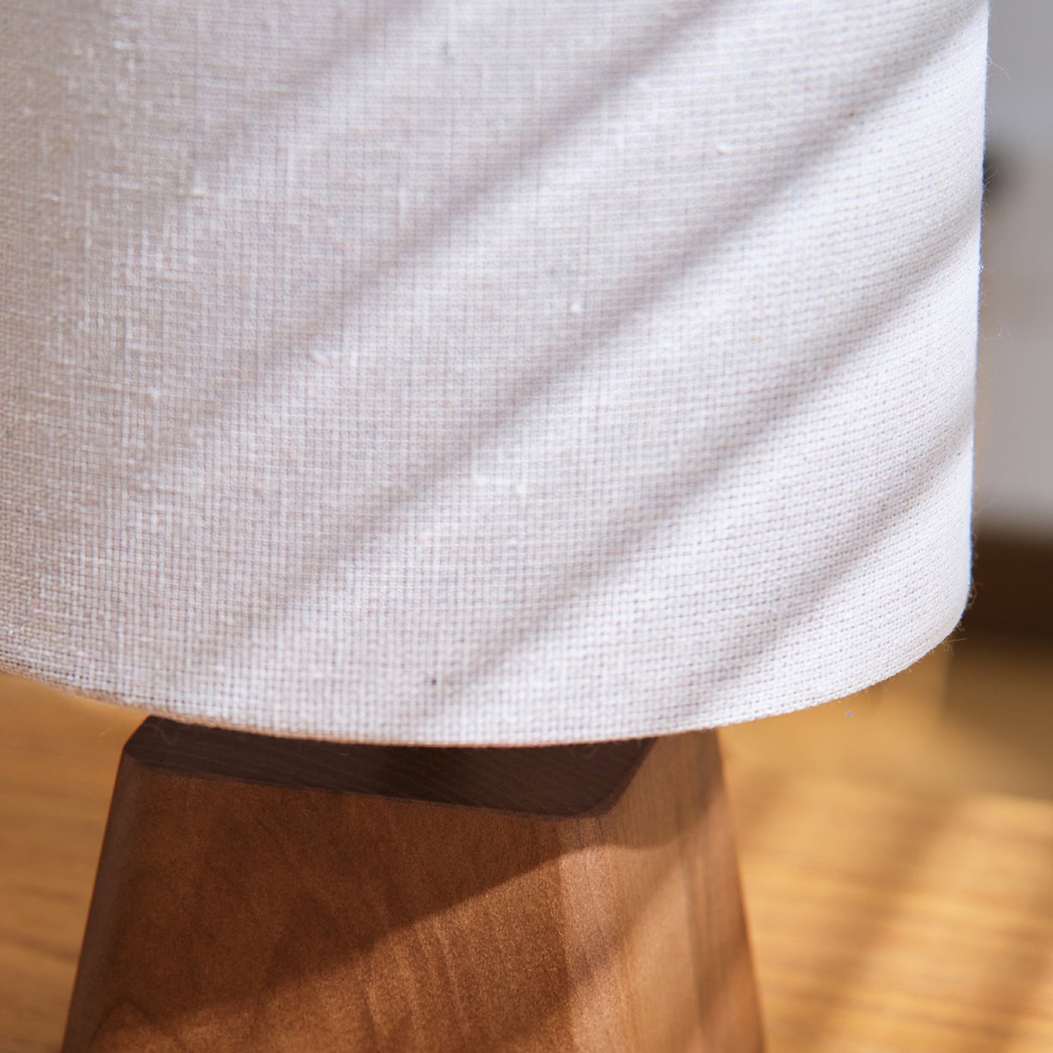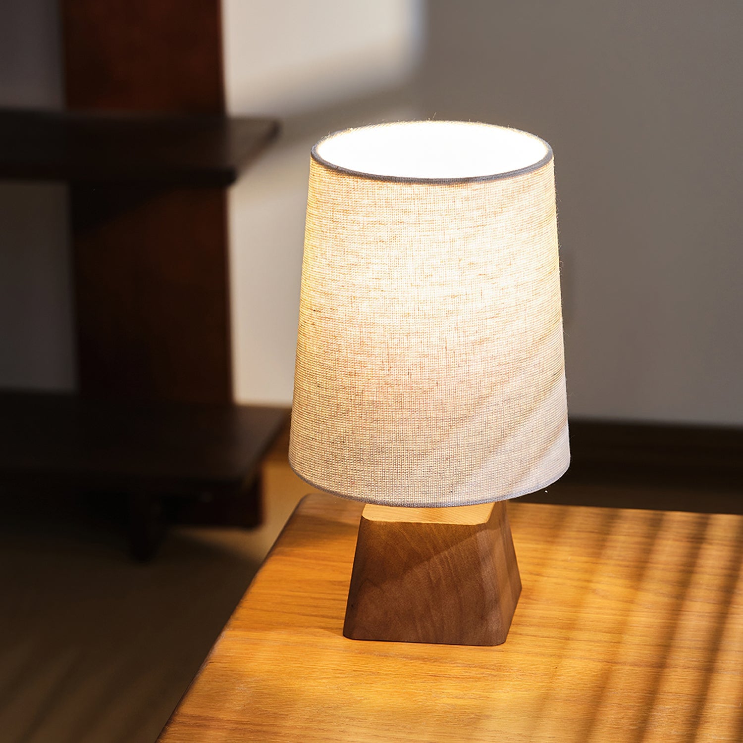The Lotoni Table Lamp from Mooijane reflects a quiet, natural elegance with its handcrafted design. The solid wood base features an irregular geometric shape and soft grain, evoking the warmth of hand-carved artistry. Topped with a linen-textured fabric shade in muted tones, it diffuses a gentle, ambient glow. Supported by a durable internal metal frame, this lamp is perfect for bedside tables, desks, or any space styled with natural or Japanese-inspired décor. Simple, calming, and timeless.