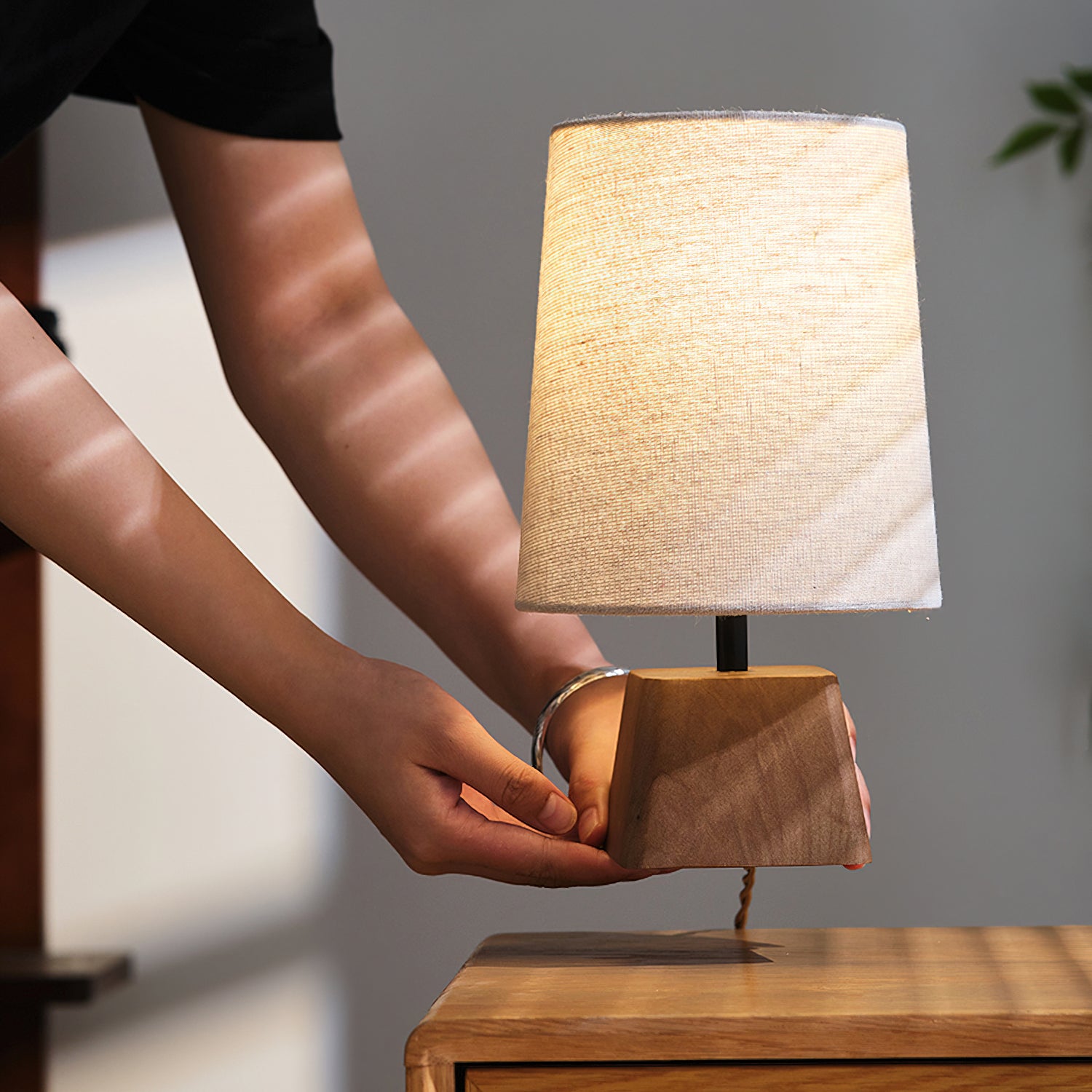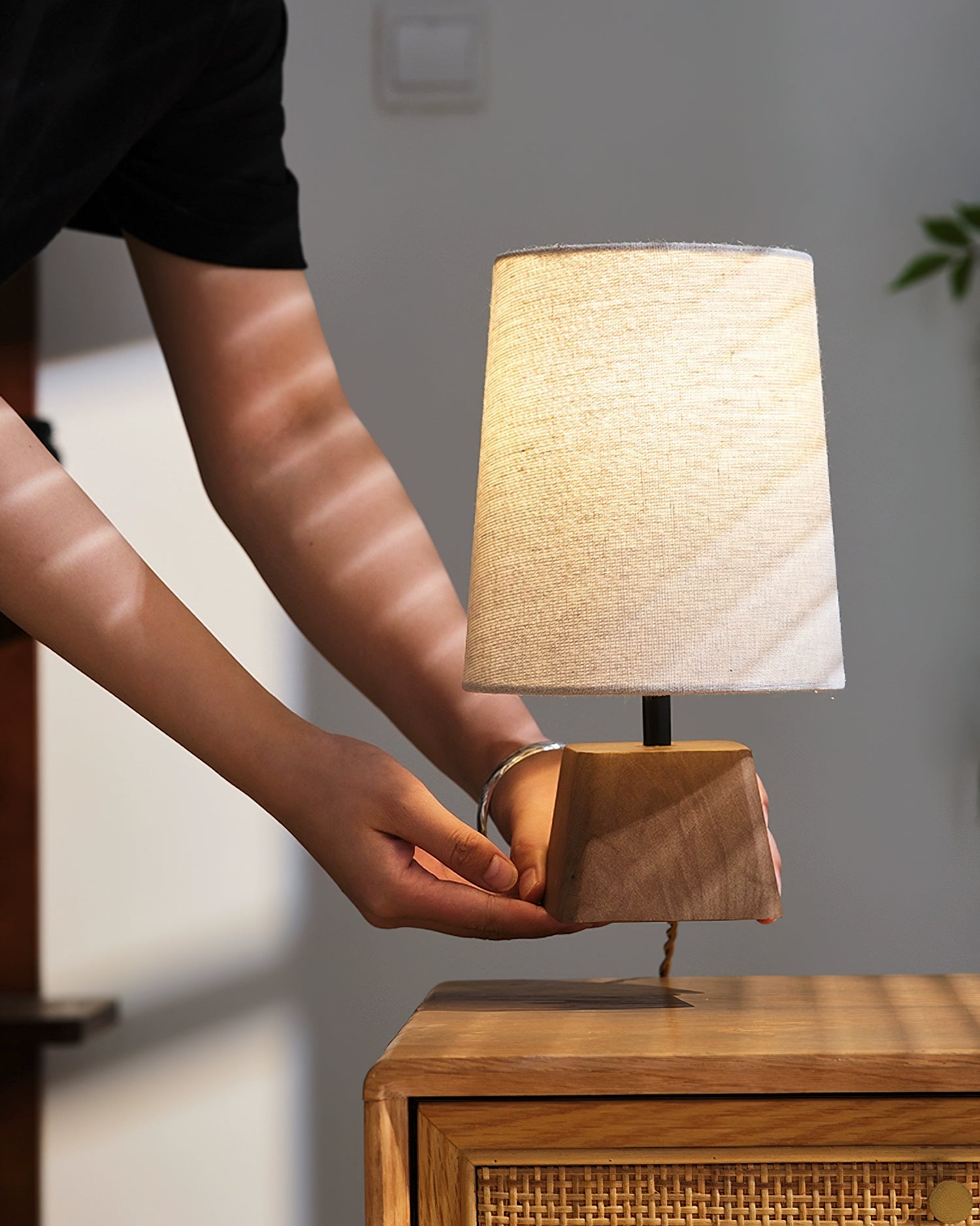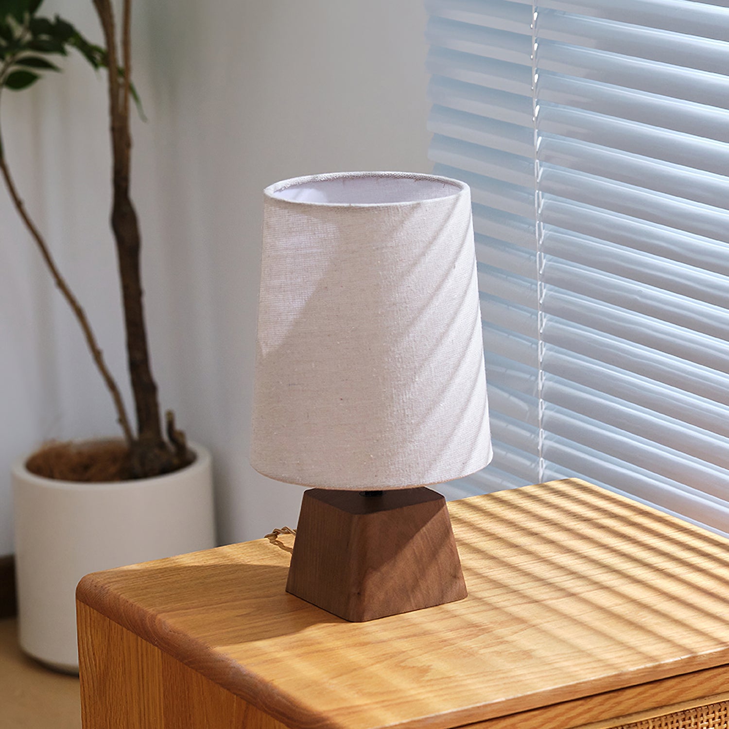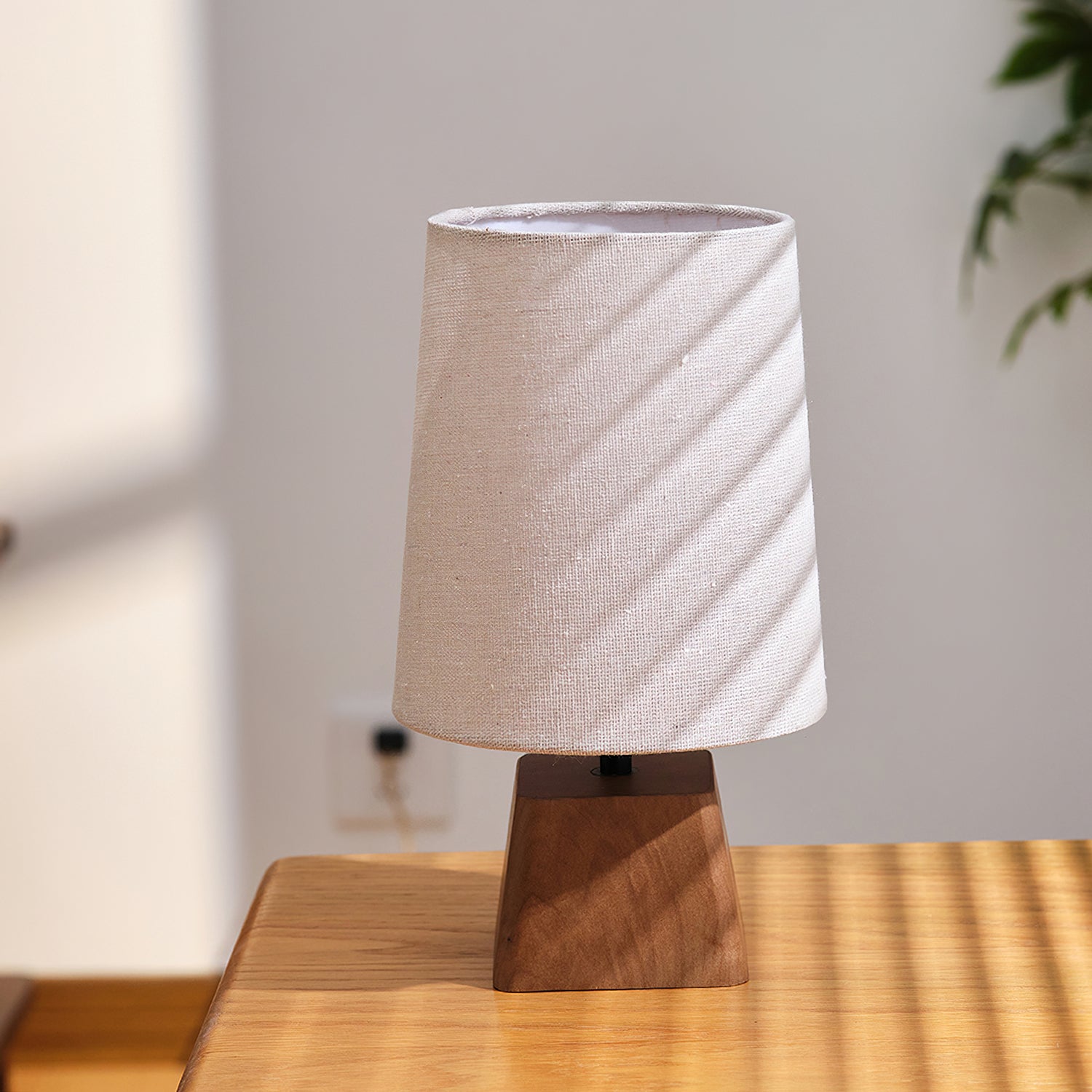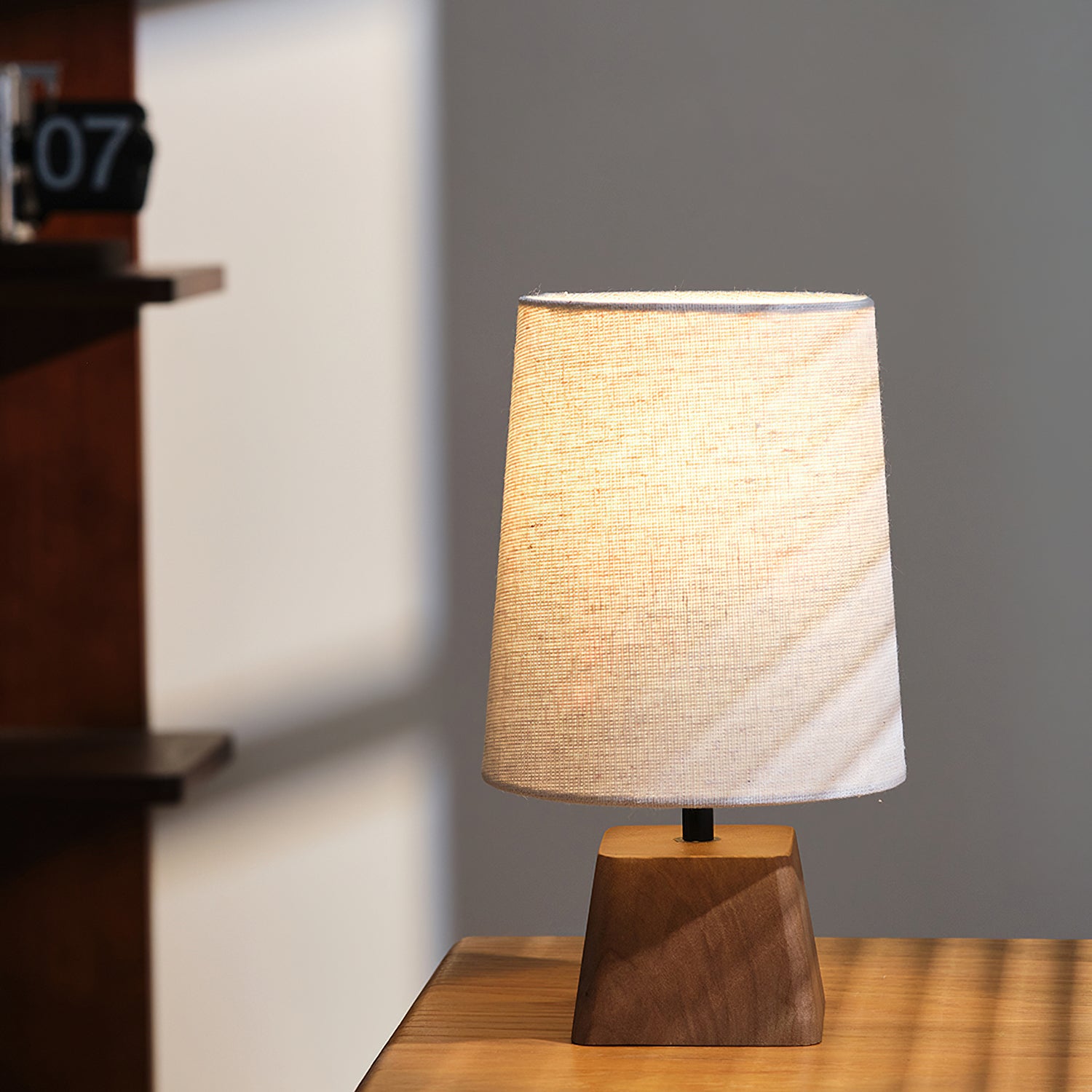 The Lotoni Table Lamp from Mooijane reflects a quiet, natural elegance with its handcrafted design. The solid wood base features an irregular geometric shape and soft grain, evoking the warmth of hand-carved artistry. Topped with a linen-textured fabric shade in muted tones, it diffuses a gentle, ambient glow. Supported by a durable internal metal frame, this lamp is perfect for bedside tables, desks, or any space styled with natural or Japanese-inspired décor. Simple, calming, and timeless.