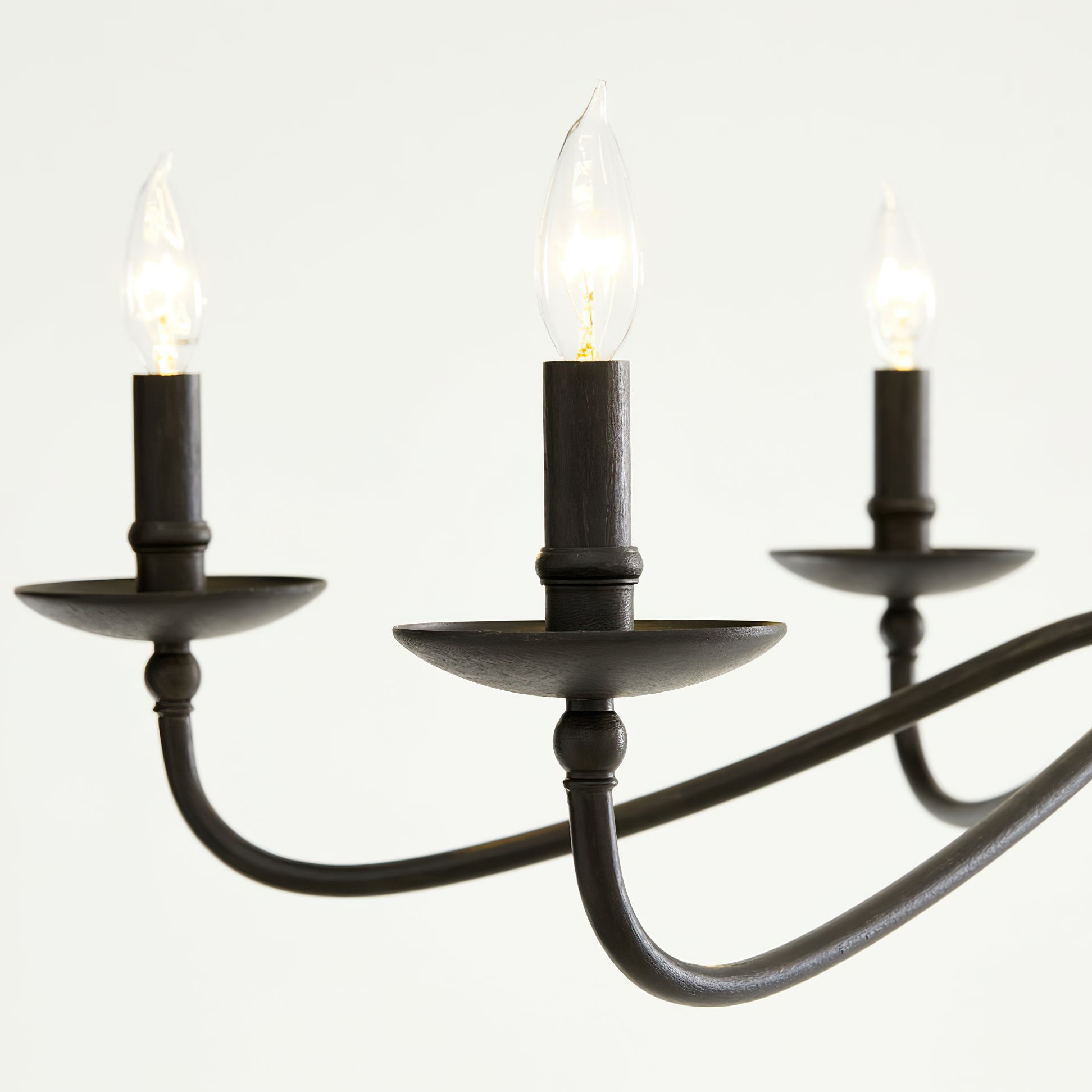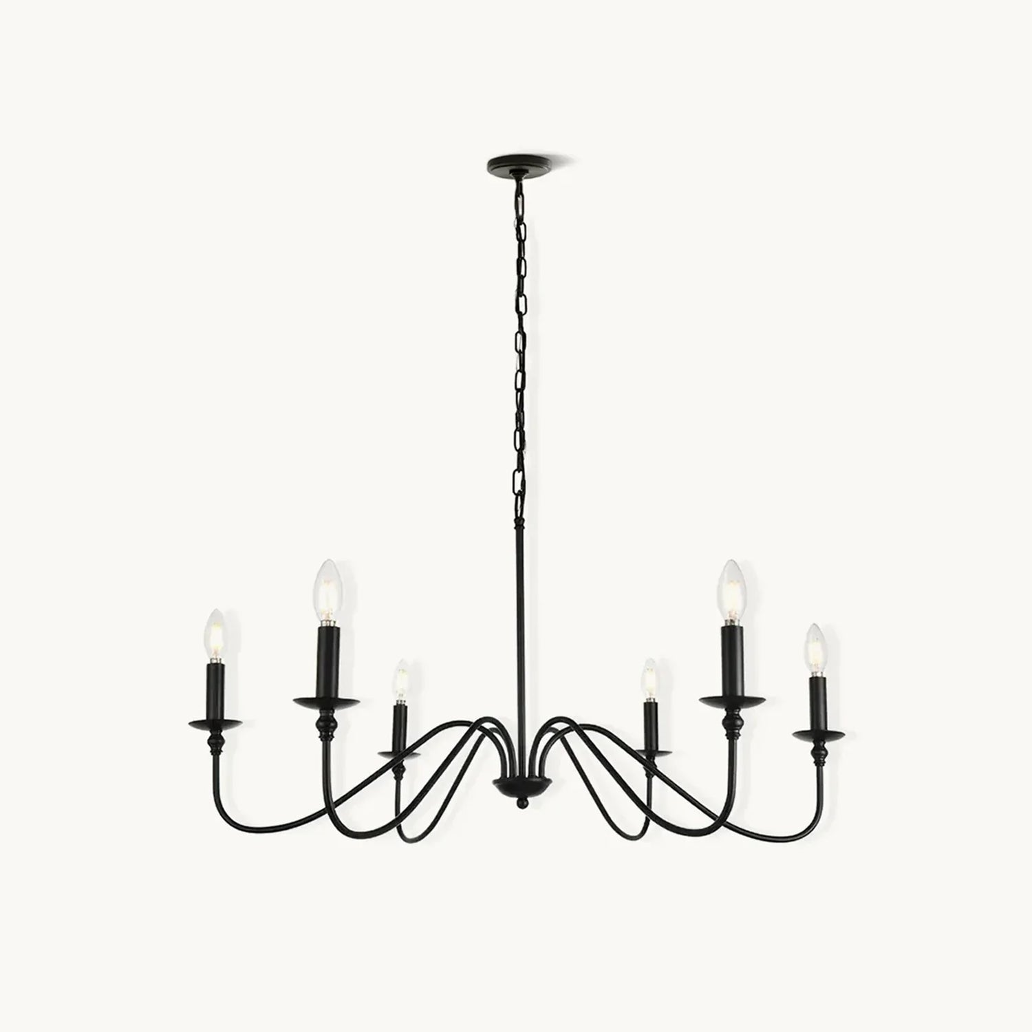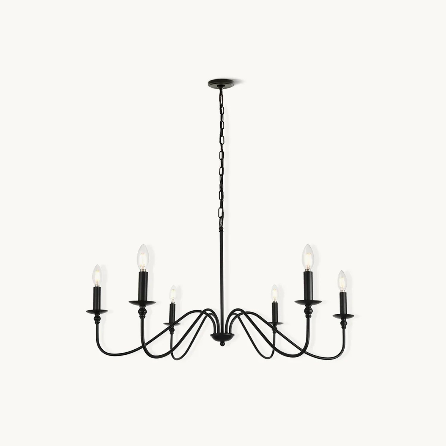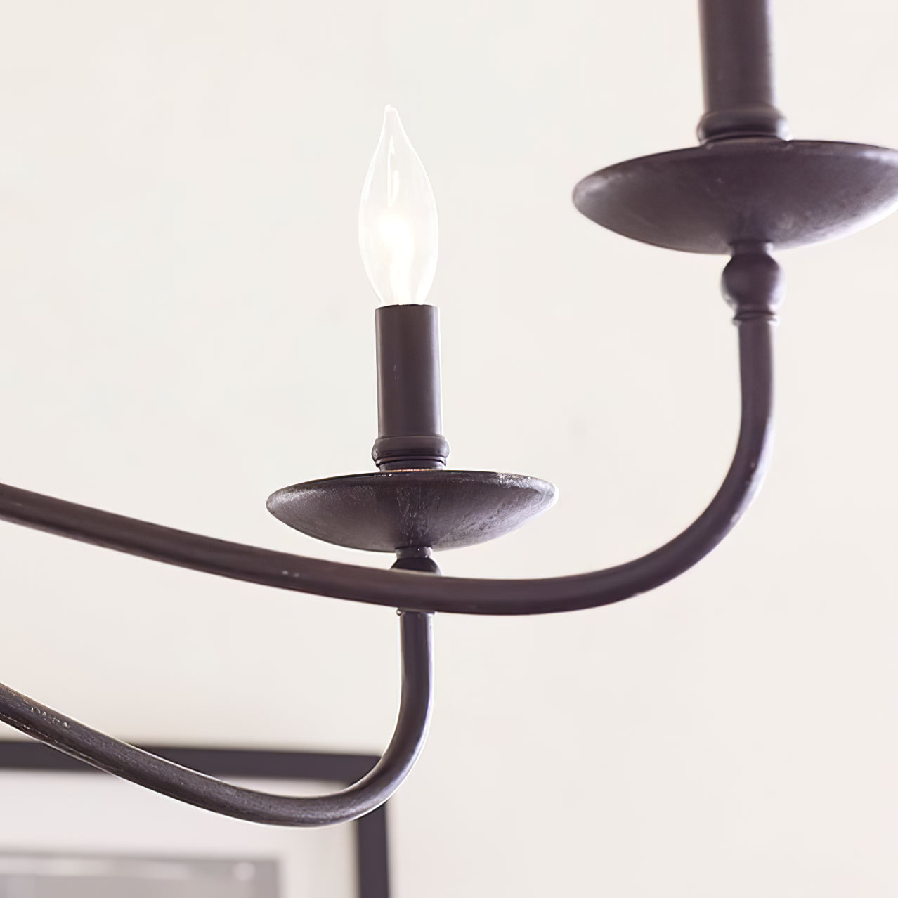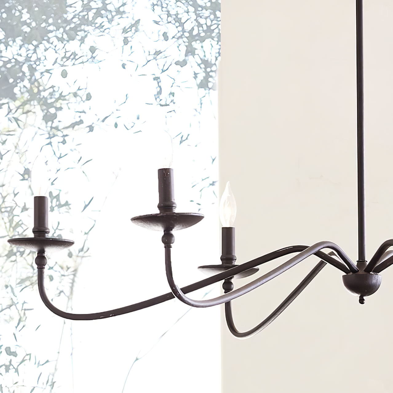 This lighting collection has a simultaneously solid and lightweight look. The wrapped iron gives each fixture a dark, robust feeling, but the swaging arms and saucer-like electric-candle sleeves feel just a touch feminine.