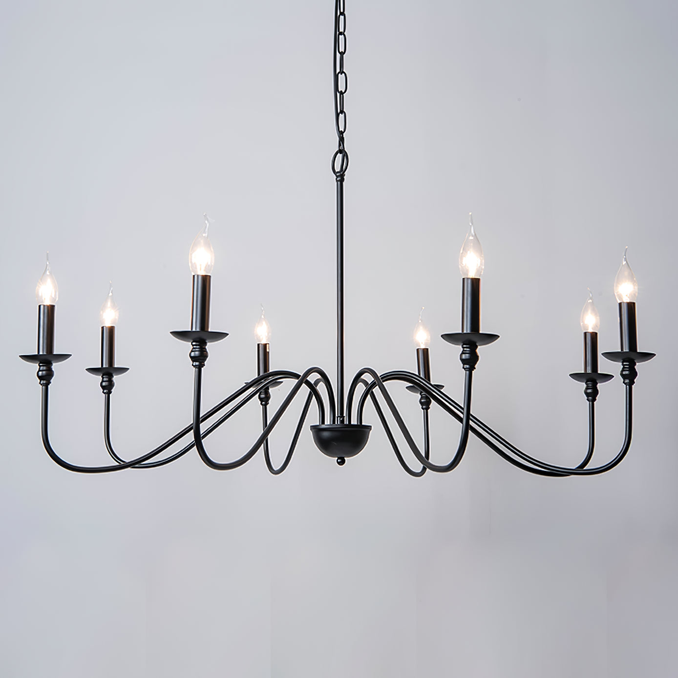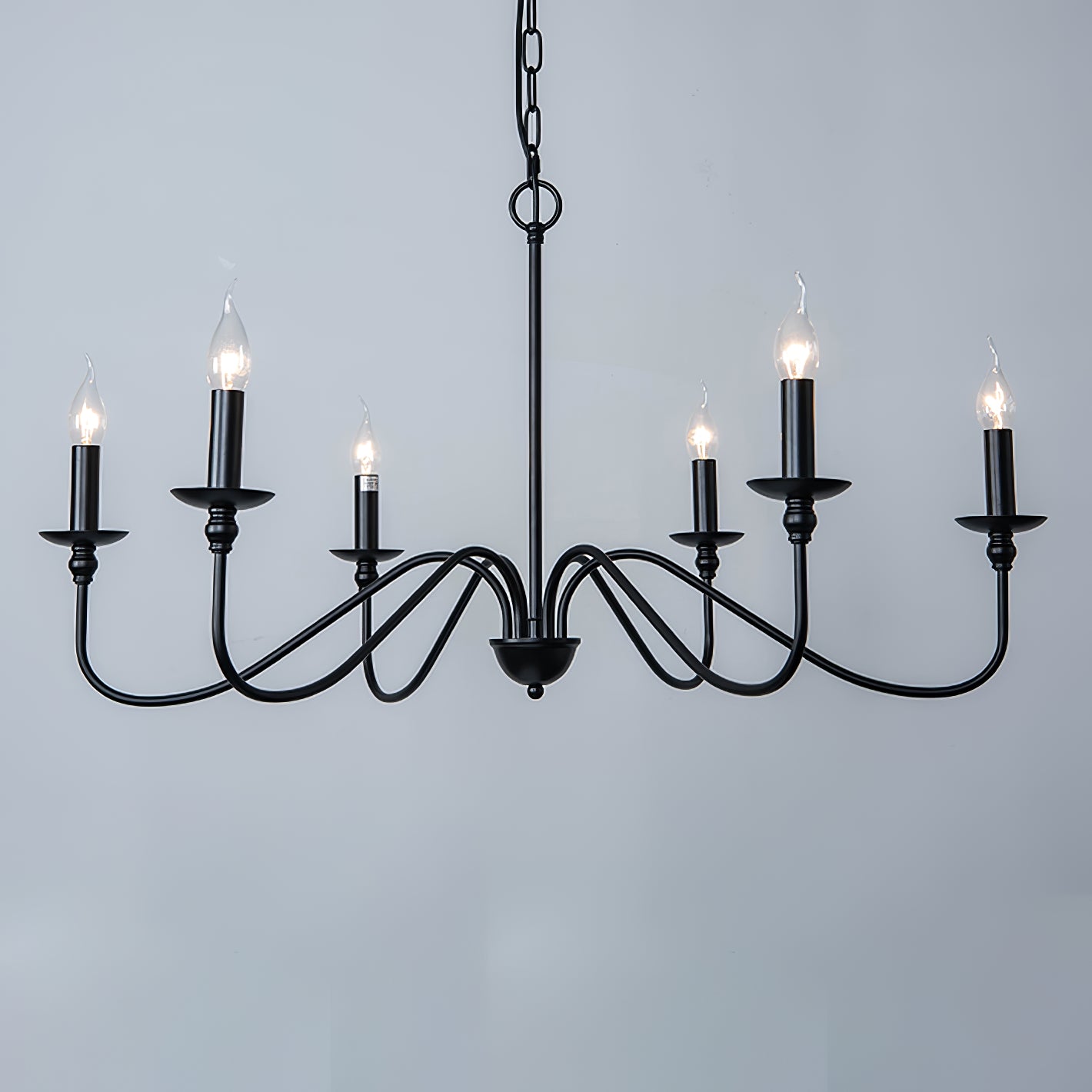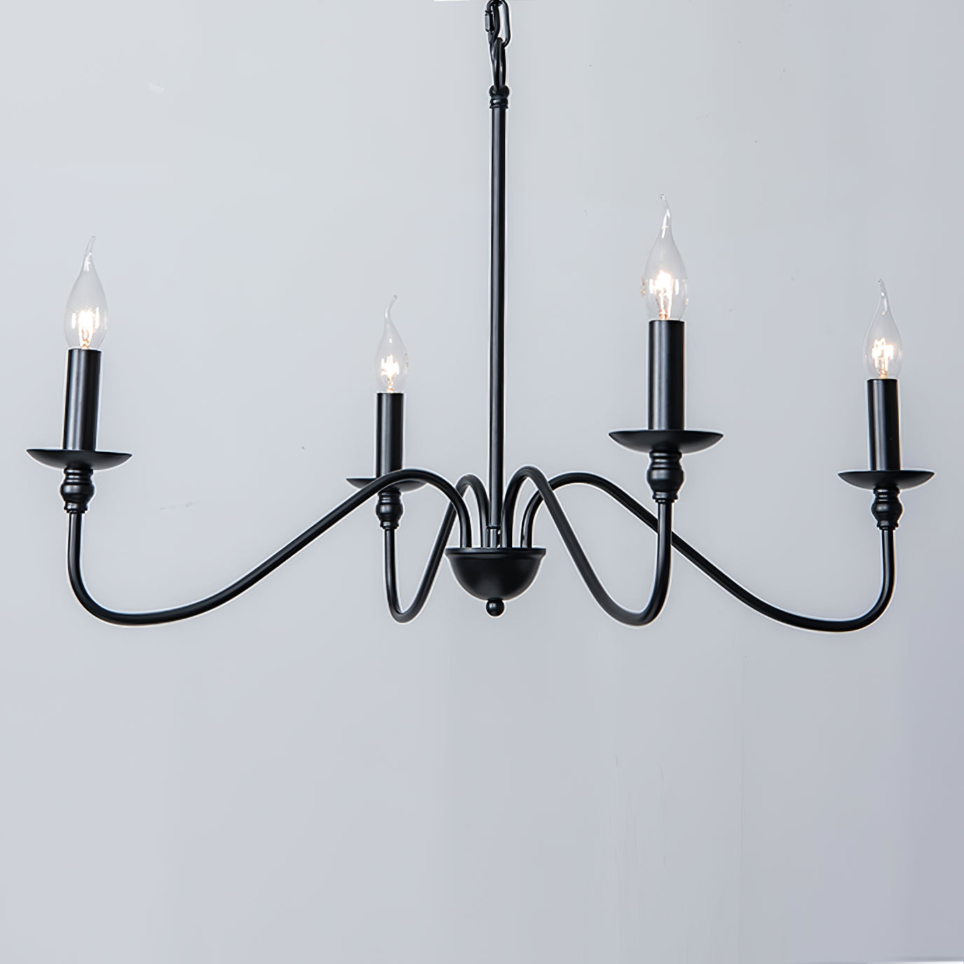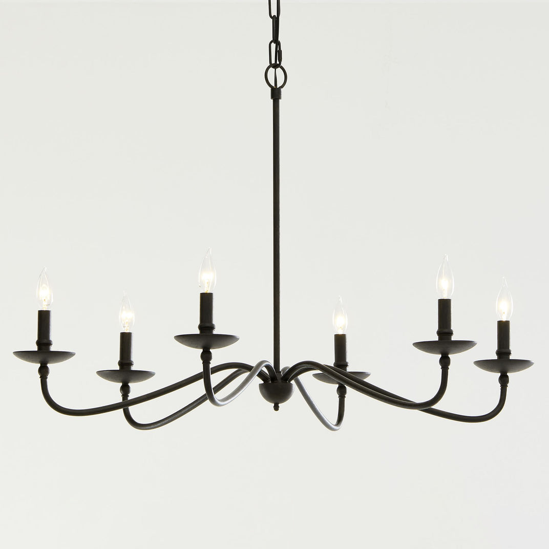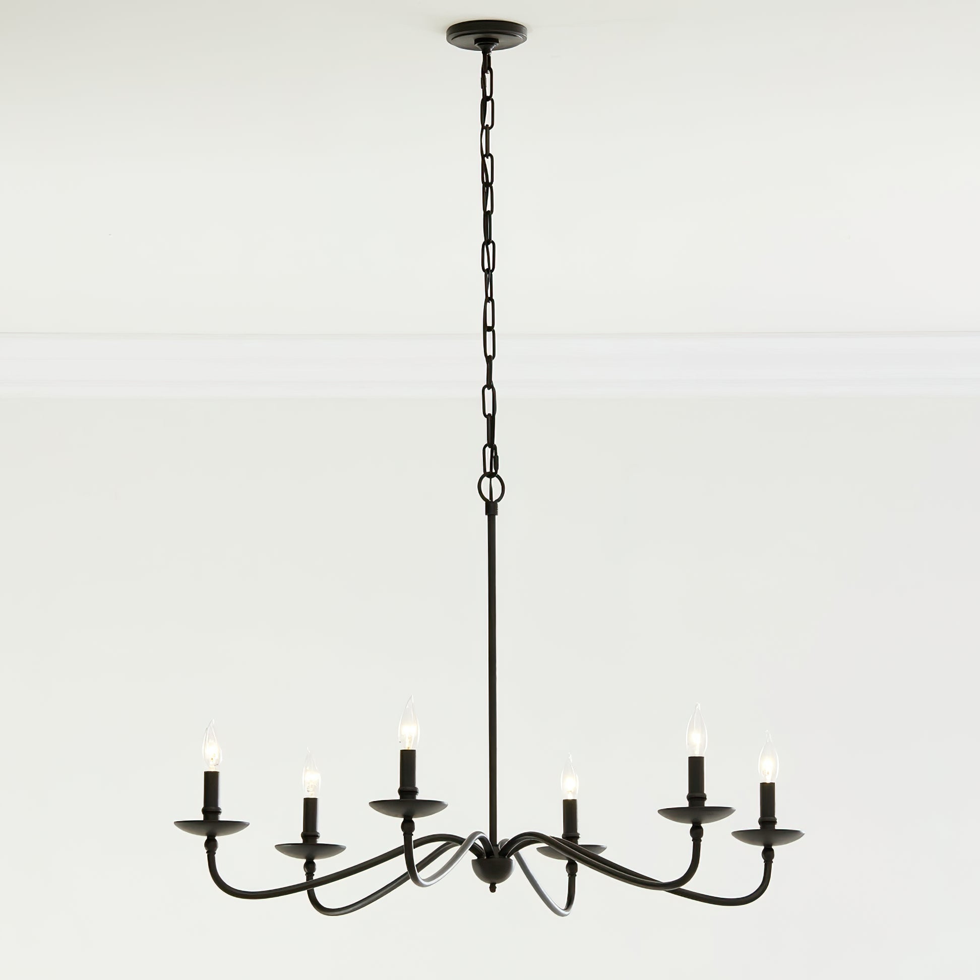 This lighting collection has a simultaneously solid and lightweight look. The wrapped iron gives each fixture a dark, robust feeling, but the swaging arms and saucer-like electric-candle sleeves feel just a touch feminine.