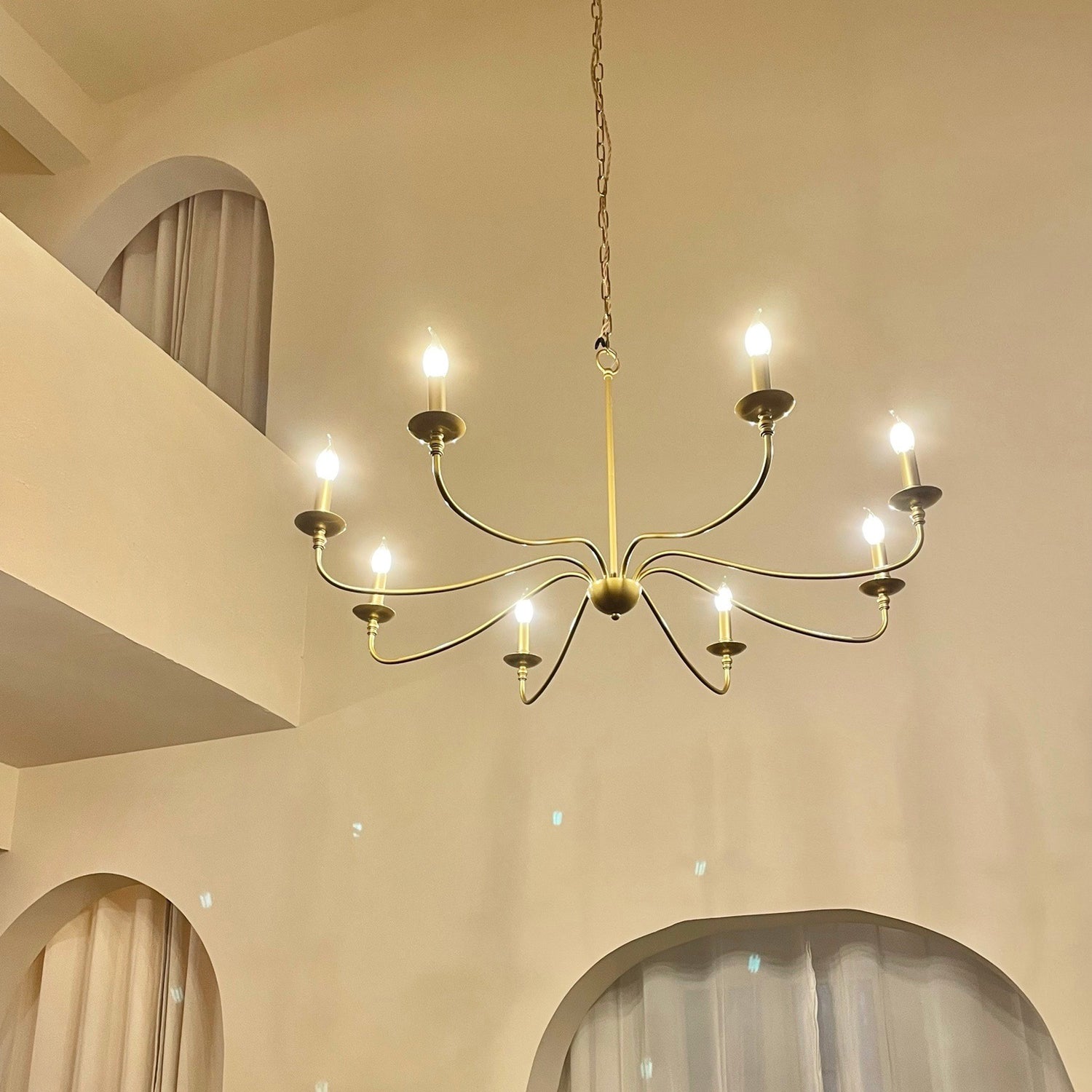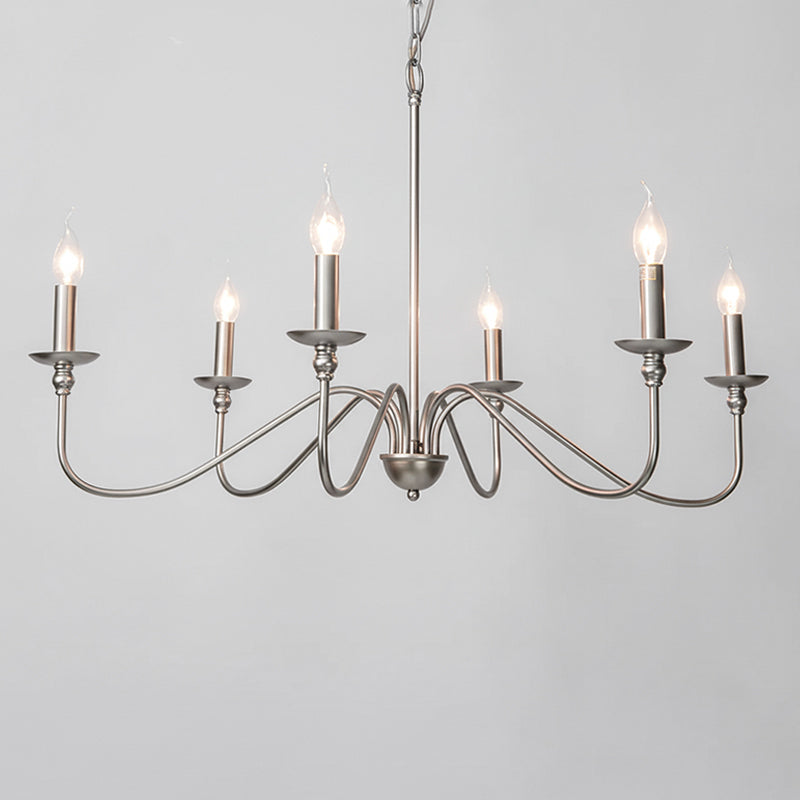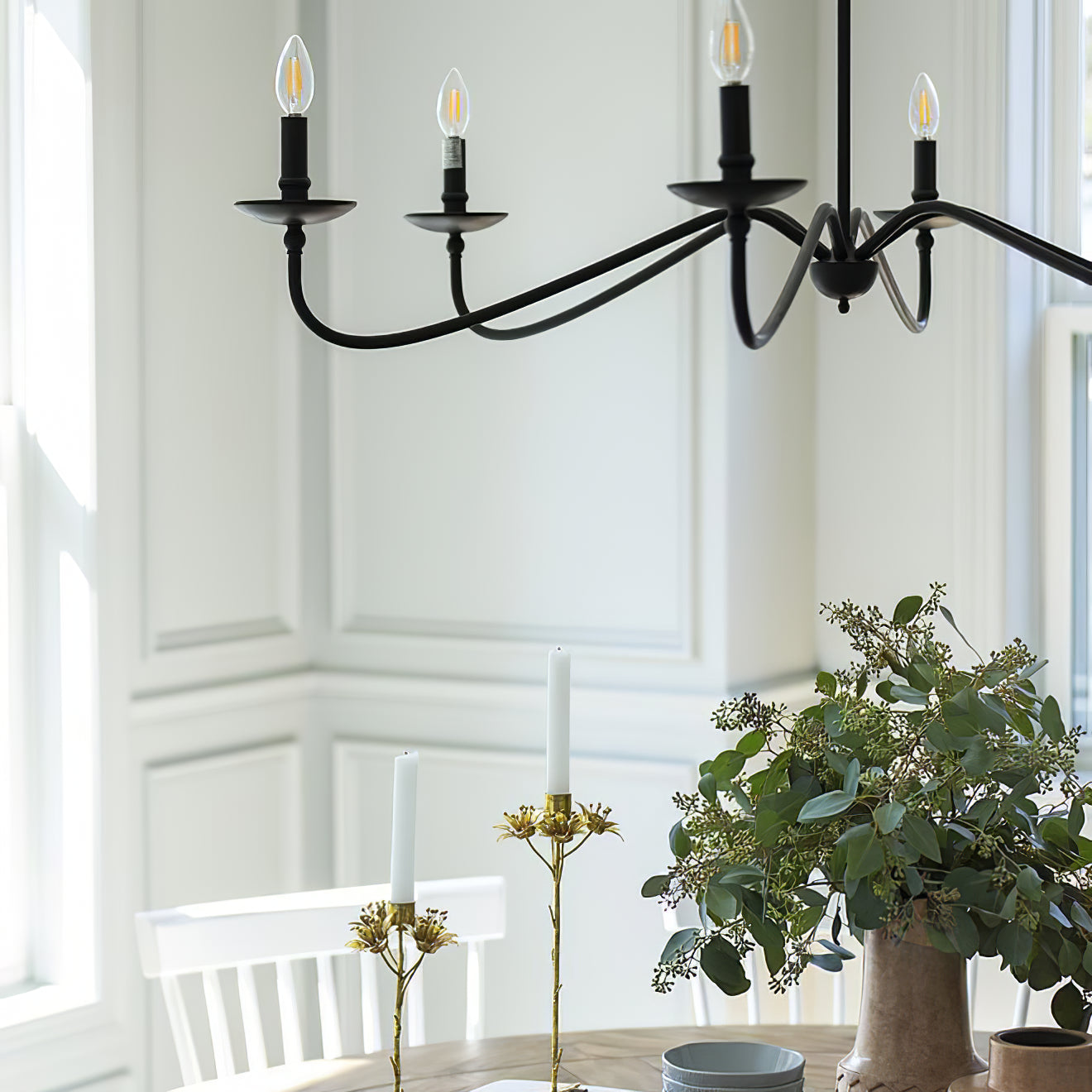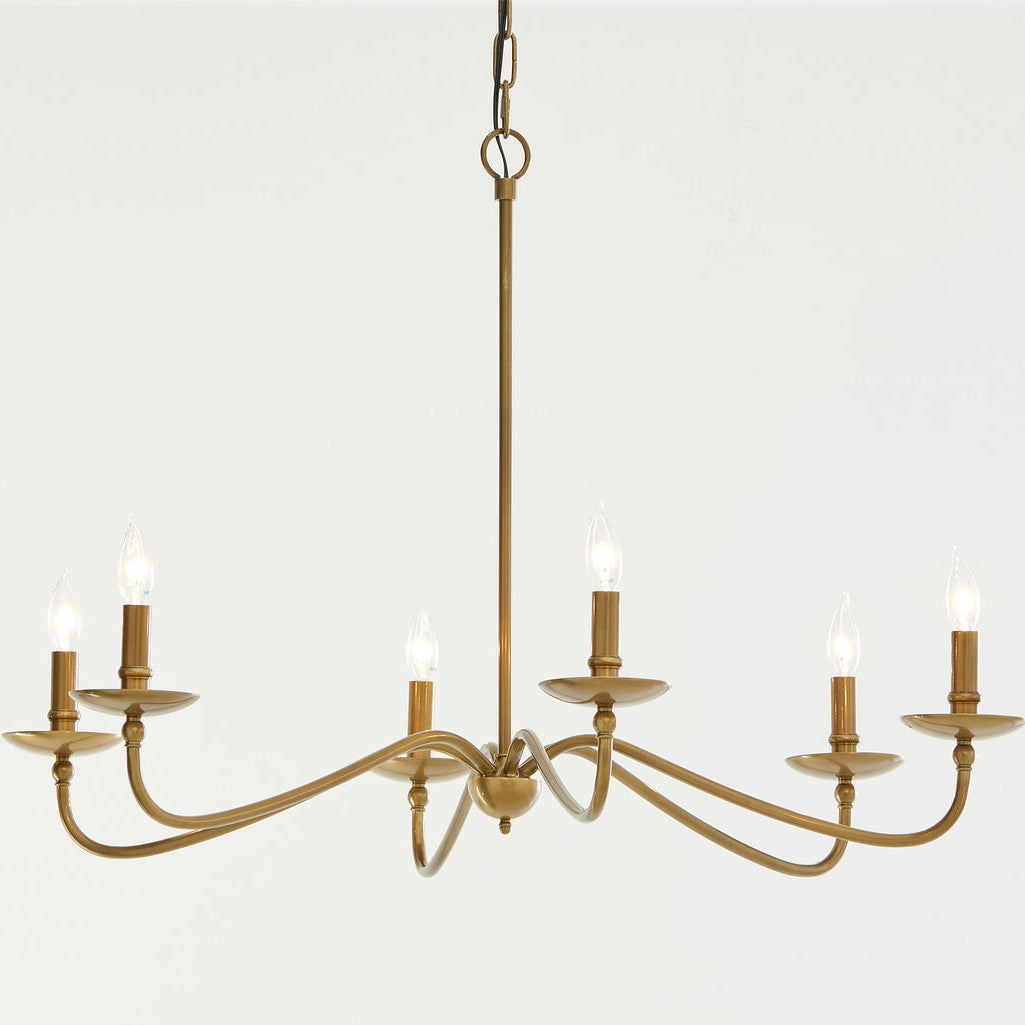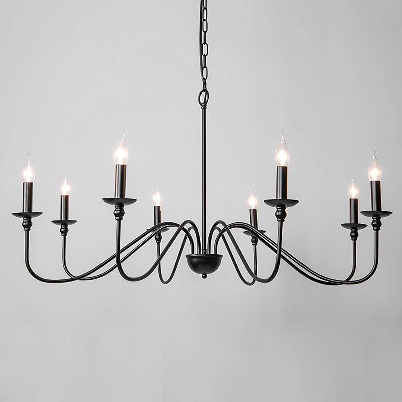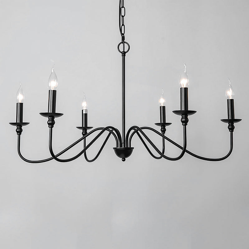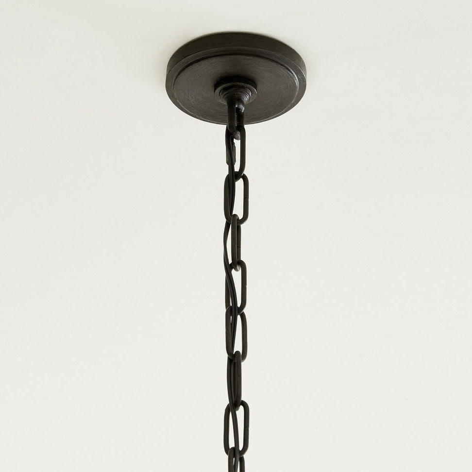 This lighting collection has a simultaneously solid and lightweight look. The wrapped iron gives each fixture a dark, robust feeling, but the swaging arms and saucer-like electric-candle sleeves feel just a touch feminine.
