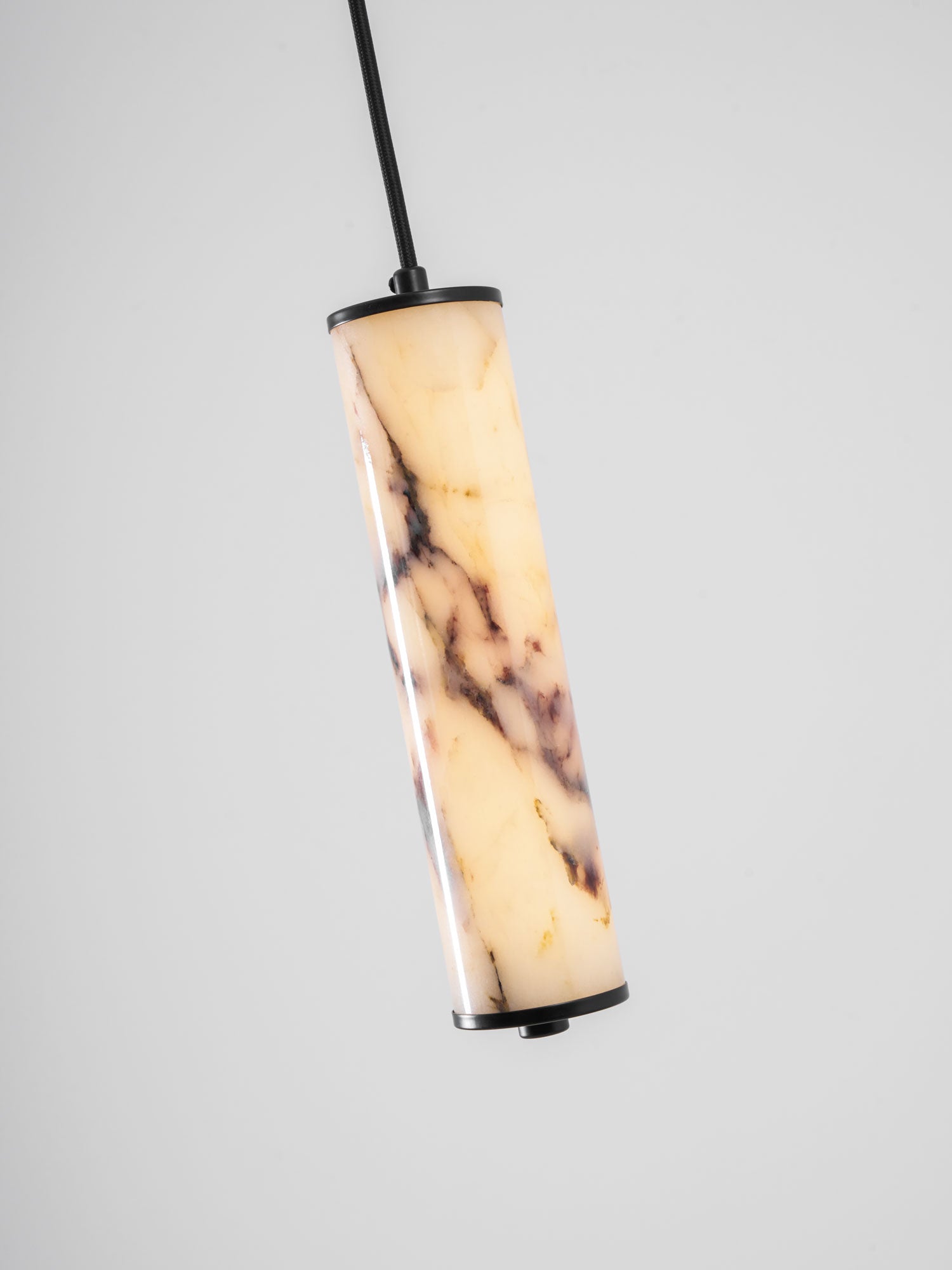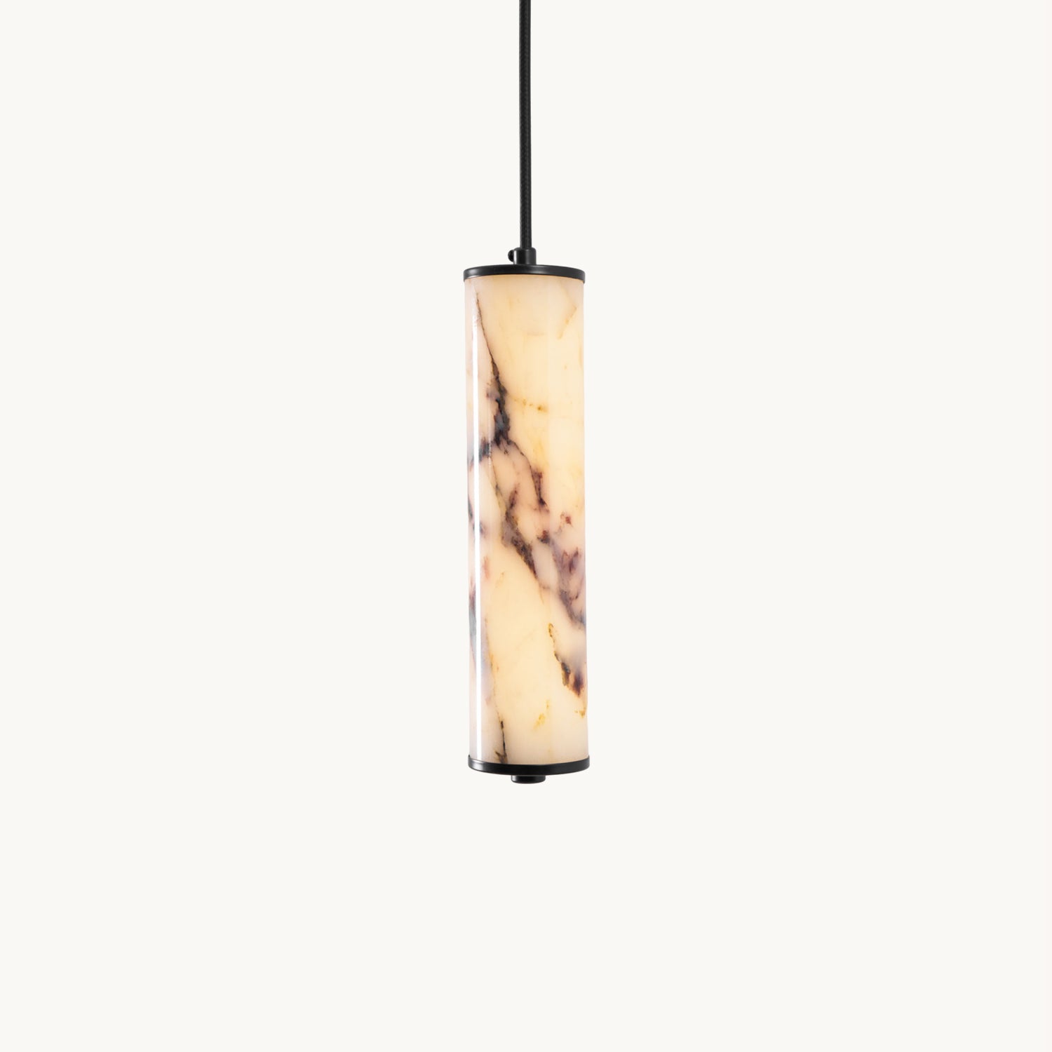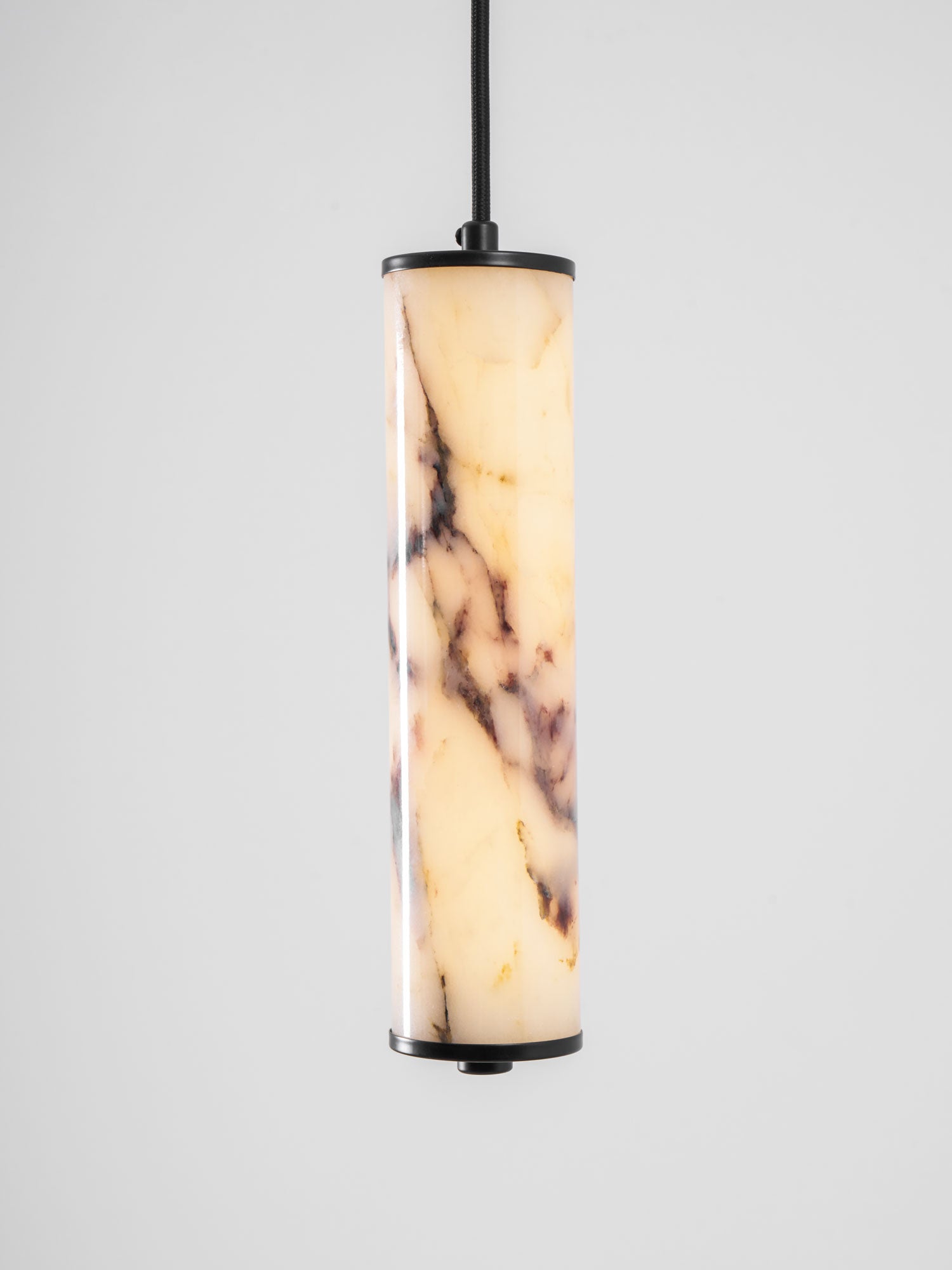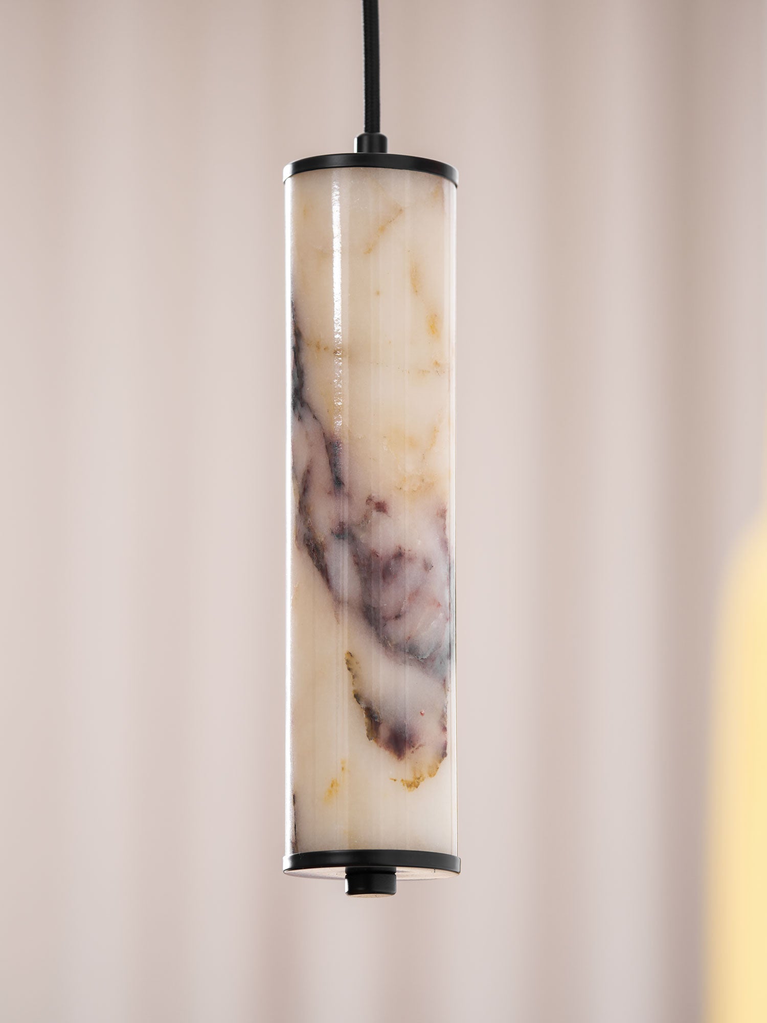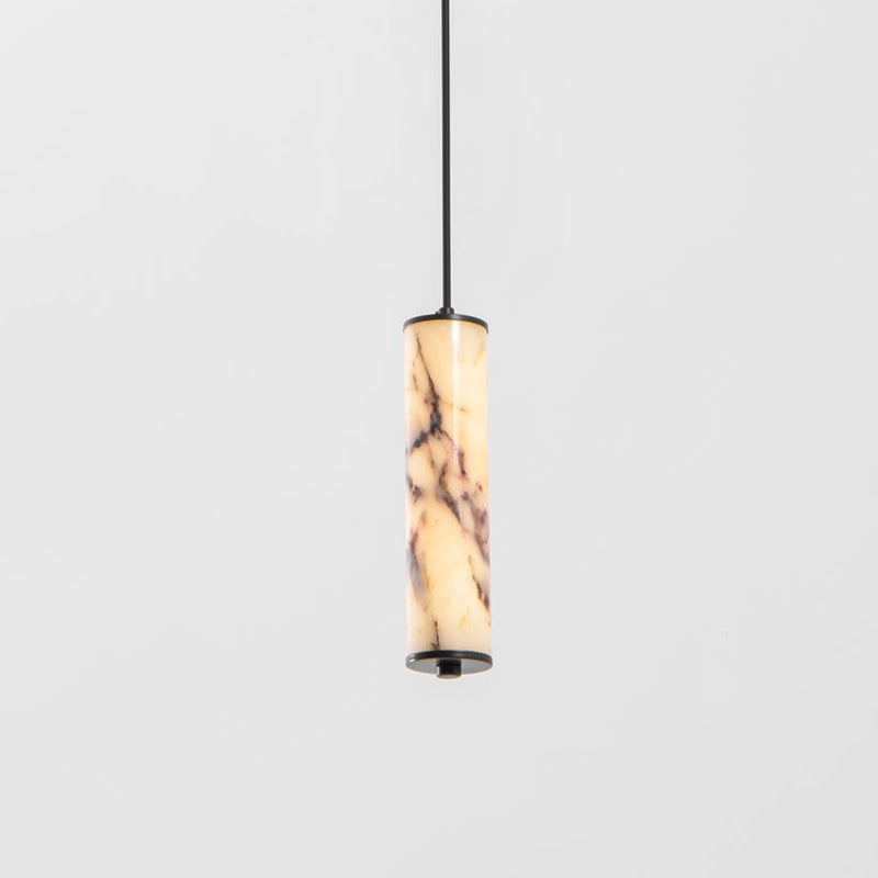 The Lumenaria Pendant Light by Mooijane features a sleek cylindrical form crafted from natural Bulgari purple iron marble. Its rich, organic veining creates a luxurious, artistic presence, while the polished stone emits a soft, ambient glow when illuminated. Accented with a minimalist black metal top and base, this pendant exudes refined elegance. Ideal for modern interiors, upscale dining spaces, or hotel lobbies, the Lumenaria blends sculptural beauty with functional lighting.