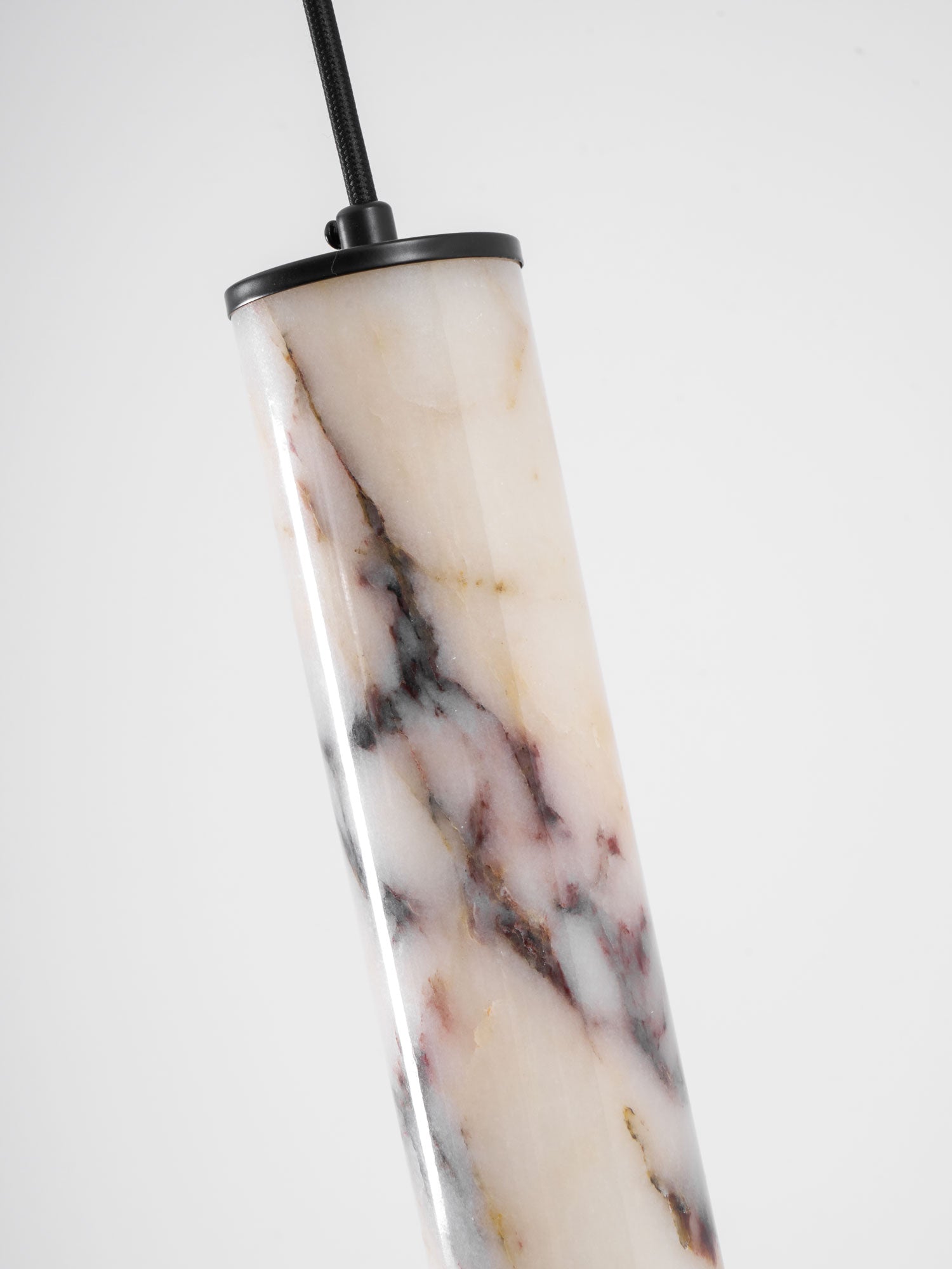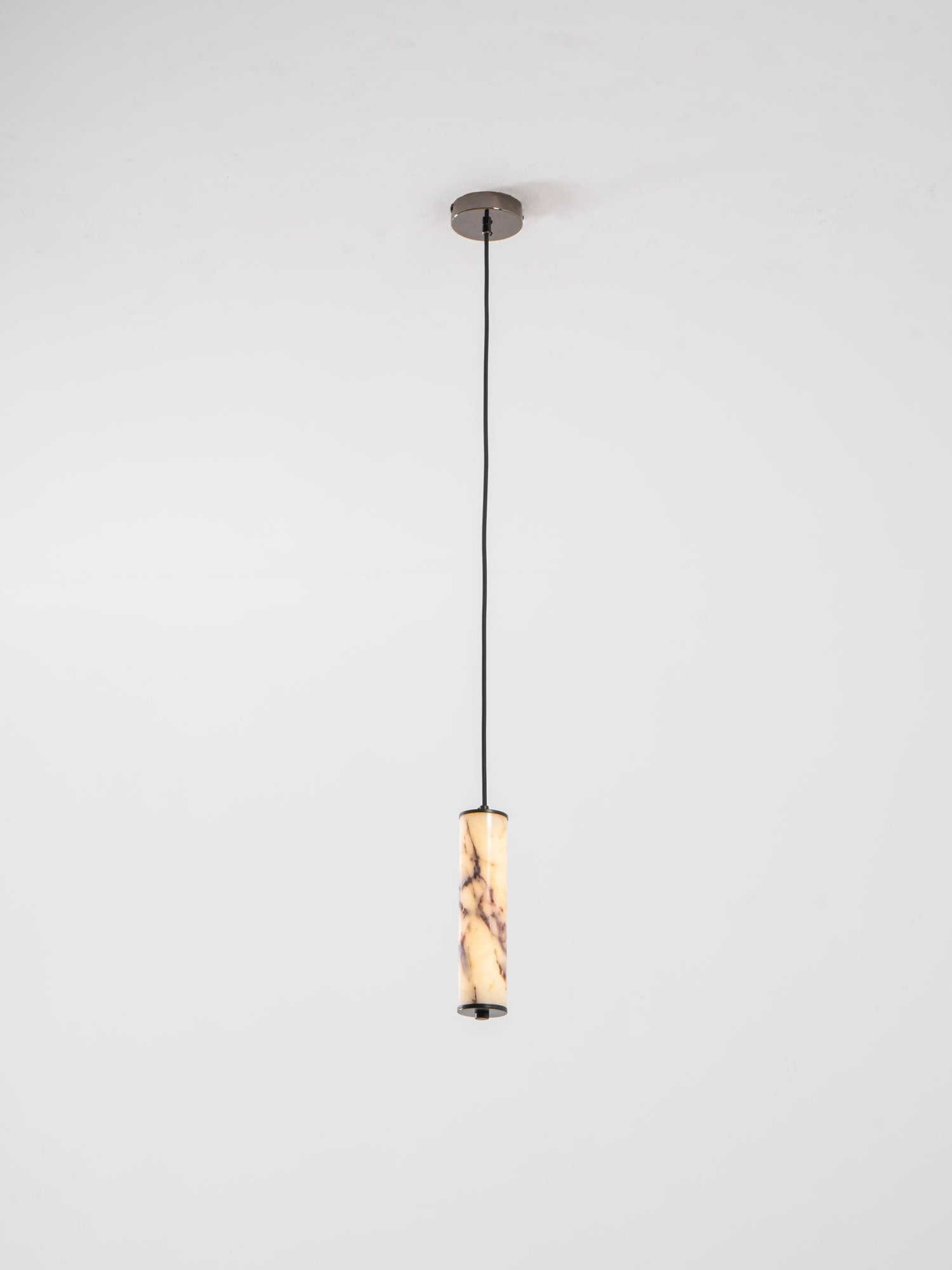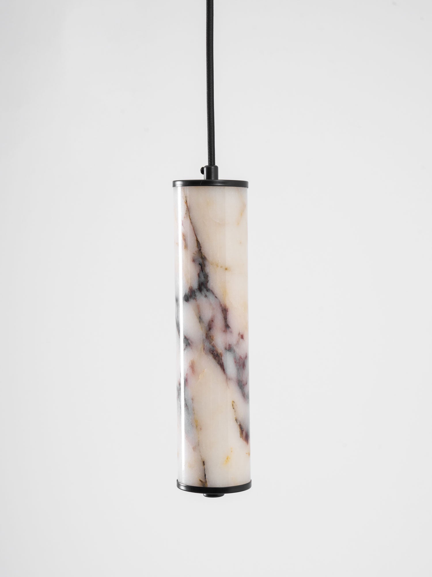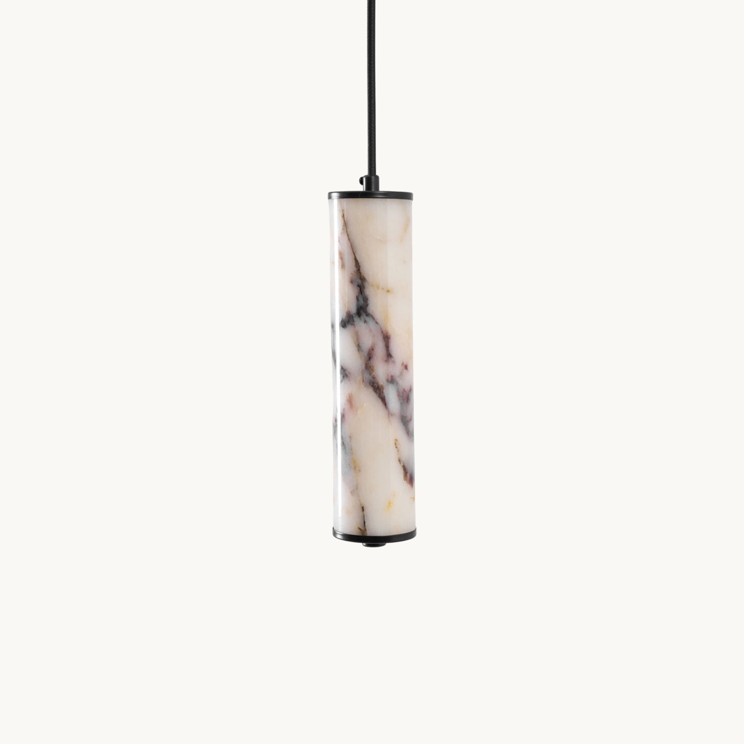 The Lumenaria Pendant Light by Mooijane features a sleek cylindrical form crafted from natural Bulgari purple iron marble. Its rich, organic veining creates a luxurious, artistic presence, while the polished stone emits a soft, ambient glow when illuminated. Accented with a minimalist black metal top and base, this pendant exudes refined elegance. Ideal for modern interiors, upscale dining spaces, or hotel lobbies, the Lumenaria blends sculptural beauty with functional lighting.