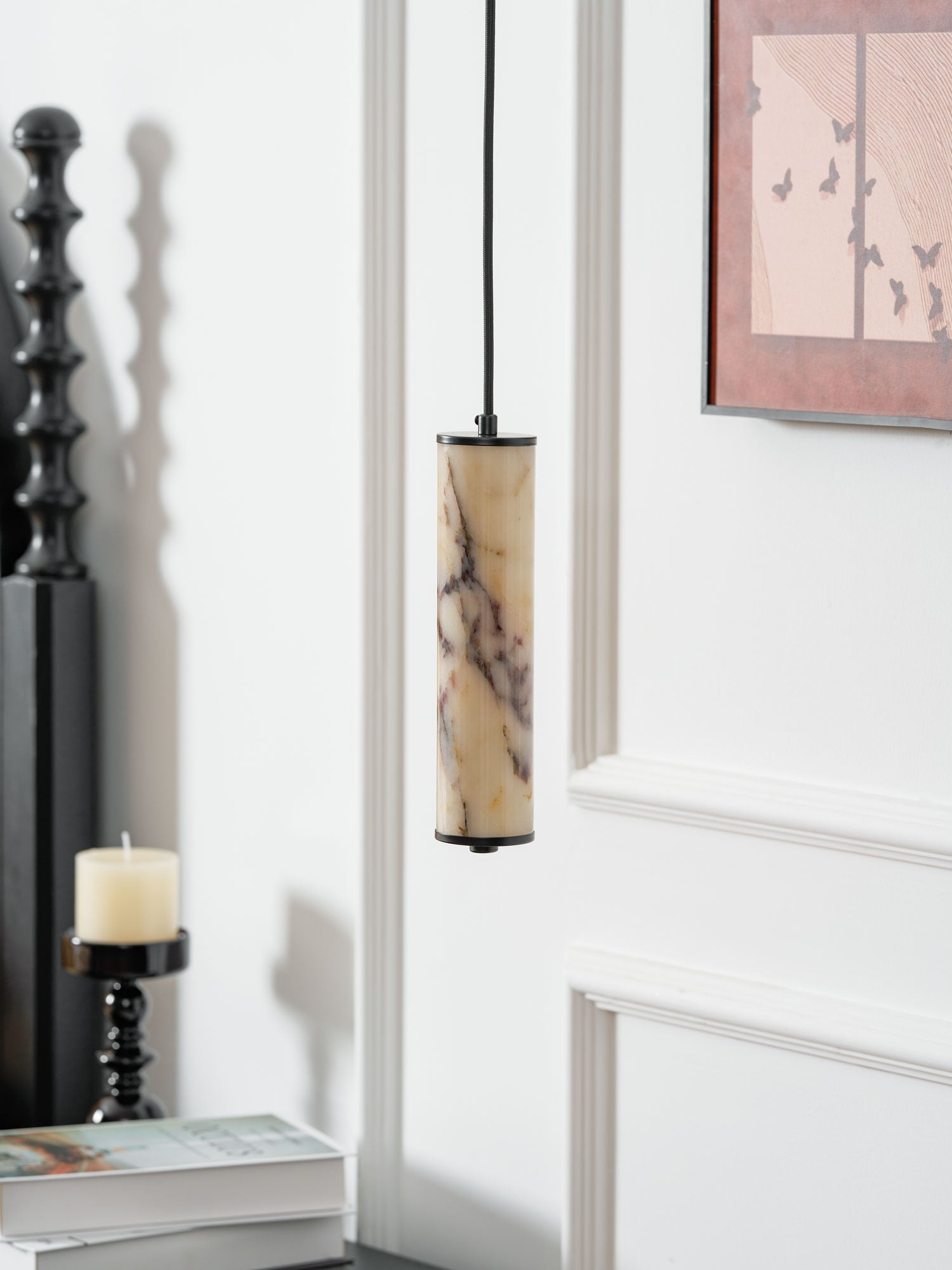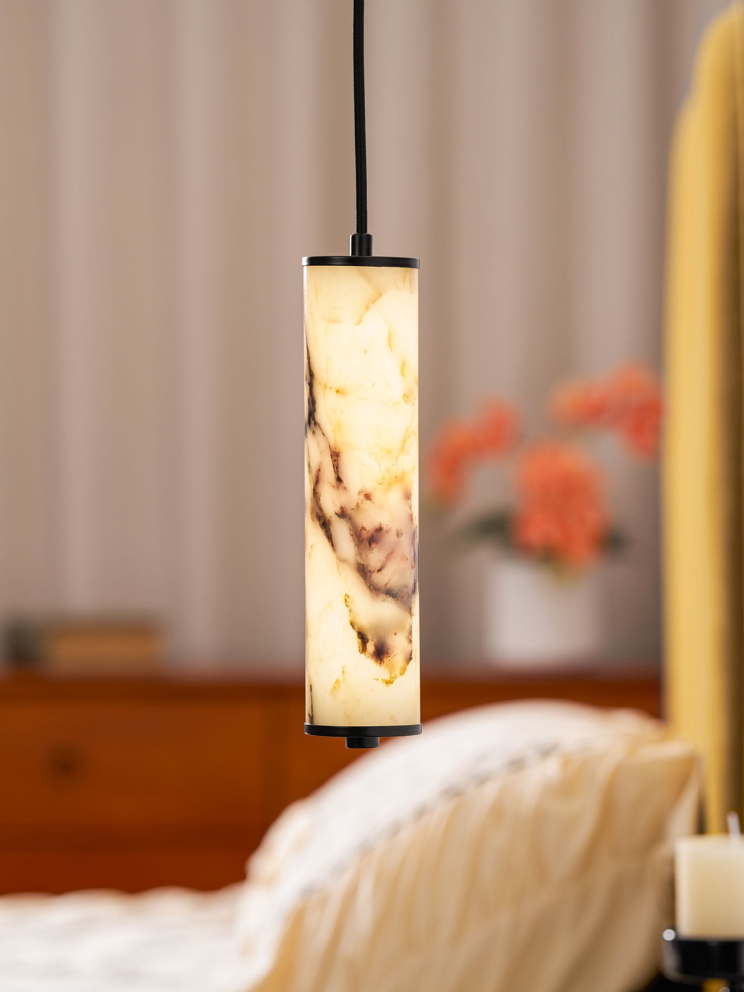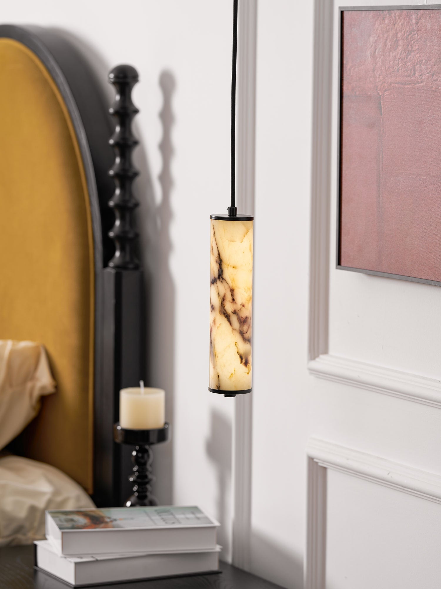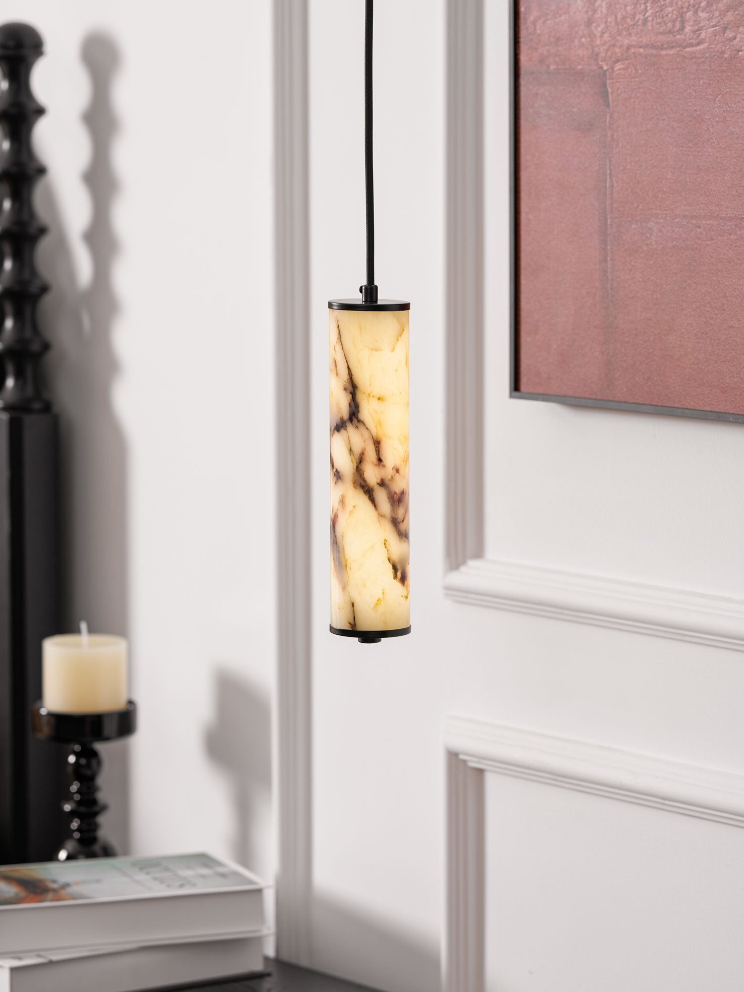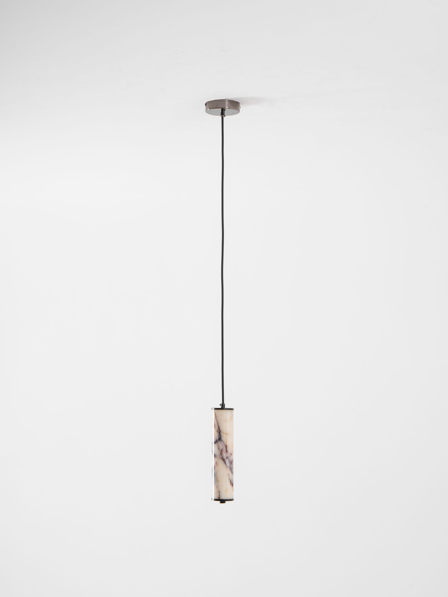 The Lumenaria Pendant Light by Mooijane features a sleek cylindrical form crafted from natural Bulgari purple iron marble. Its rich, organic veining creates a luxurious, artistic presence, while the polished stone emits a soft, ambient glow when illuminated. Accented with a minimalist black metal top and base, this pendant exudes refined elegance. Ideal for modern interiors, upscale dining spaces, or hotel lobbies, the Lumenaria blends sculptural beauty with functional lighting.