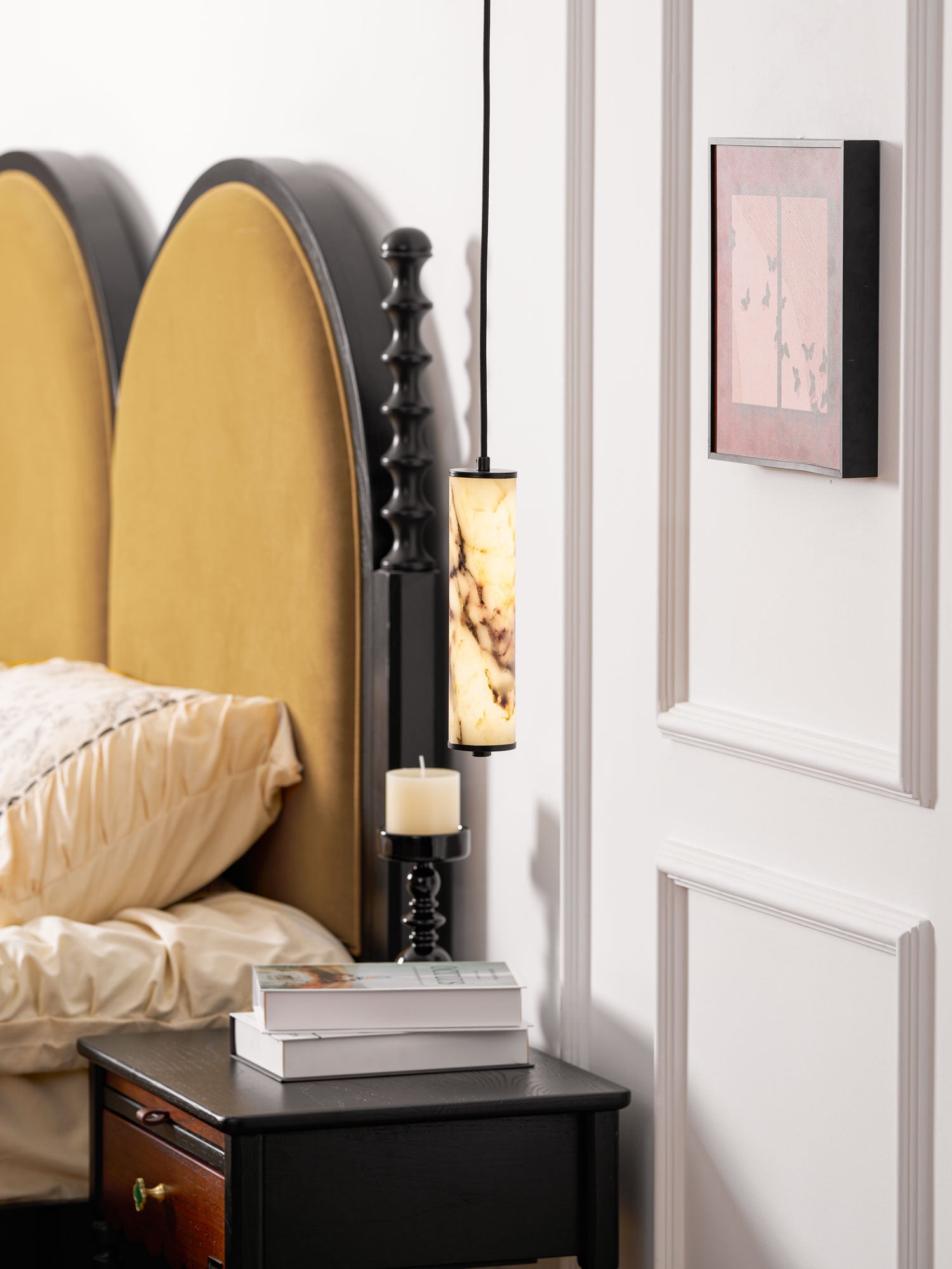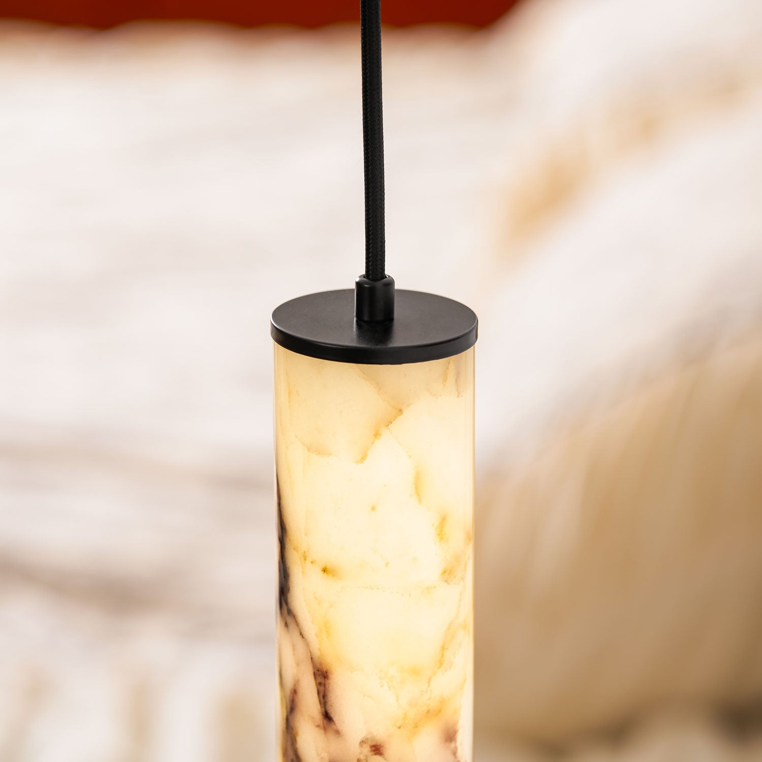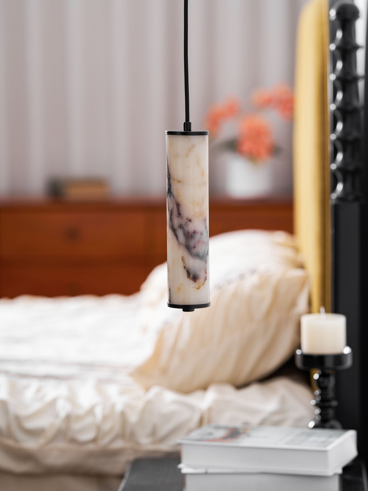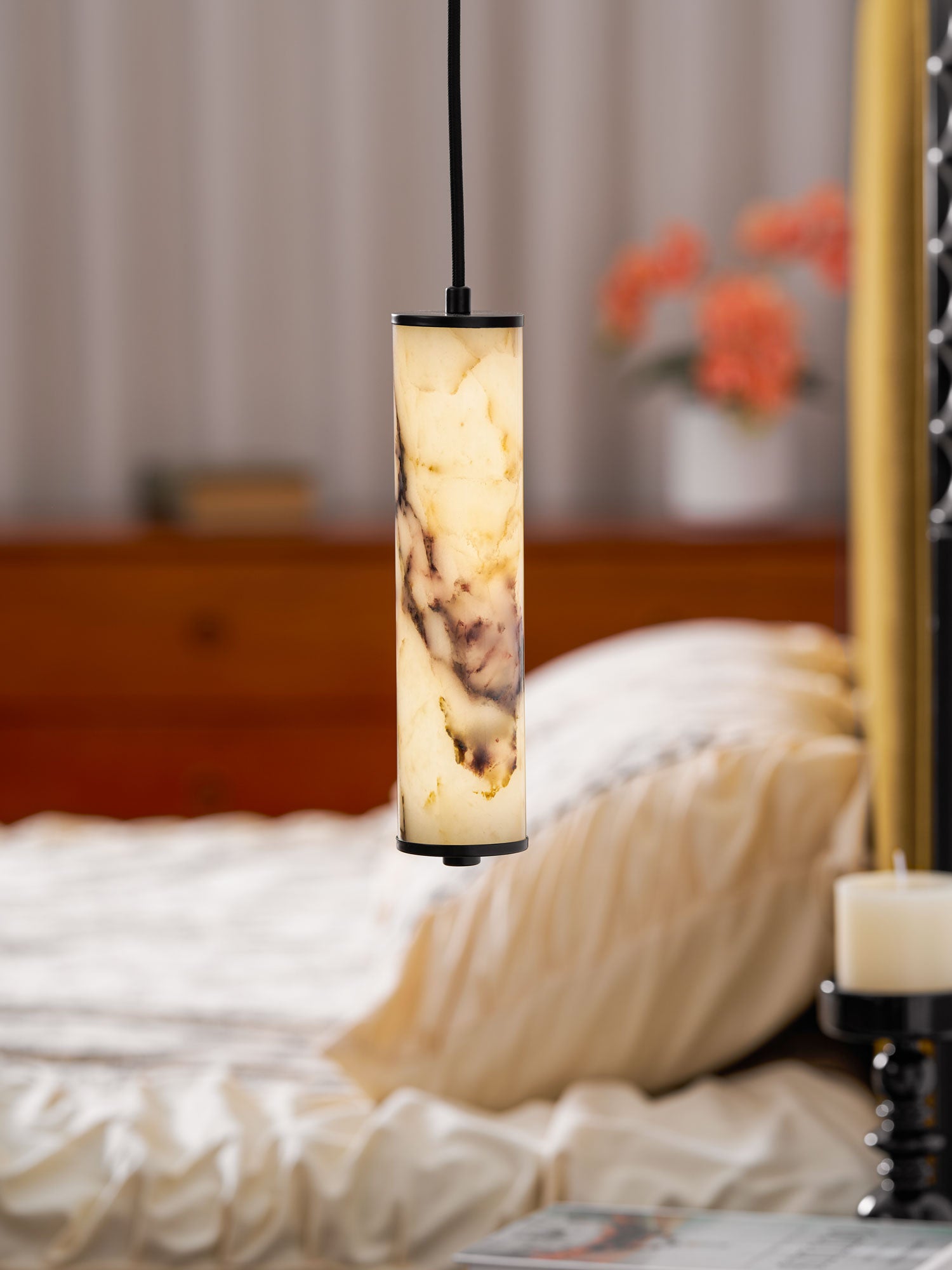 The Lumenaria Pendant Light by Mooijane features a sleek cylindrical form crafted from natural Bulgari purple iron marble. Its rich, organic veining creates a luxurious, artistic presence, while the polished stone emits a soft, ambient glow when illuminated. Accented with a minimalist black metal top and base, this pendant exudes refined elegance. Ideal for modern interiors, upscale dining spaces, or hotel lobbies, the Lumenaria blends sculptural beauty with functional lighting.