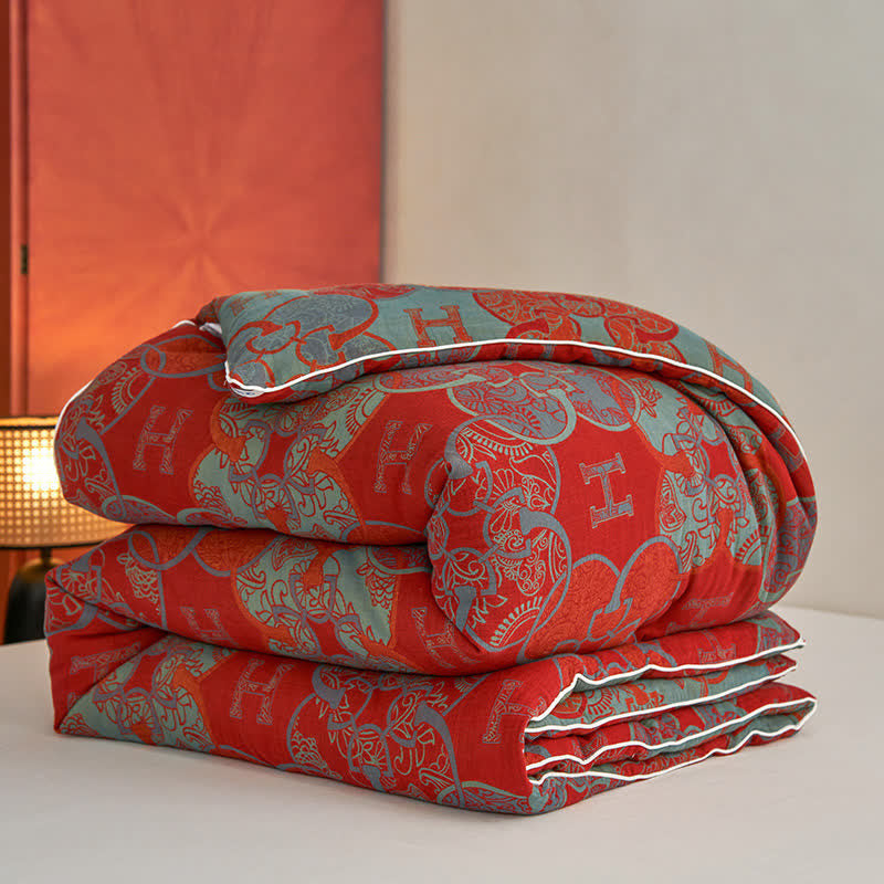 Indulge in luxury with our versatile quilt that complements various room styles. Crafted from pure cotton with double gauze, this quilt is soft, comfortable, breathable, highly absorbent, without lint and pilling, and easy to clean and quickly dry. Moreover, it is soft and warm, filled with soybean fiber.