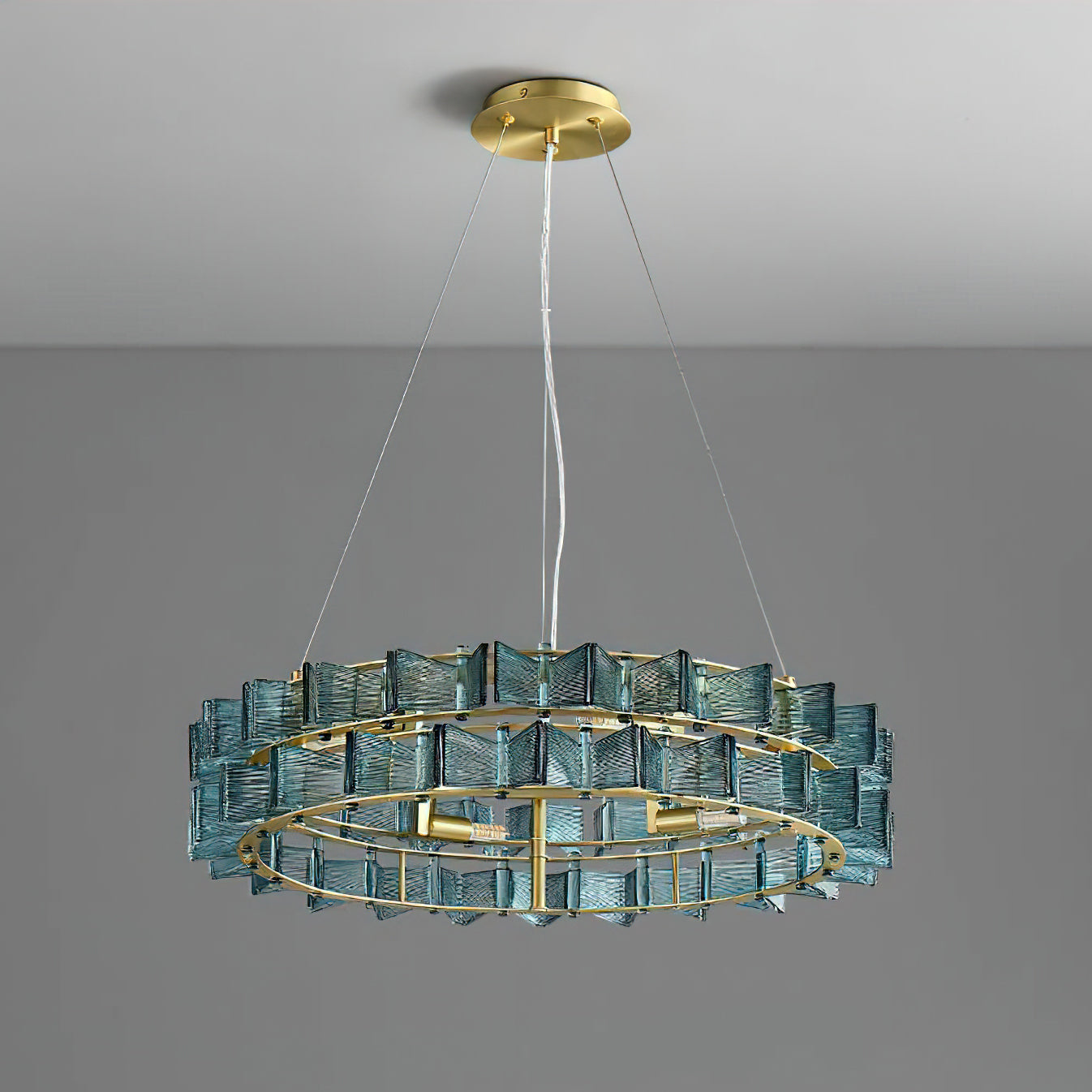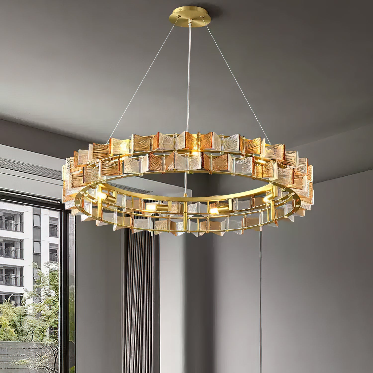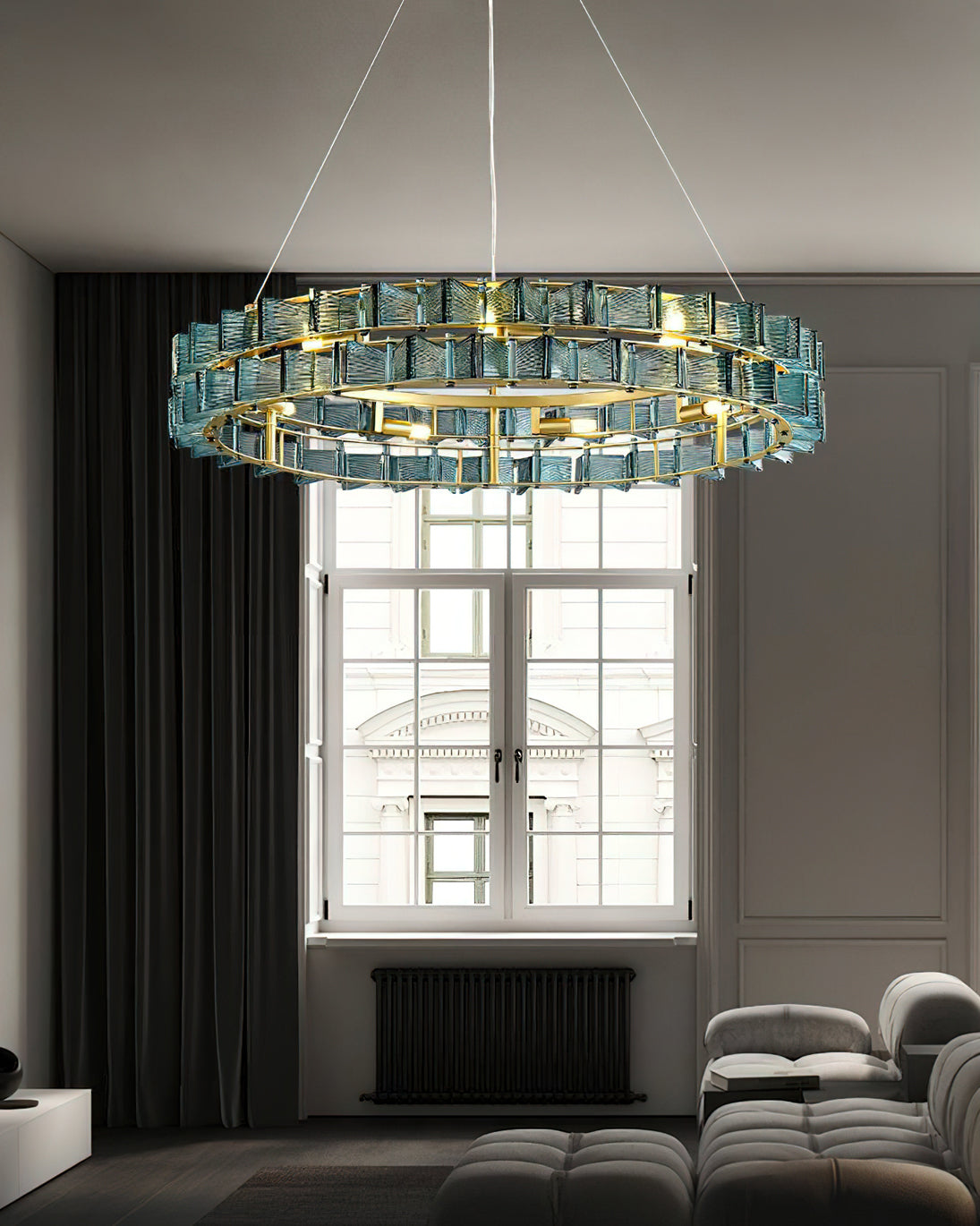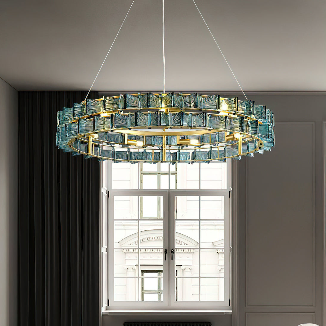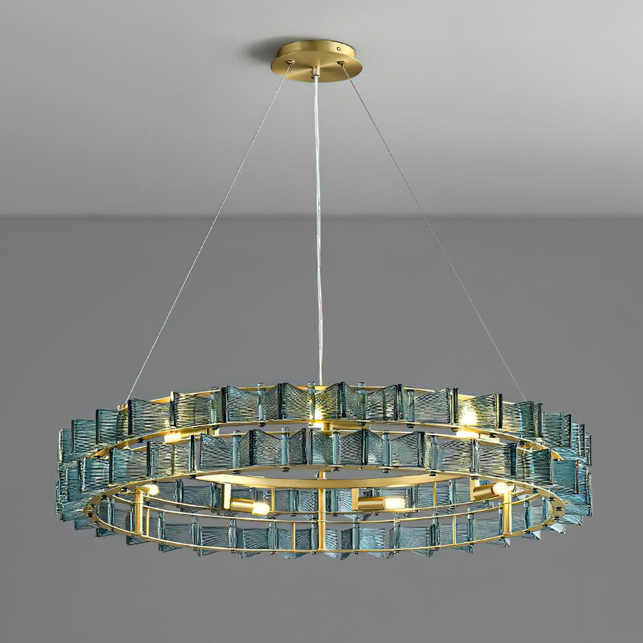 Introducing the Mariposa Round Chandelier by Mooijane - an exquisite addition to any space. Handmade glass with vibrant colors is set in a brass finish frame, creating an eclectic and artisanal touch. Elevate your decor with flawless design and expert craftsmanship.