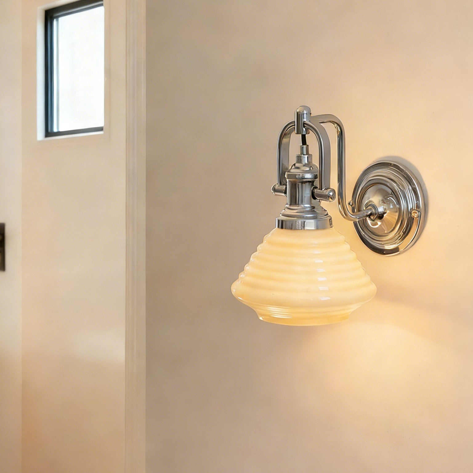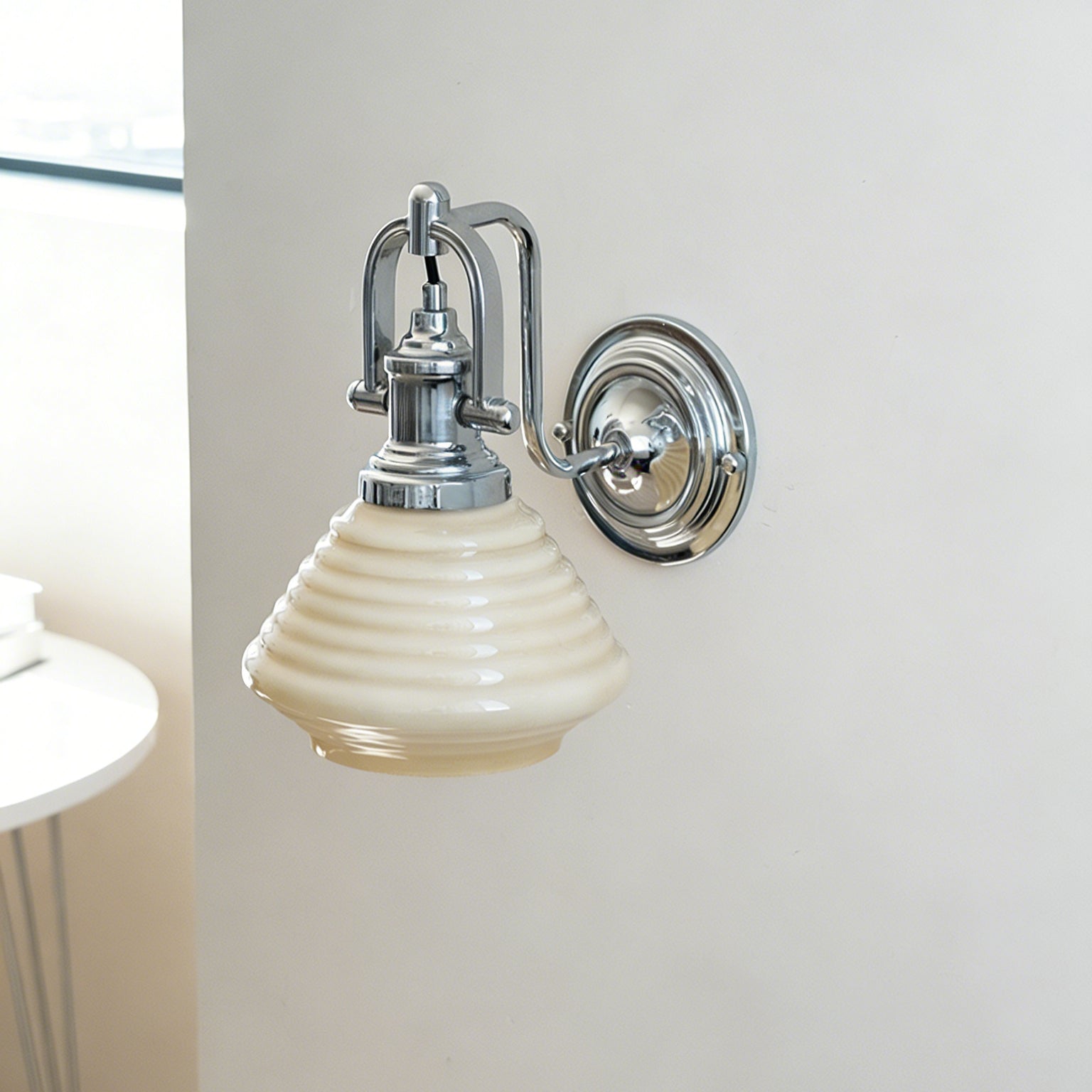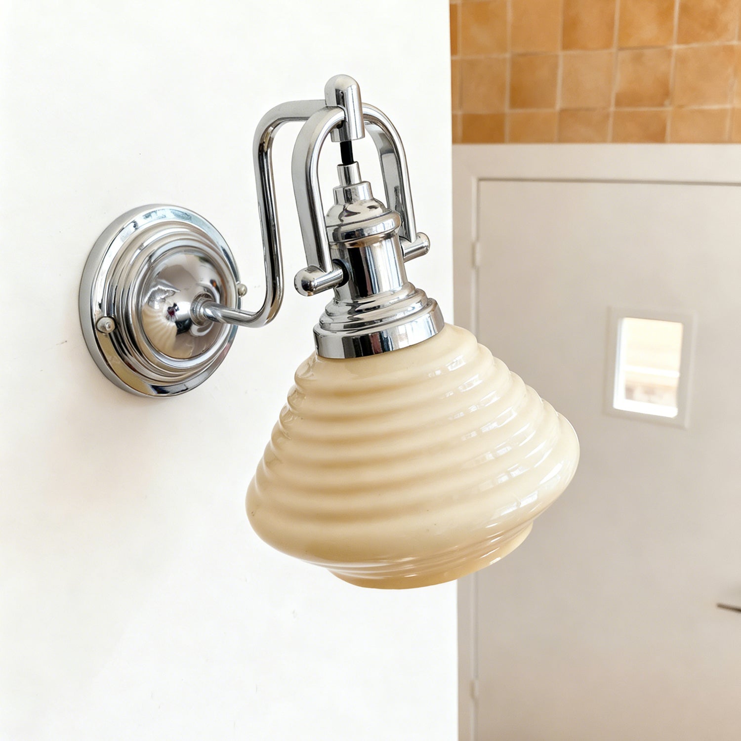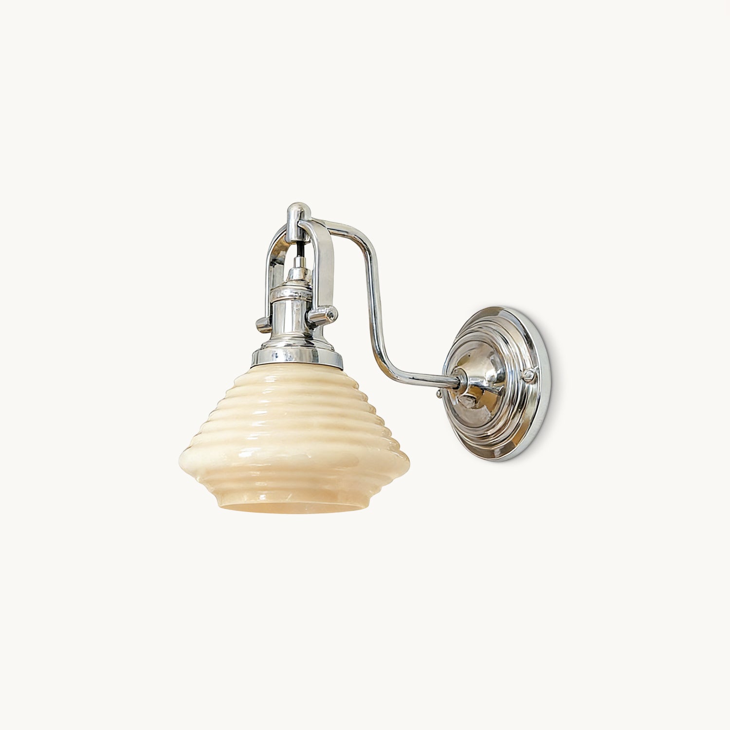 The Marnie Wall Lamp by Mooijane captures refined retro charm through a thoughtful blend of glass and metal. Its rippled ivory-toned glass shade softly diffuses light, adding warmth, texture, and depth. A polished metal arm and base provide a sleek counterpoint, balancing vintage character with modern craftsmanship.