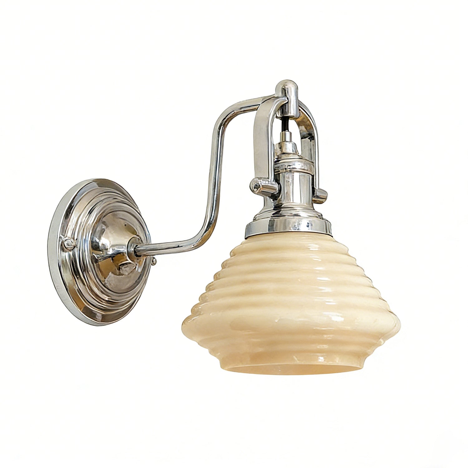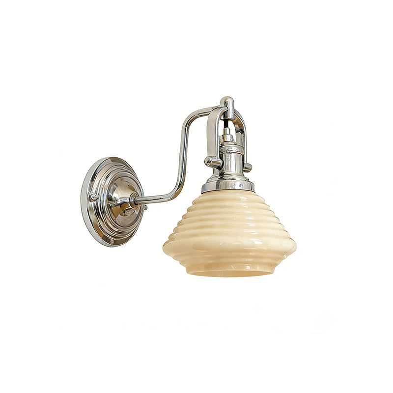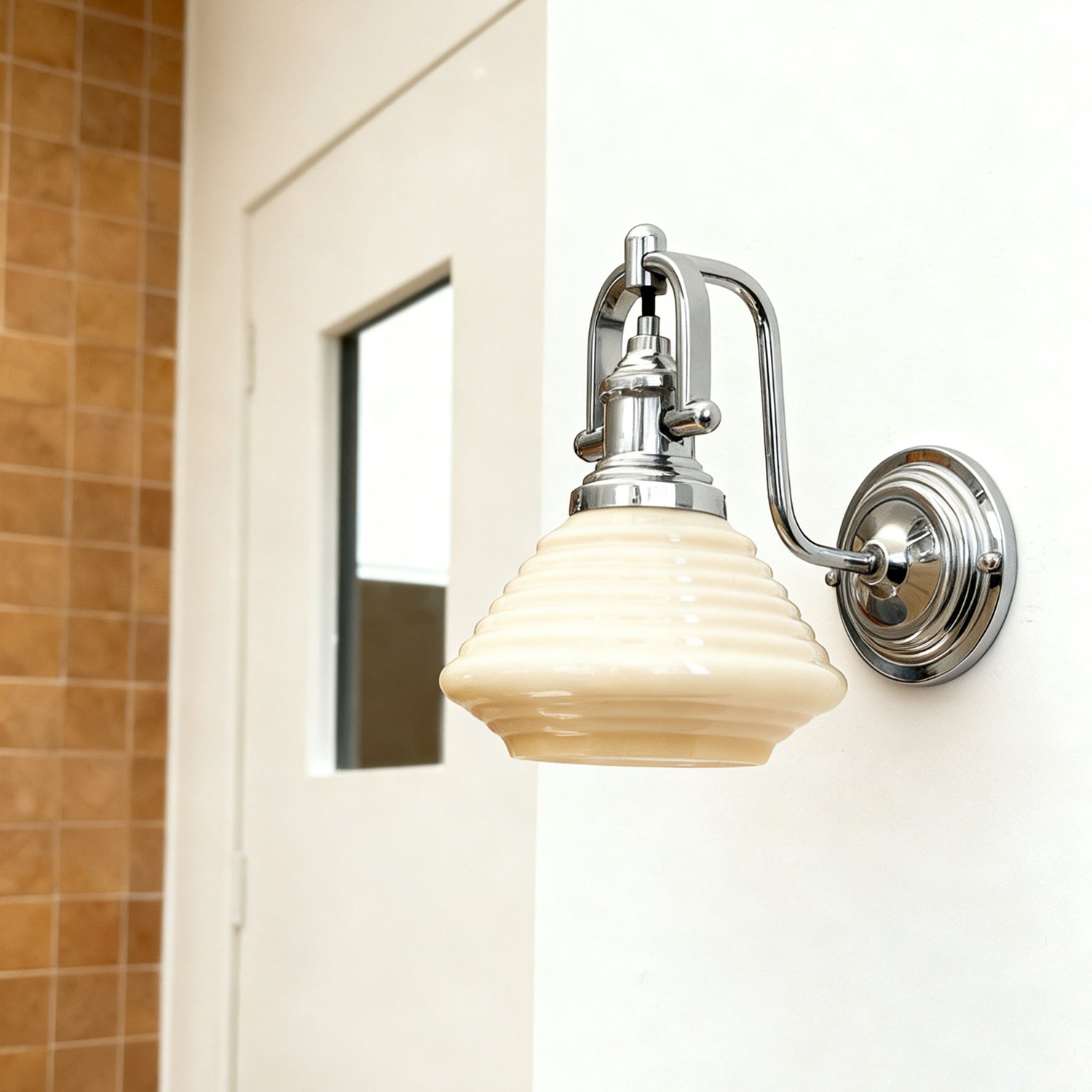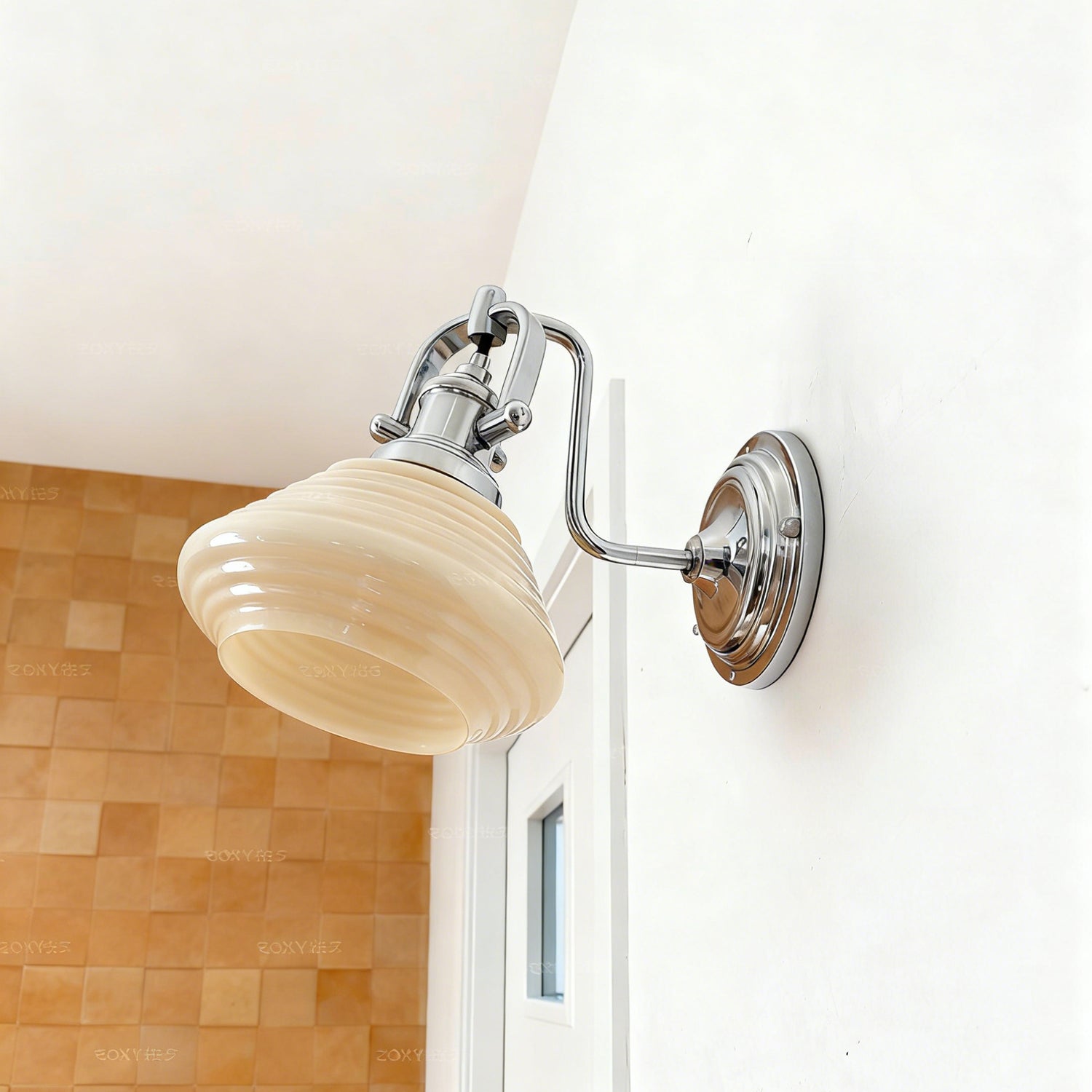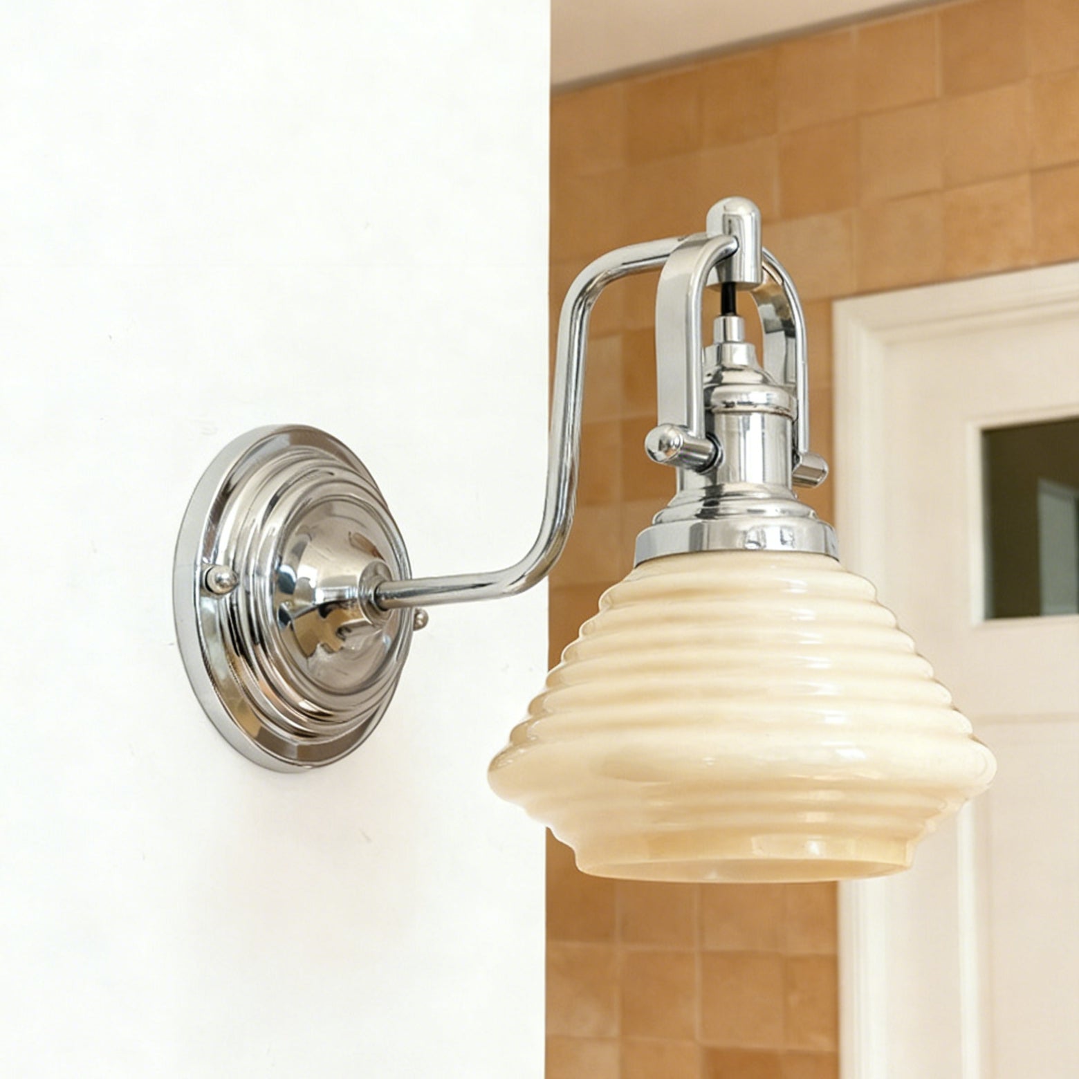 The Marnie Wall Lamp by Mooijane captures refined retro charm through a thoughtful blend of glass and metal. Its rippled ivory-toned glass shade softly diffuses light, adding warmth, texture, and depth. A polished metal arm and base provide a sleek counterpoint, balancing vintage character with modern craftsmanship.