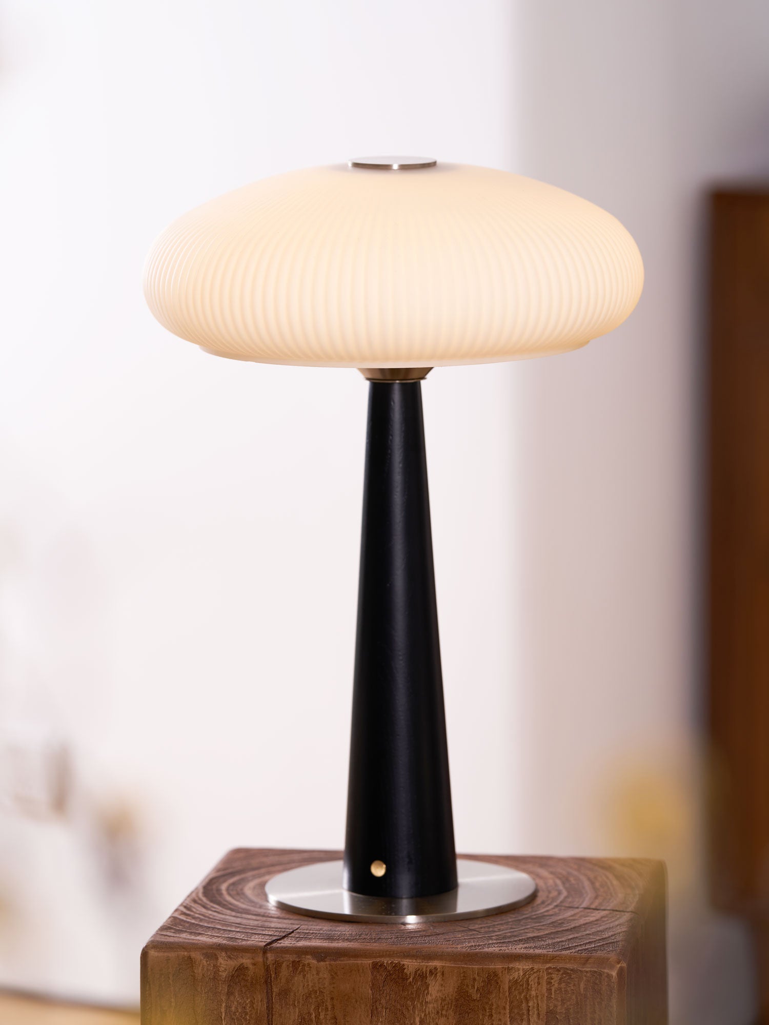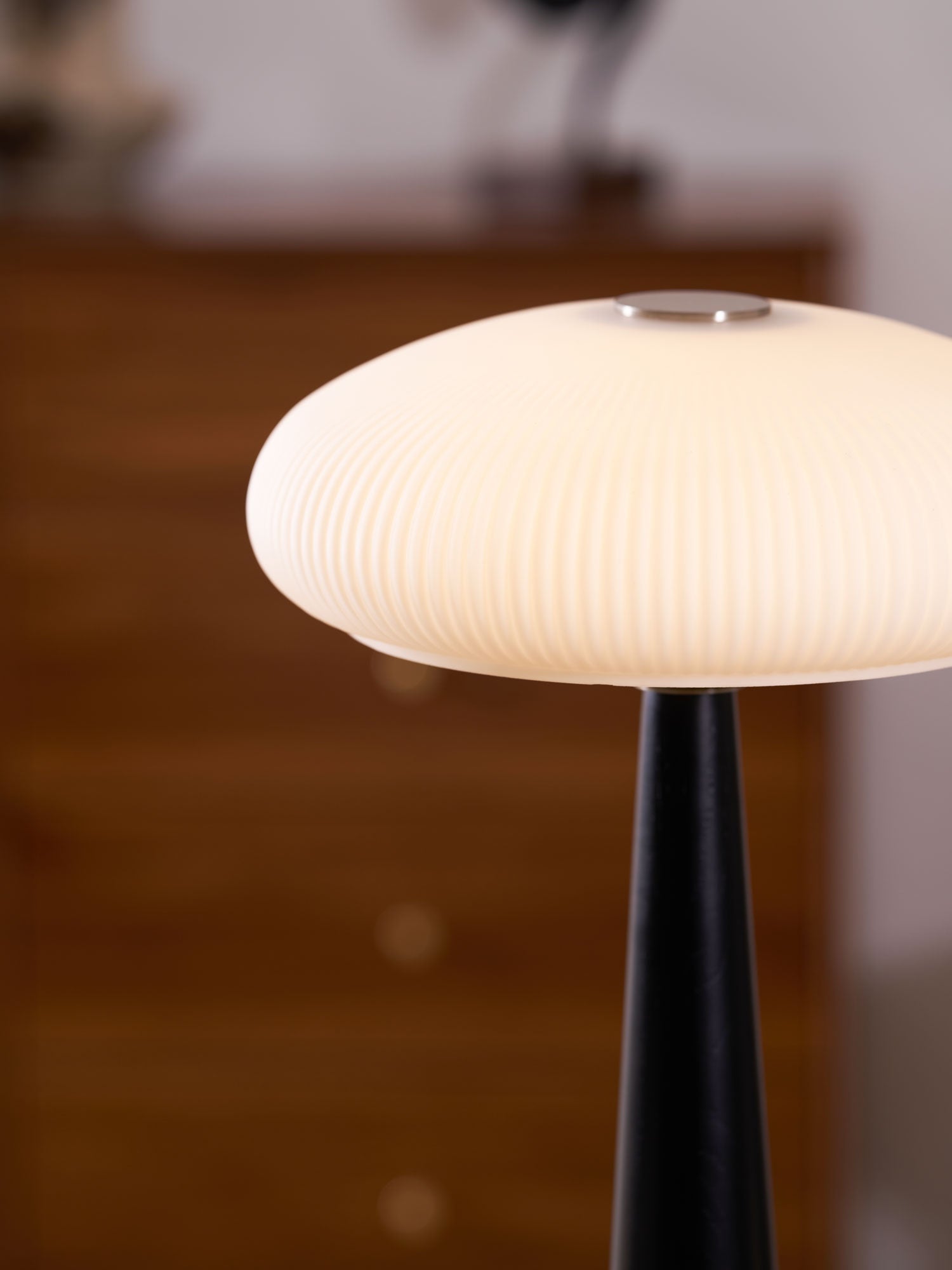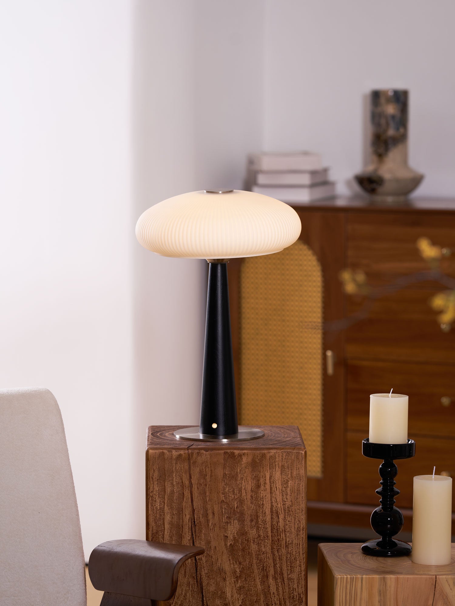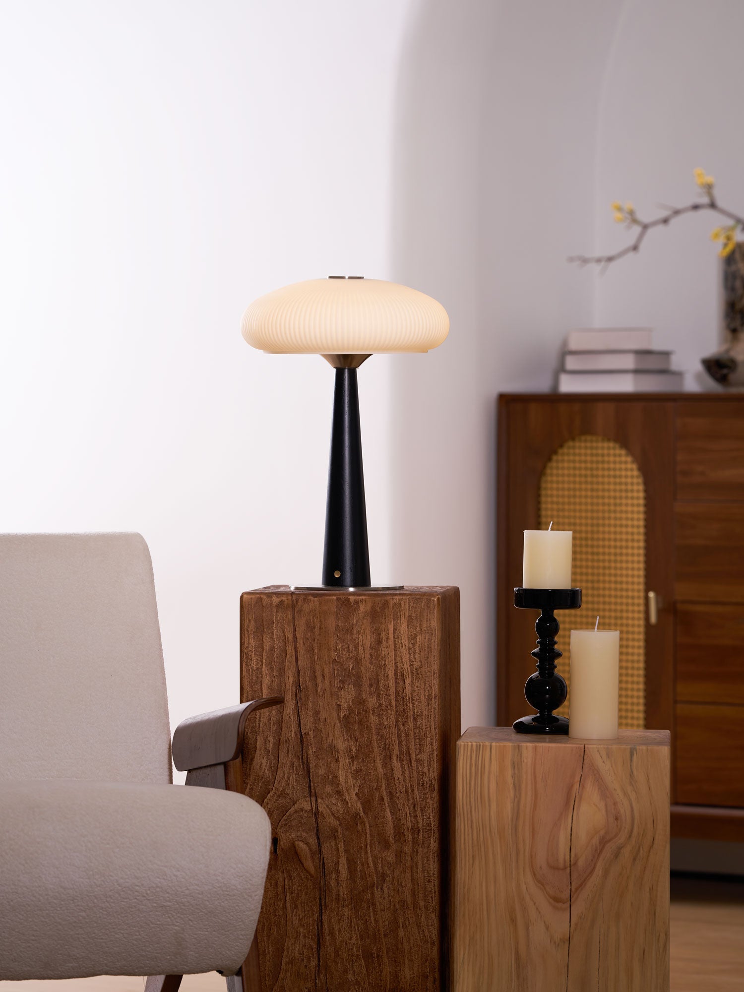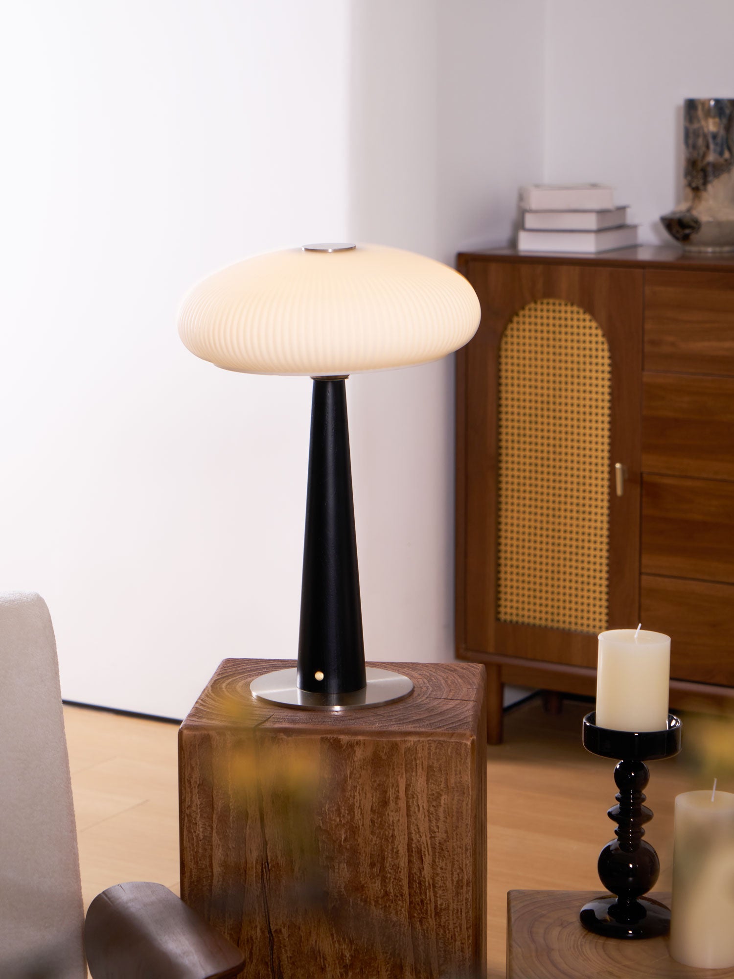 The Matsutake Table Lamp from Mooijane features a minimalist design with a fluted opal glass shade that softly diffuses light. Its slender black cone base and brushed metal disc create a sculptural, balanced silhouette. Perfect for modern bedrooms, reading nooks, or offices, it brings serene elegance to any space.