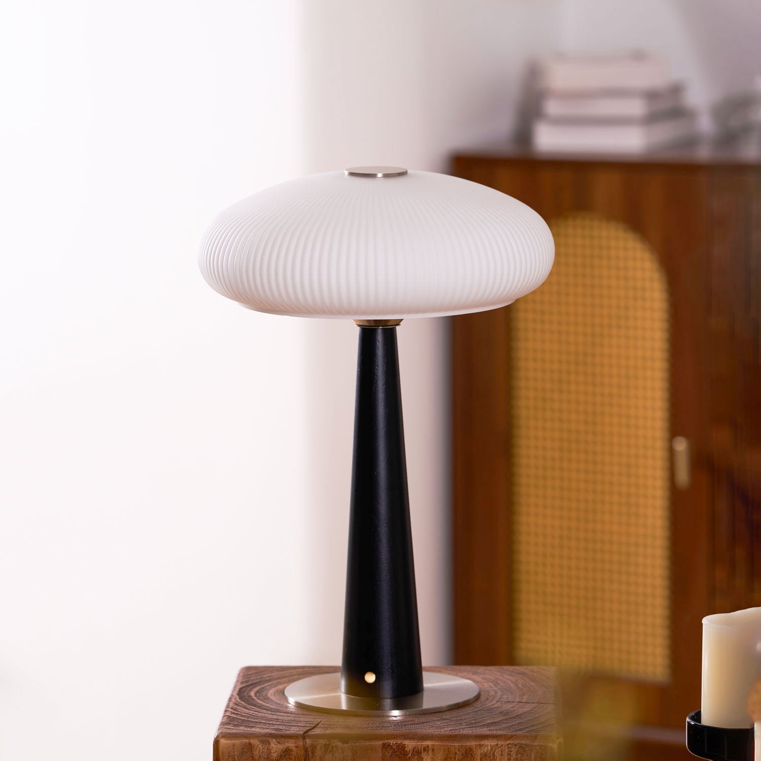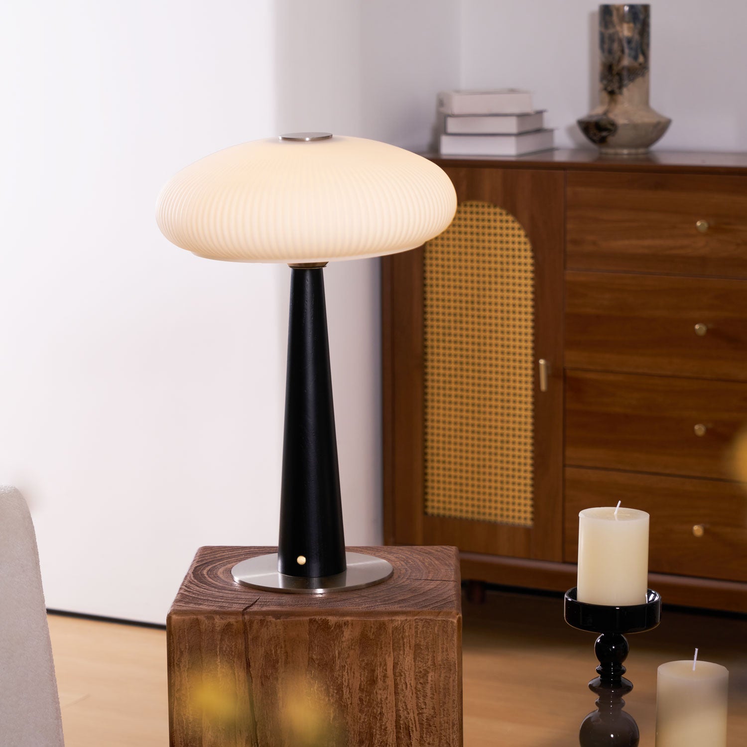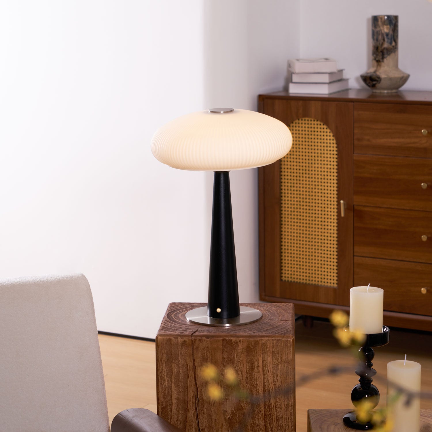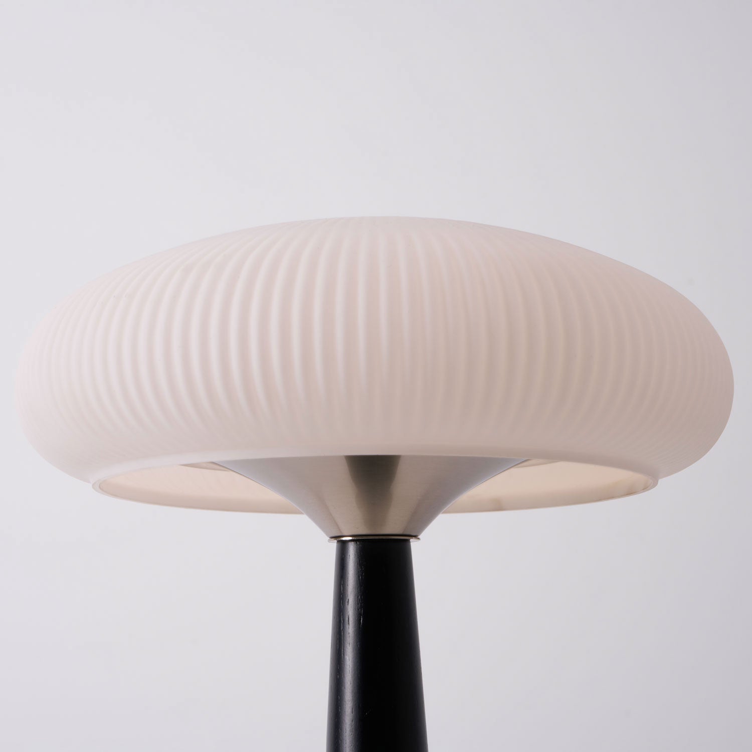 The Matsutake Table Lamp from Mooijane features a minimalist design with a fluted opal glass shade that softly diffuses light. Its slender black cone base and brushed metal disc create a sculptural, balanced silhouette. Perfect for modern bedrooms, reading nooks, or offices, it brings serene elegance to any space.