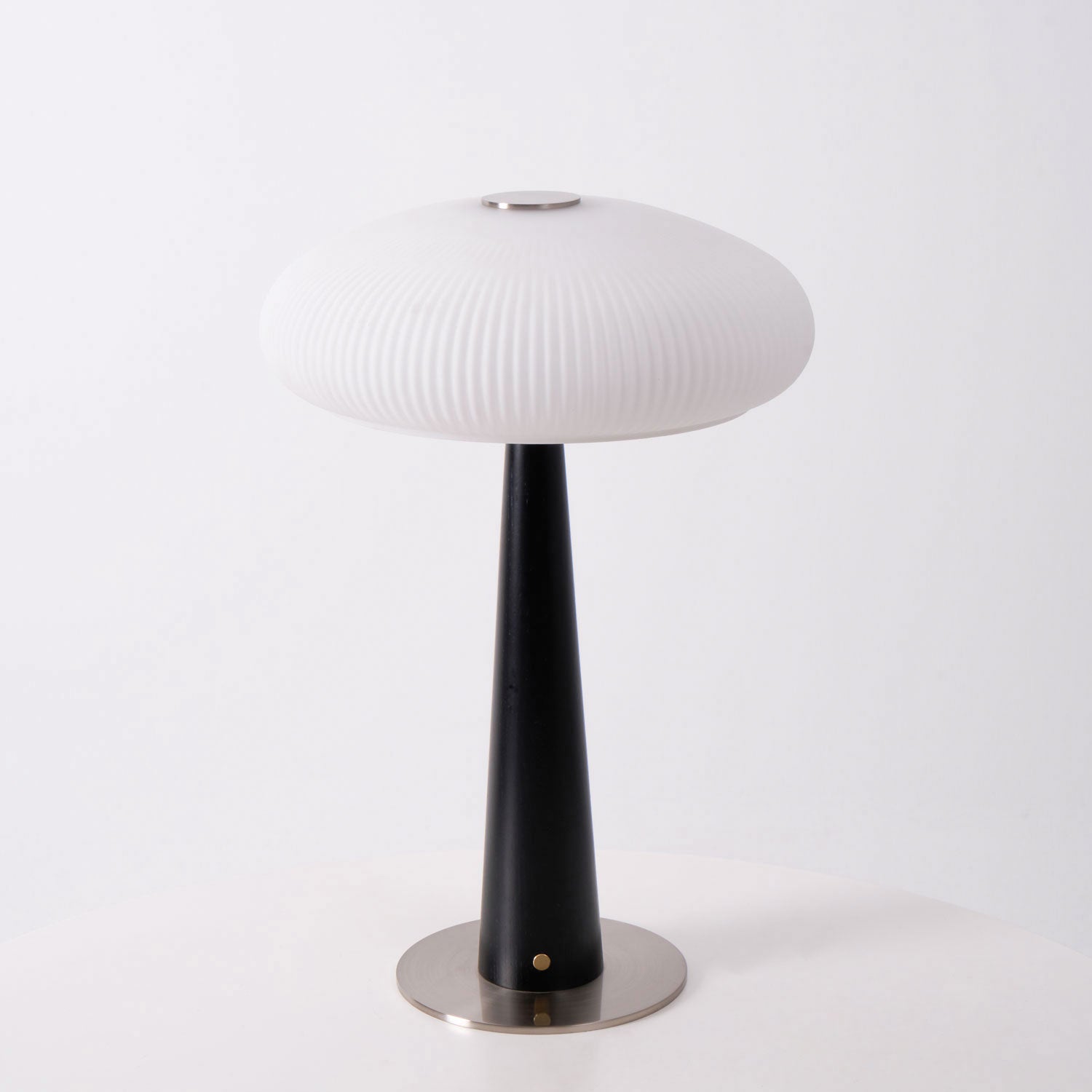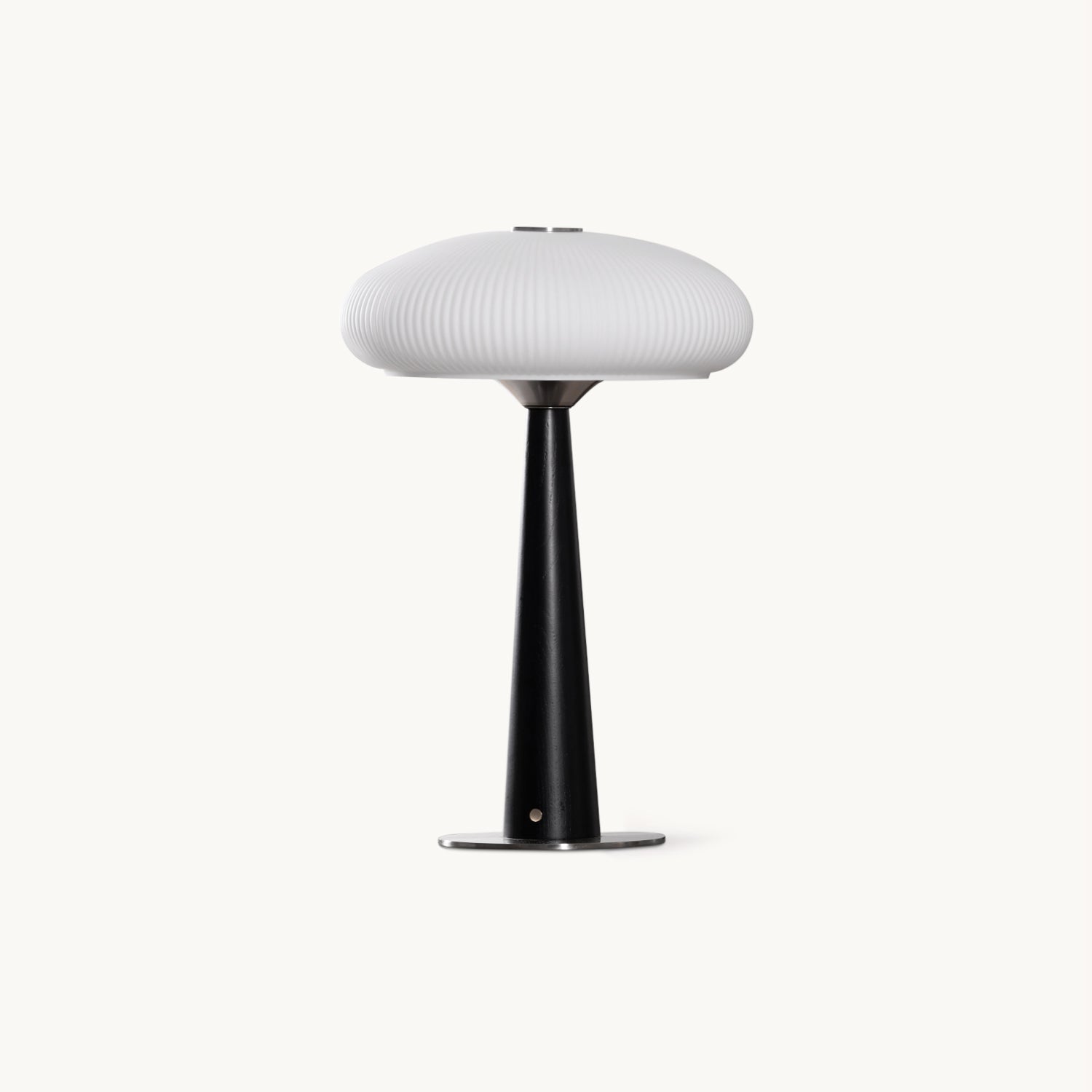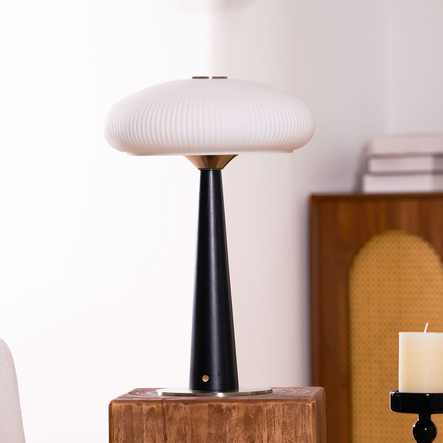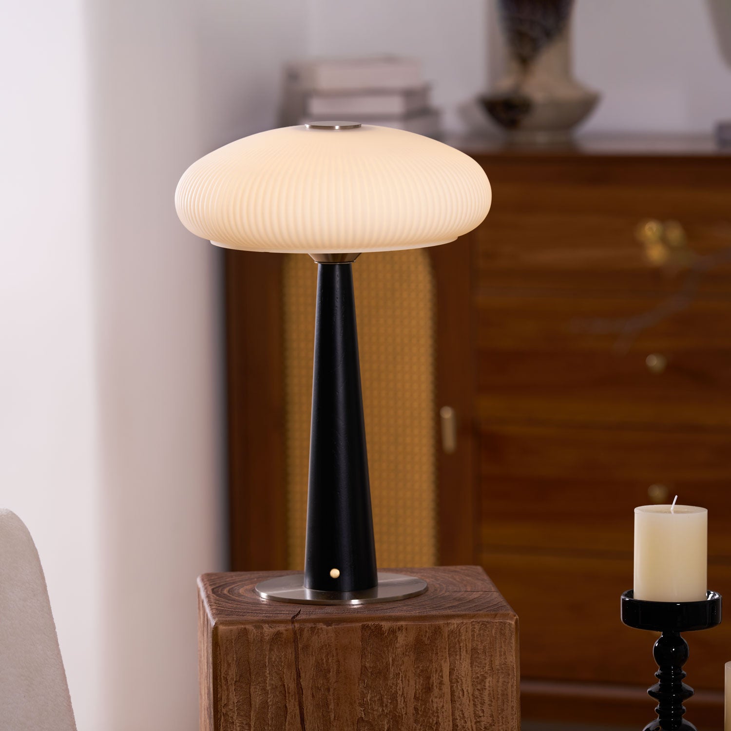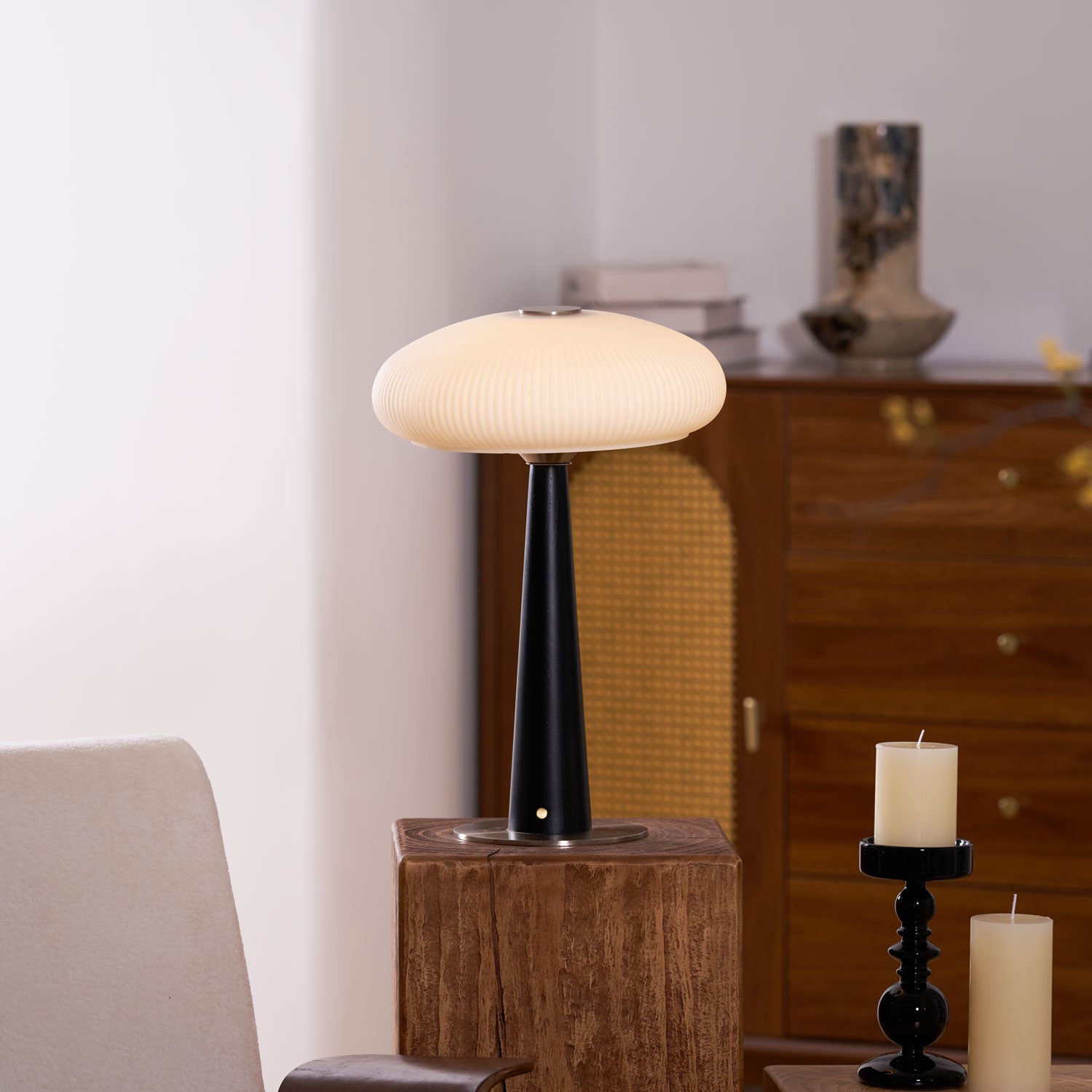 The Matsutake Table Lamp from Mooijane features a minimalist design with a fluted opal glass shade that softly diffuses light. Its slender black cone base and brushed metal disc create a sculptural, balanced silhouette. Perfect for modern bedrooms, reading nooks, or offices, it brings serene elegance to any space.