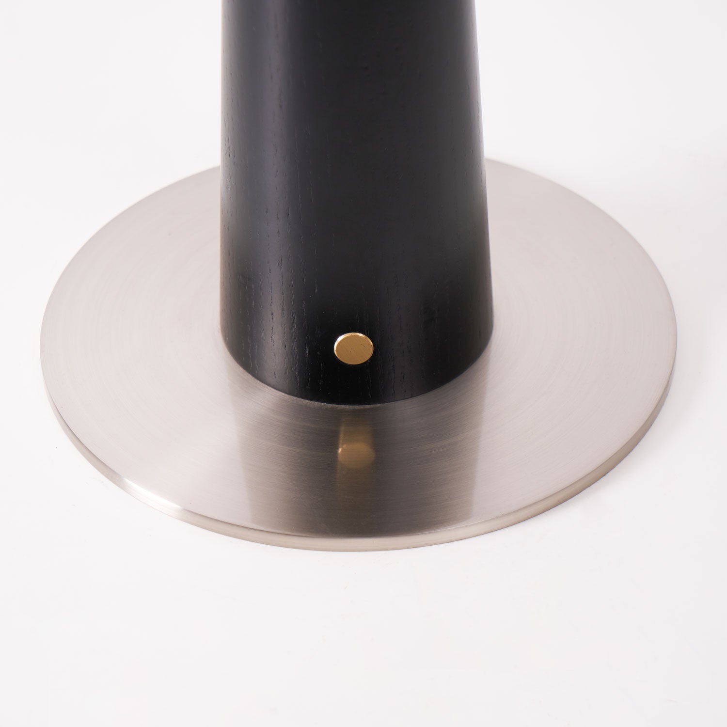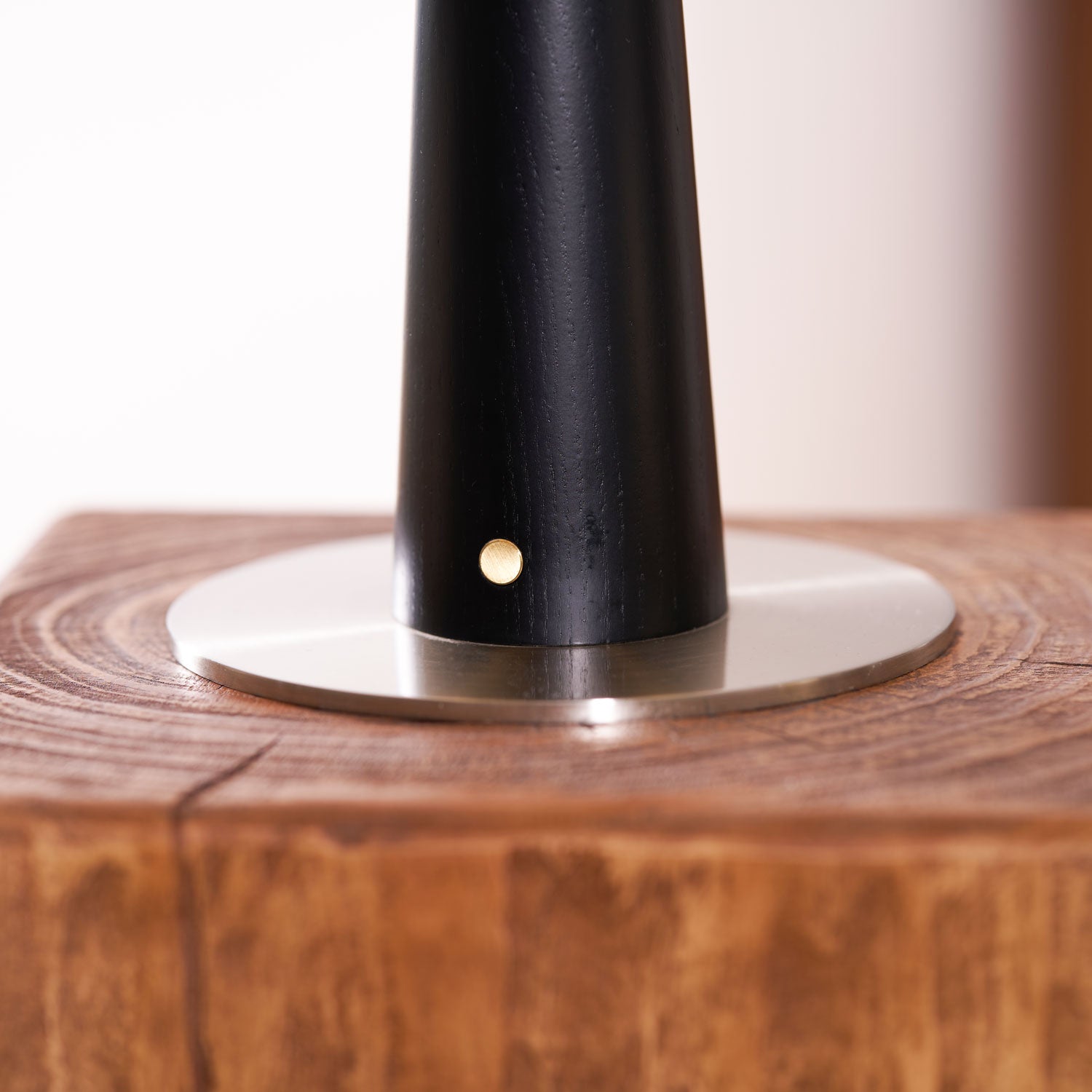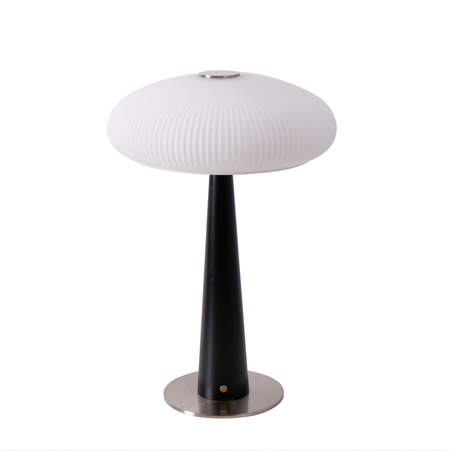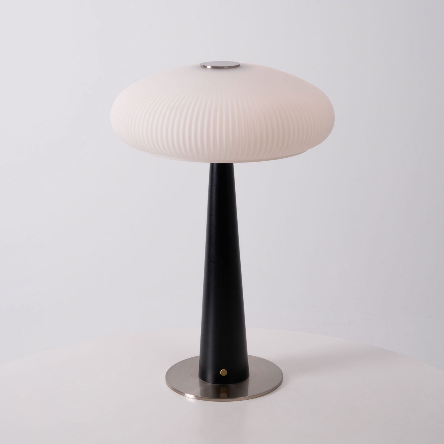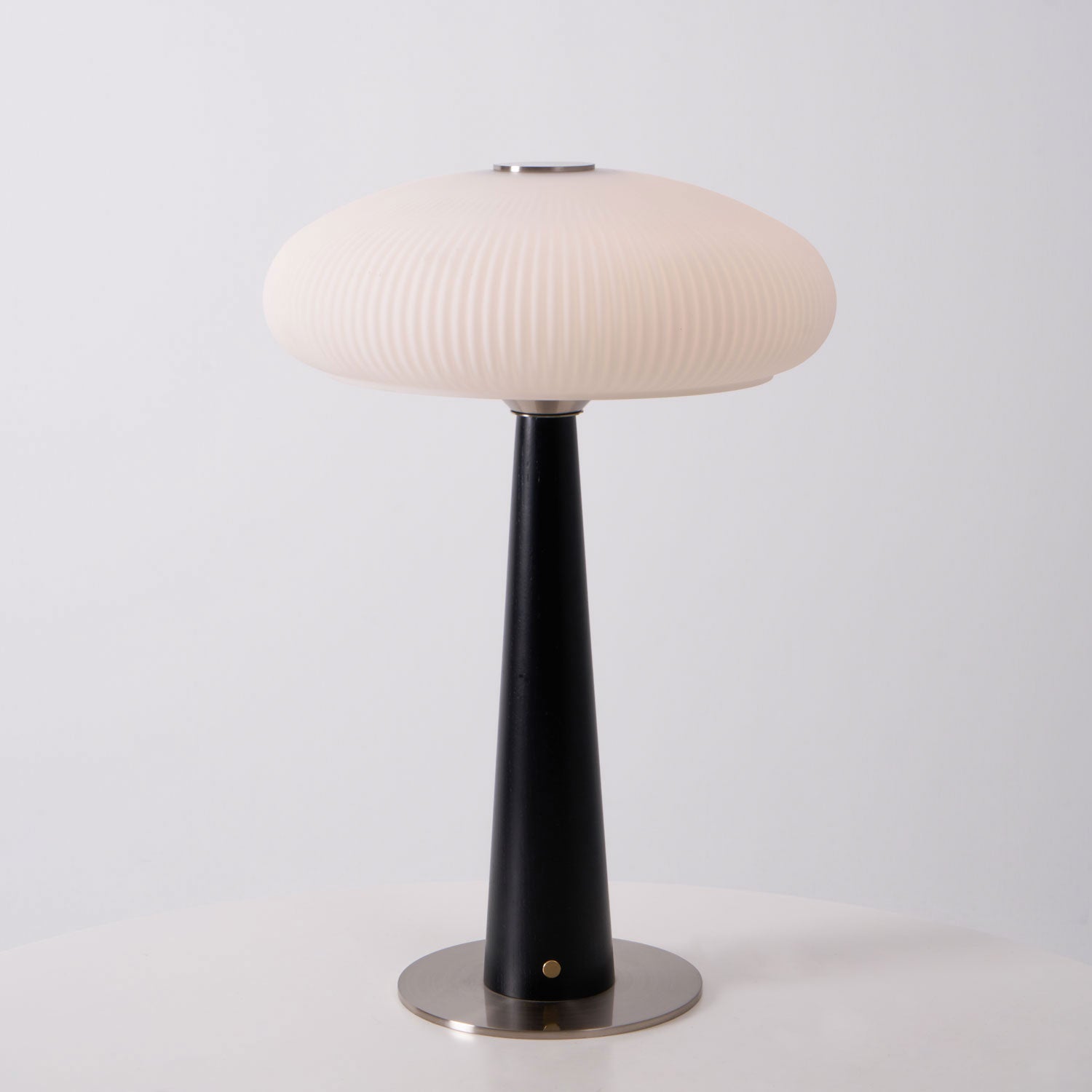 The Matsutake Table Lamp from Mooijane features a minimalist design with a fluted opal glass shade that softly diffuses light. Its slender black cone base and brushed metal disc create a sculptural, balanced silhouette. Perfect for modern bedrooms, reading nooks, or offices, it brings serene elegance to any space.