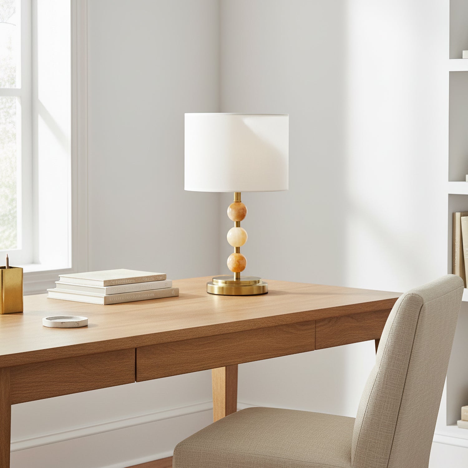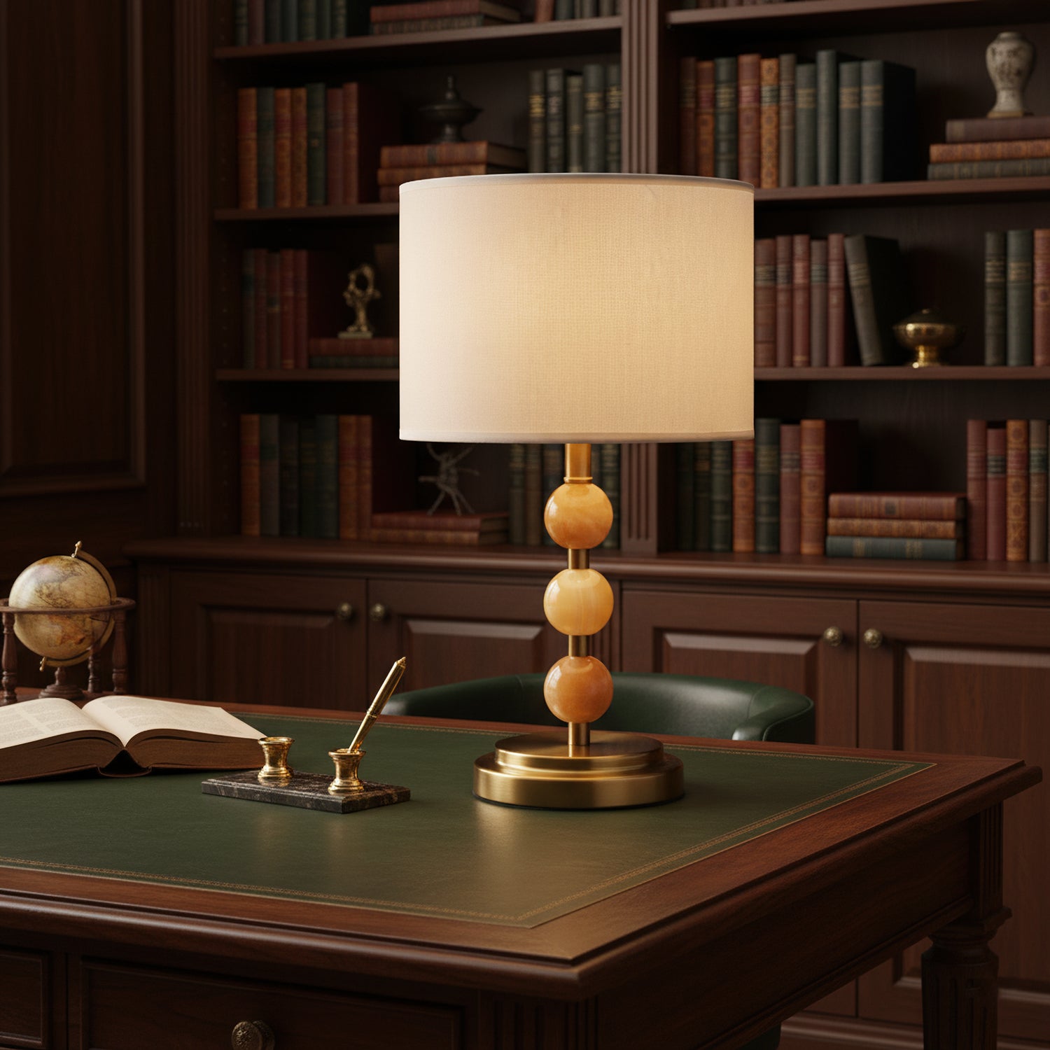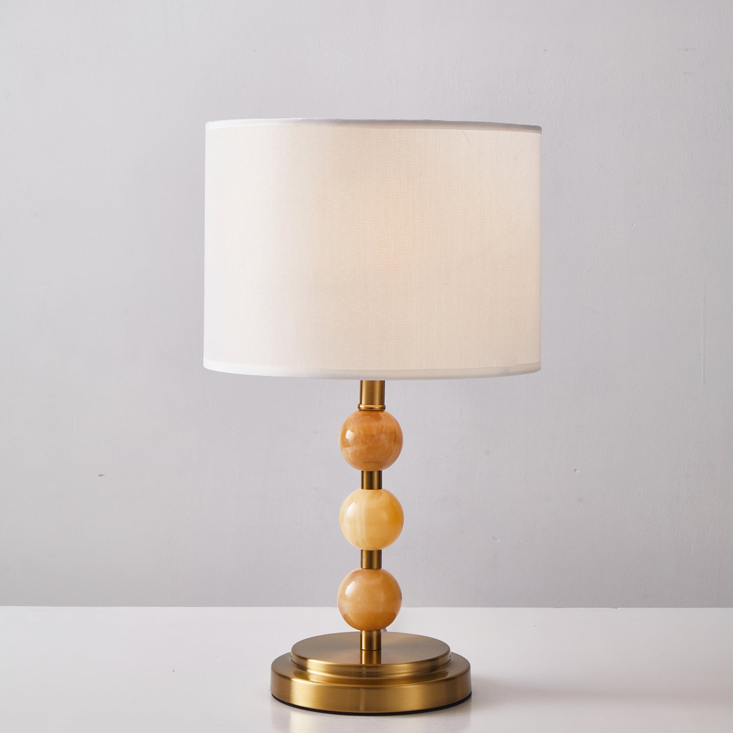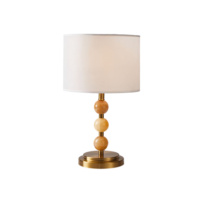 The Mccarter Table Lamp by Mooijane showcases a refined balance of geometry and natural beauty. Its base features three polished jade spheres stacked along a brushed metal stem, creating an elegant and harmonious silhouette. When lit, the translucent jade softly glows beneath a fabric shade, adding warmth and serenity to any space. Perfect for bedside tables, desks, or living rooms, this piece embodies timeless sophistication and subtle luxury.