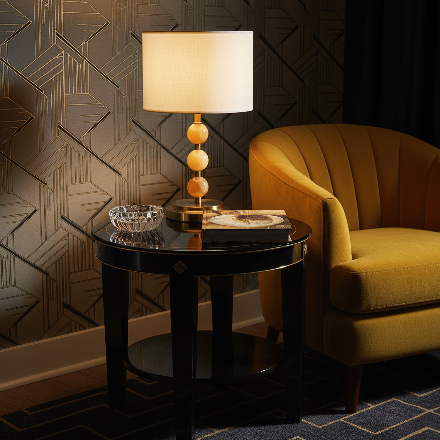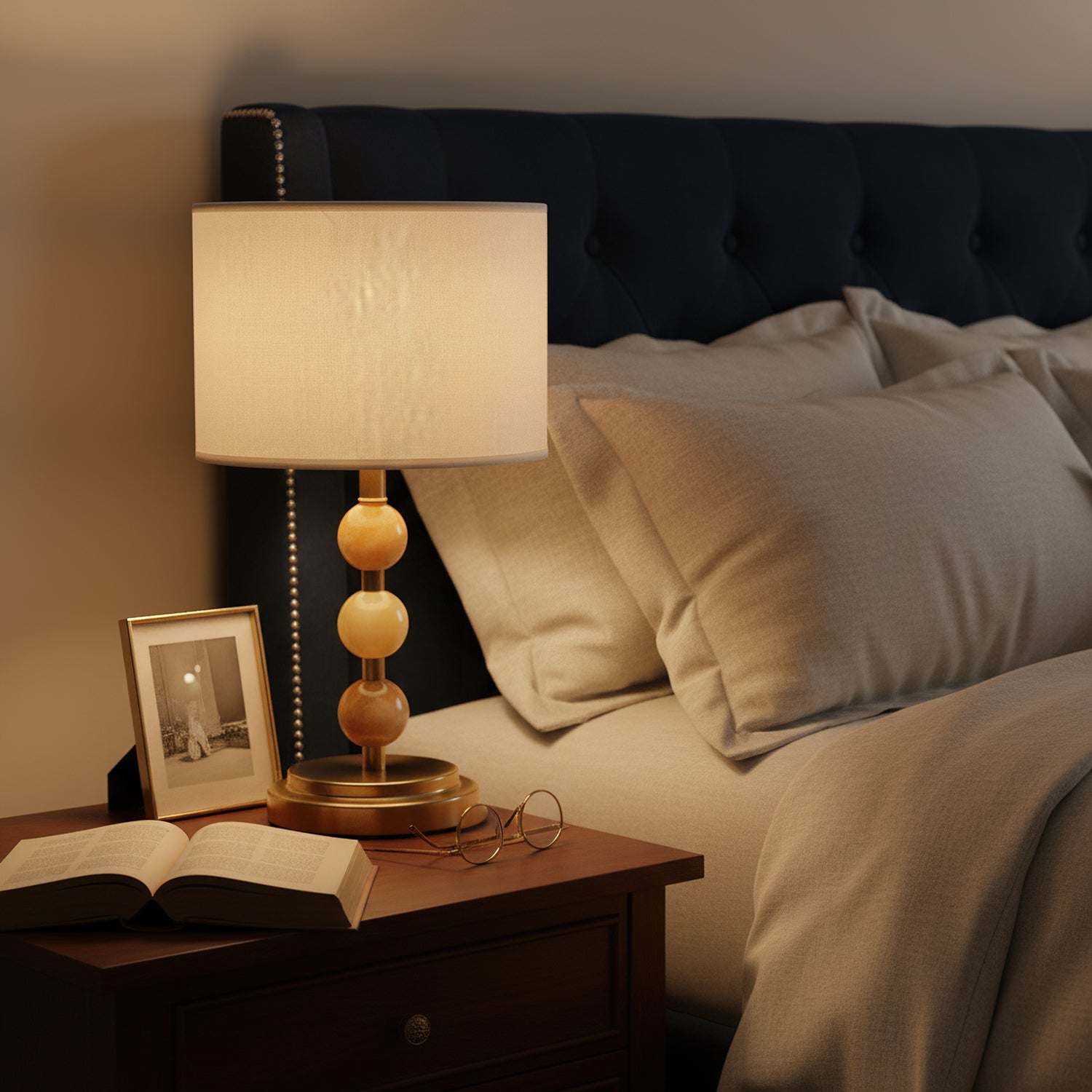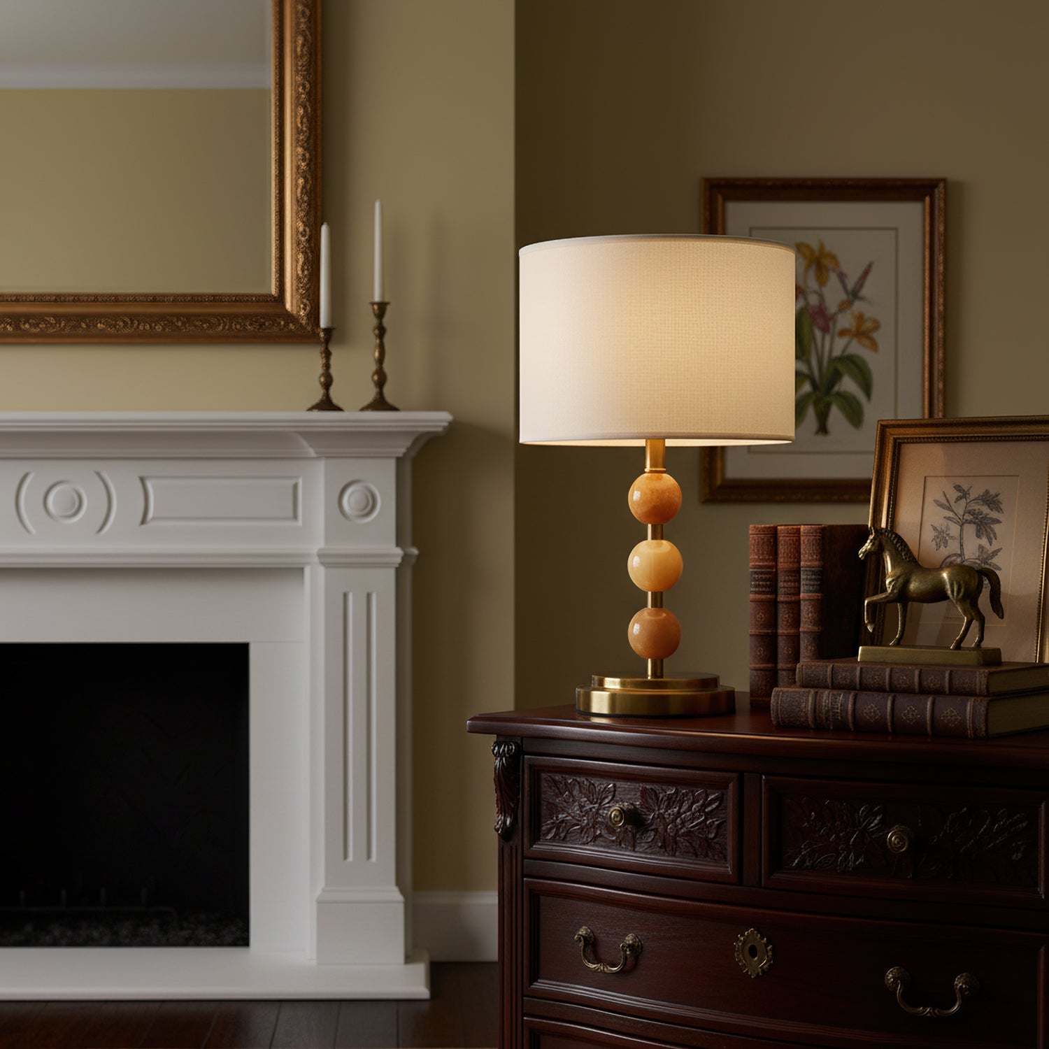 The Mccarter Table Lamp by Mooijane showcases a refined balance of geometry and natural beauty. Its base features three polished jade spheres stacked along a brushed metal stem, creating an elegant and harmonious silhouette. When lit, the translucent jade softly glows beneath a fabric shade, adding warmth and serenity to any space. Perfect for bedside tables, desks, or living rooms, this piece embodies timeless sophistication and subtle luxury.