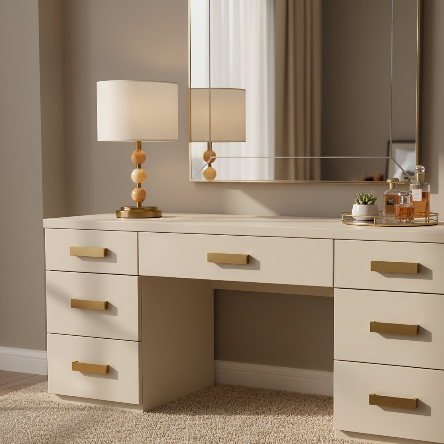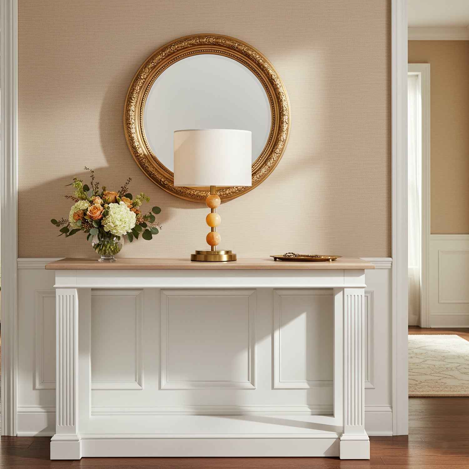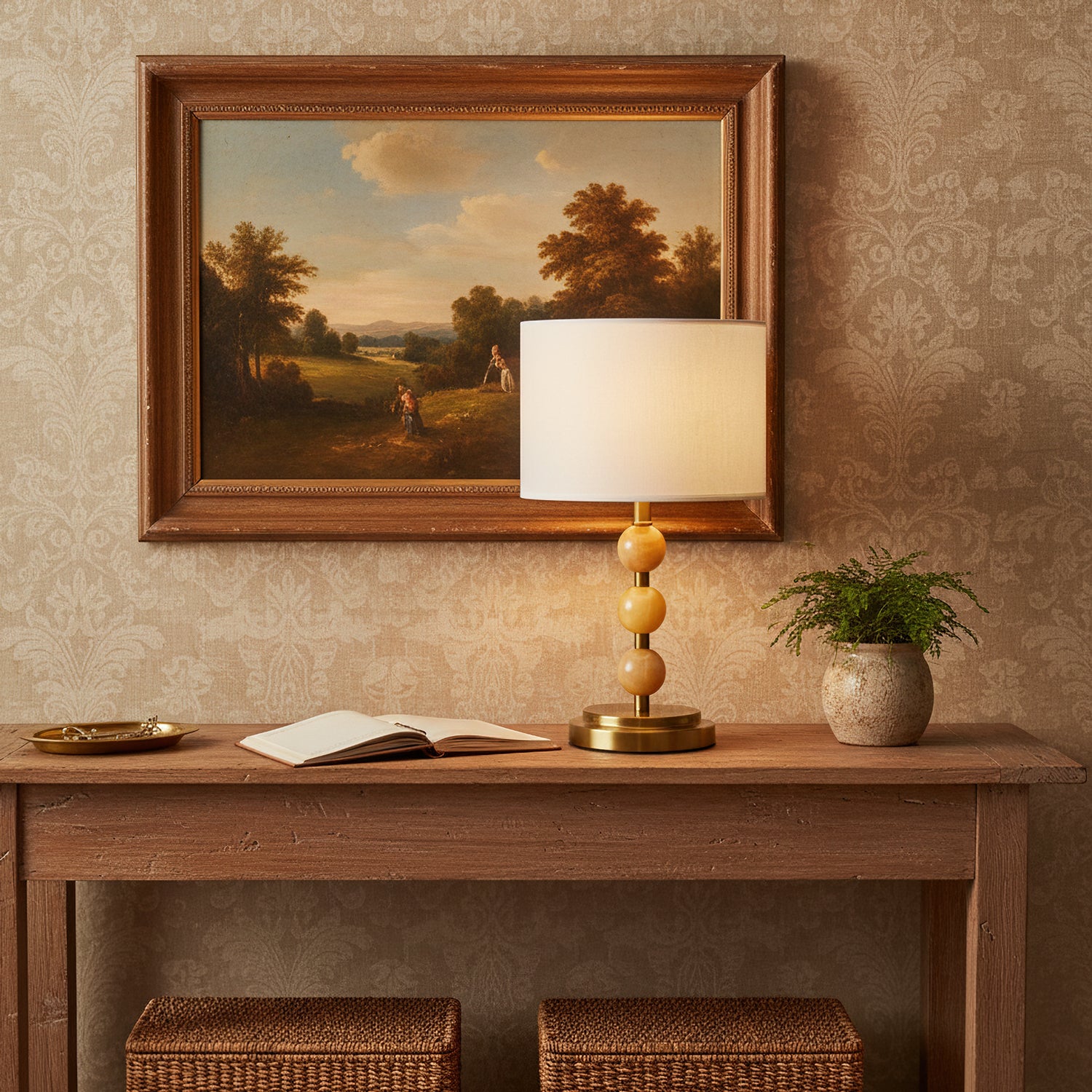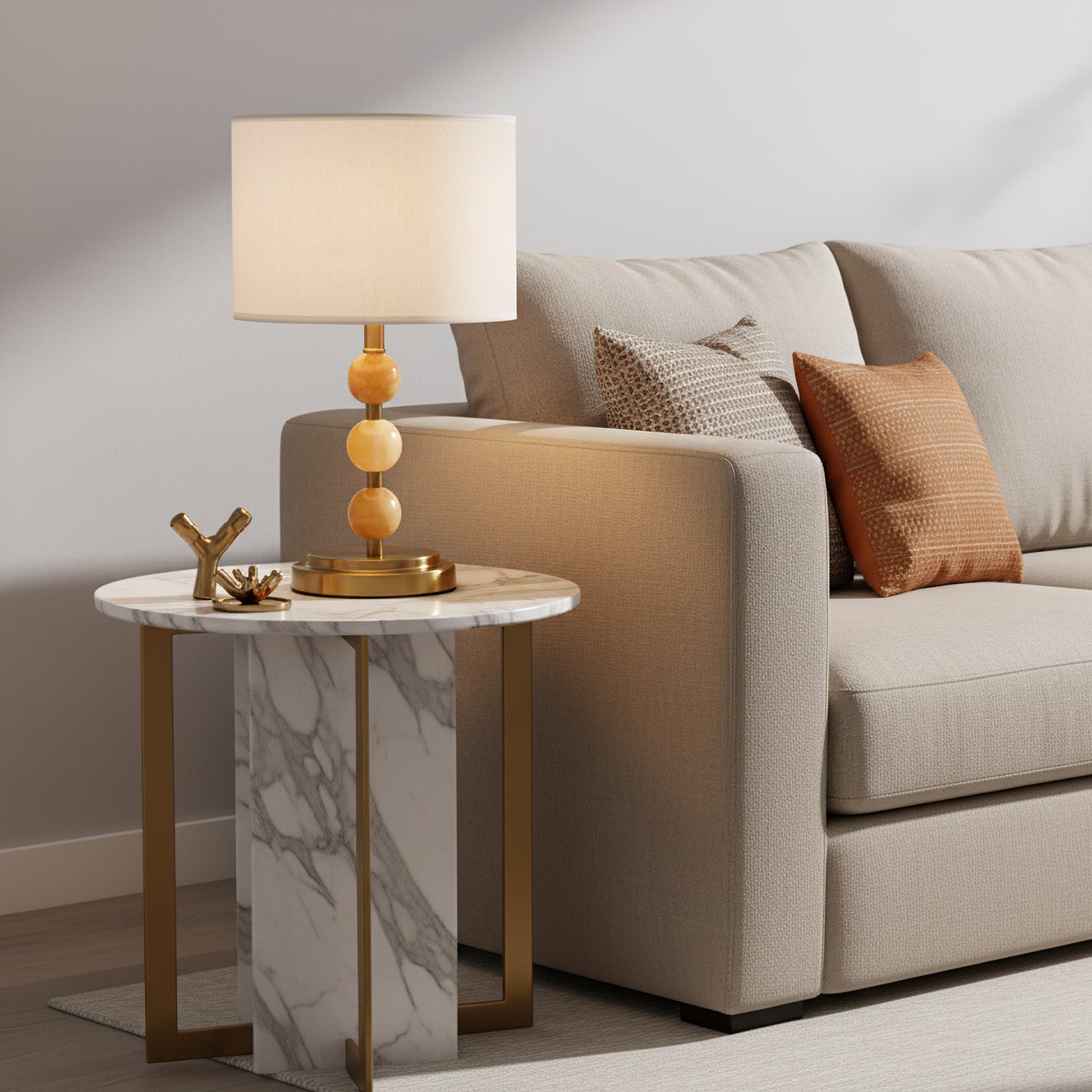 The Mccarter Table Lamp by Mooijane showcases a refined balance of geometry and natural beauty. Its base features three polished jade spheres stacked along a brushed metal stem, creating an elegant and harmonious silhouette. When lit, the translucent jade softly glows beneath a fabric shade, adding warmth and serenity to any space. Perfect for bedside tables, desks, or living rooms, this piece embodies timeless sophistication and subtle luxury.