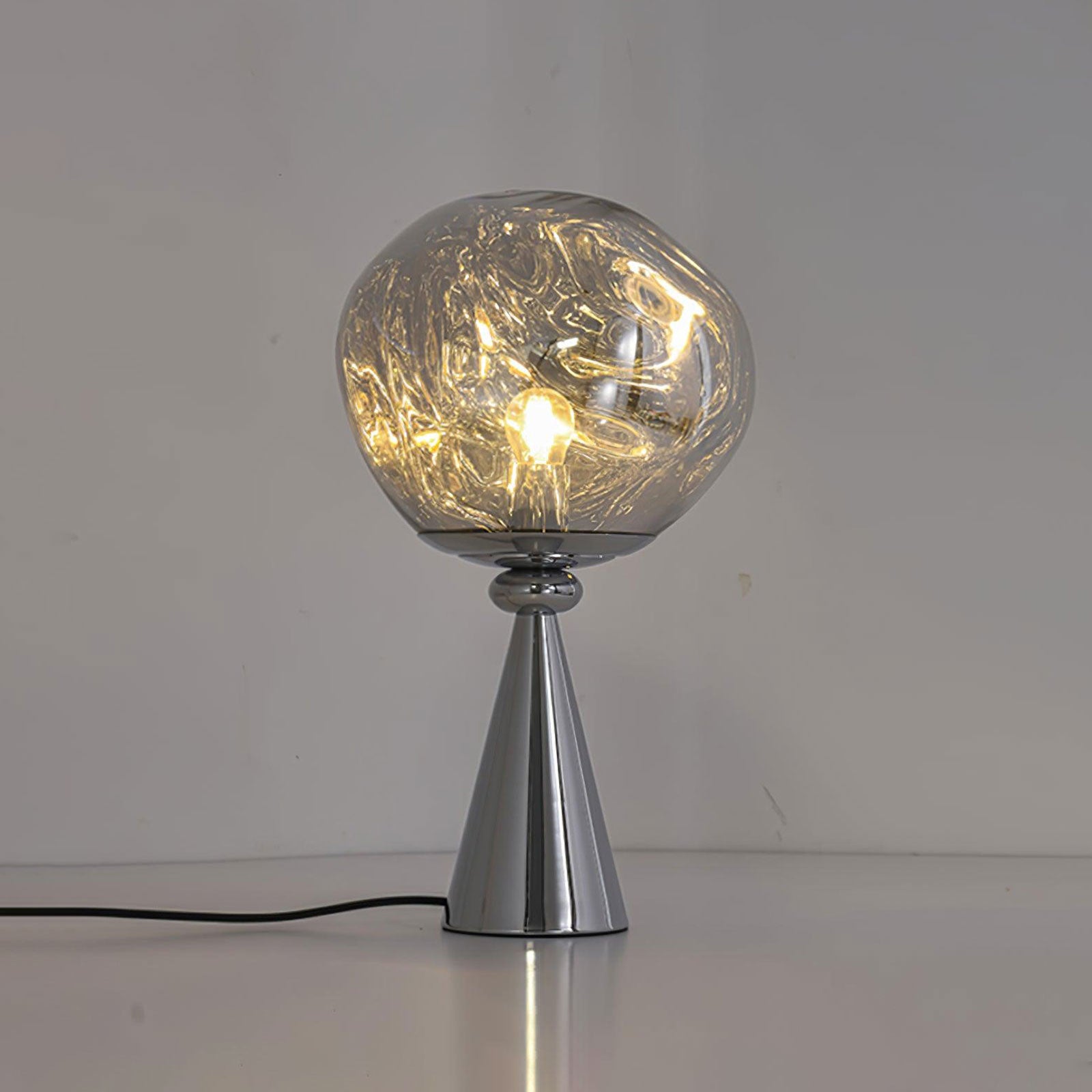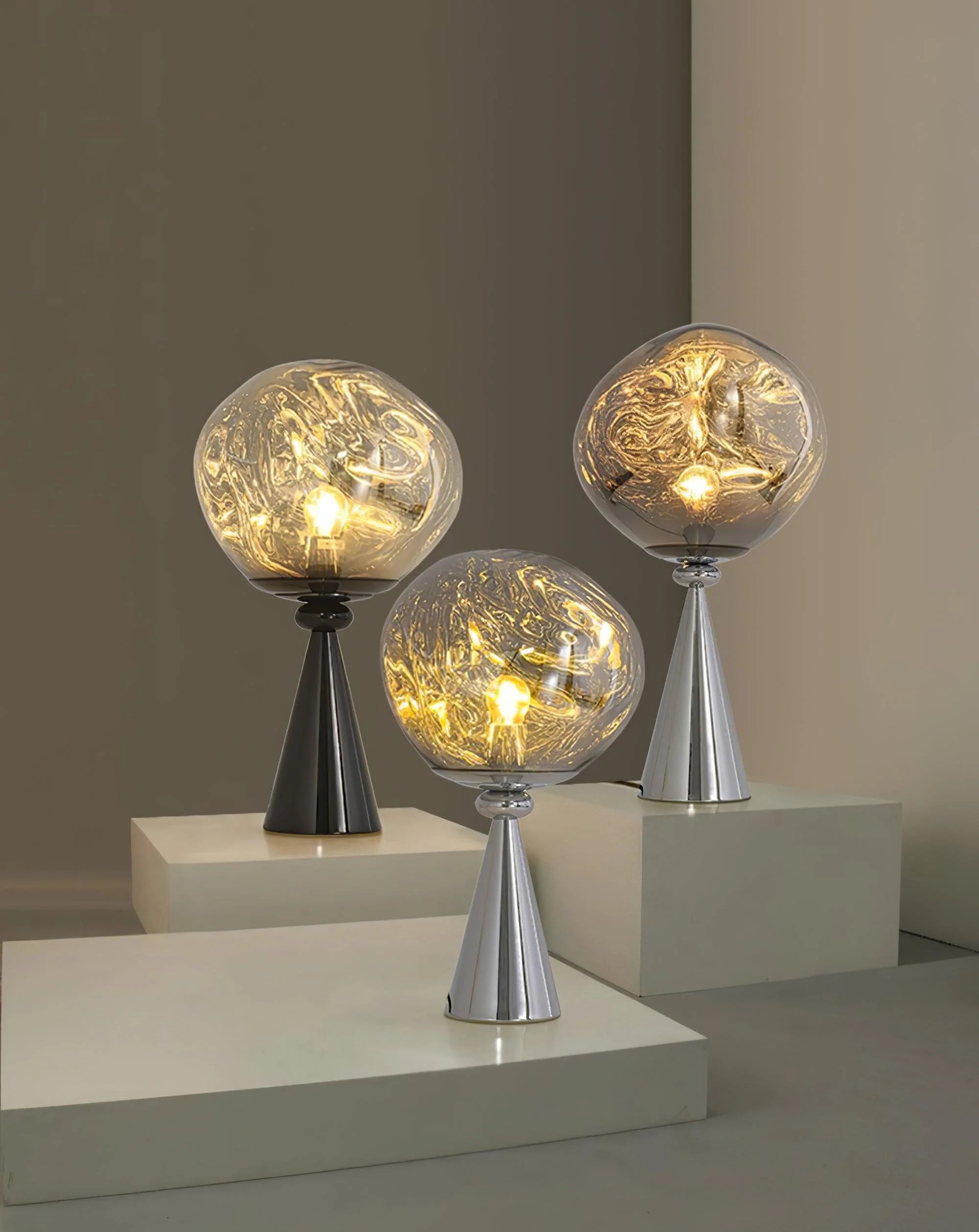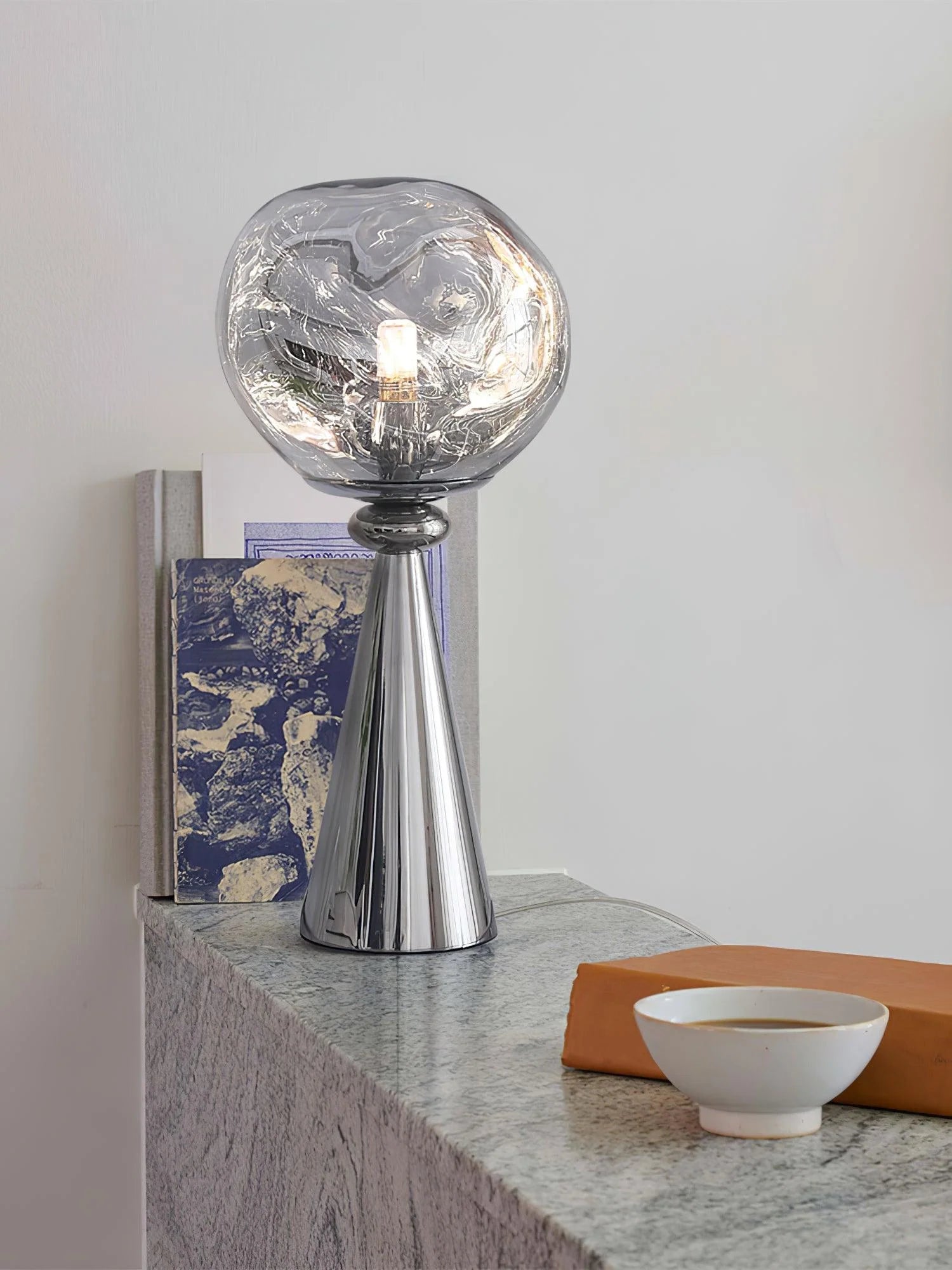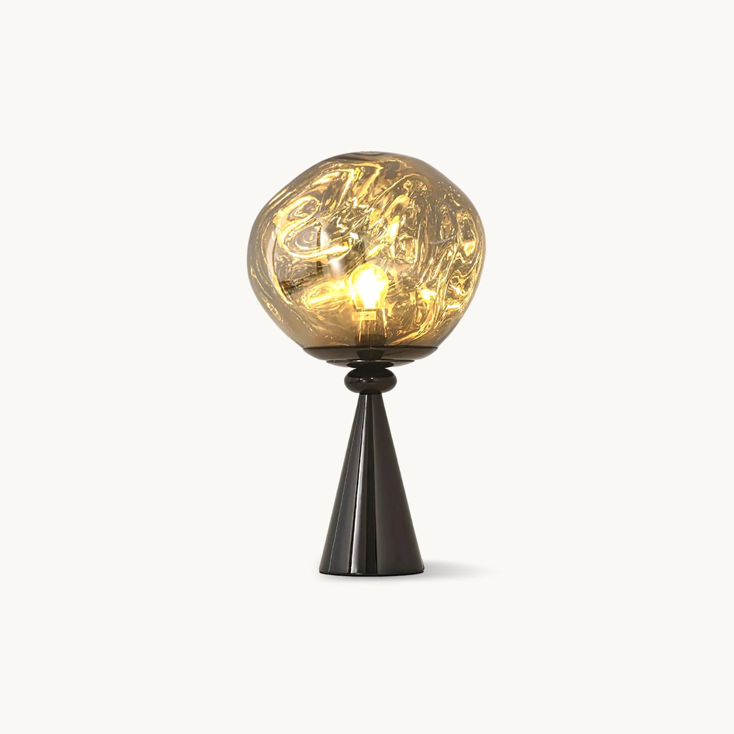 Translucent when on and mirror-finish when off, The Lava Gold Table Lamp is a beautifully twisted lighting sphere that creates a mesmerizing hot-blown glass effect. The Lava Gold Table Lamp are a series of distorted spherical pendants, half-metallised to create an extraordinary optic effect and cast an ethereal luminosity on their surroundings.