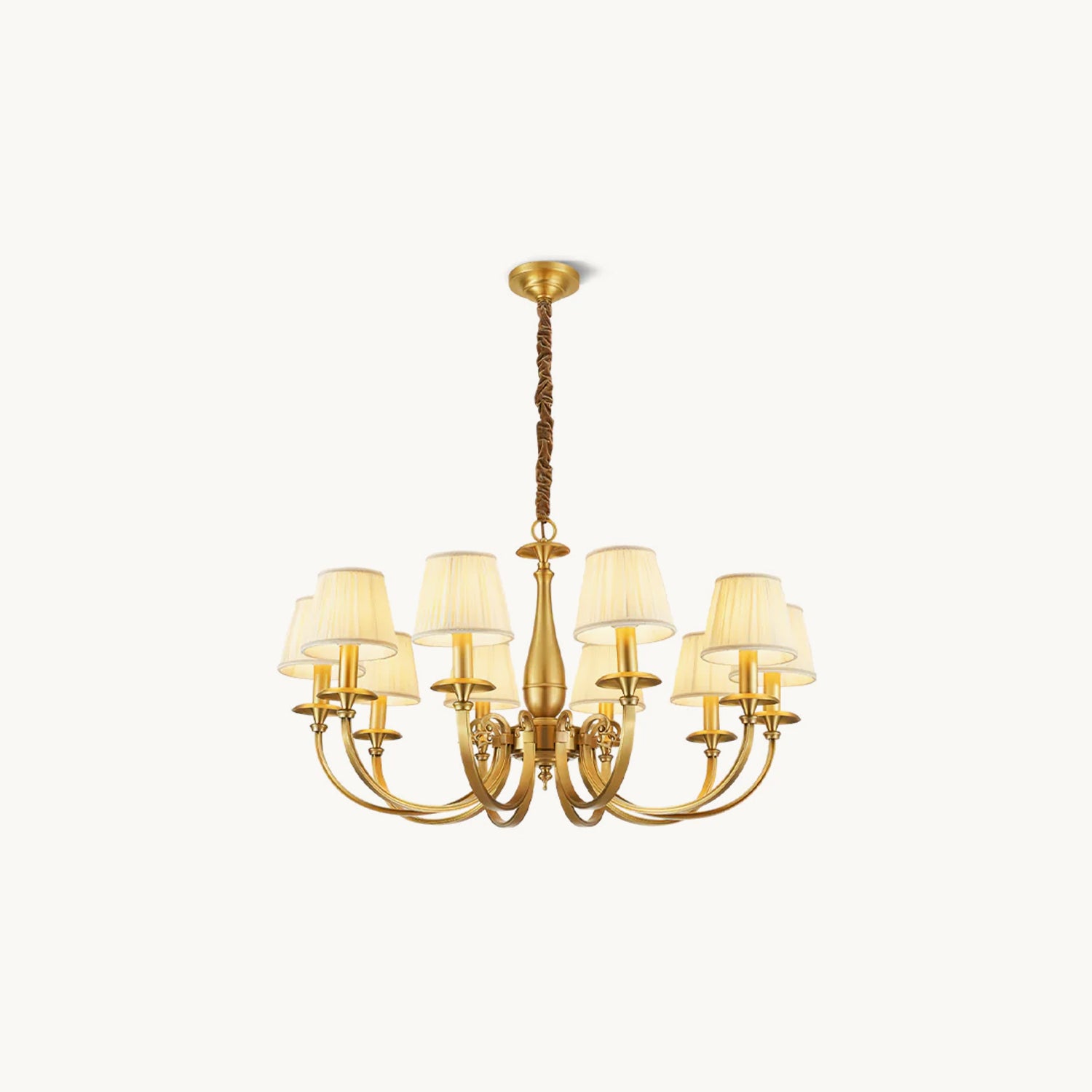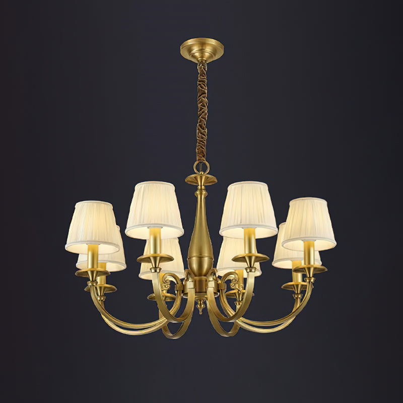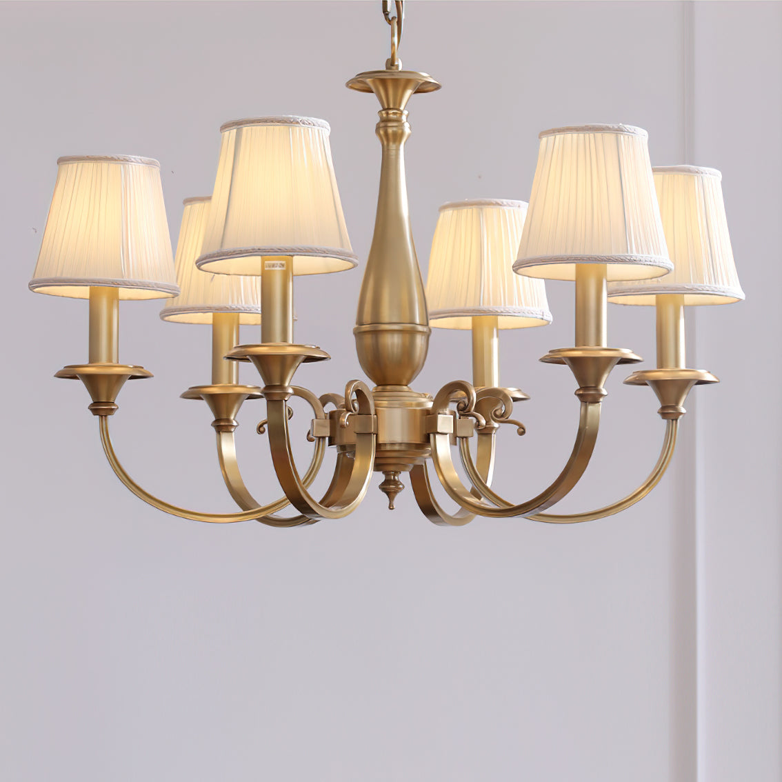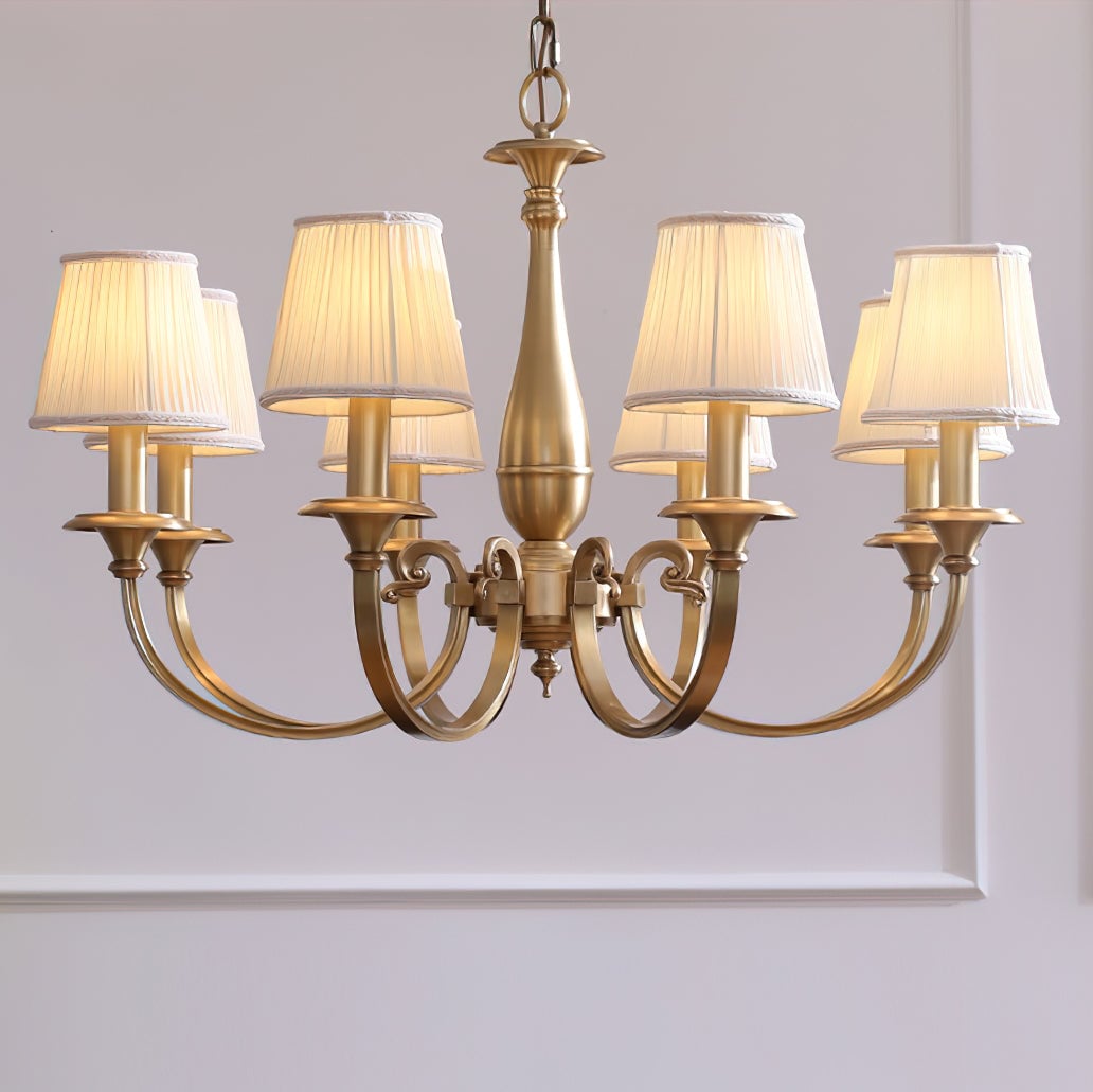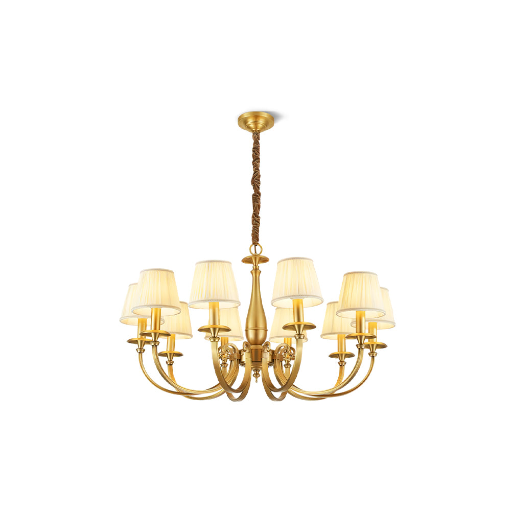 Add a touch of elegance to your space with the Menlo Park Chandelier. Made from premium quality solid brass, this chandelier features beautifully curved arms and detailed finishes, showcasing a classic Georgian style. The white pleated fabric shades add a soft touch to the antique brass design. Elevate your home with this sophisticated and timeless piece.