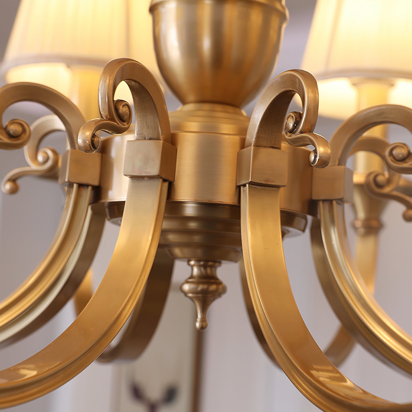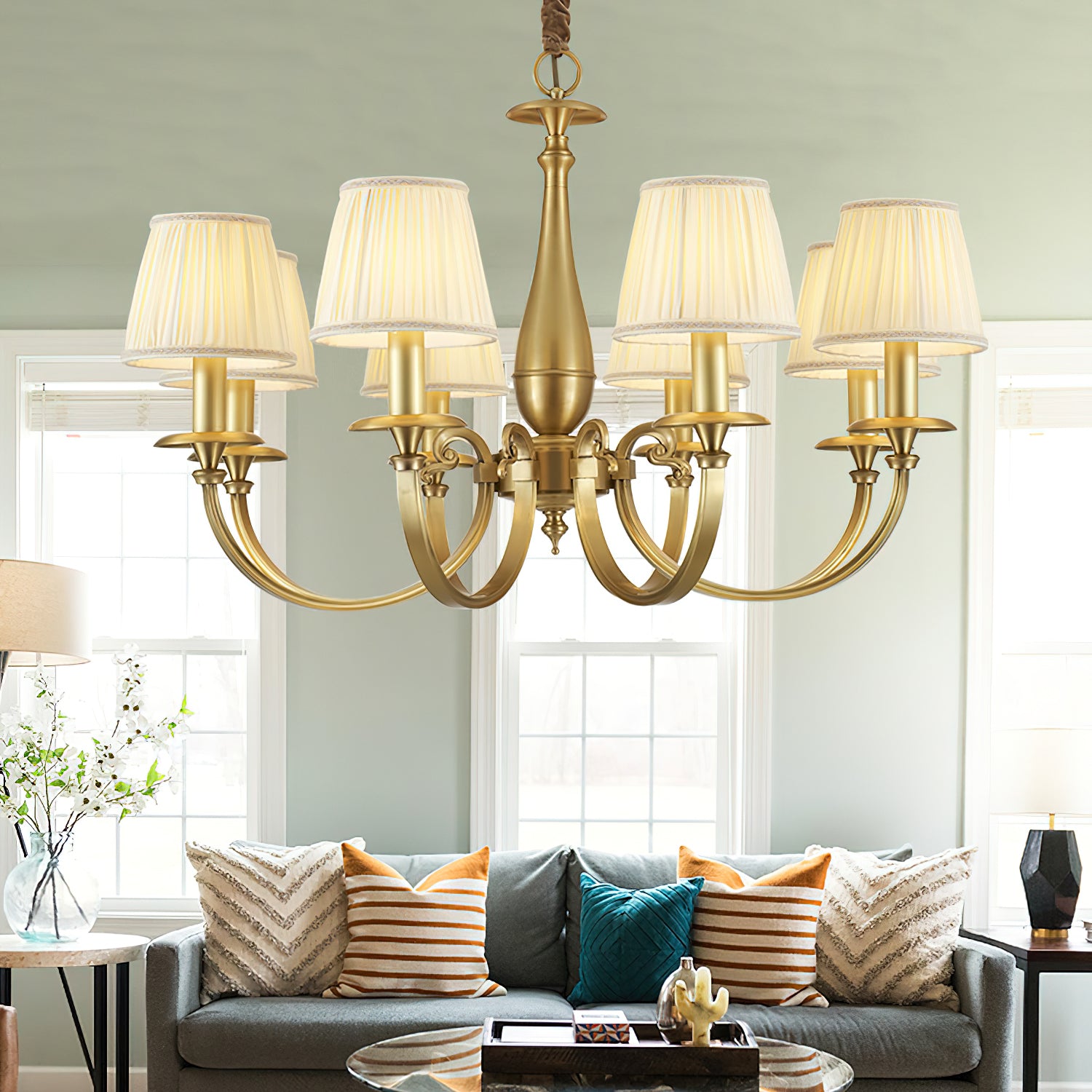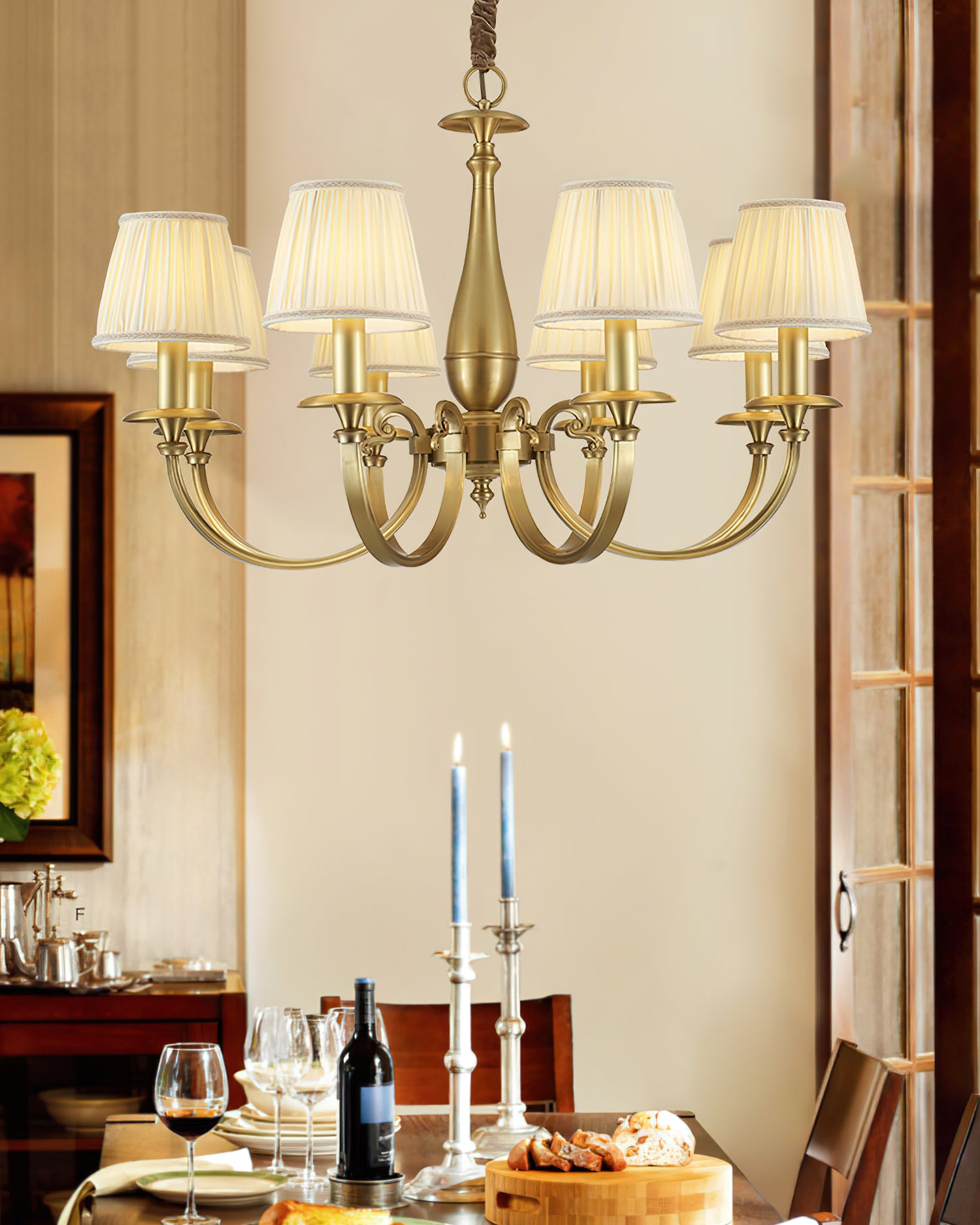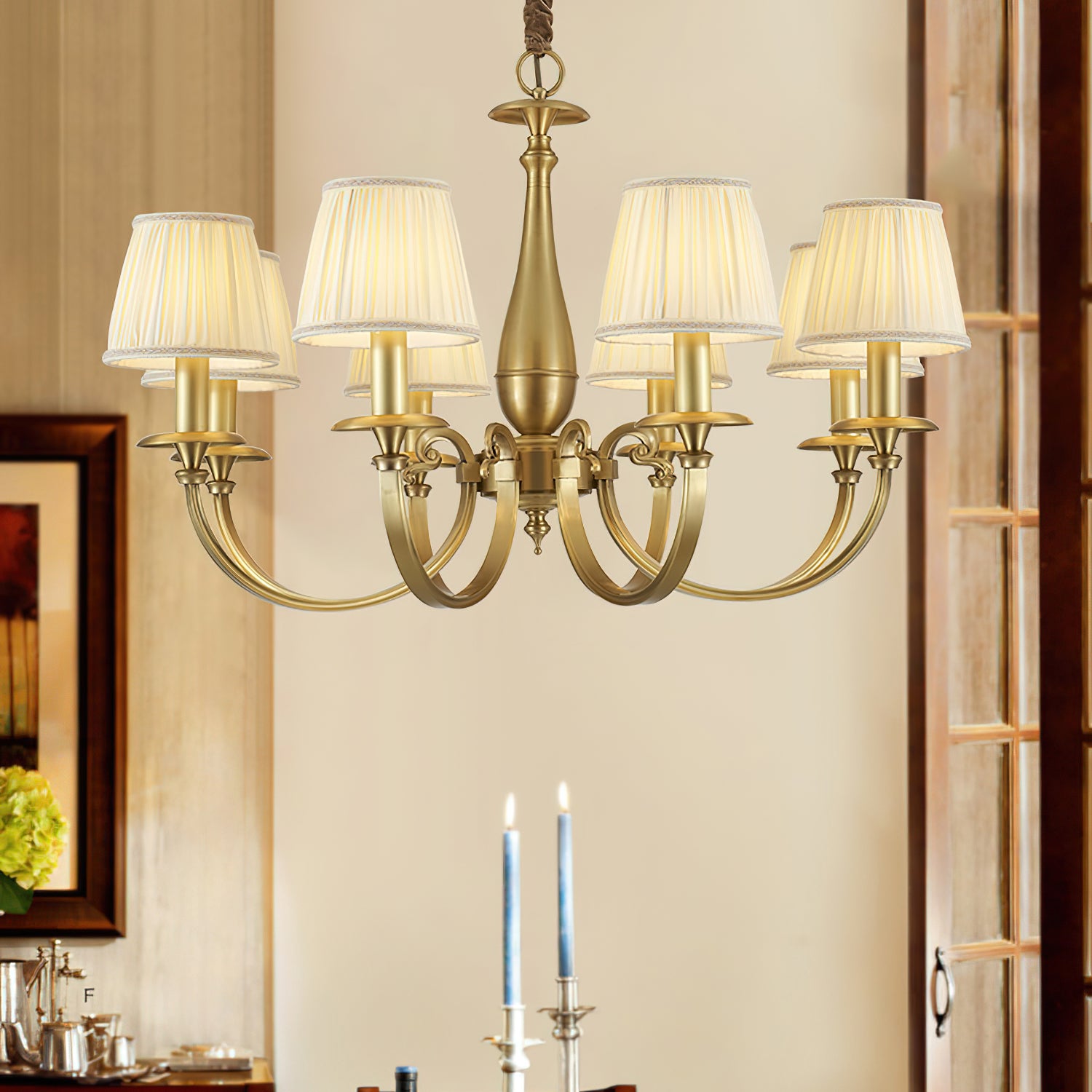 Add a touch of elegance to your space with the Menlo Park Chandelier. Made from premium quality solid brass, this chandelier features beautifully curved arms and detailed finishes, showcasing a classic Georgian style. The white pleated fabric shades add a soft touch to the antique brass design. Elevate your home with this sophisticated and timeless piece.