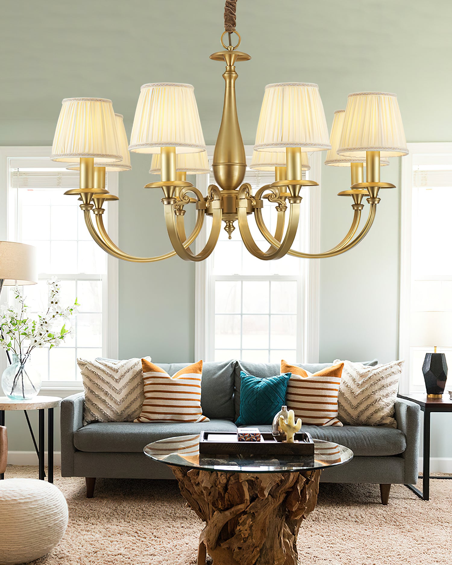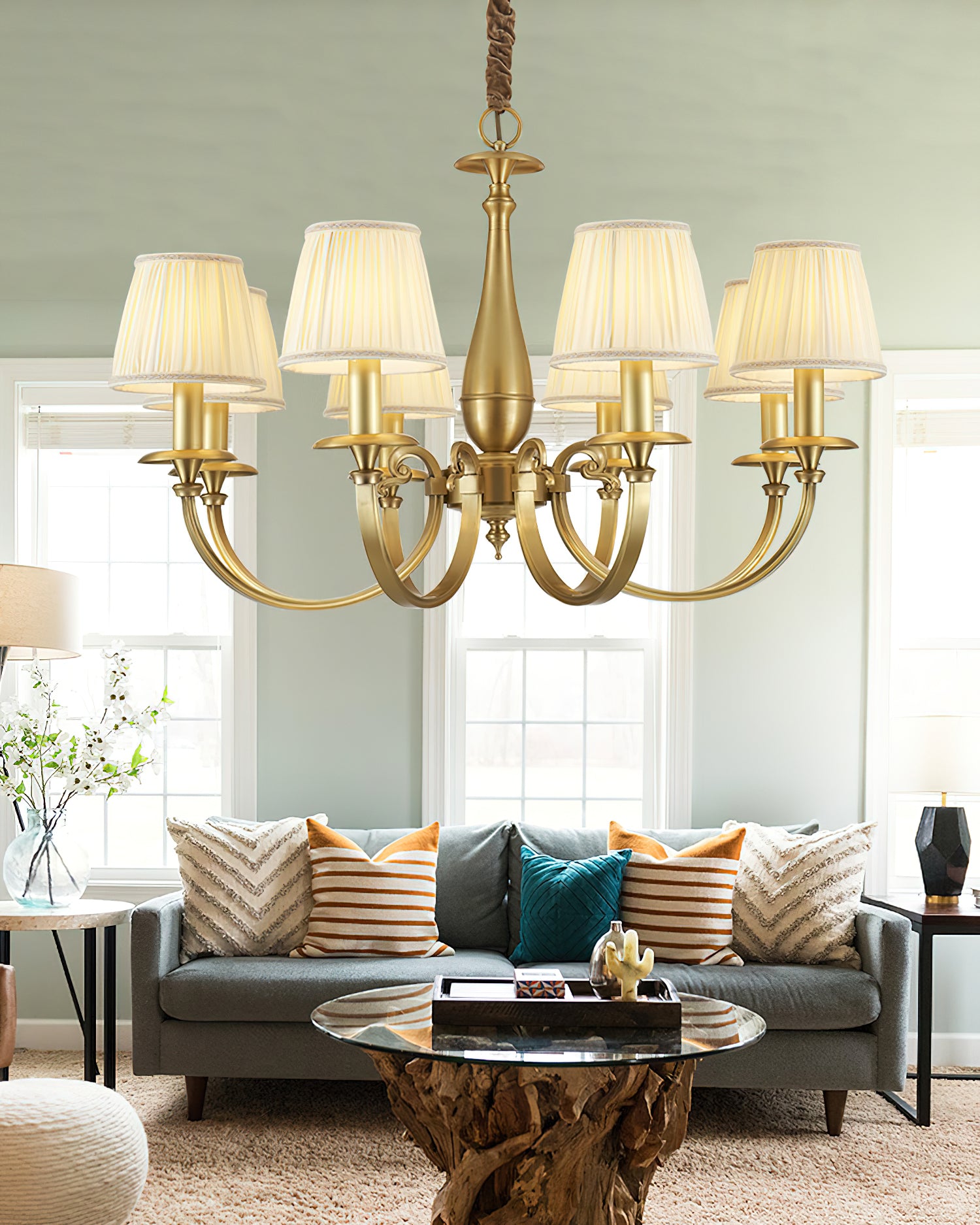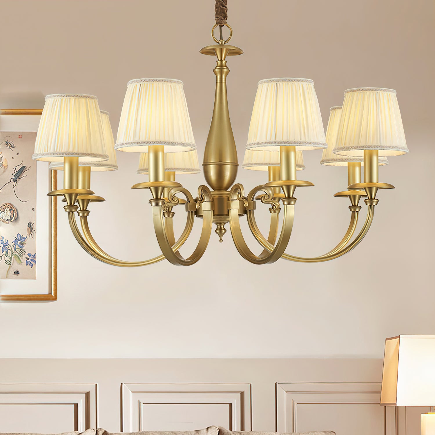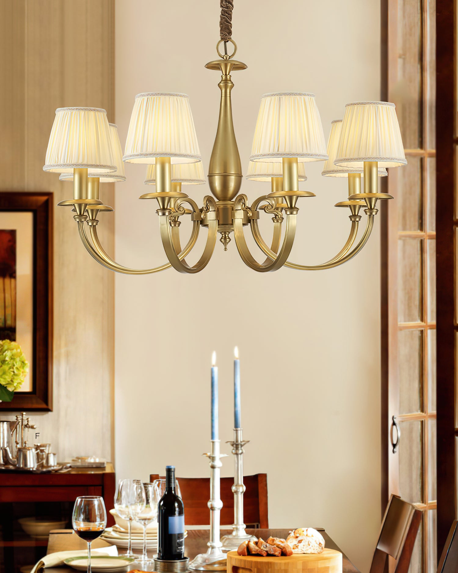 Add a touch of elegance to your space with the Menlo Park Chandelier. Made from premium quality solid brass, this chandelier features beautifully curved arms and detailed finishes, showcasing a classic Georgian style. The white pleated fabric shades add a soft touch to the antique brass design. Elevate your home with this sophisticated and timeless piece.