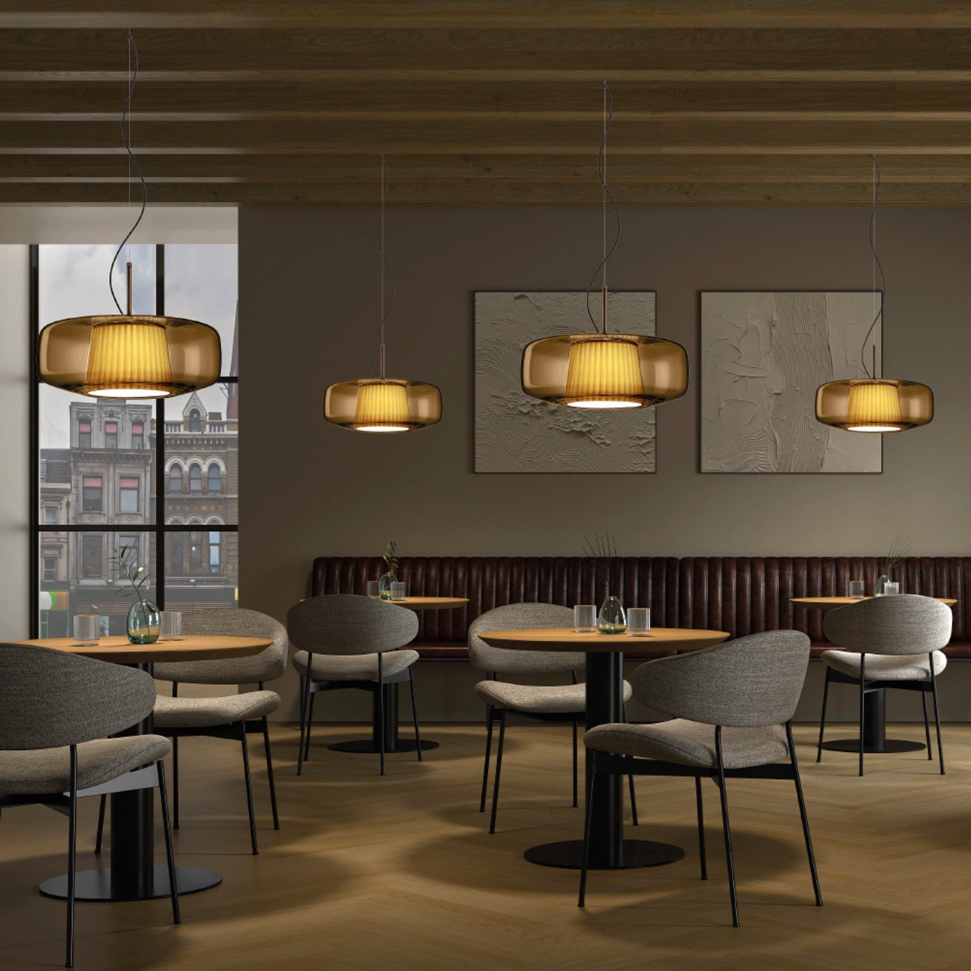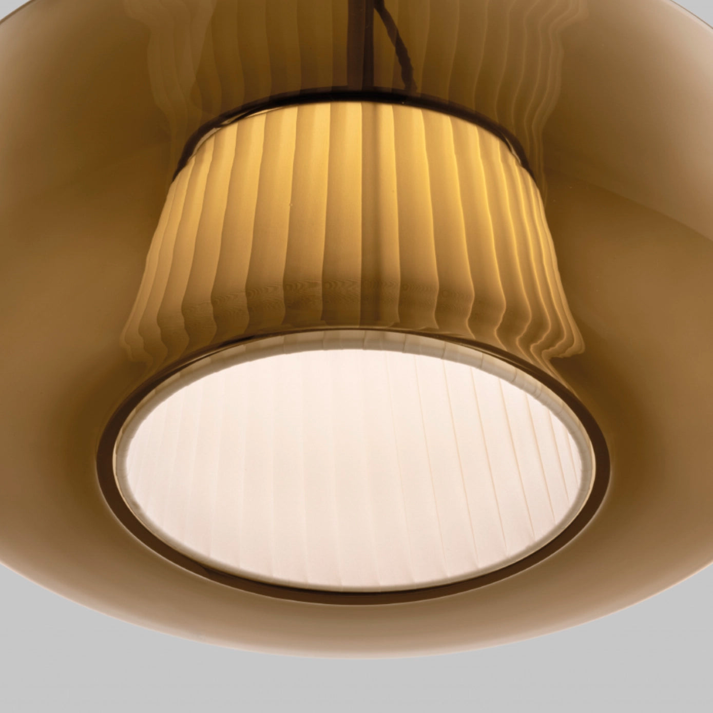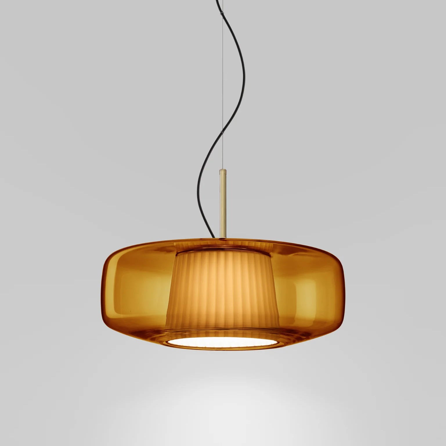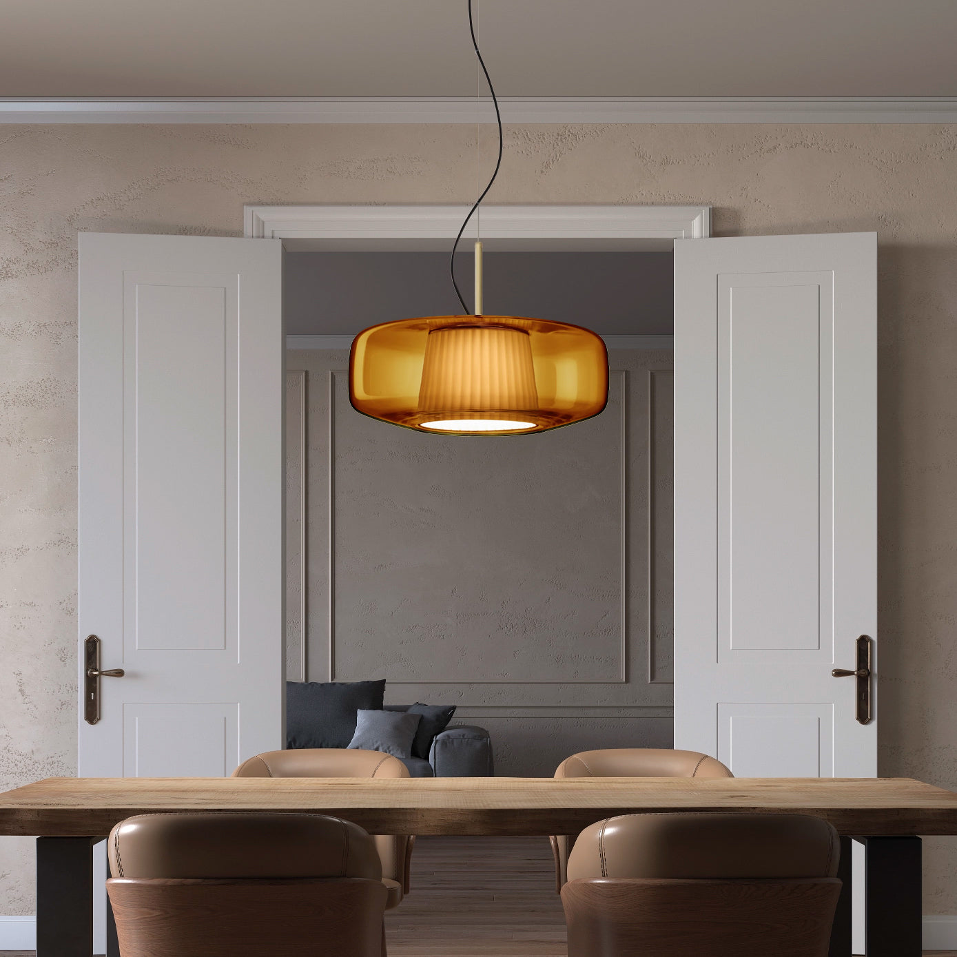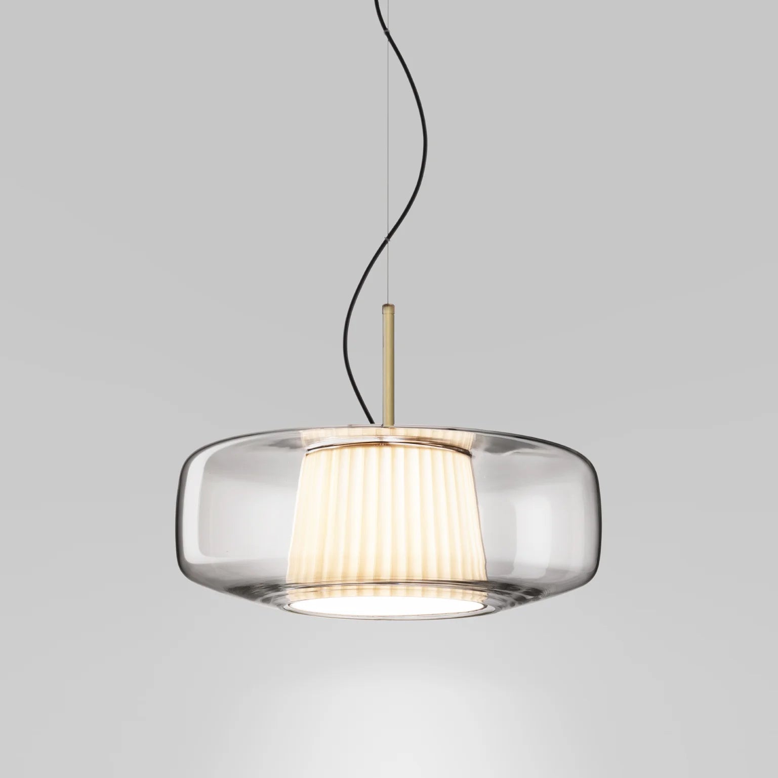 The Mercer Pendant Light by Mooijane captures the fluid elegance of a jellyfish in motion through its layered design and graceful silhouette. An oversized blown glass diffuser surrounds an inner fabric shade, creating a rich interplay of transparency, shadow, and texture. This refined composition adds depth and character to any interior.