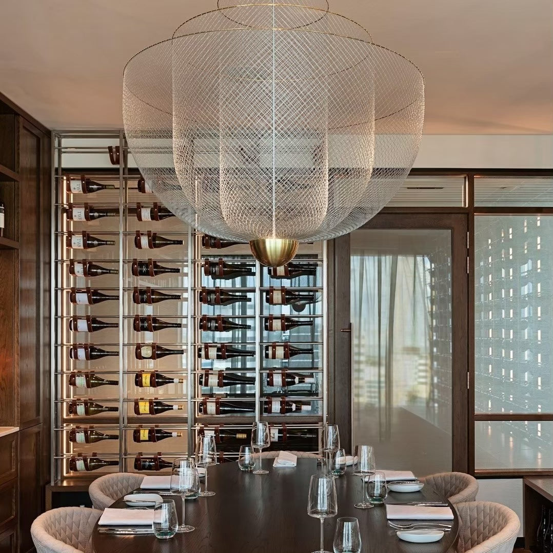 Introducing the Meshmatics Chandelier, a true work of art. Its intricate metal wires are carefully crafted using innovative tools and machines to create a tightly controlled design that exudes sophistication. Experience the elegance and sparkle this chandelier brings to any space.