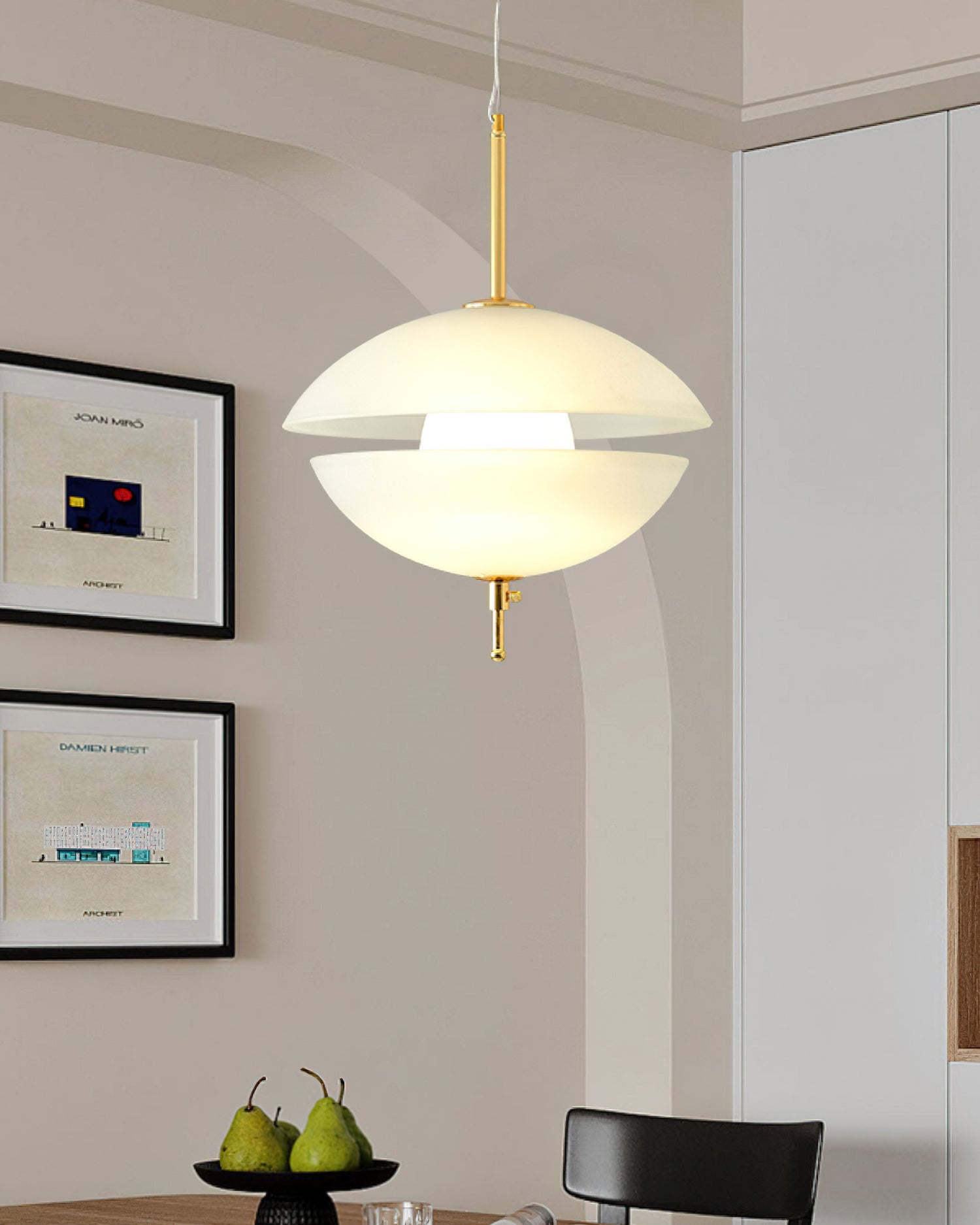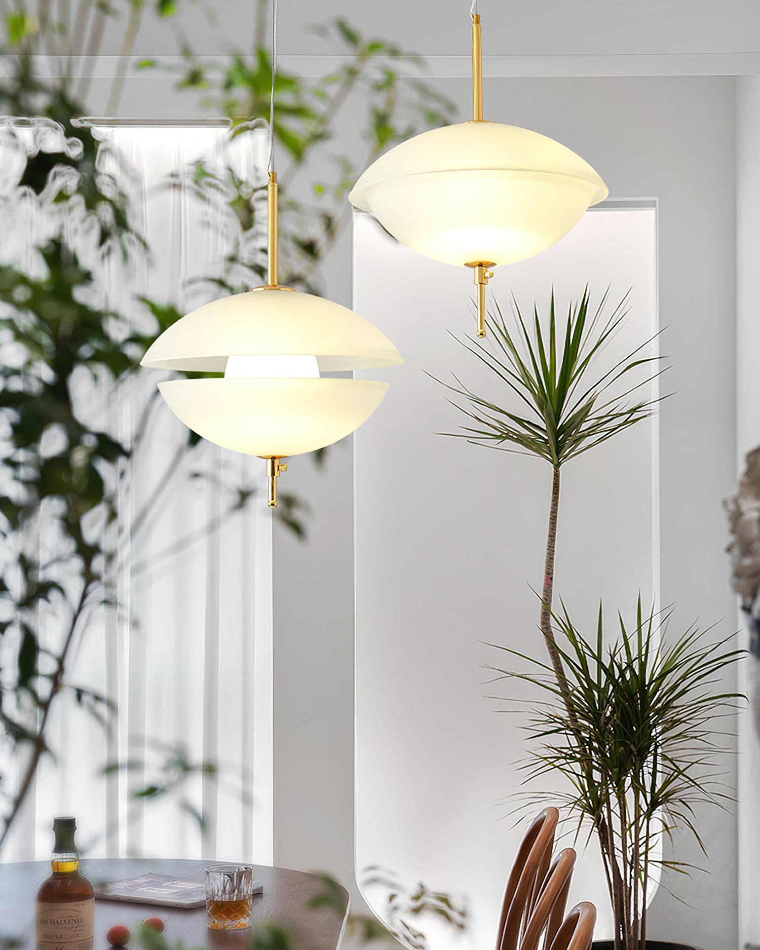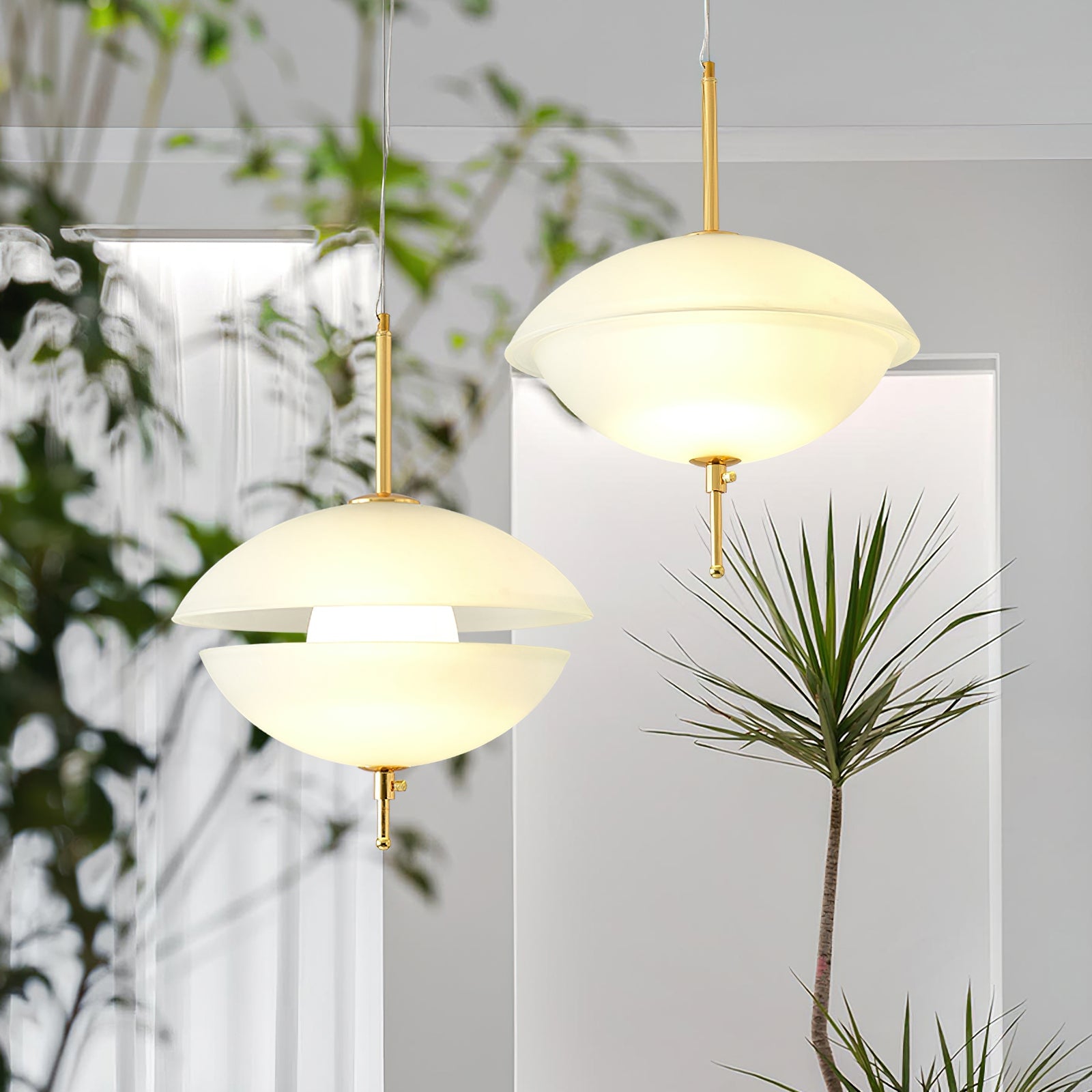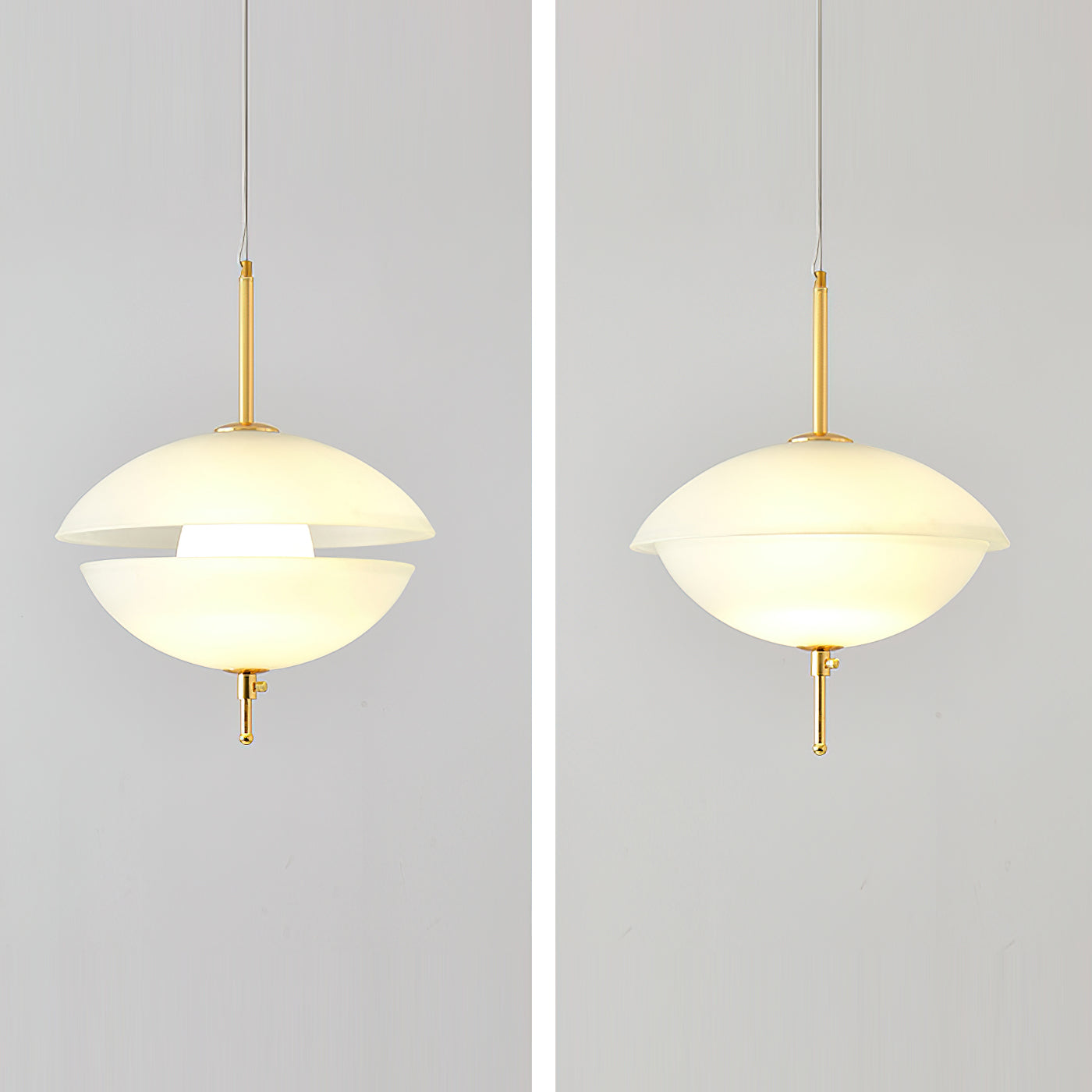 Crafted by Mooijane, this modern and timeless Miller Shell Pendant Light features a sparkling pearl embedded within its delicate shell design. Transform the mood of any room with a simple swipe. The balanced opaline glass and metal hardware make it a great addition to any dining or living area. Equally beautiful open or closed, that effortlessly slide open the shell-like shades to reveal the pearlescent light source within.