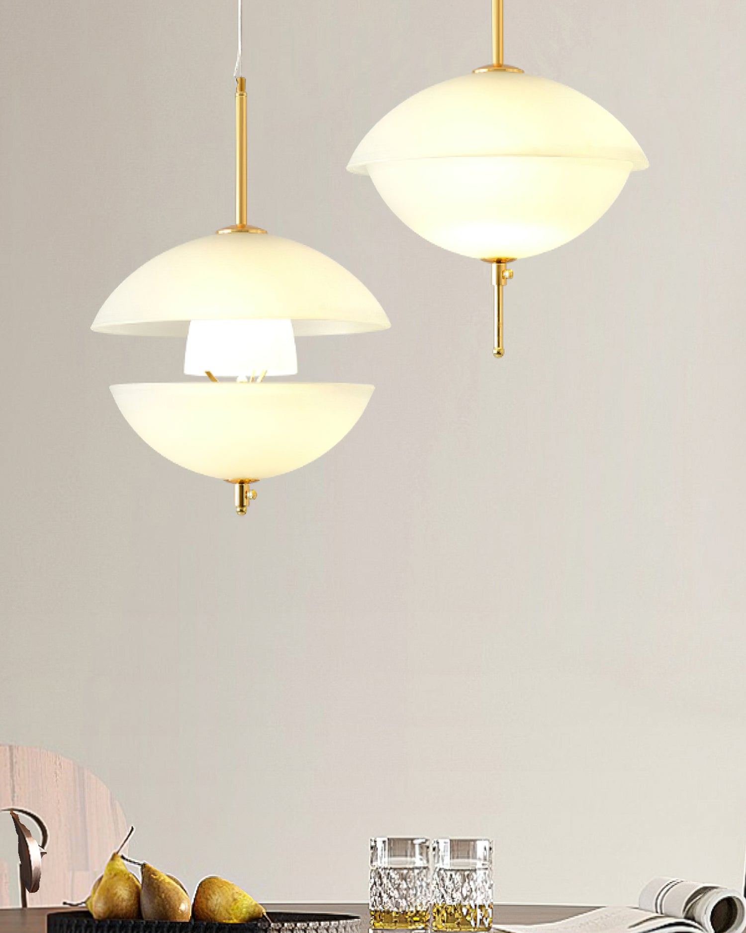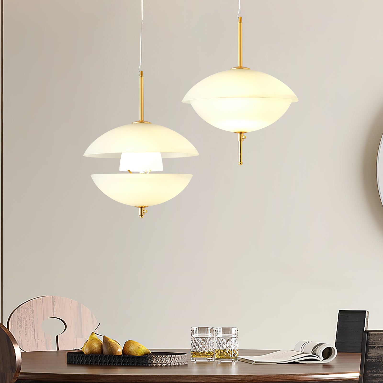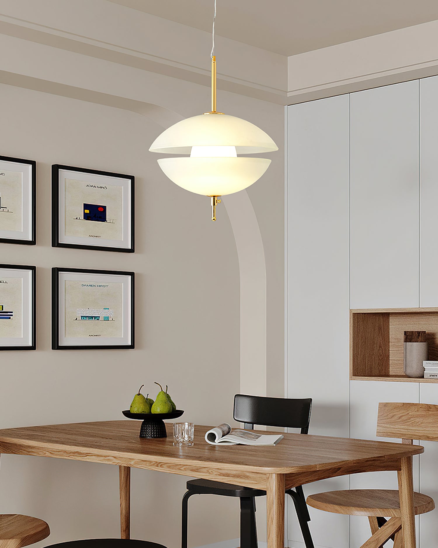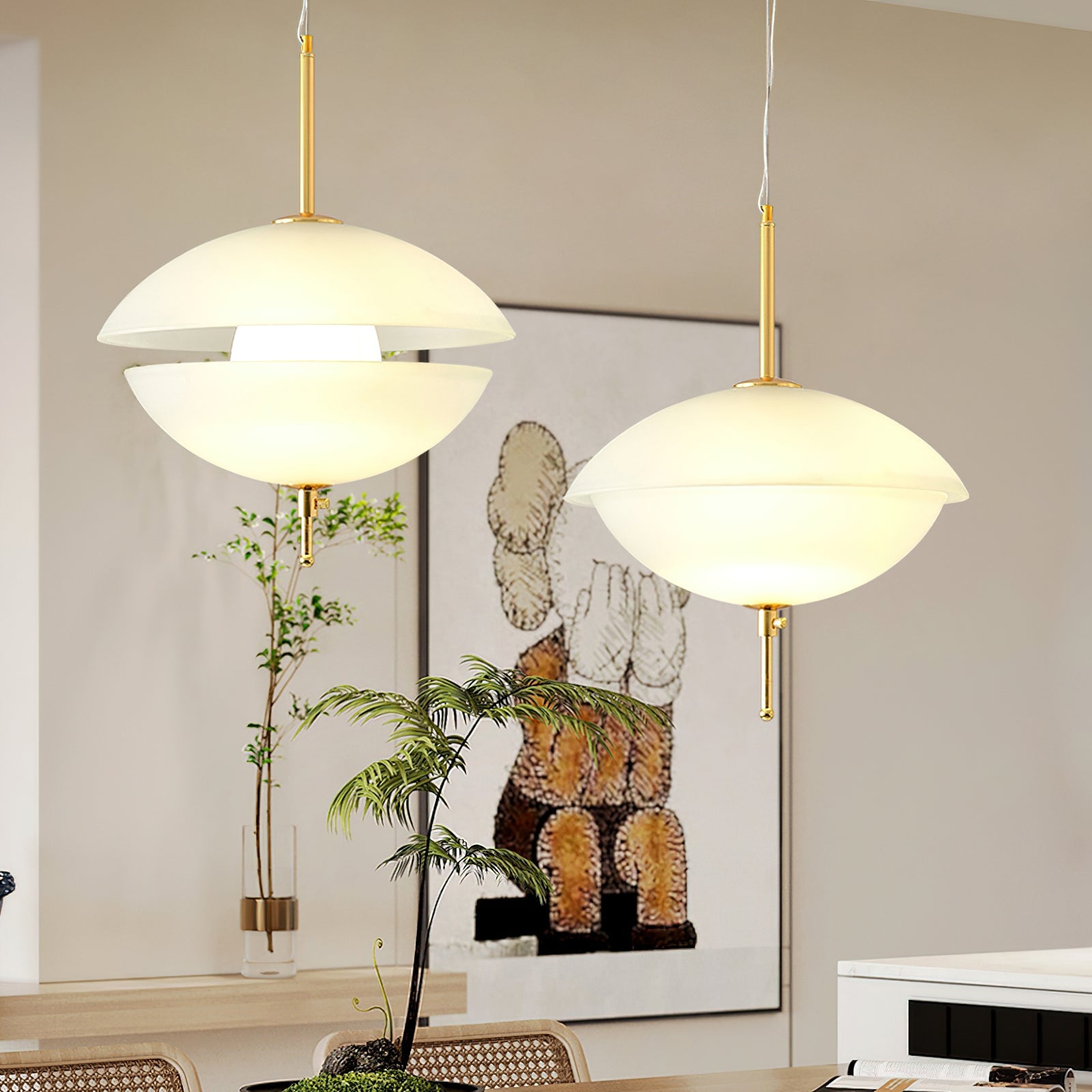 Crafted by Mooijane, this modern and timeless Miller Shell Pendant Light features a sparkling pearl embedded within its delicate shell design. Transform the mood of any room with a simple swipe. The balanced opaline glass and metal hardware make it a great addition to any dining or living area. Equally beautiful open or closed, that effortlessly slide open the shell-like shades to reveal the pearlescent light source within.