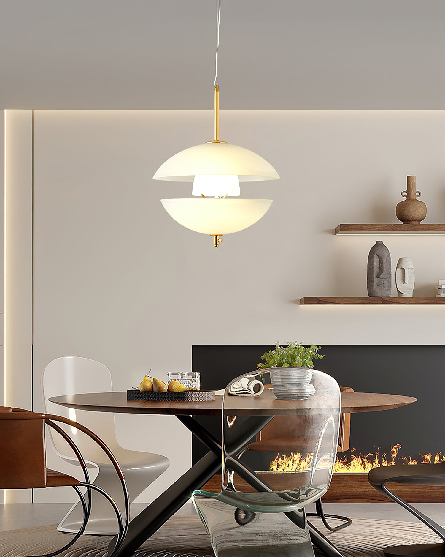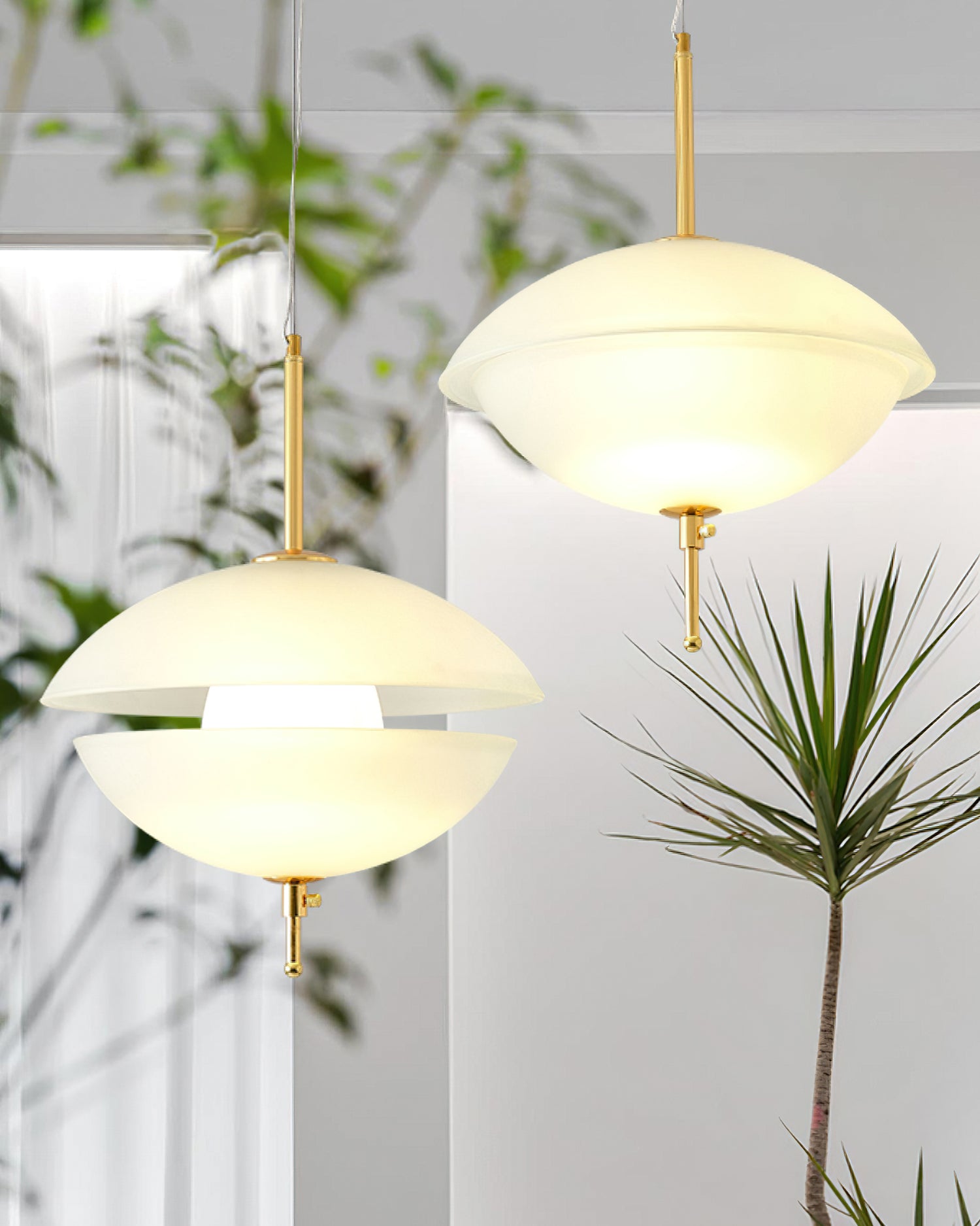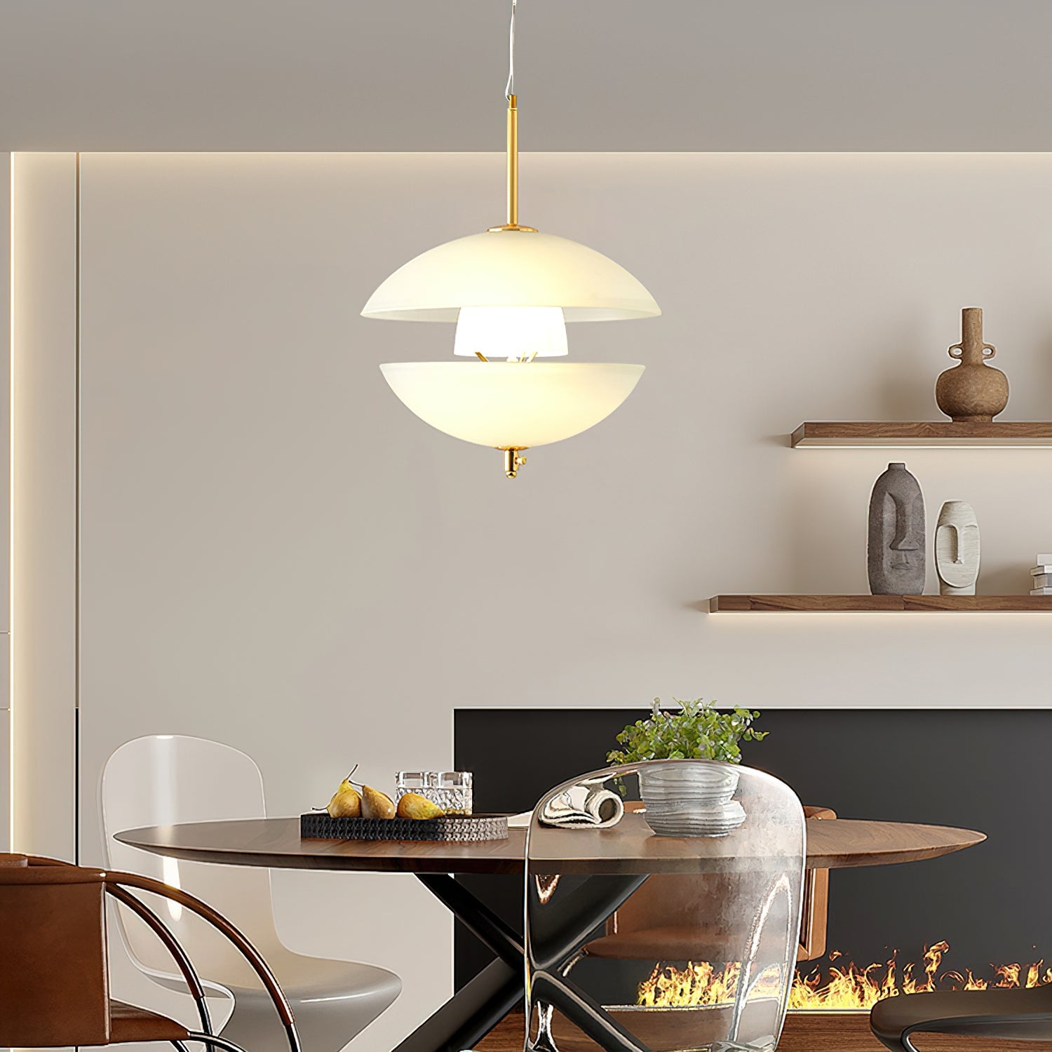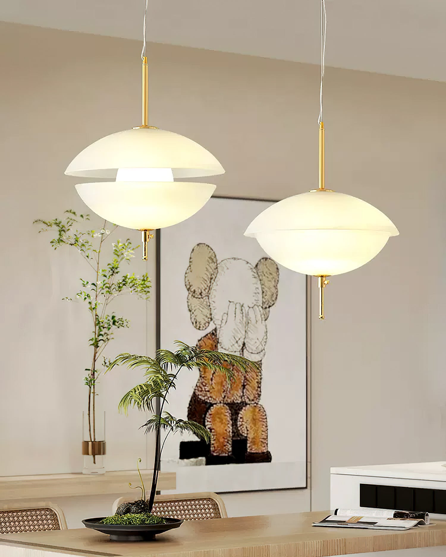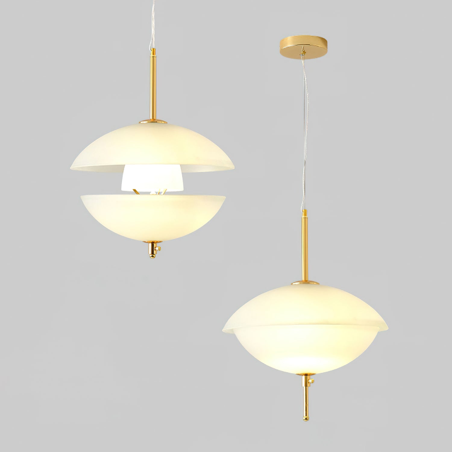 Crafted by Mooijane, this modern and timeless Miller Shell Pendant Light features a sparkling pearl embedded within its delicate shell design. Transform the mood of any room with a simple swipe. The balanced opaline glass and metal hardware make it a great addition to any dining or living area. Equally beautiful open or closed, that effortlessly slide open the shell-like shades to reveal the pearlescent light source within.