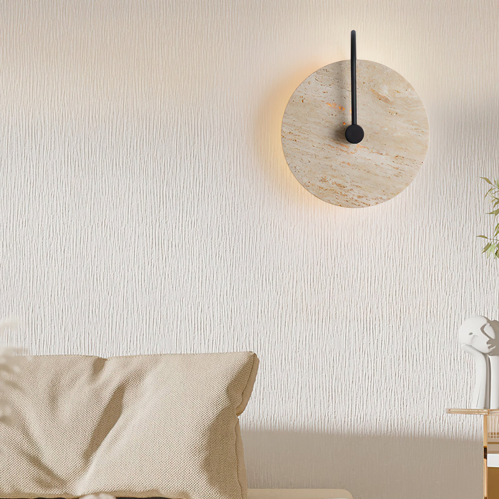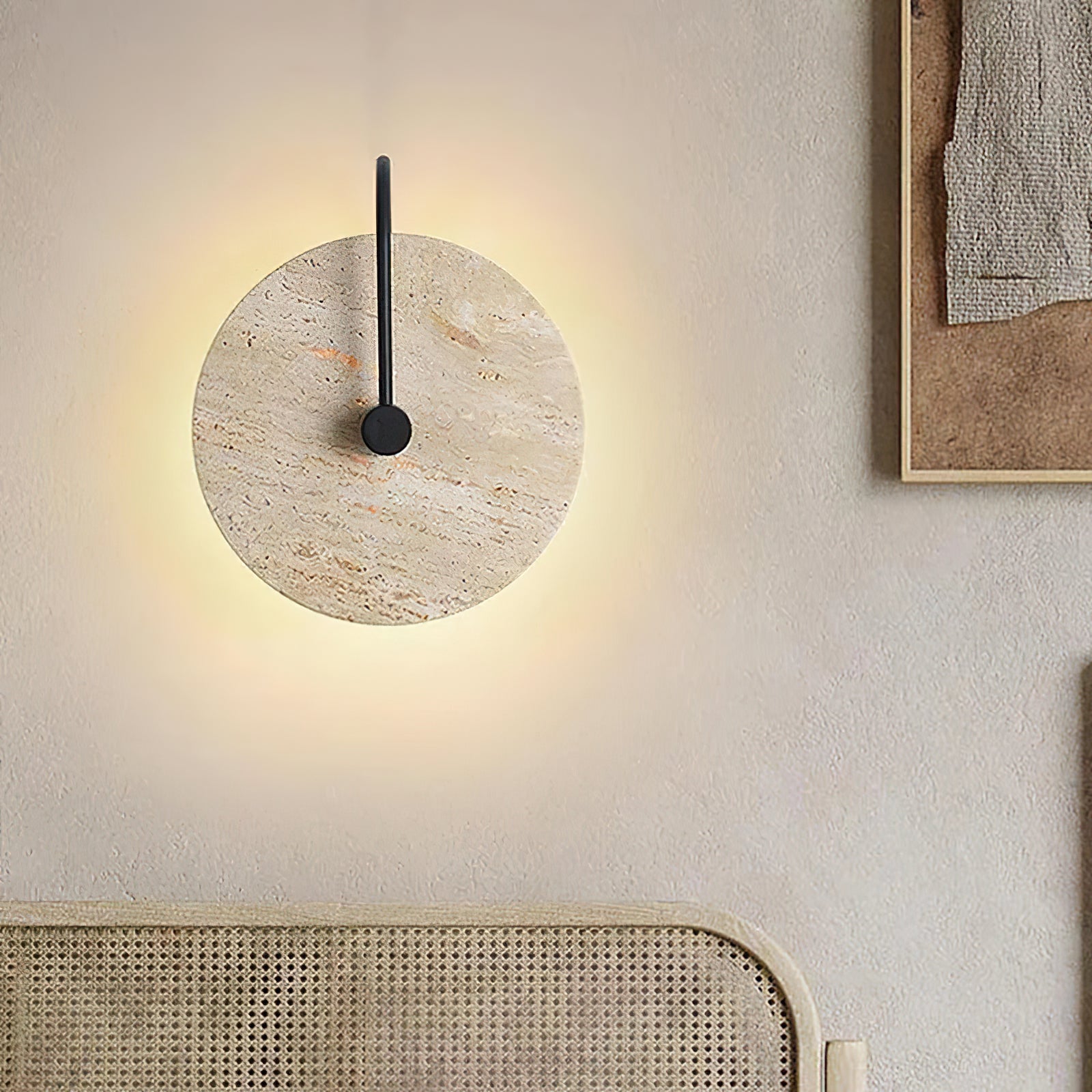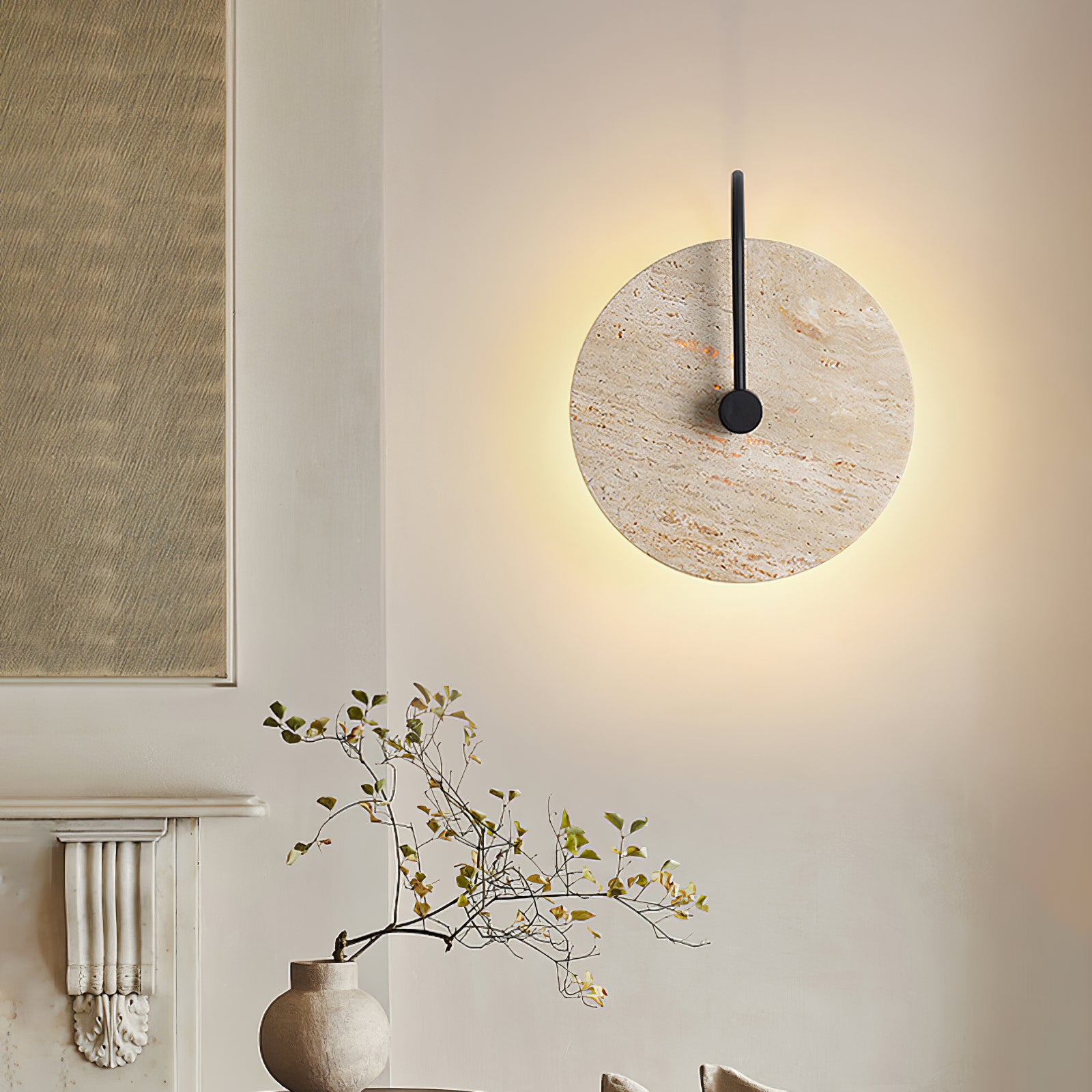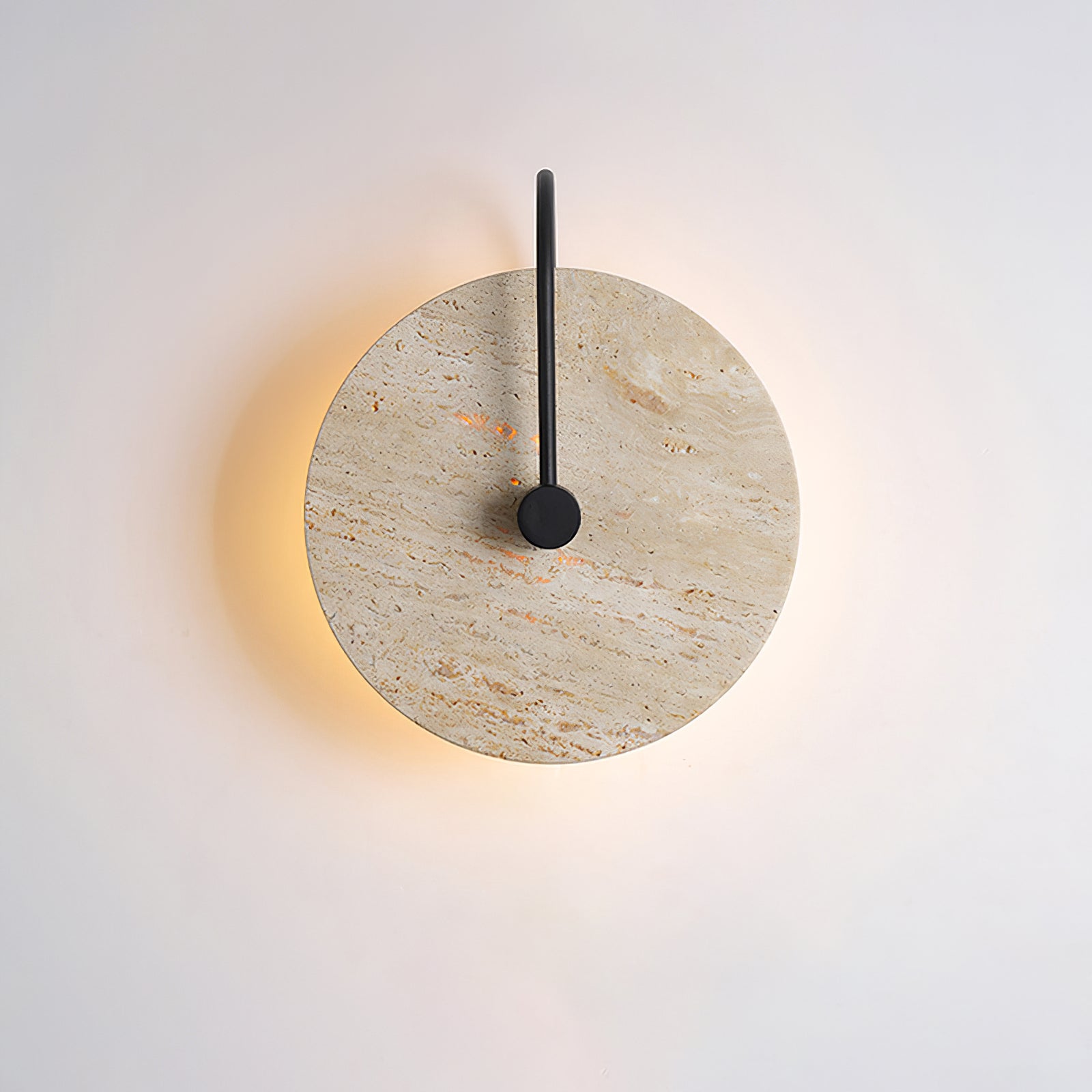 This Minimalist Circular Travertine Wall Sconce showcases a sophisticated, earthy design with a large, circular travertine stone as its centerpiece. The natural stone texture highlights subtle variations in color, giving the sconce a warm, organic appeal. A simple black metal rod extends from the backplate to the center, adding a modern touch and creating a striking contrast against the stone. Soft ambient light emits from behind the stone disc, creating a gentle halo effect that enhances the texture and natural beauty of the travertine. This sconce is perfect for adding understated elegance to contemporary and minimalist interiors.