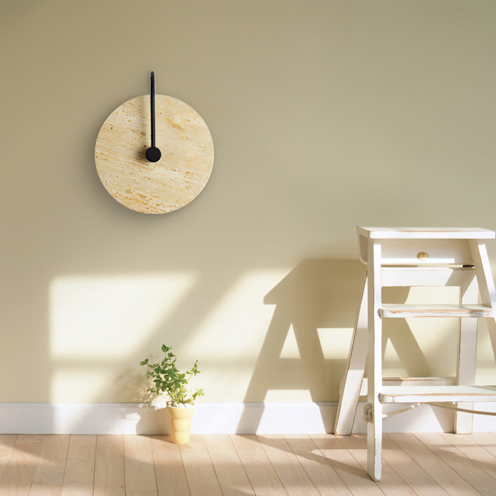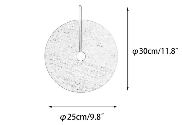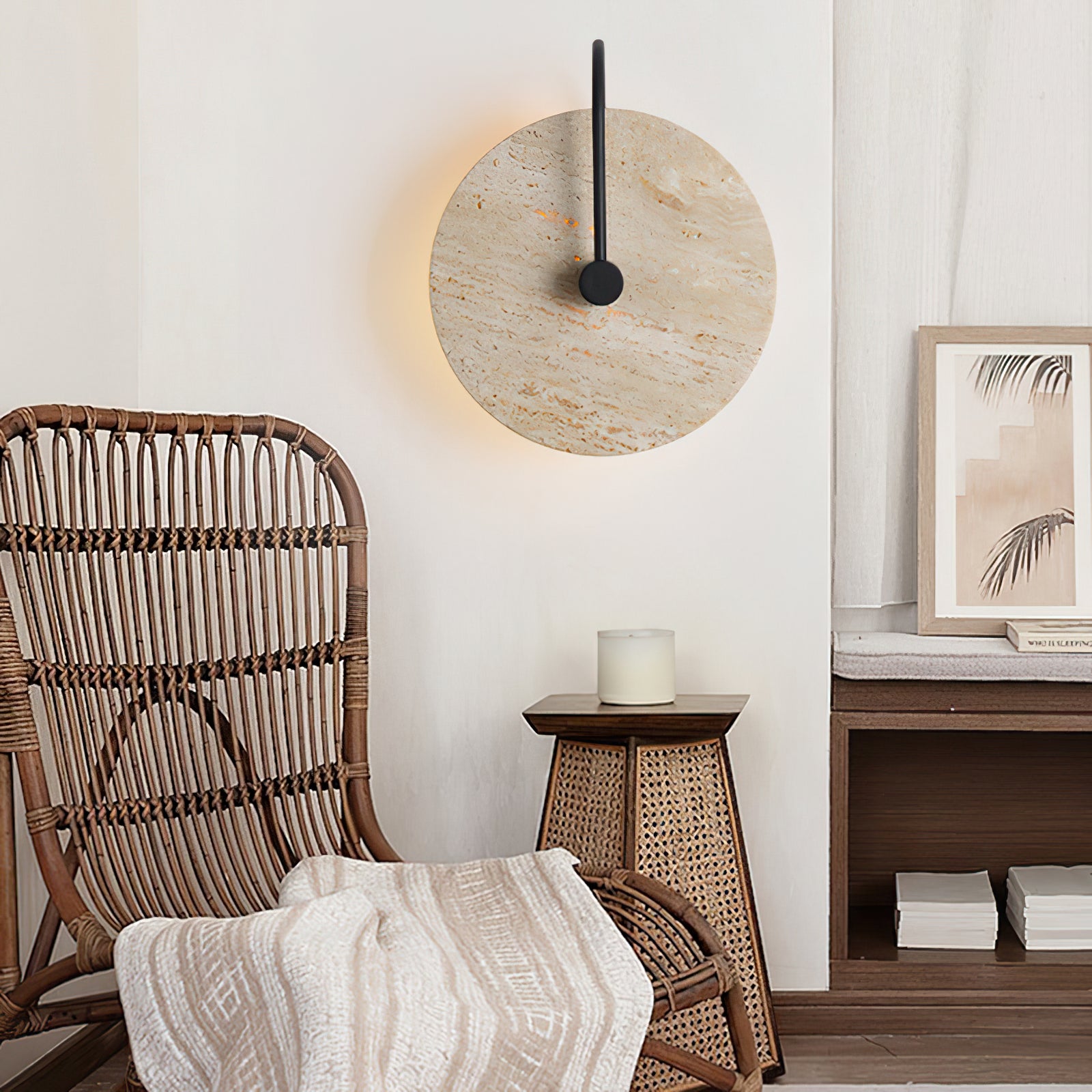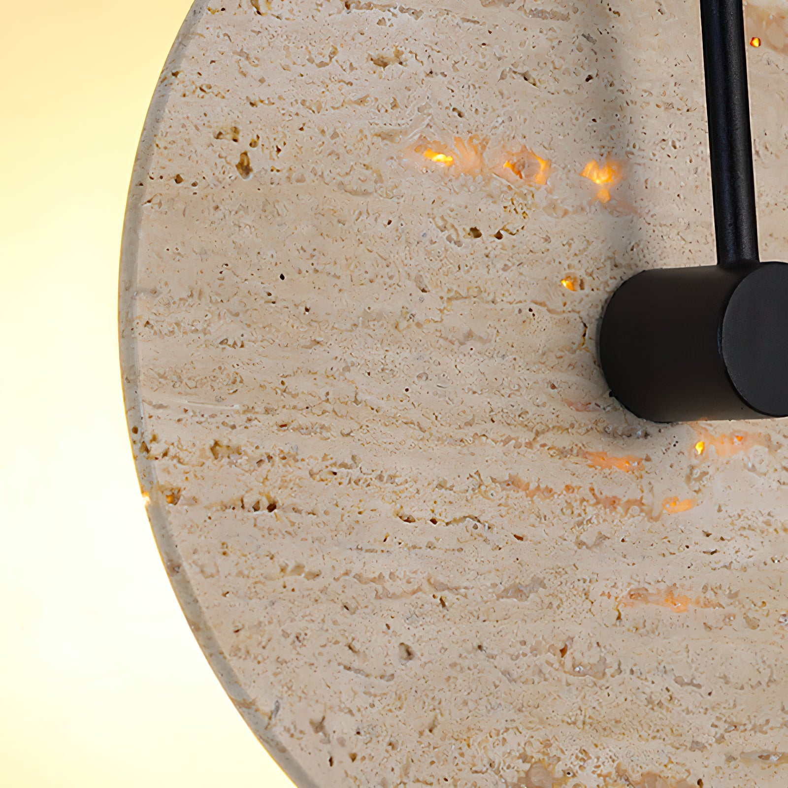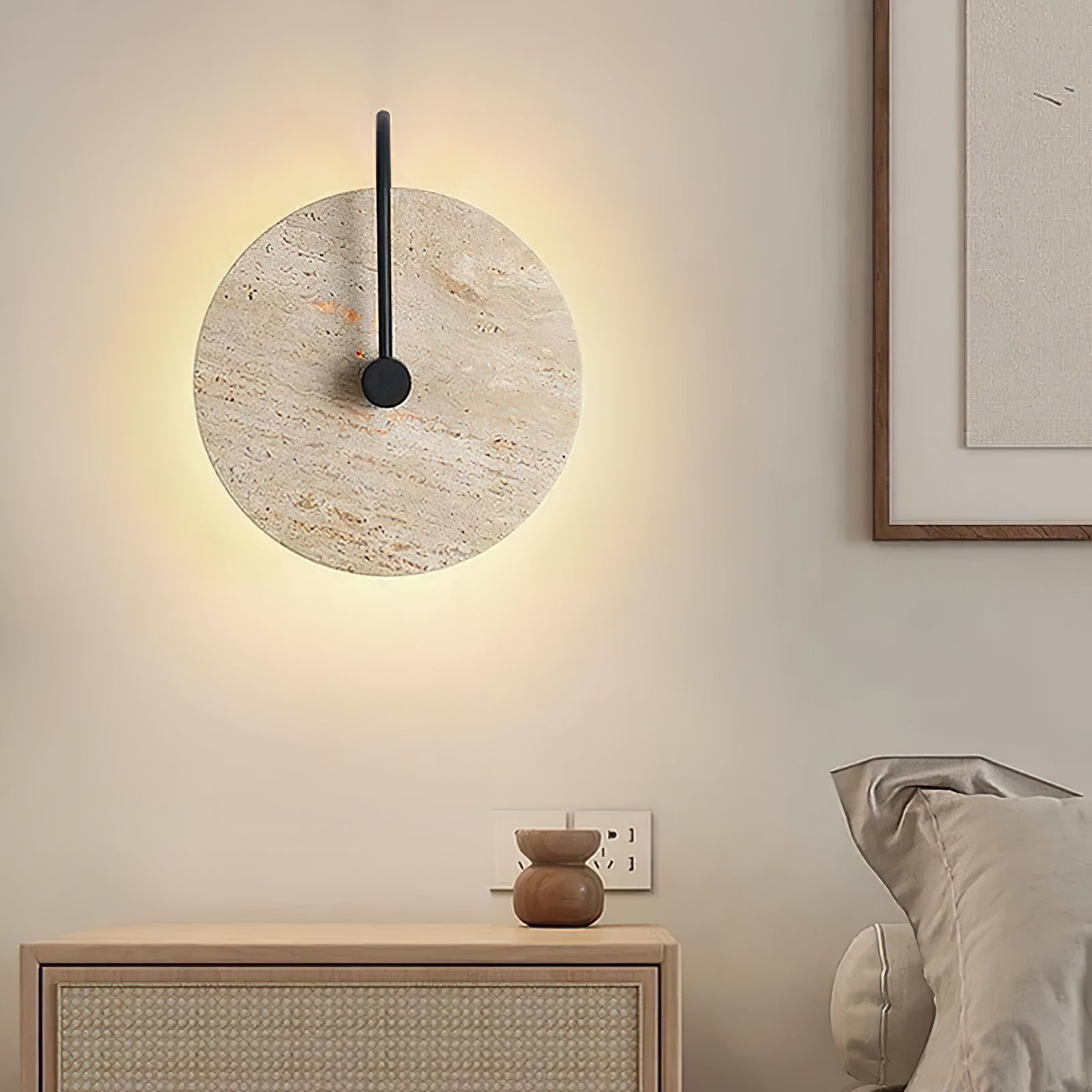 This Minimalist Circular Travertine Wall Sconce showcases a sophisticated, earthy design with a large, circular travertine stone as its centerpiece. The natural stone texture highlights subtle variations in color, giving the sconce a warm, organic appeal. A simple black metal rod extends from the backplate to the center, adding a modern touch and creating a striking contrast against the stone. Soft ambient light emits from behind the stone disc, creating a gentle halo effect that enhances the texture and natural beauty of the travertine. This sconce is perfect for adding understated elegance to contemporary and minimalist interiors.