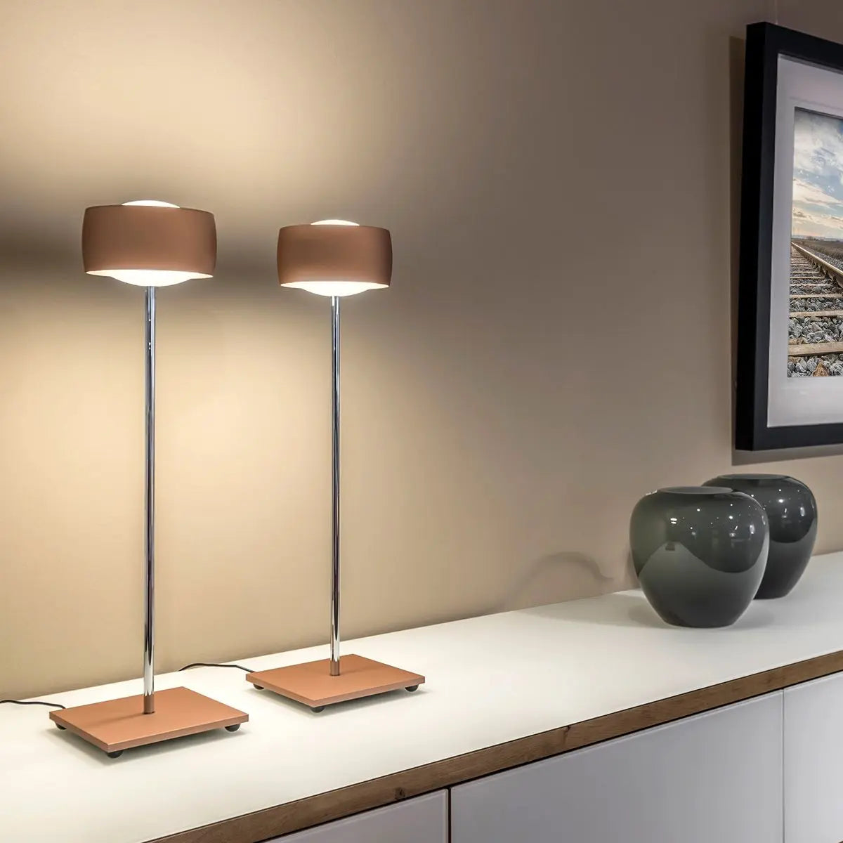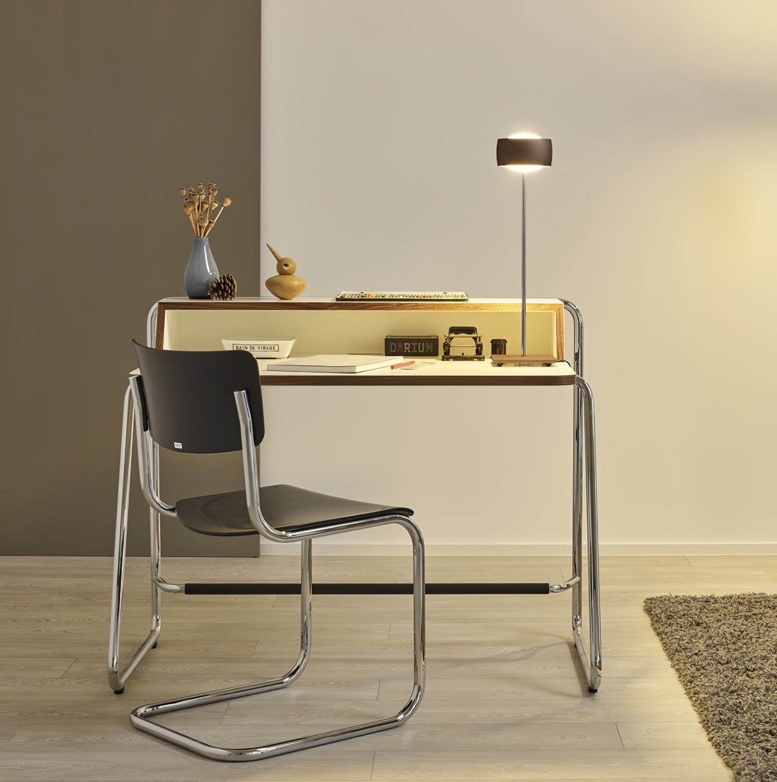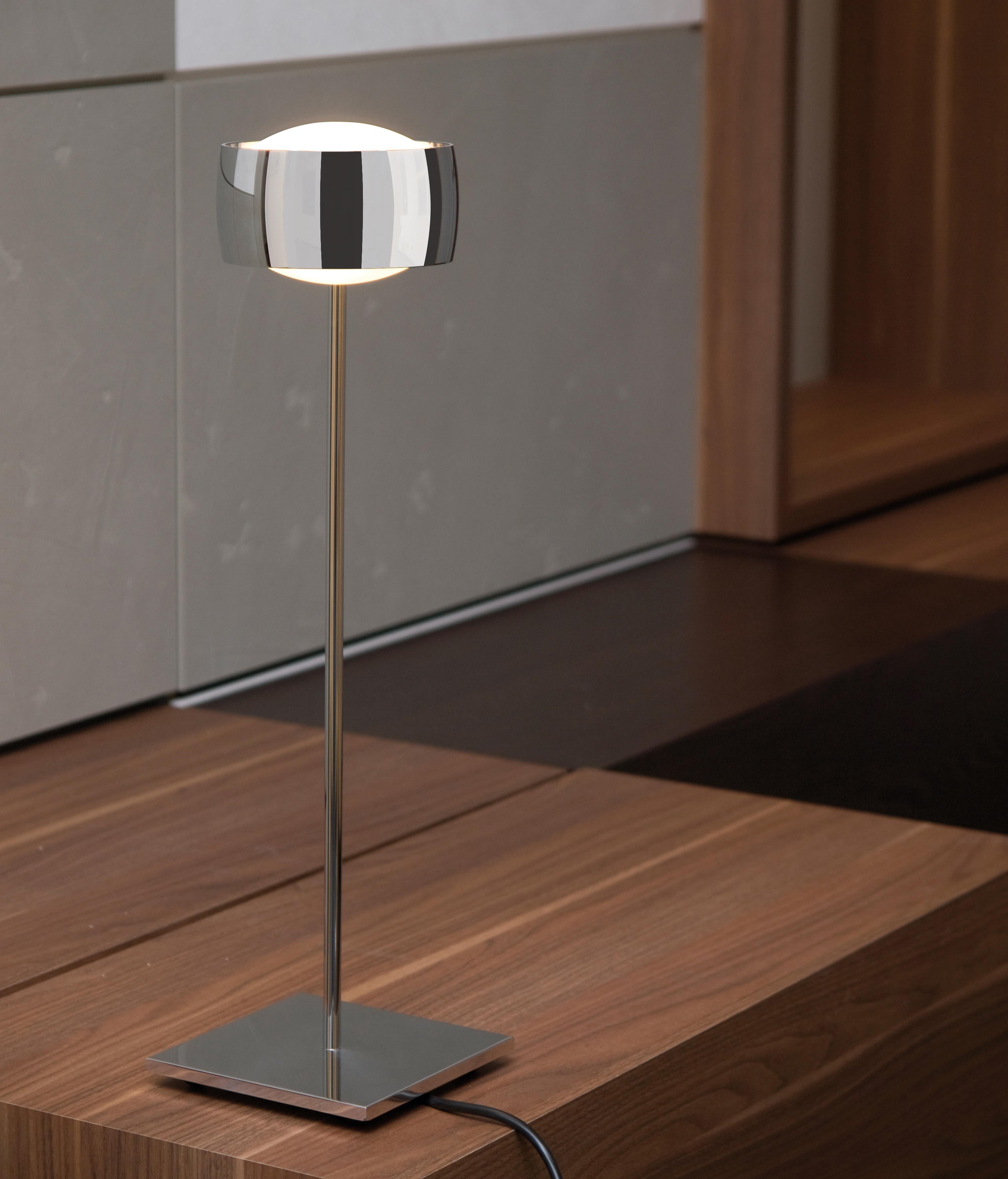 The Minimalist Tall Stand Desk Lamp embodies modern simplicity and sleek elegance, making it a refined addition to any workspace or room. Its slender chrome stand and square base create a clean, architectural look, while the compact, metallic shade at the top disperses light evenly, providing focused illumination that’s ideal for reading, working, or accenting decor. With its high-polish finish, the lamp adds a touch of sophistication, effortlessly blending with contemporary or industrial interiors.