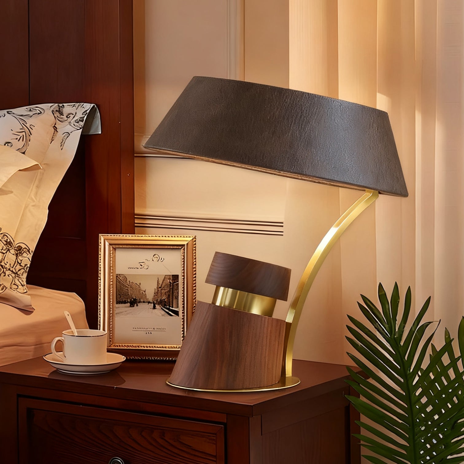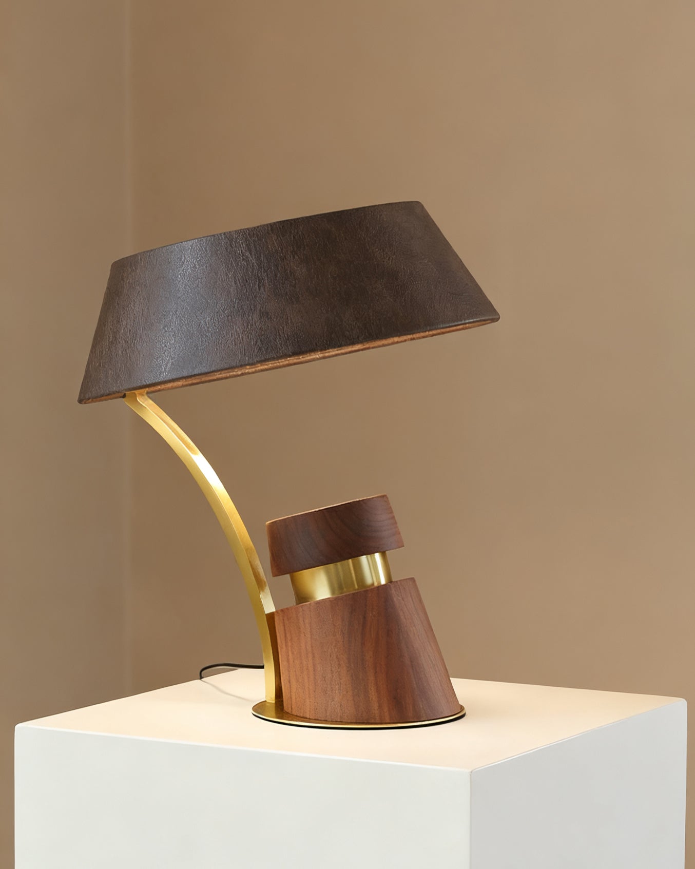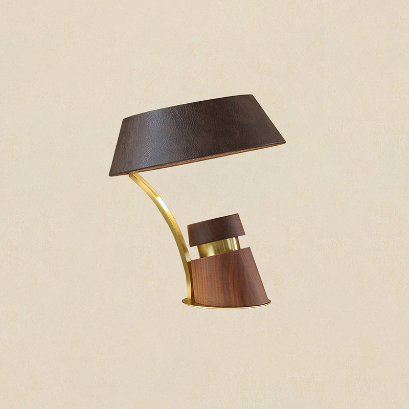 The Mirak Table Lamp from Mooijane showcases a bold asymmetrical design that reflects modern artistry with timeless appeal. Its solid wood base features striking textured lines, paired with a sleek metal support for stability and refinement. A dark leather lampshade with a natural, subtle texture adds understated elegance, balancing warmth and sophistication.