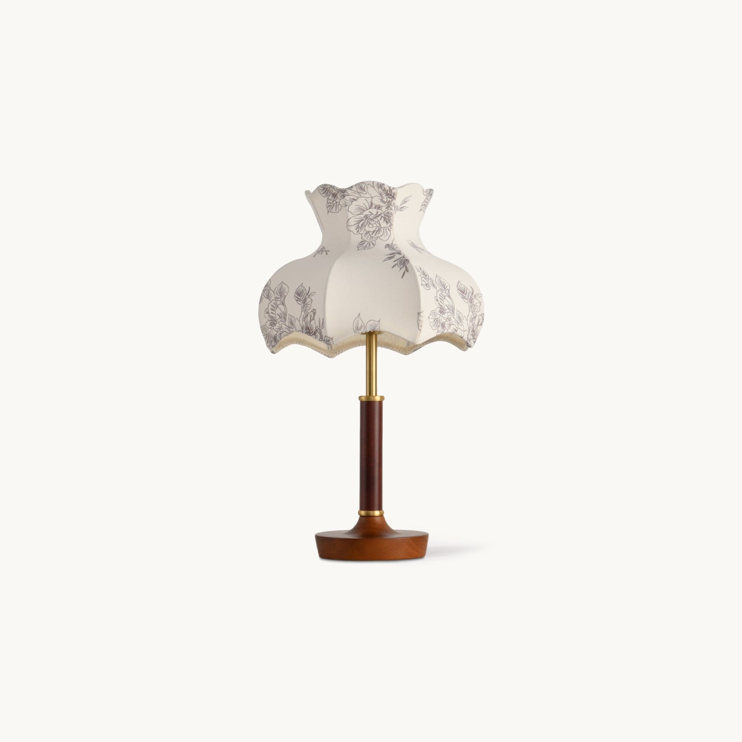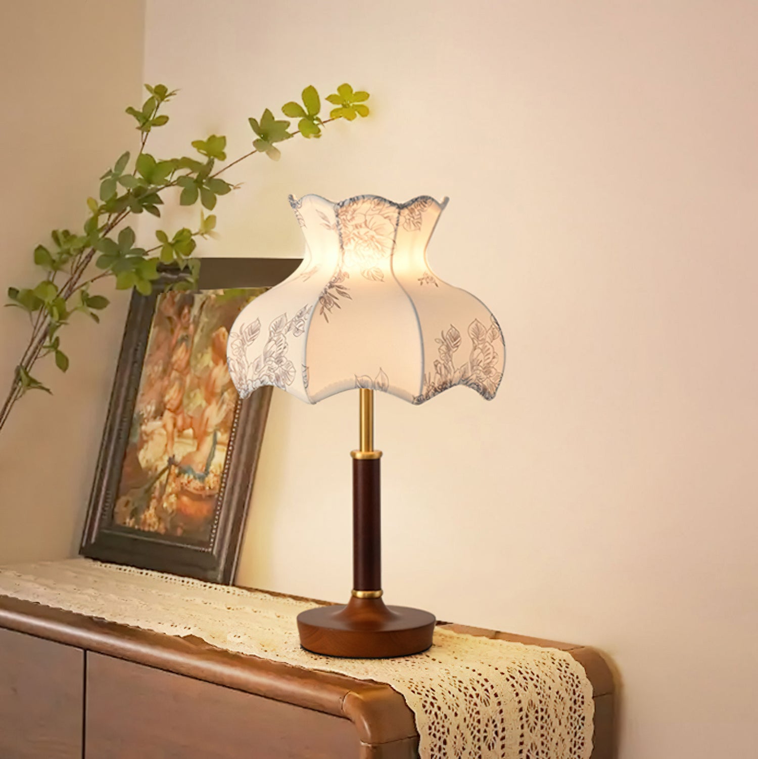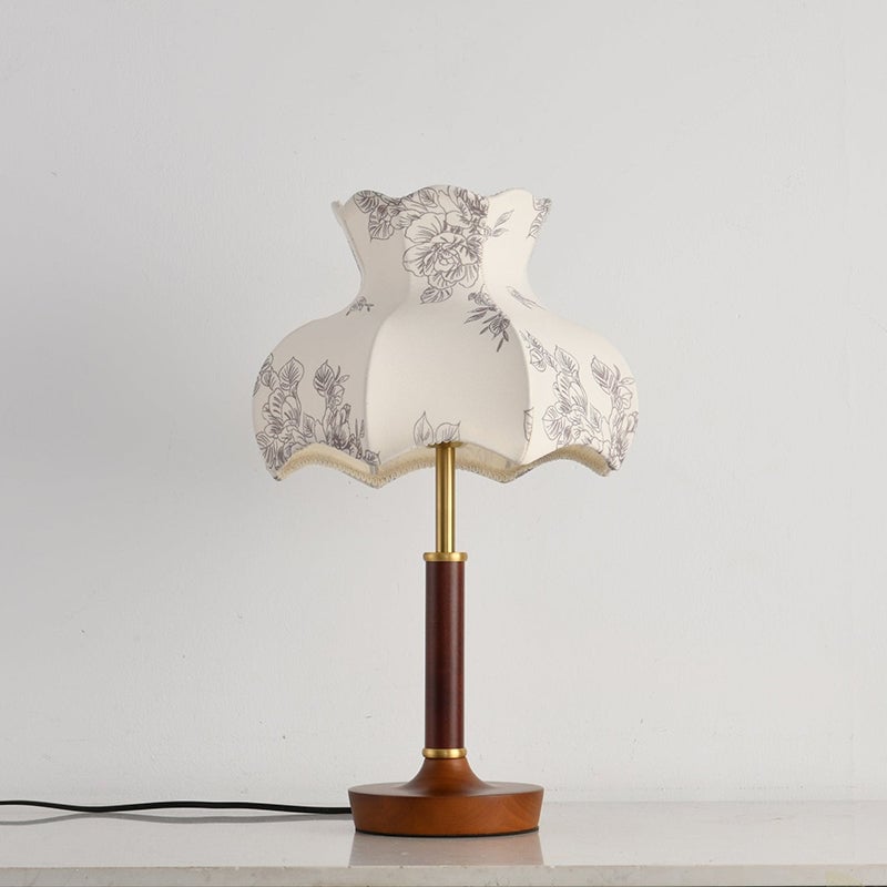 The Mirella Table Lamp from Mooijane is a graceful blend of vintage charm and timeless elegance. Featuring a scalloped fabric shade with delicate floral patterns, it casts a warm, ambient glow ideal for cozy evenings. The rich wood base and metal accents add a refined touch, making it perfect for bedside tables, reading nooks, or living spaces. Both decorative and functional, Mirella brings softness, warmth, and character to any room.