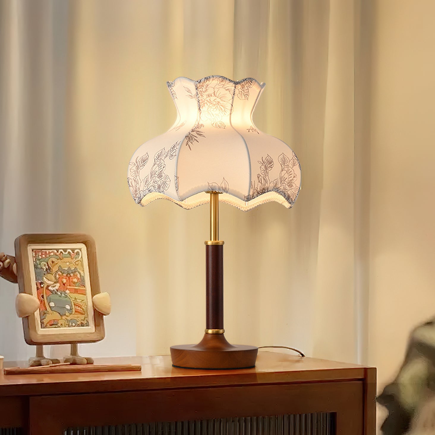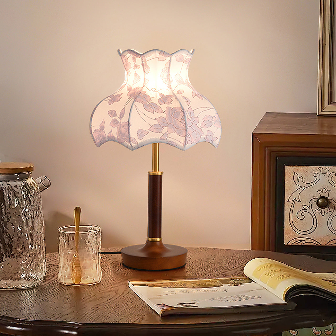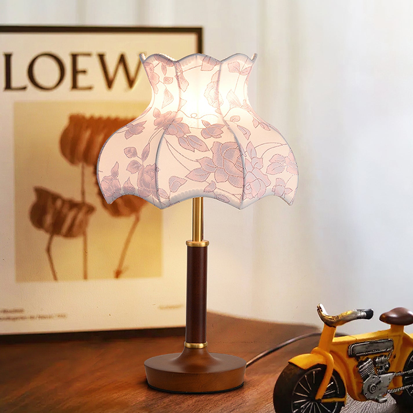 The Mirella Table Lamp from Mooijane is a graceful blend of vintage charm and timeless elegance. Featuring a scalloped fabric shade with delicate floral patterns, it casts a warm, ambient glow ideal for cozy evenings. The rich wood base and metal accents add a refined touch, making it perfect for bedside tables, reading nooks, or living spaces. Both decorative and functional, Mirella brings softness, warmth, and character to any room.