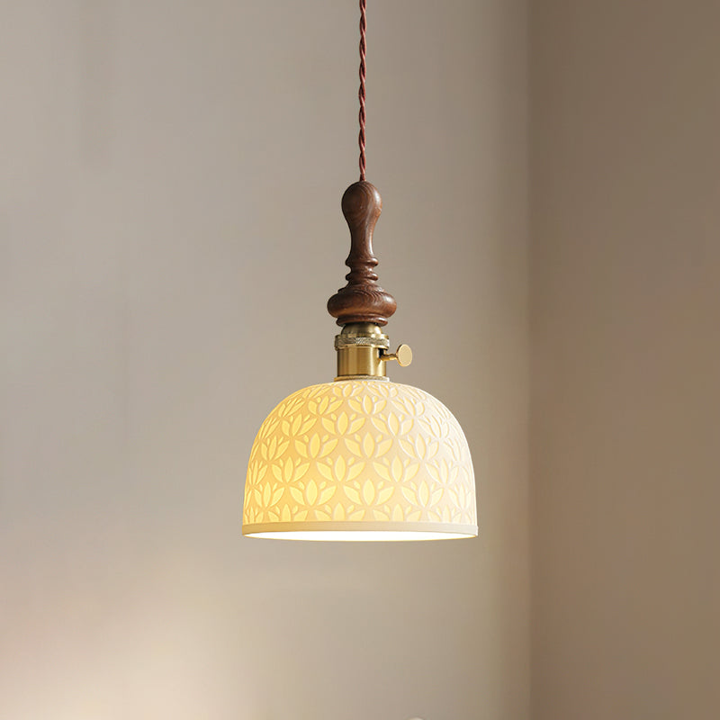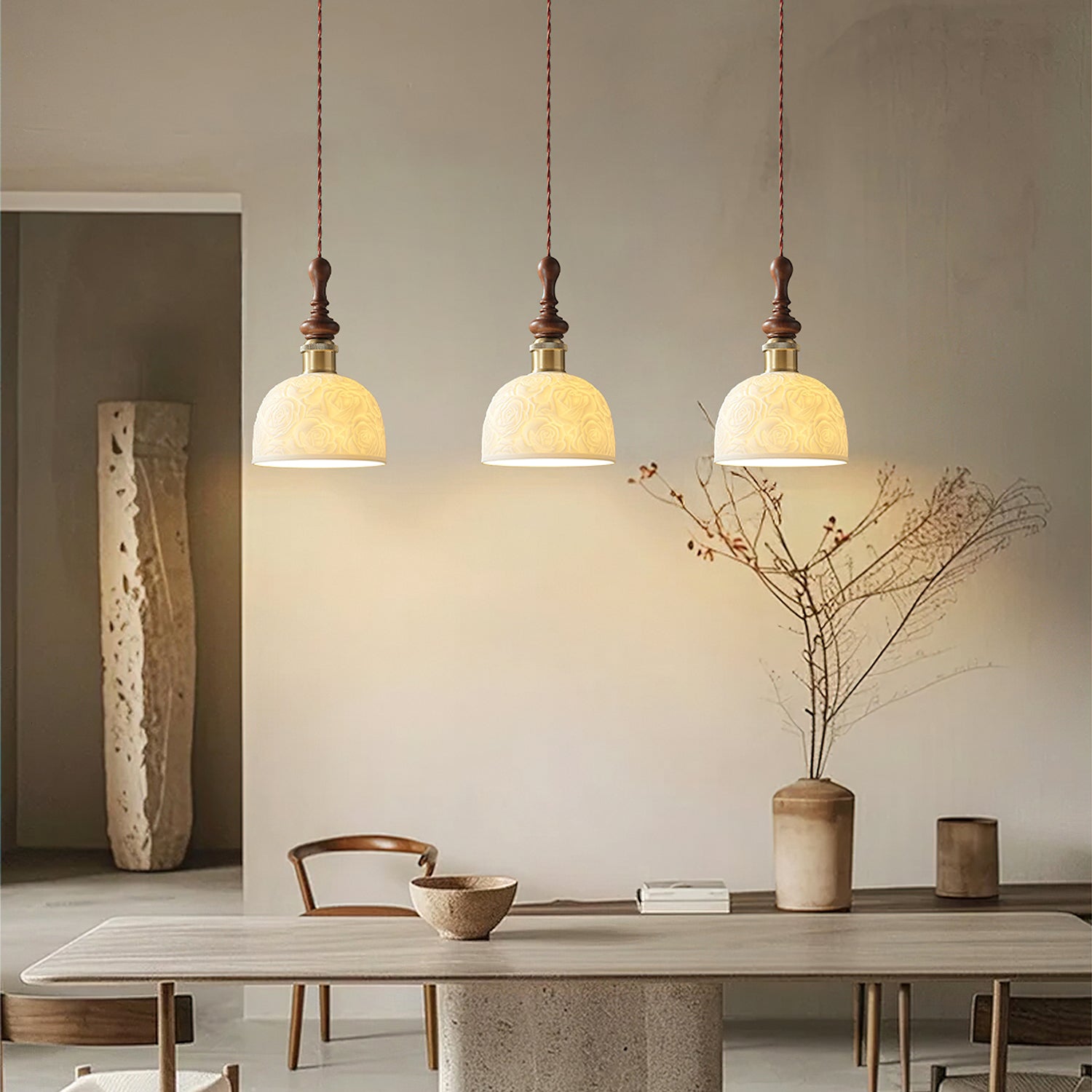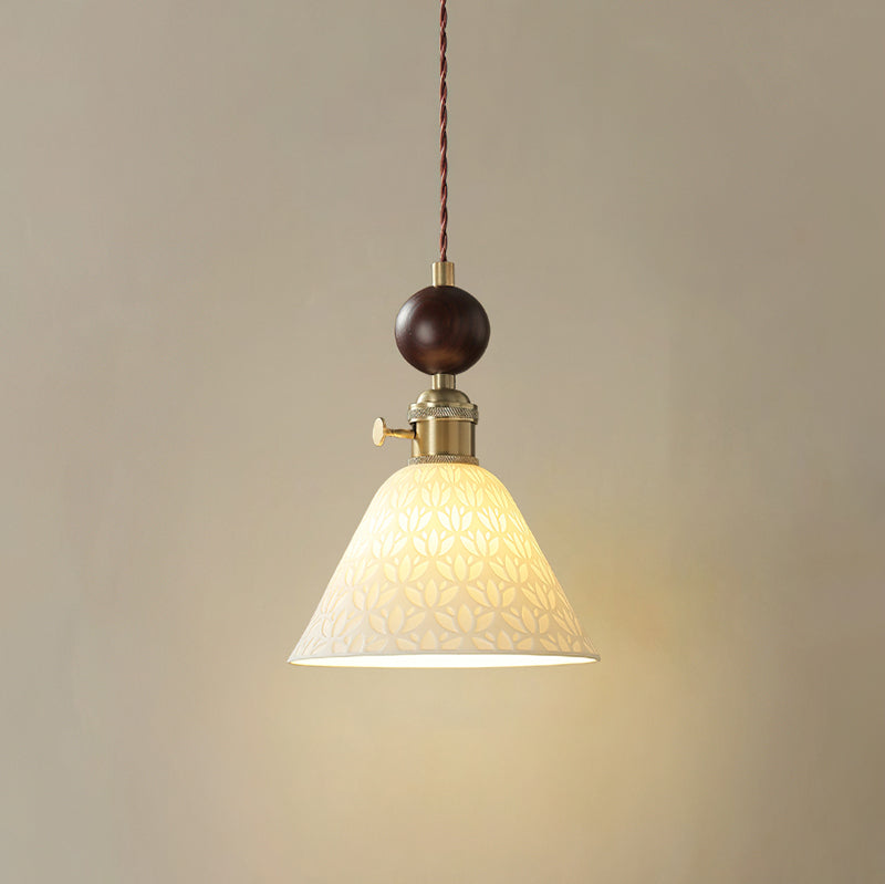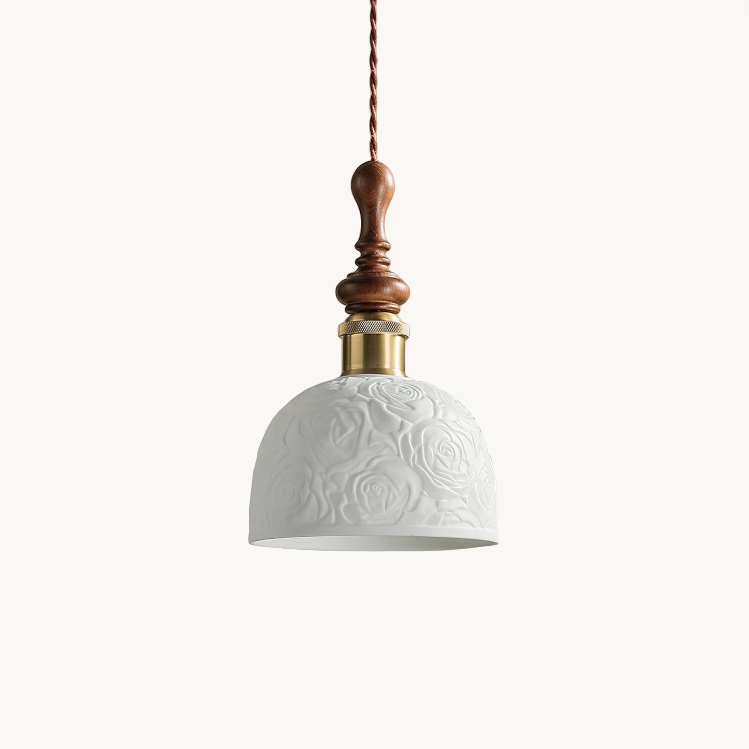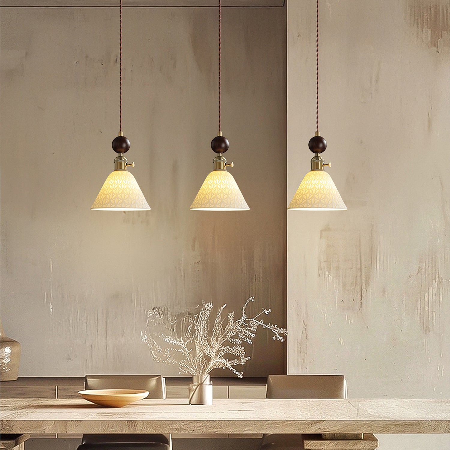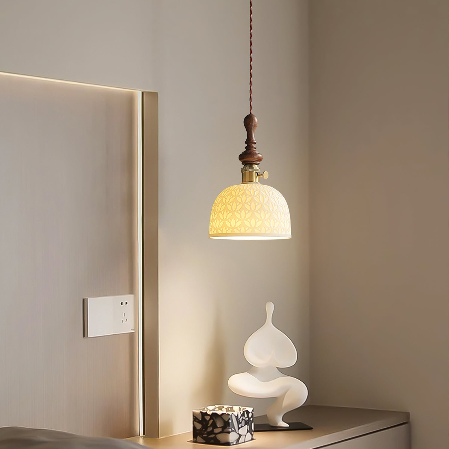 The Mishya Pendant Lamp by Mooijane blends artistic craftsmanship with natural warmth. Its ceramic shade features an intricate three-dimensional pattern that, when illuminated, casts a soft play of light and shadow reminiscent of a blooming flower. The combination of warm wood and a metal cap creates a refined balance of texture and form. Whether lit or unlit, this pendant lamp brings quiet elegance and poetic charm to dining areas, bedrooms, or entryways.