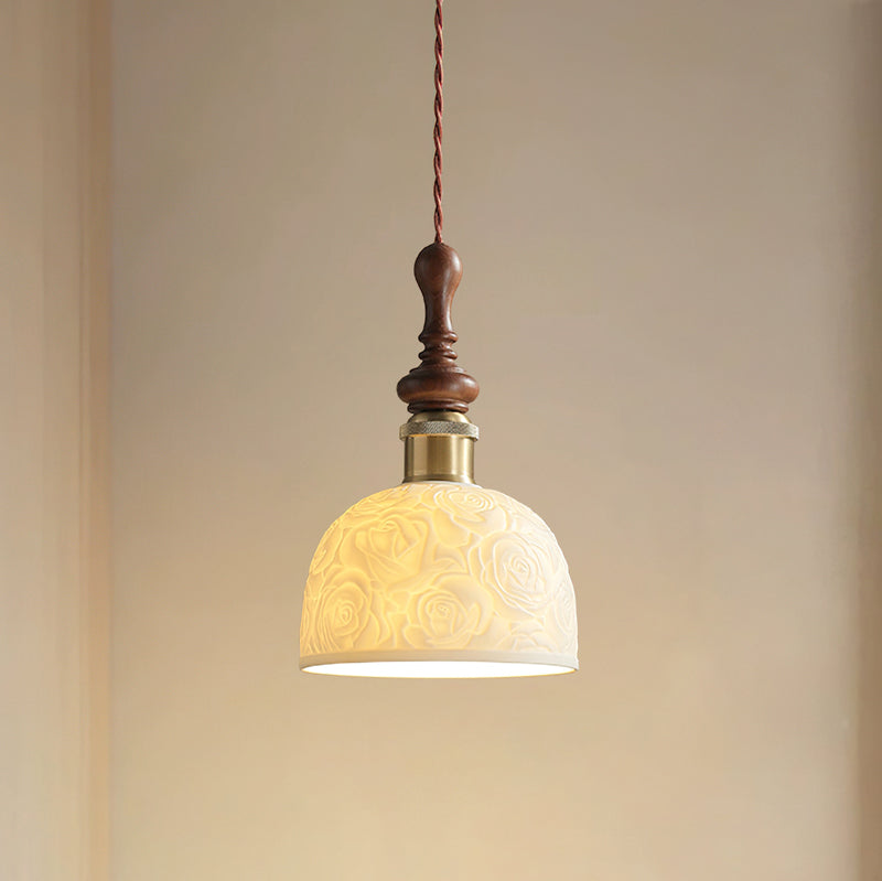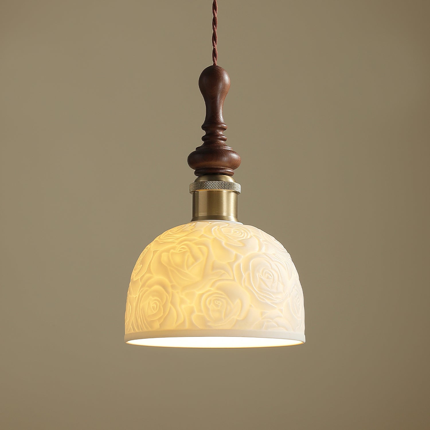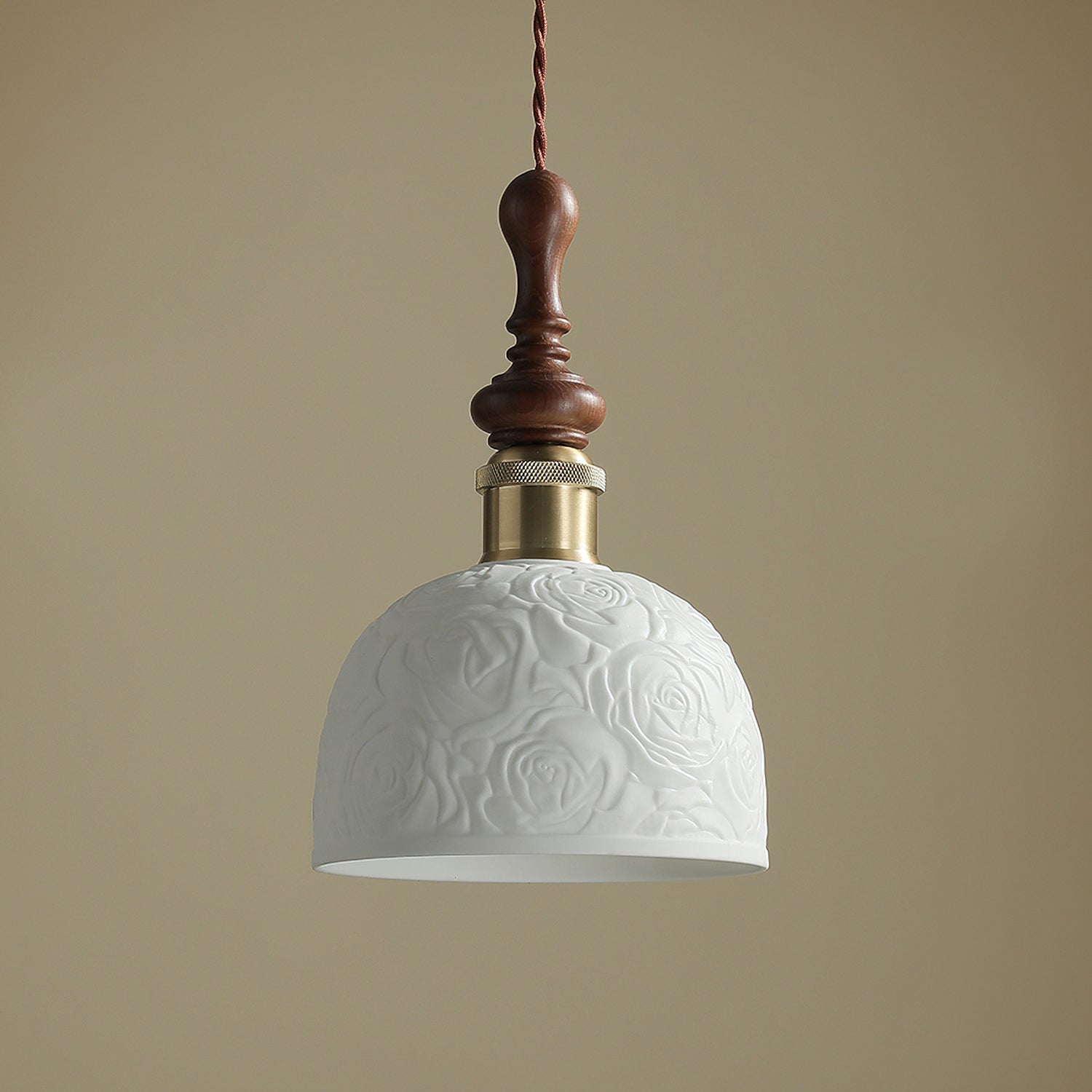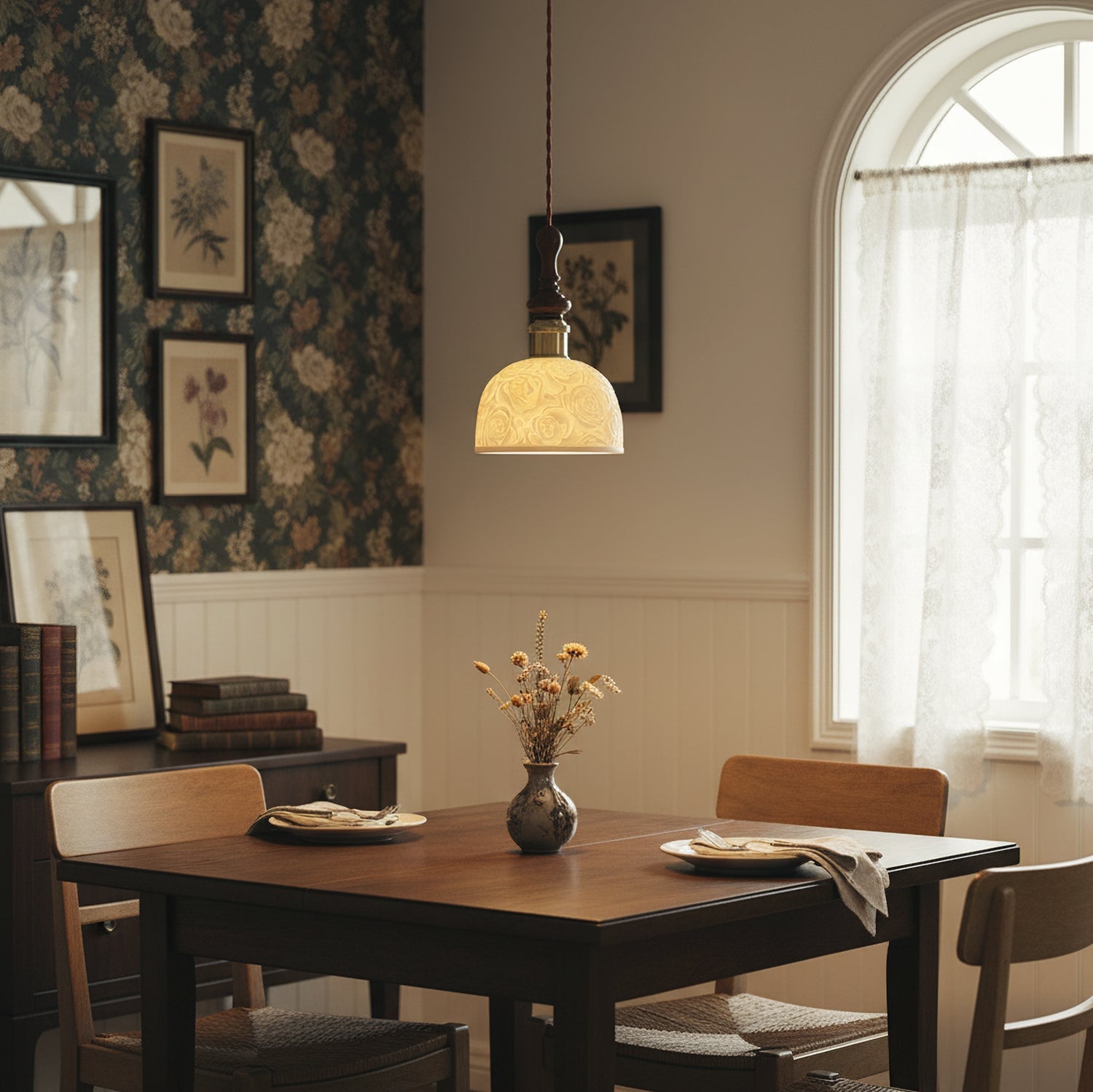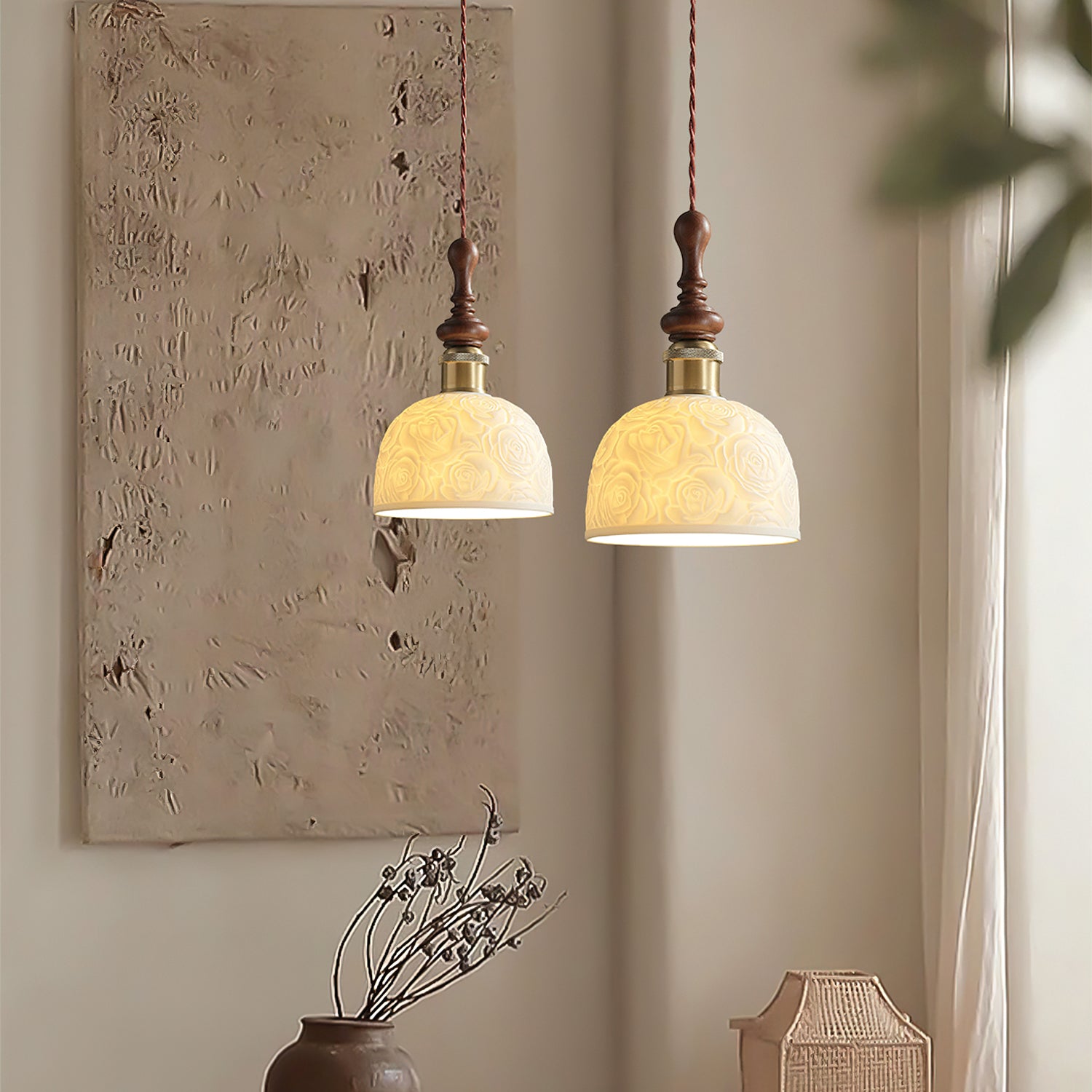 The Mishya Pendant Lamp by Mooijane blends artistic craftsmanship with natural warmth. Its ceramic shade features an intricate three-dimensional pattern that, when illuminated, casts a soft play of light and shadow reminiscent of a blooming flower. The combination of warm wood and a metal cap creates a refined balance of texture and form. Whether lit or unlit, this pendant lamp brings quiet elegance and poetic charm to dining areas, bedrooms, or entryways.