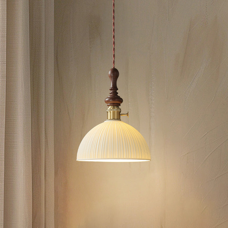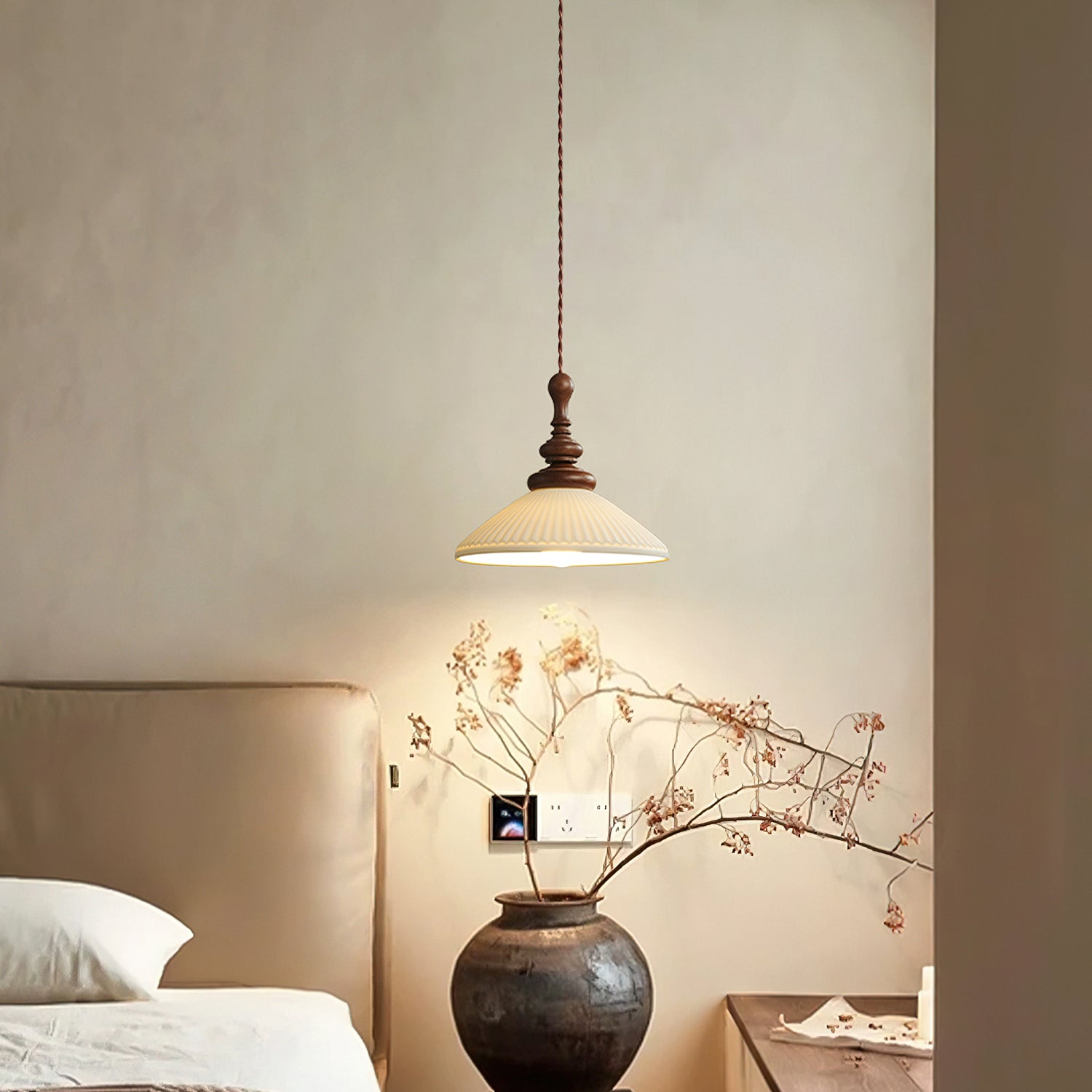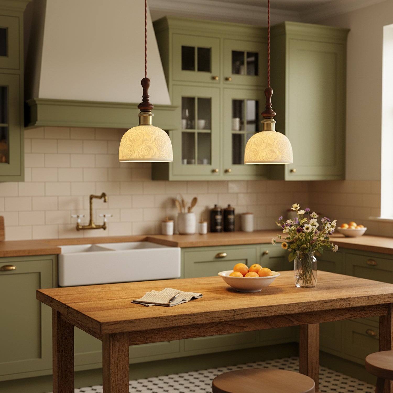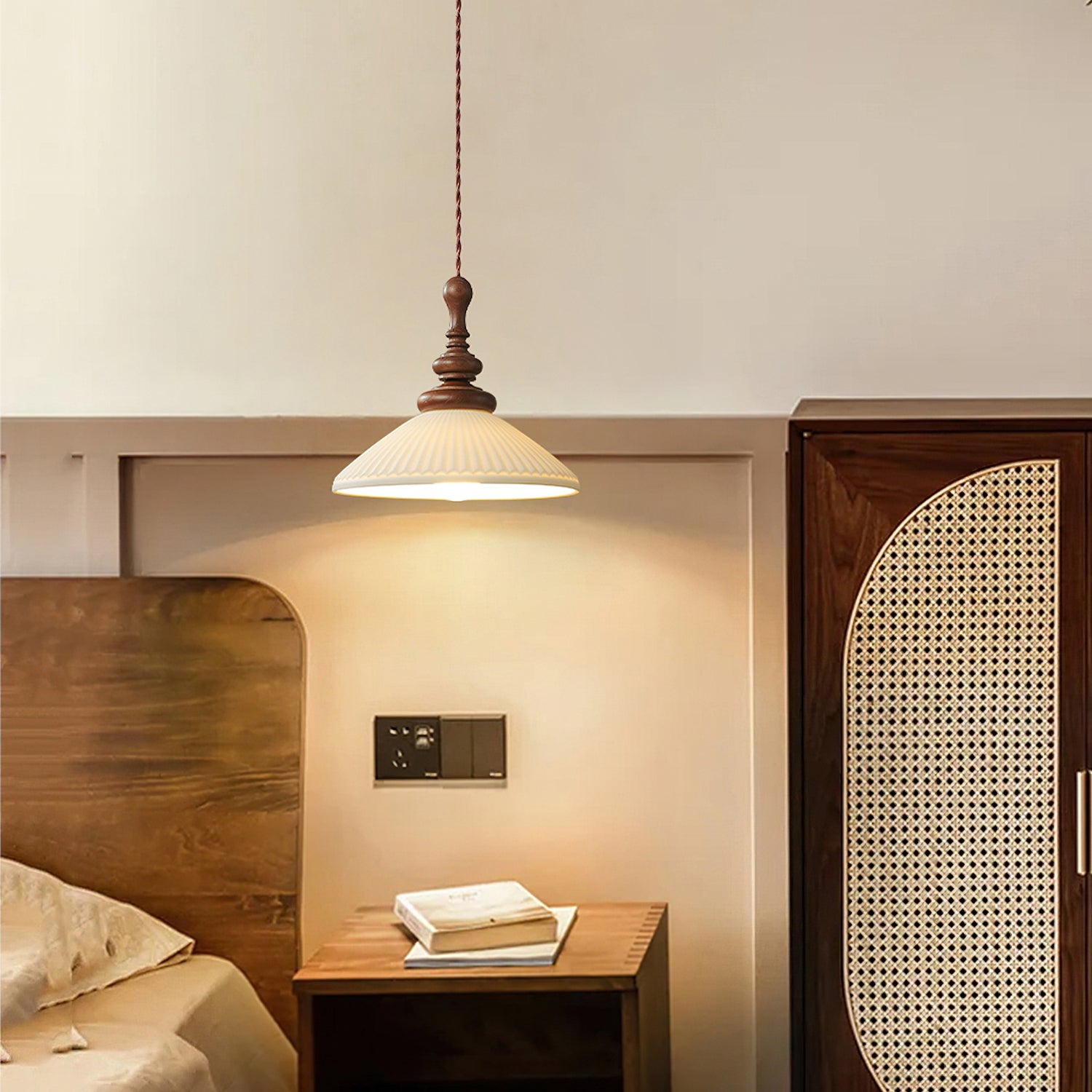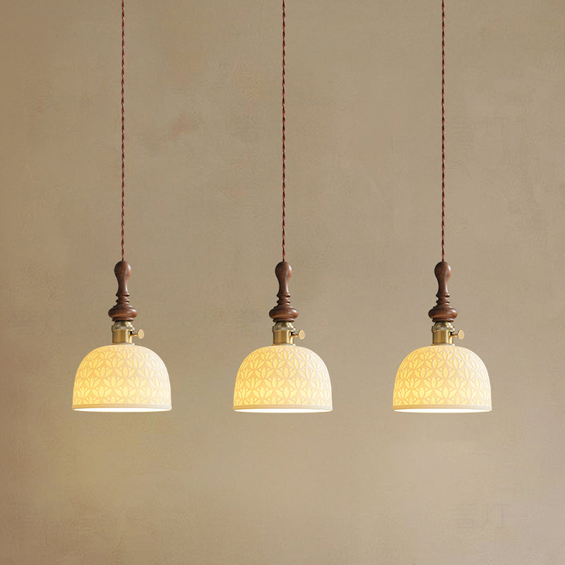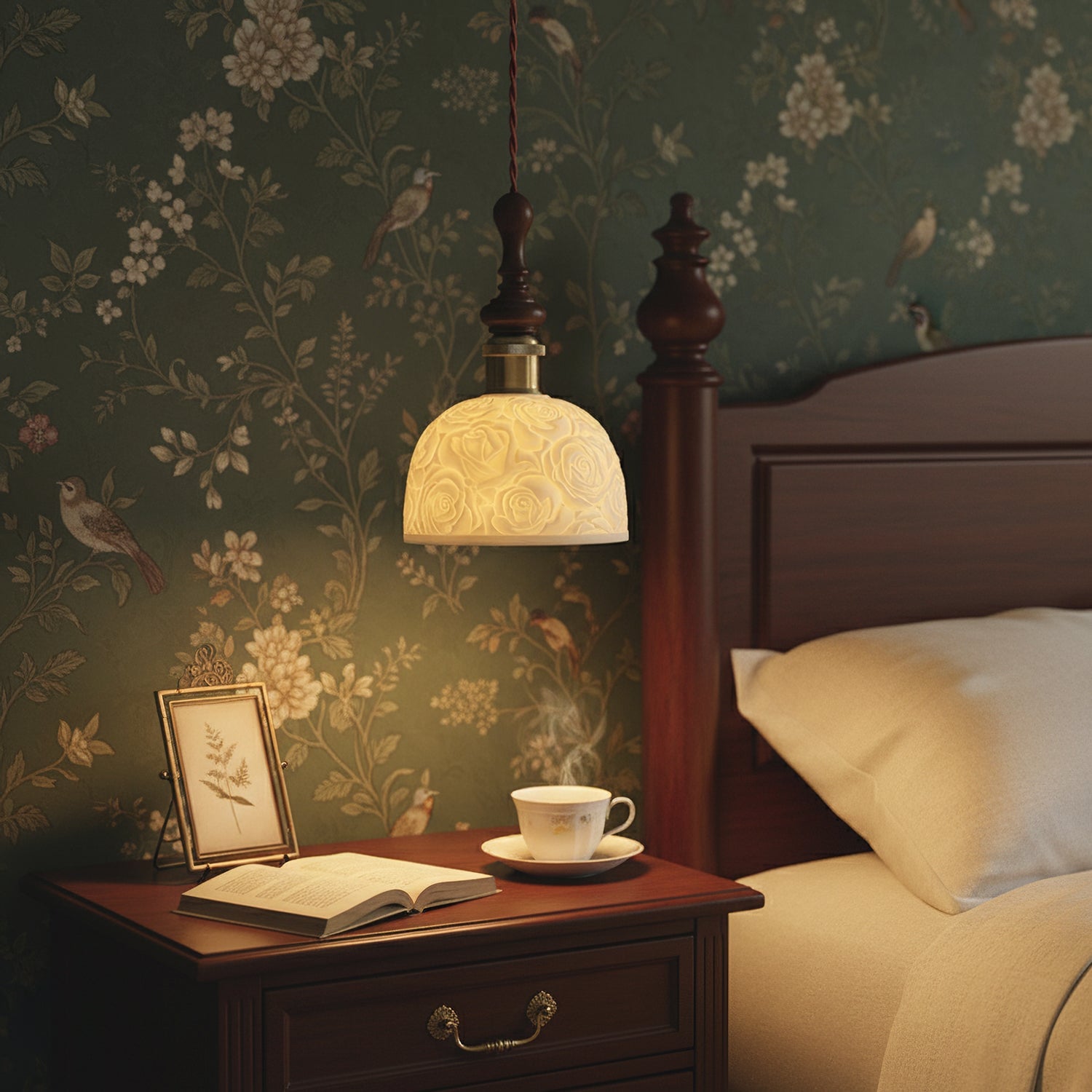 The Mishya Pendant Lamp by Mooijane blends artistic craftsmanship with natural warmth. Its ceramic shade features an intricate three-dimensional pattern that, when illuminated, casts a soft play of light and shadow reminiscent of a blooming flower. The combination of warm wood and a metal cap creates a refined balance of texture and form. Whether lit or unlit, this pendant lamp brings quiet elegance and poetic charm to dining areas, bedrooms, or entryways.