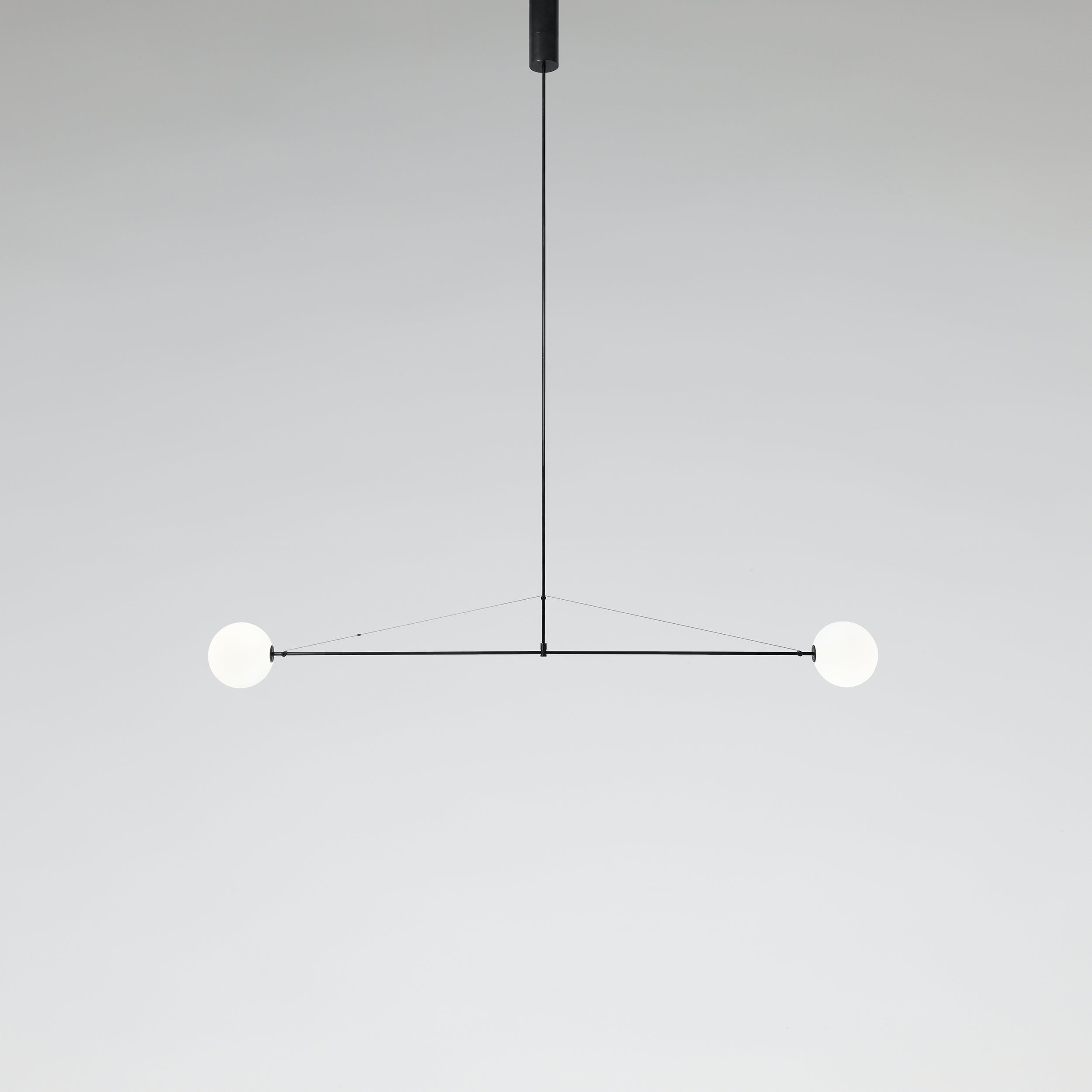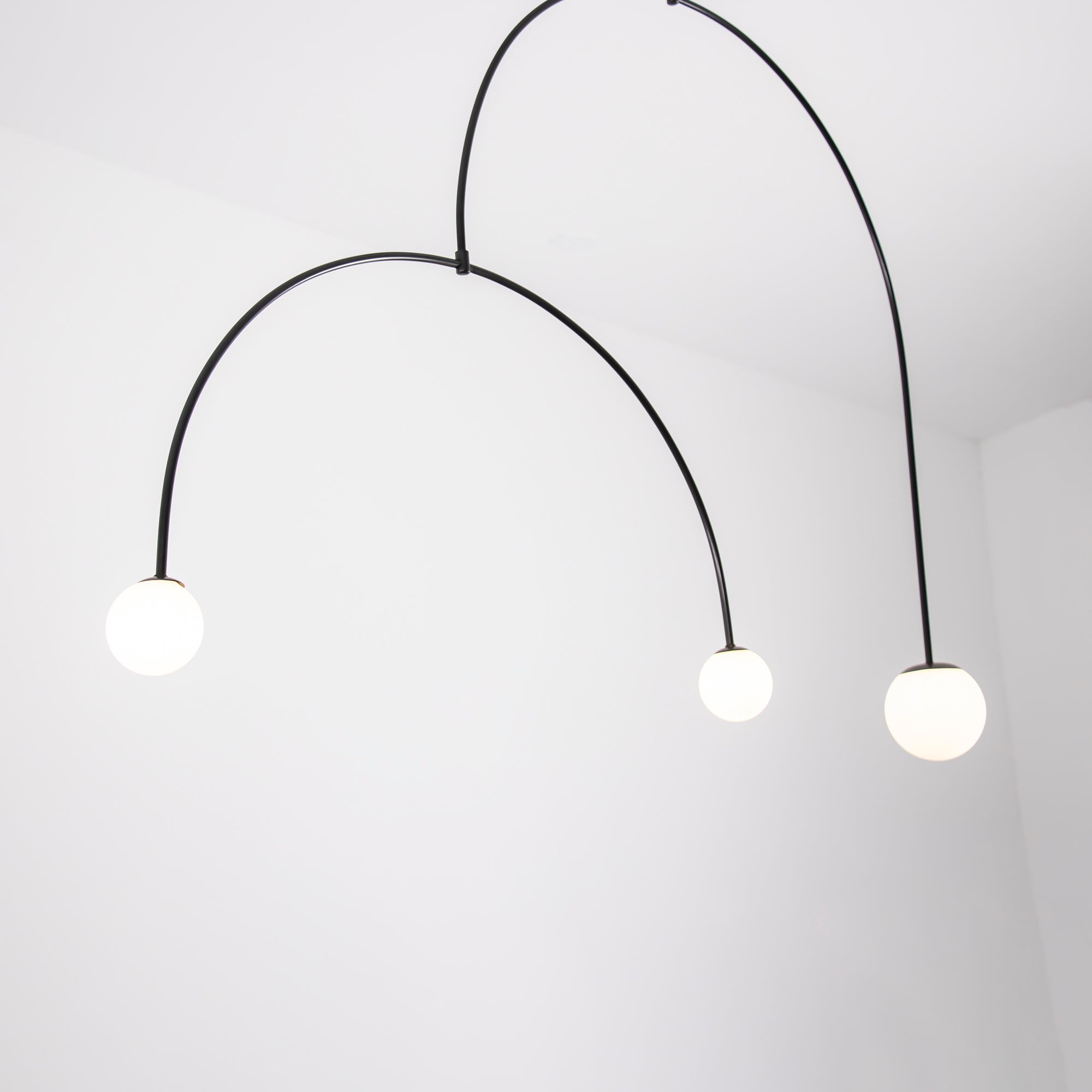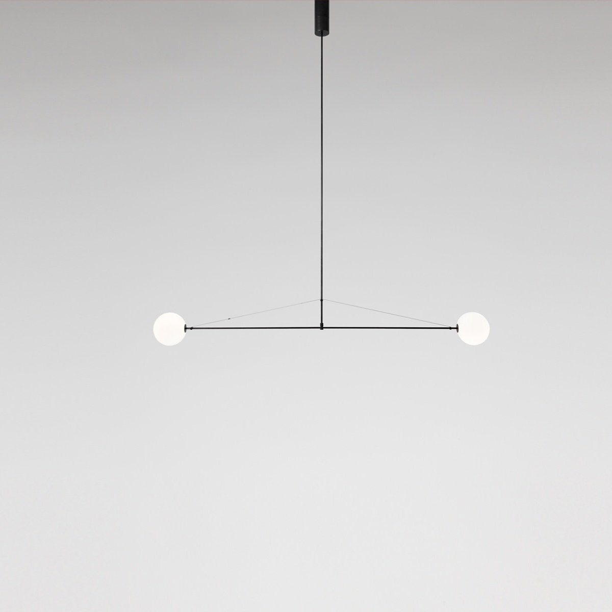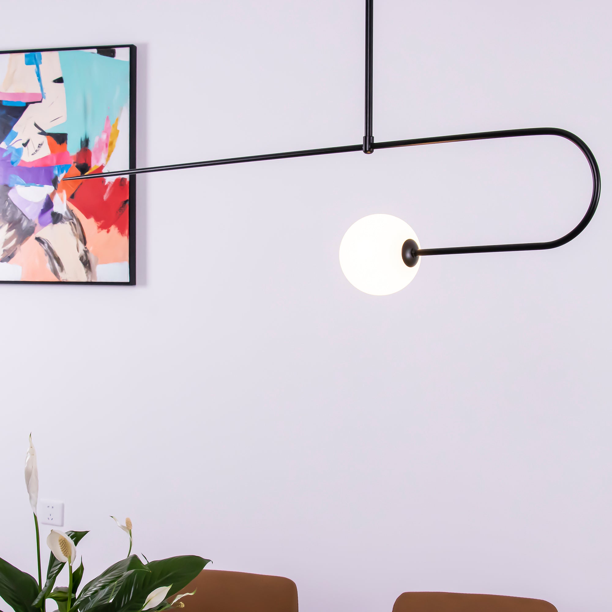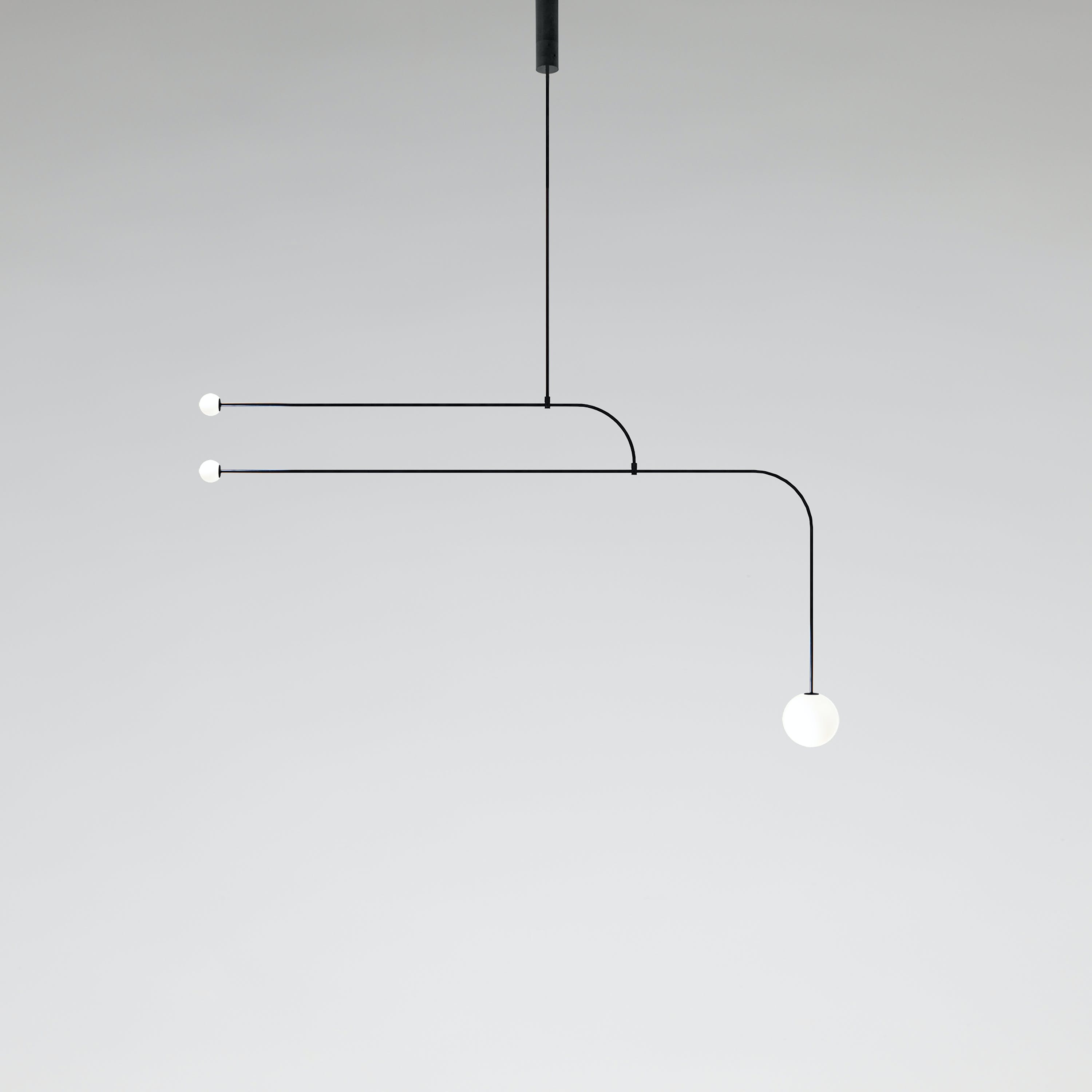 This lighting reveals a minimalist design with very graphic and uncluttered forms. These lines in the air have several sources of warm light, with diffusers in an opaline-blown glass.