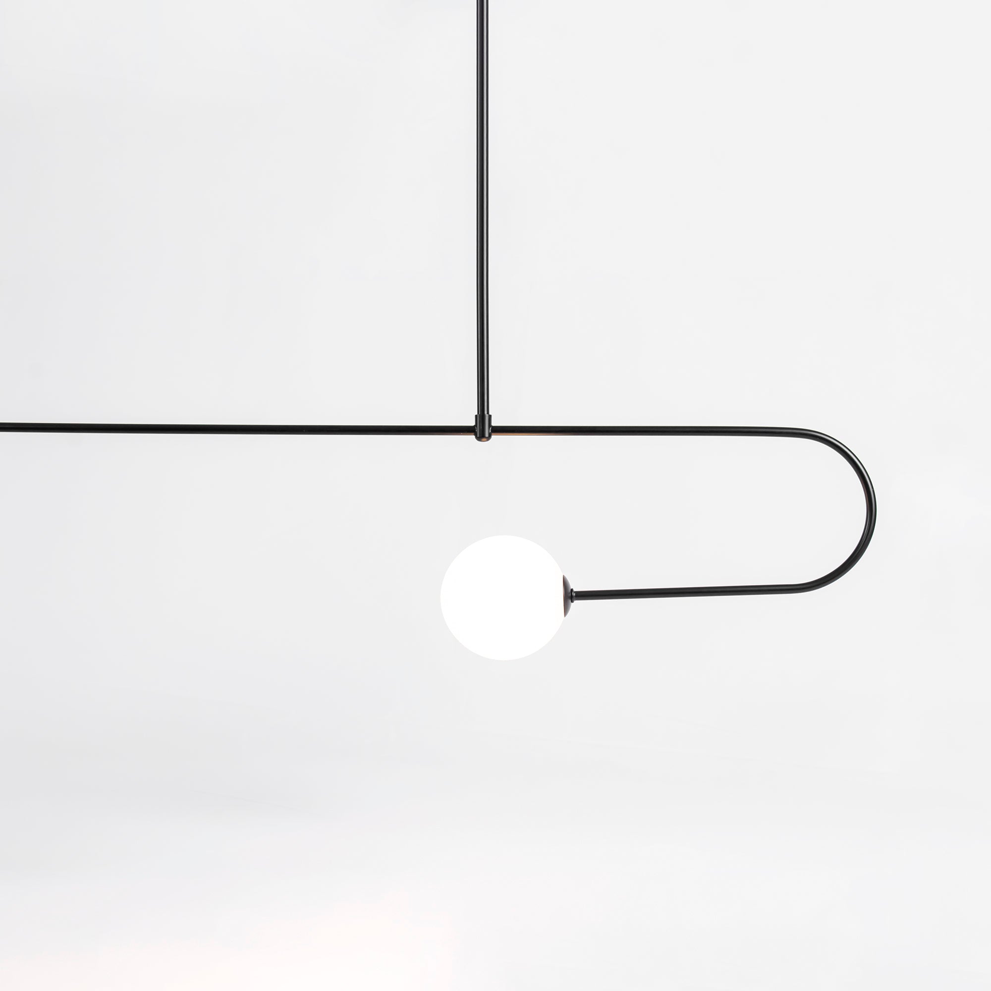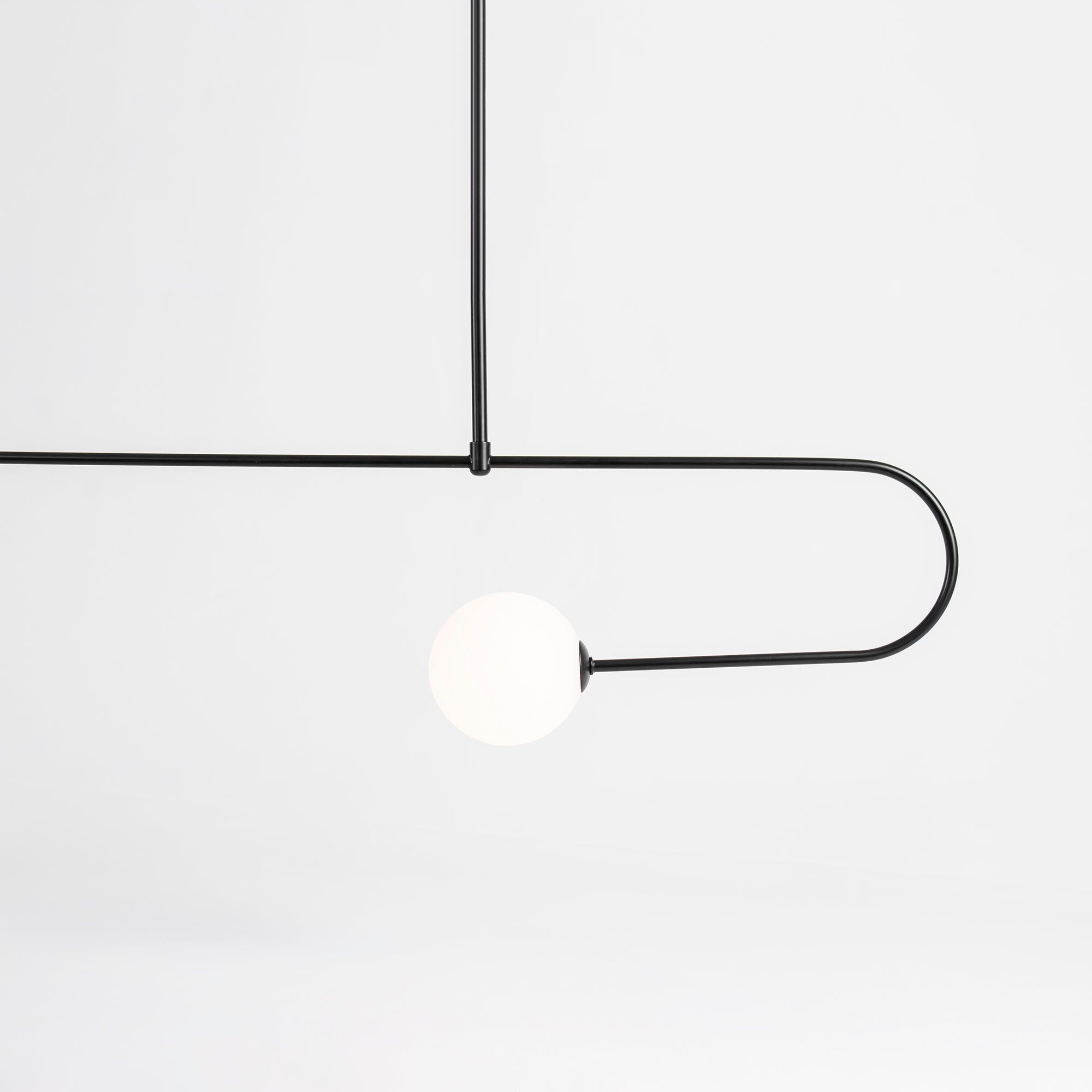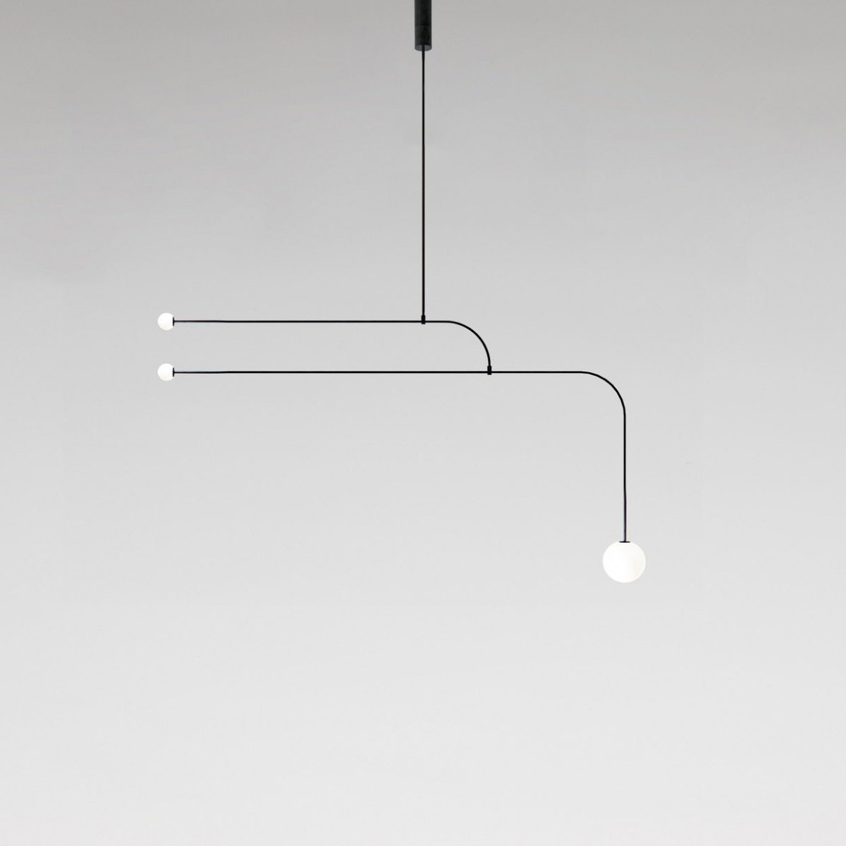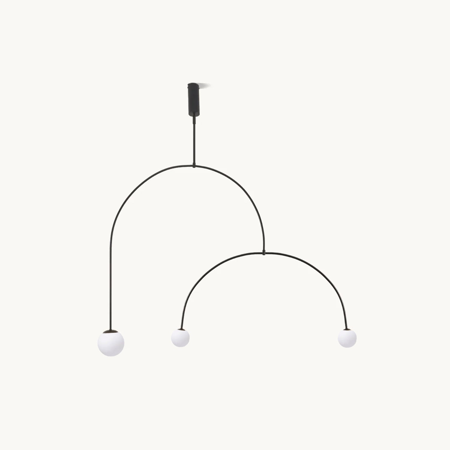 This lighting reveals a minimalist design with very graphic and uncluttered forms. These lines in the air have several sources of warm light, with diffusers in an opaline-blown glass.