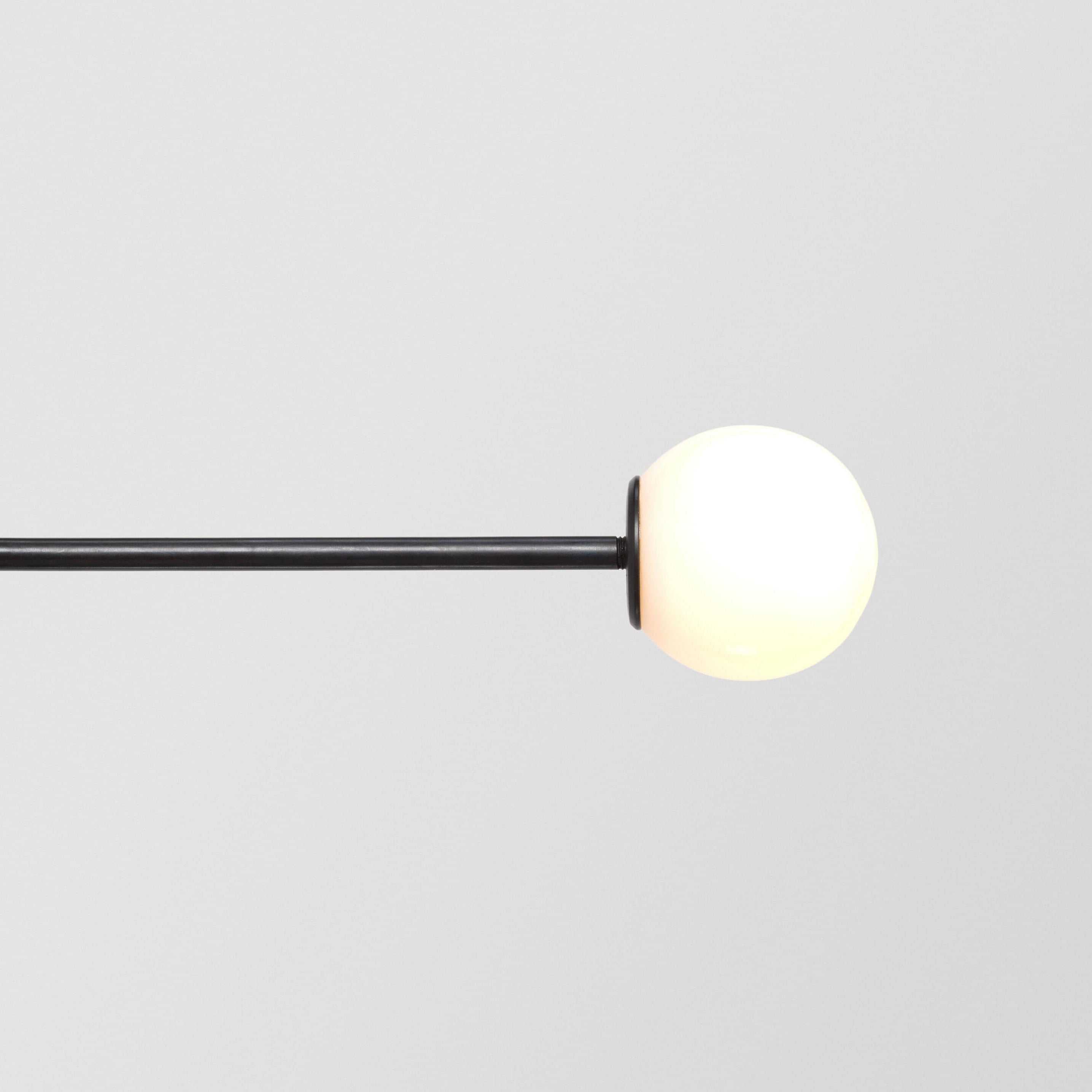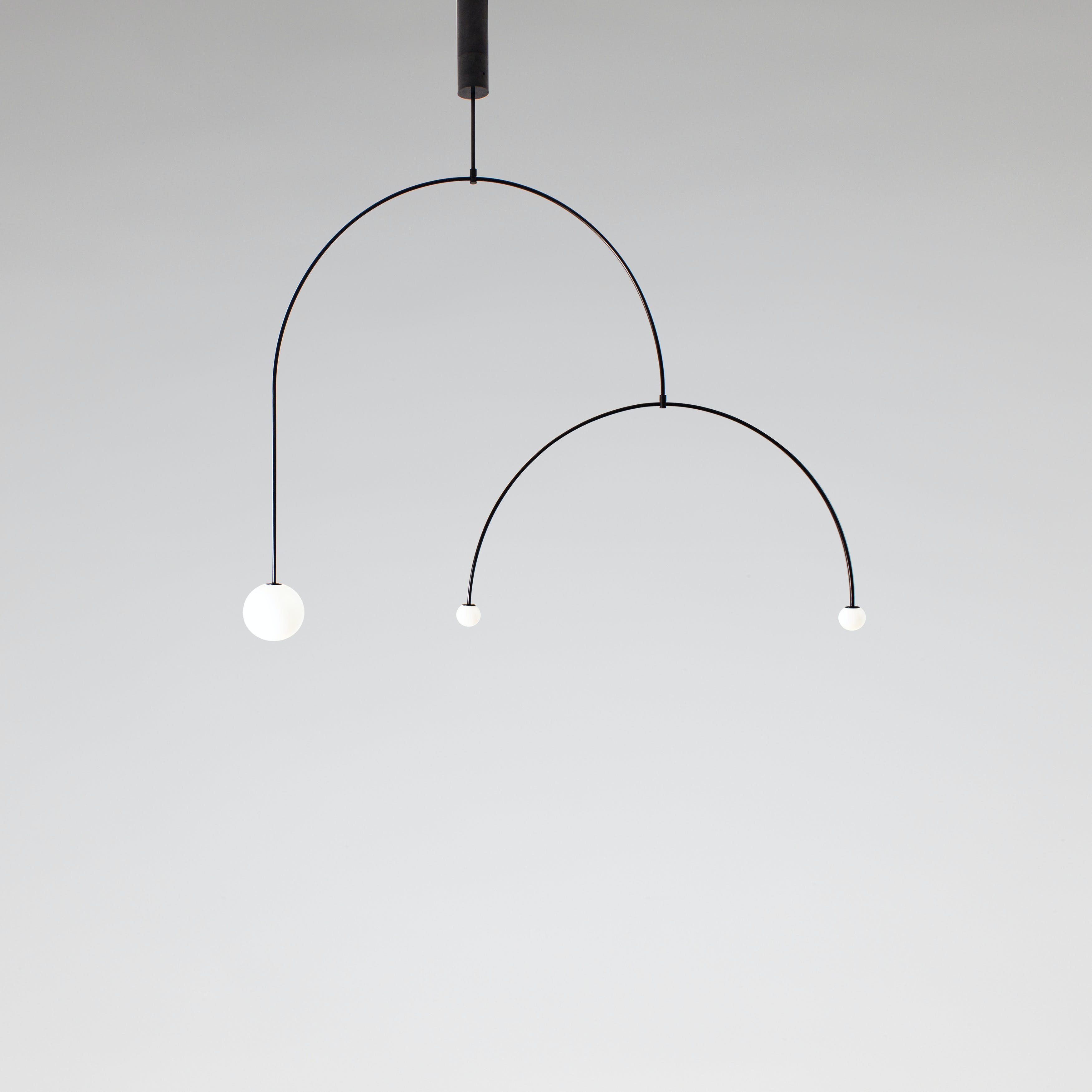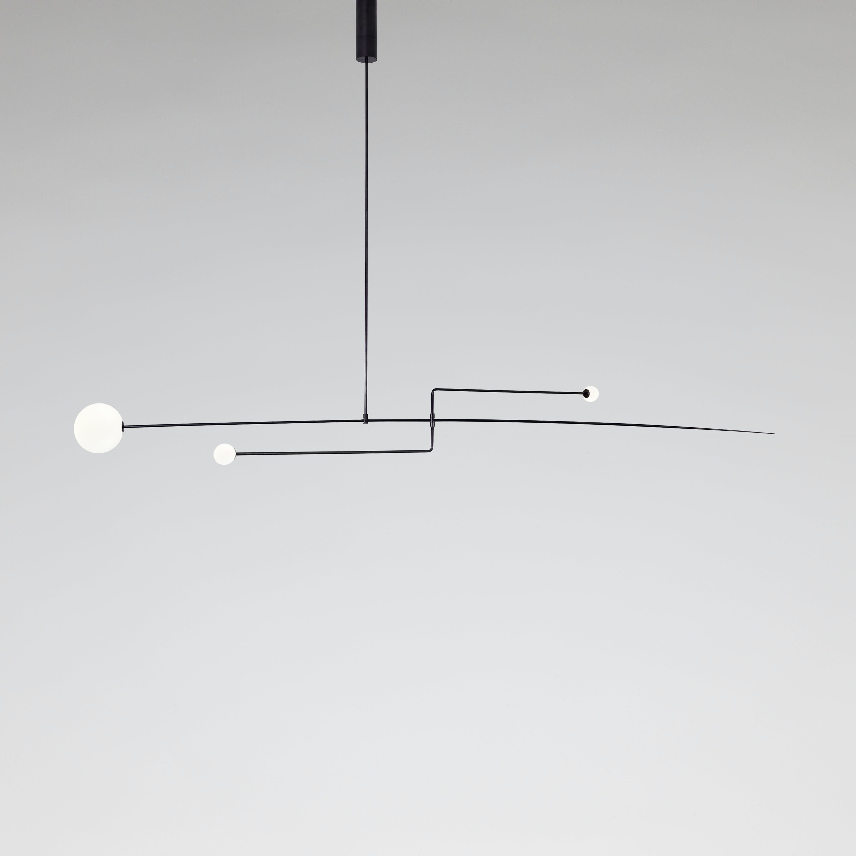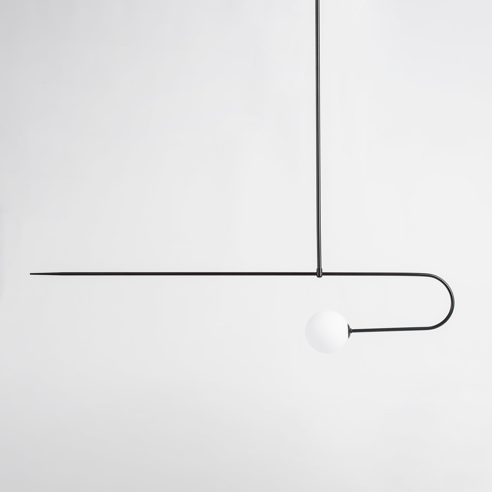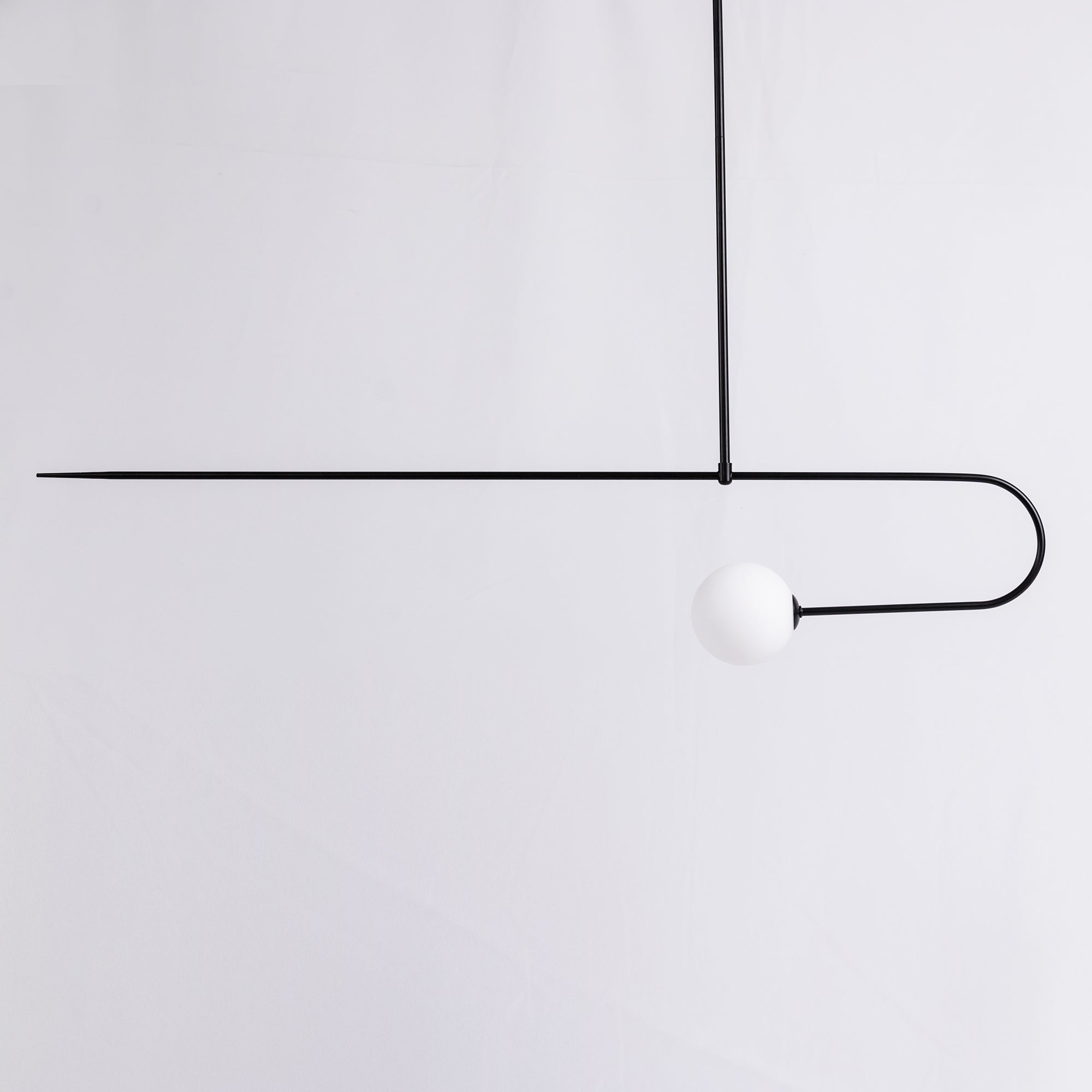 This lighting reveals a minimalist design with very graphic and uncluttered forms. These lines in the air have several sources of warm light, with diffusers in an opaline-blown glass.