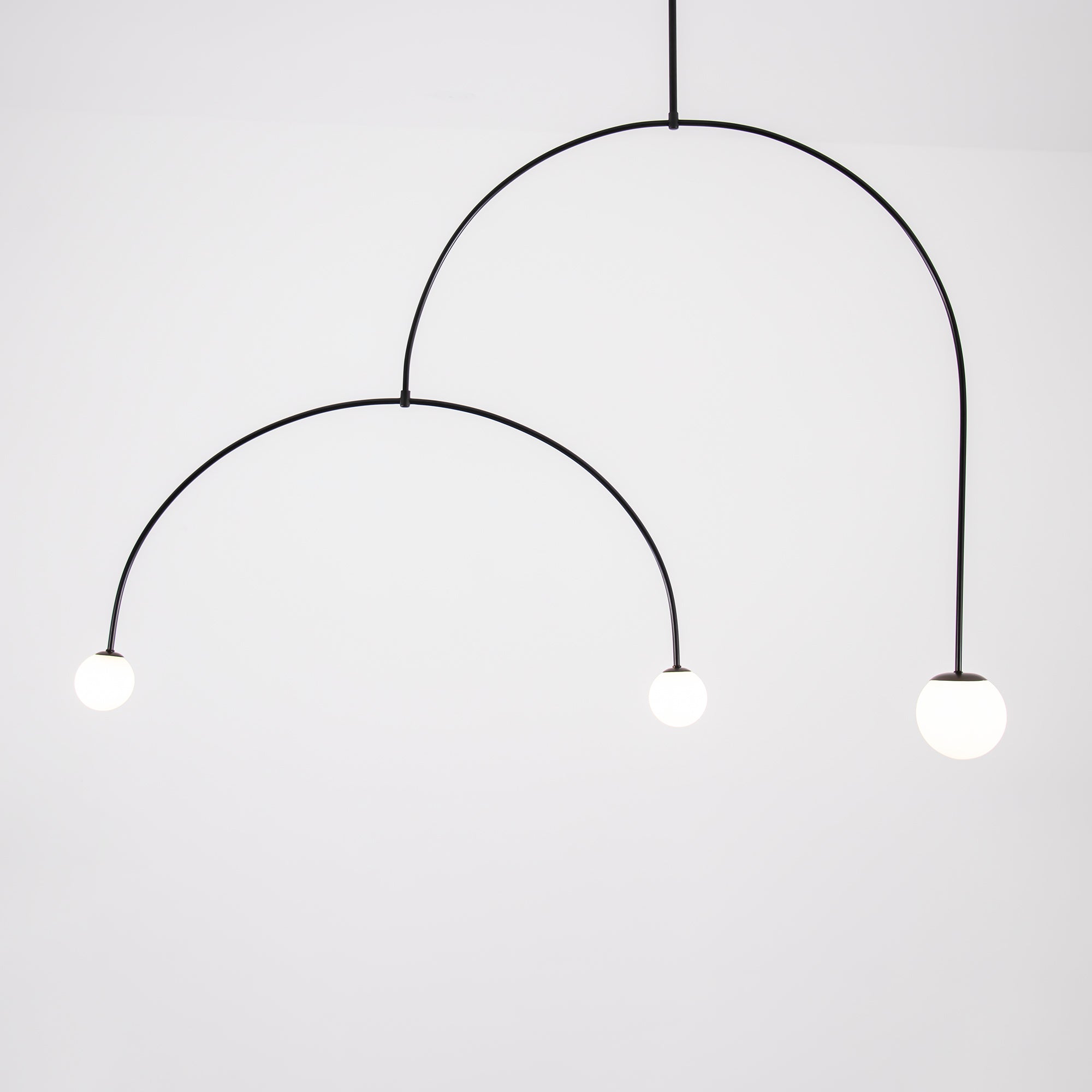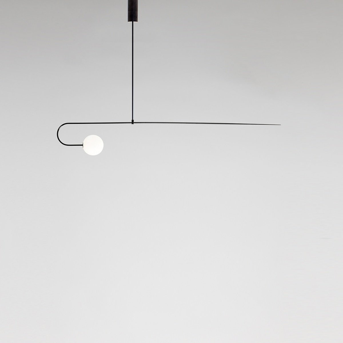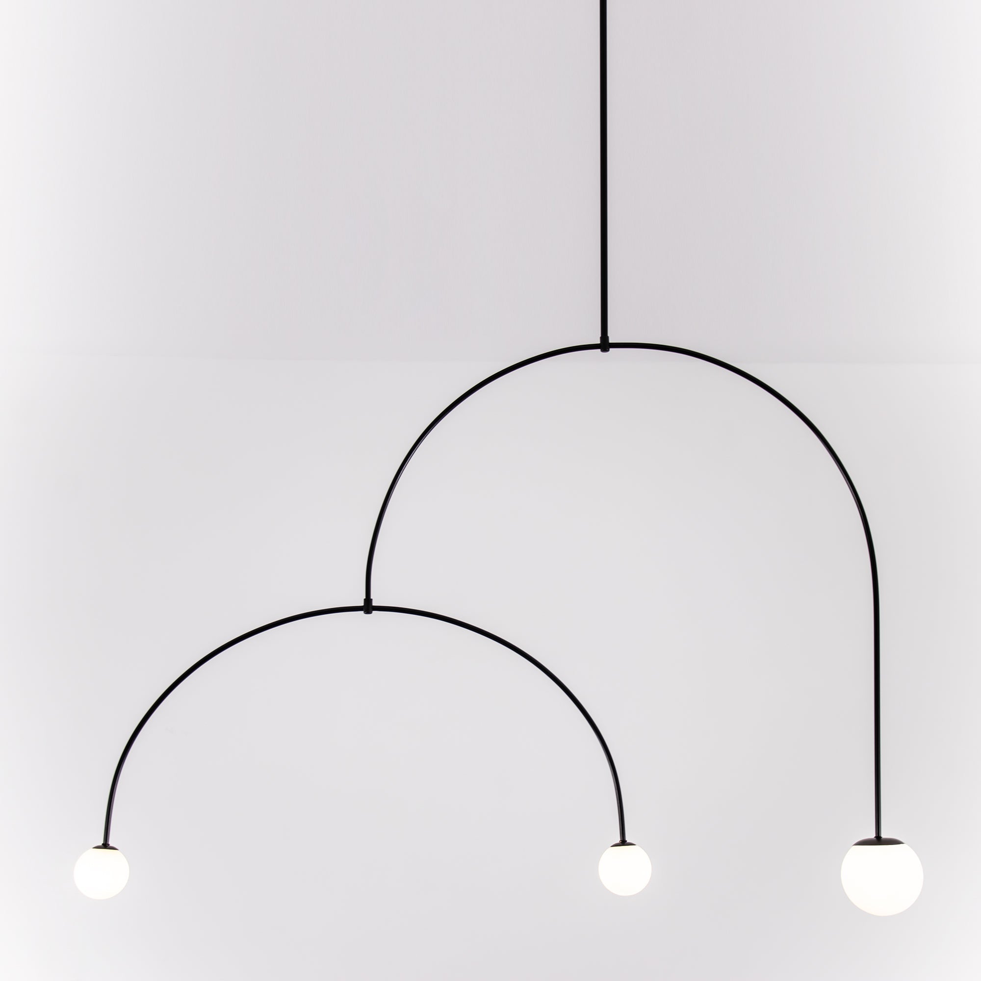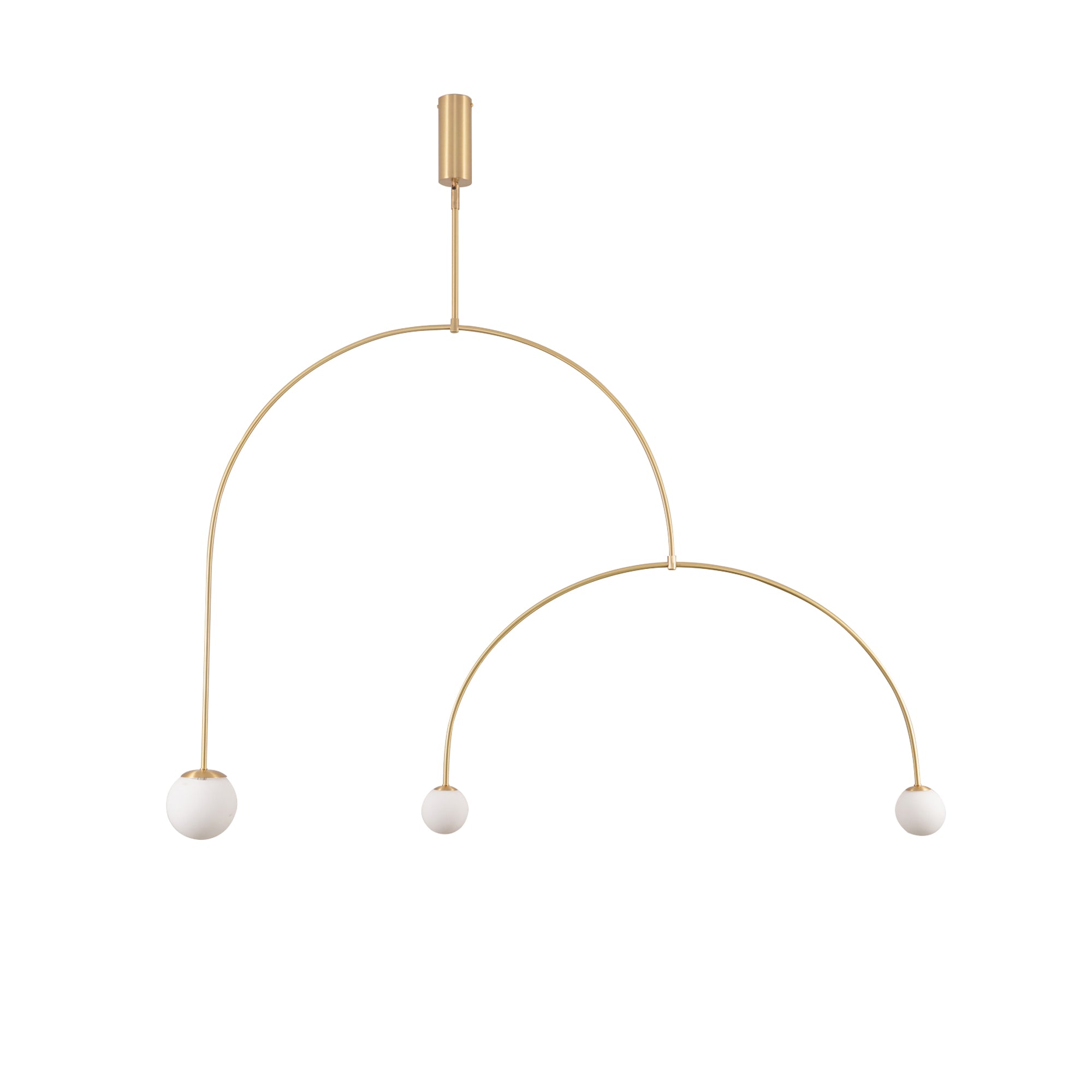 This lighting reveals a minimalist design with very graphic and uncluttered forms. These lines in the air have several sources of warm light, with diffusers in an opaline-blown glass.