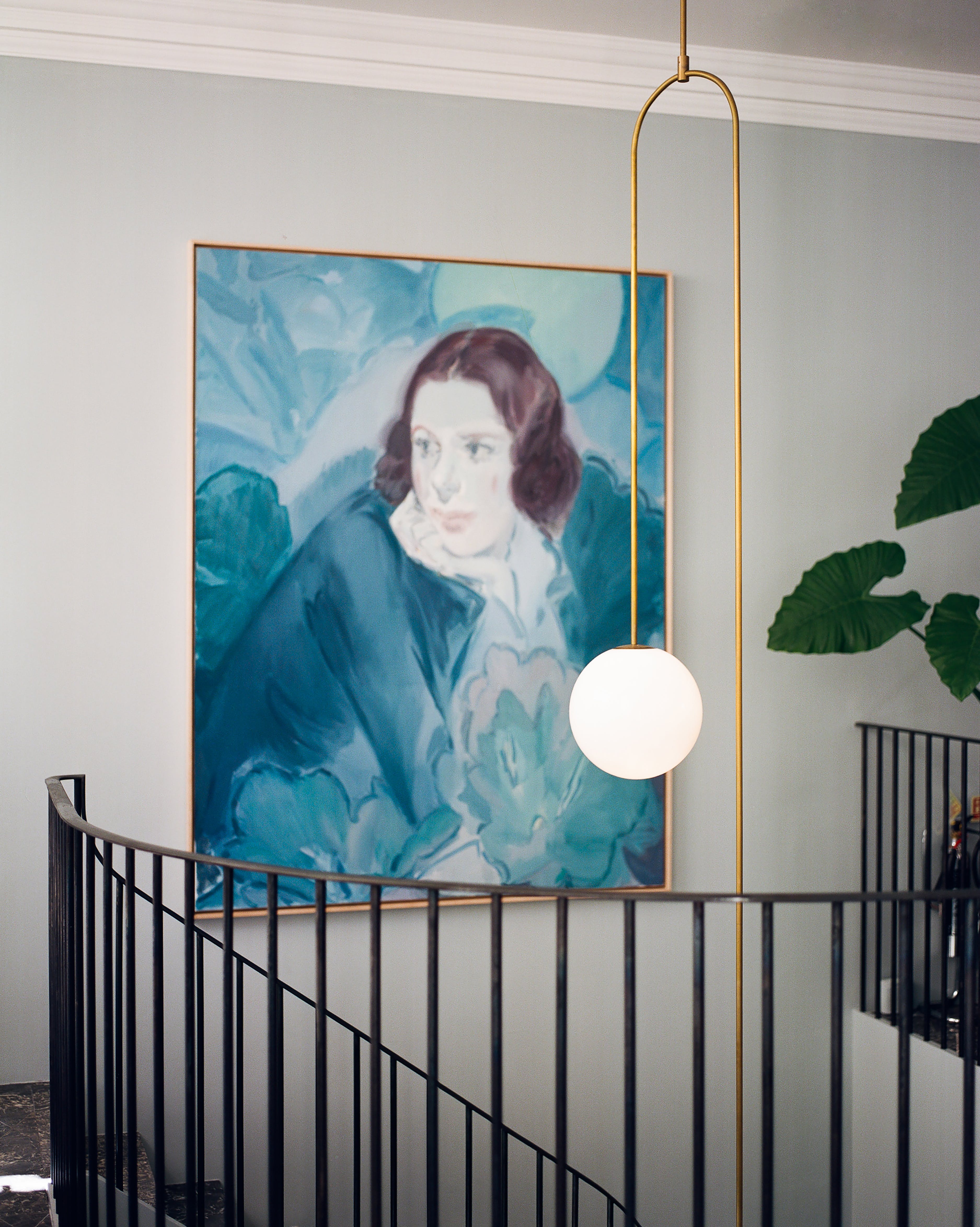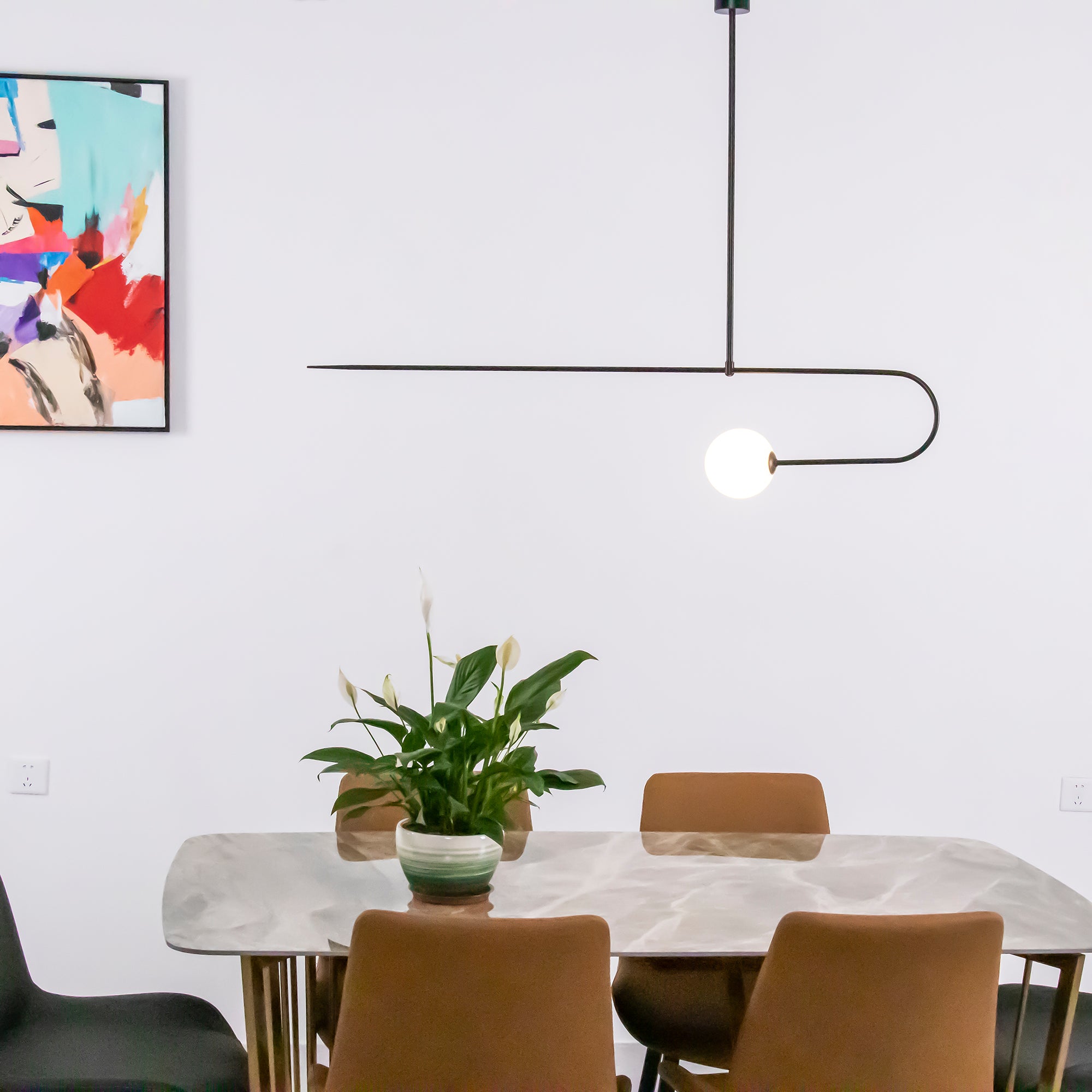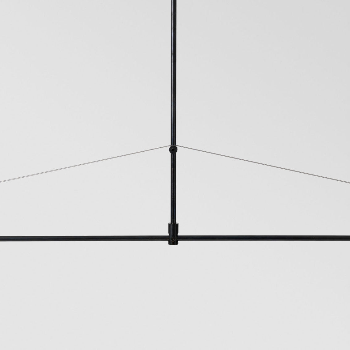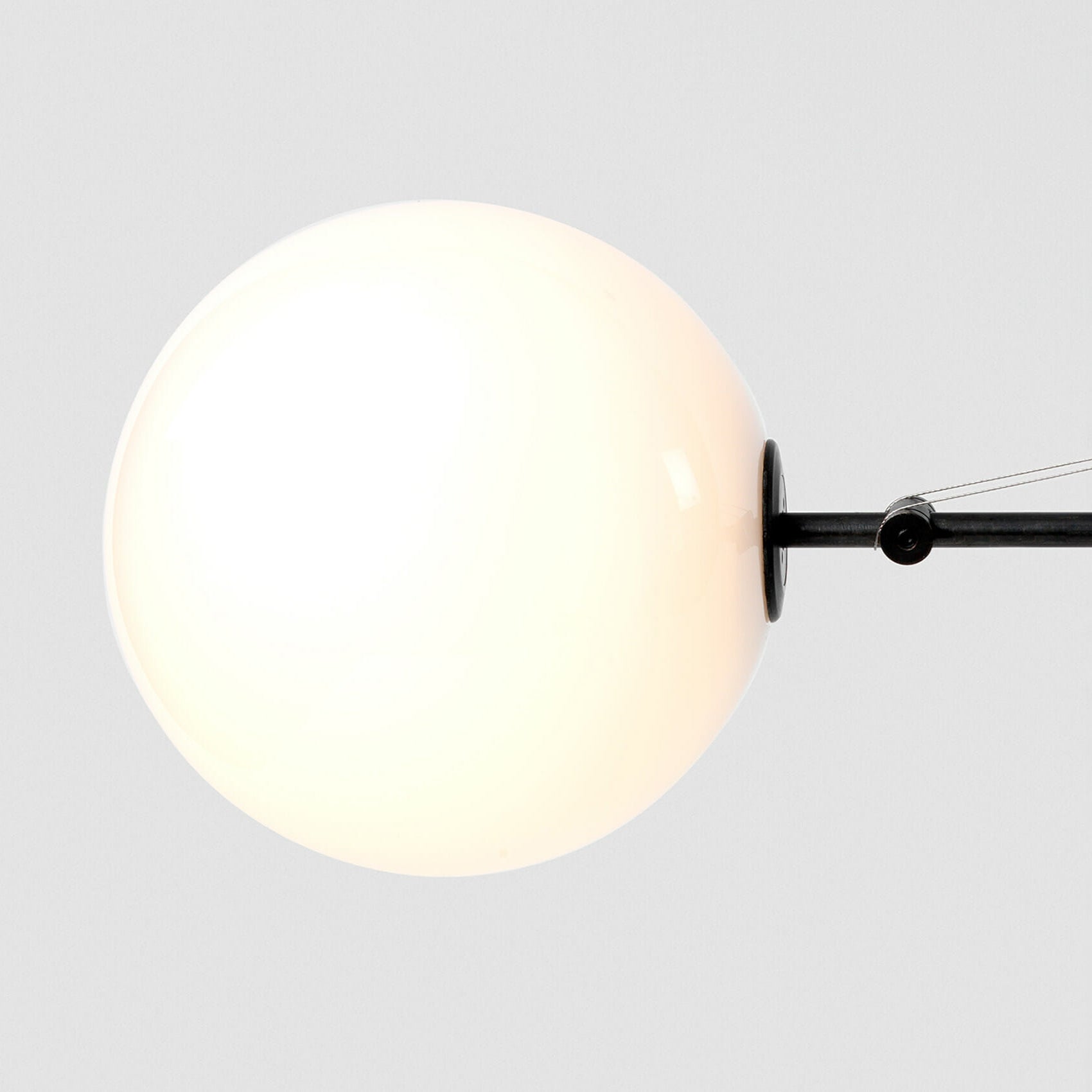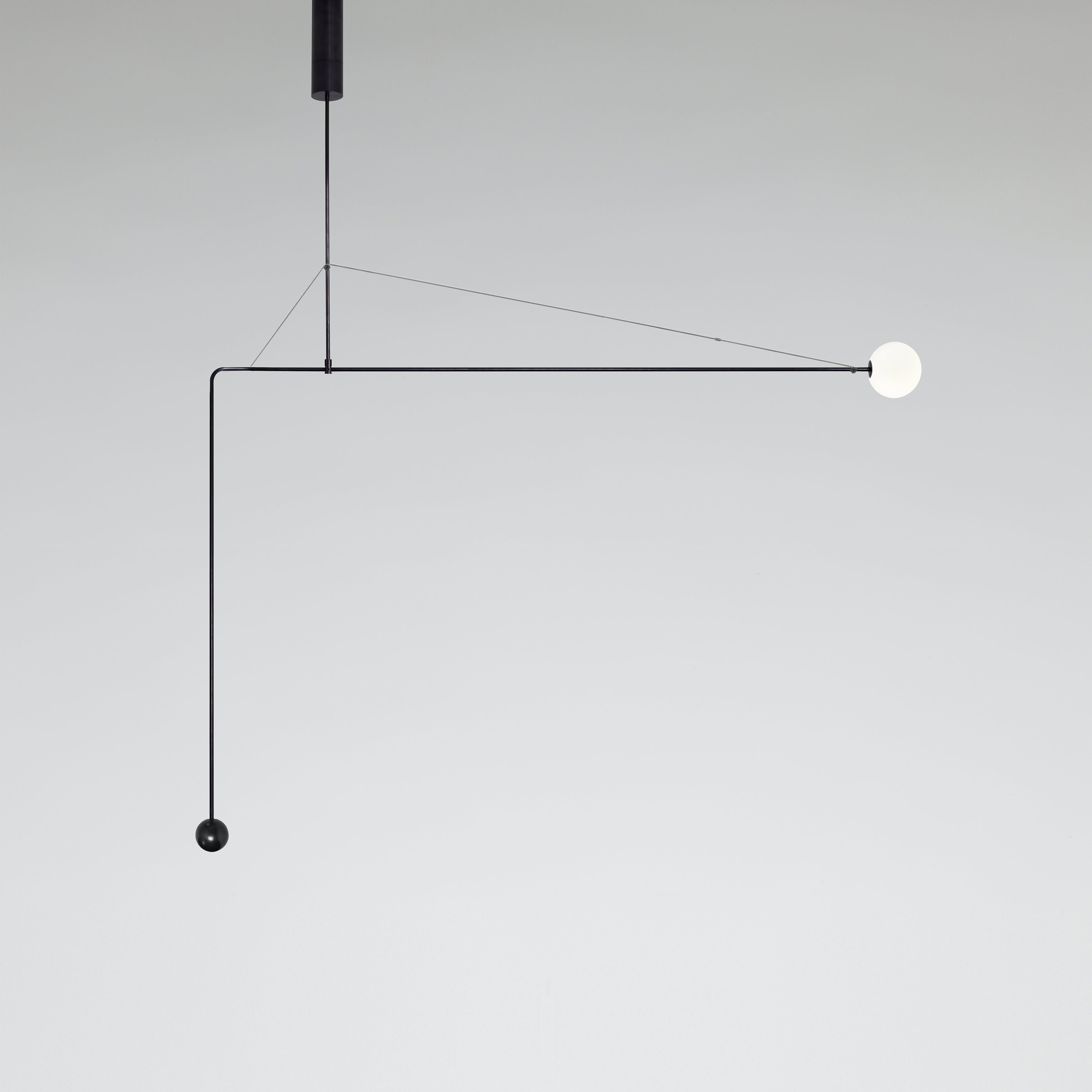 This lighting reveals a minimalist design with very graphic and uncluttered forms. These lines in the air have several sources of warm light, with diffusers in an opaline-blown glass.