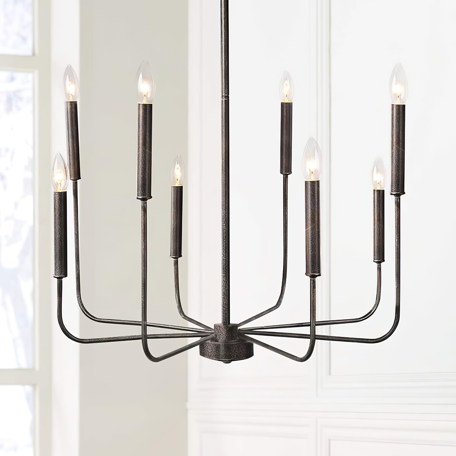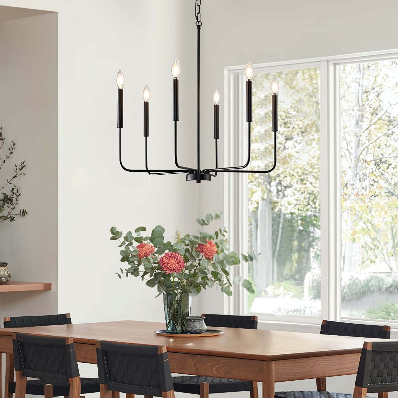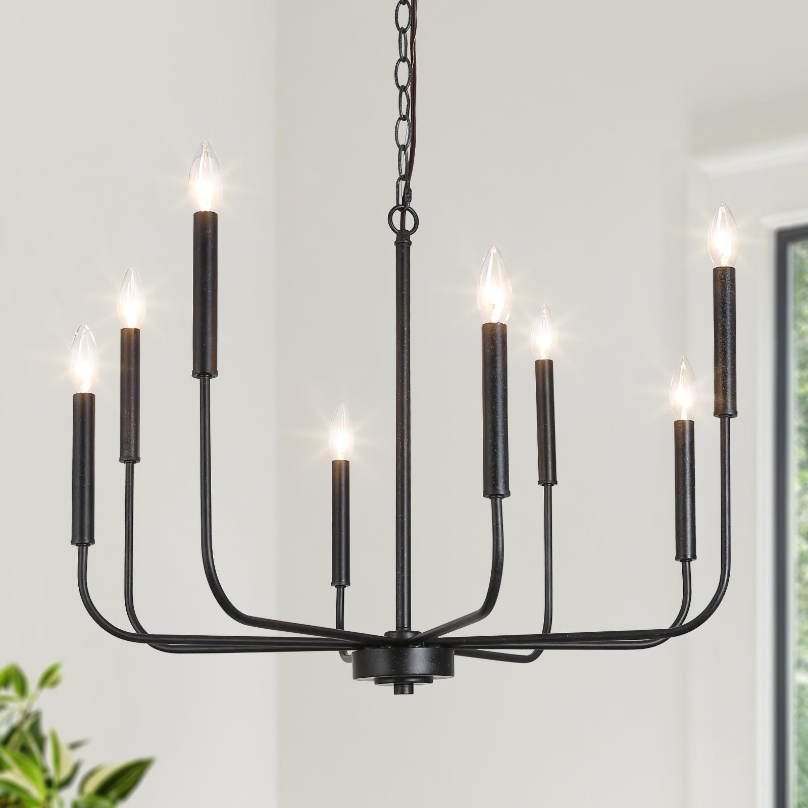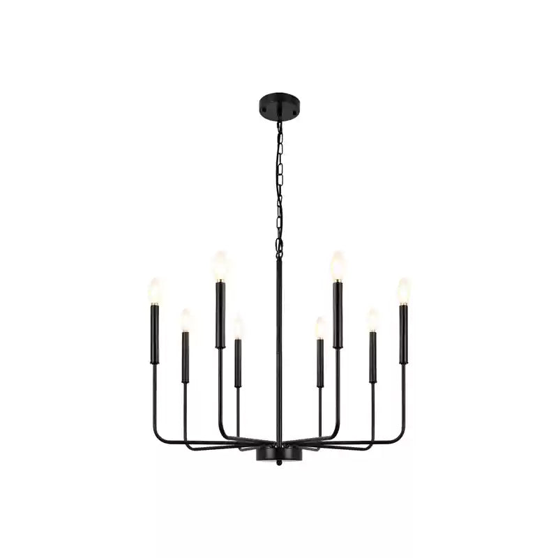 This modern black candlestick chandelier provides soft lighting perfect for any dining experience. Its sleek design adds a touch of sophistication to any room while creating a warm and inviting atmosphere. Elevate your dining experience with this elegant chandelier.