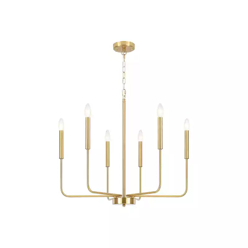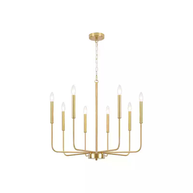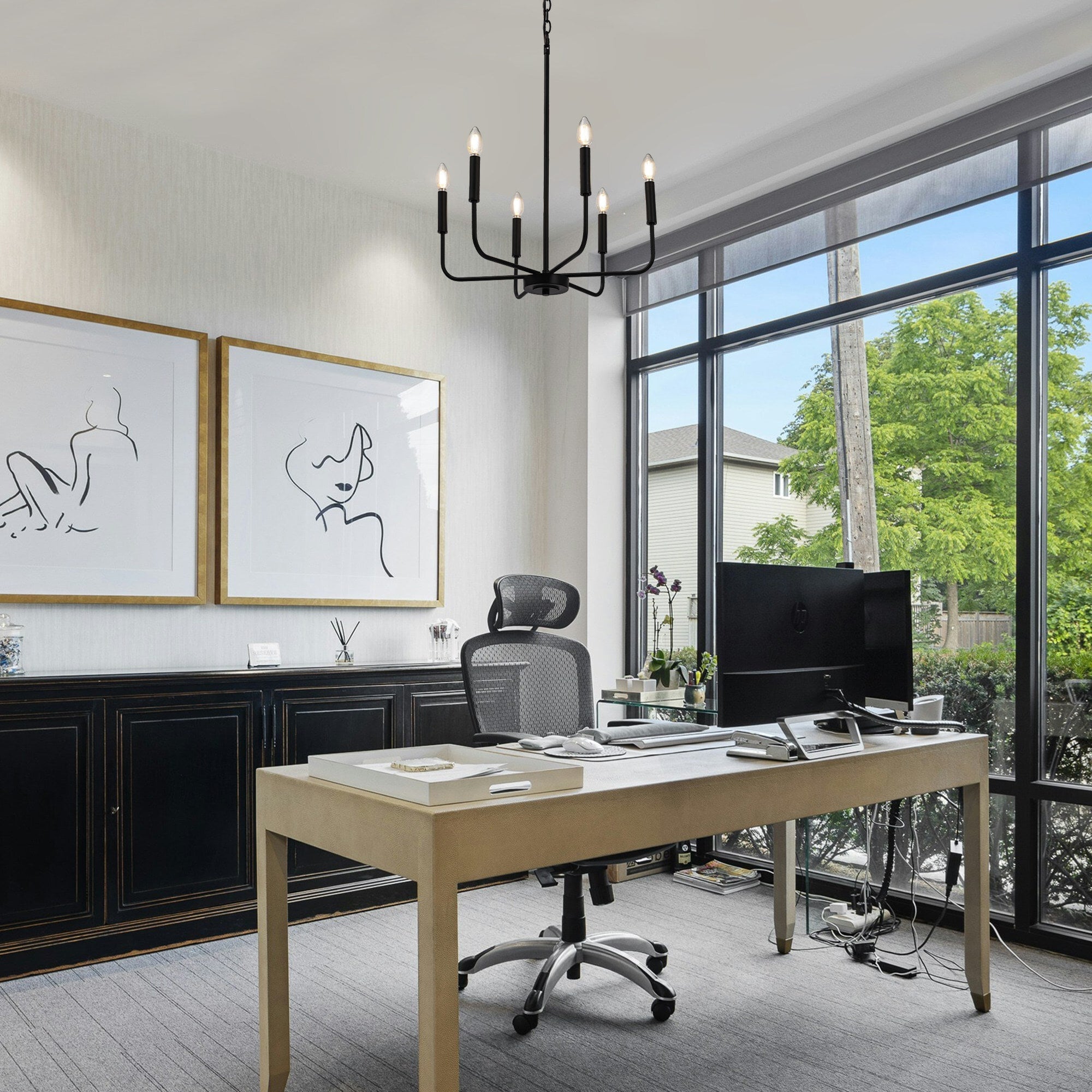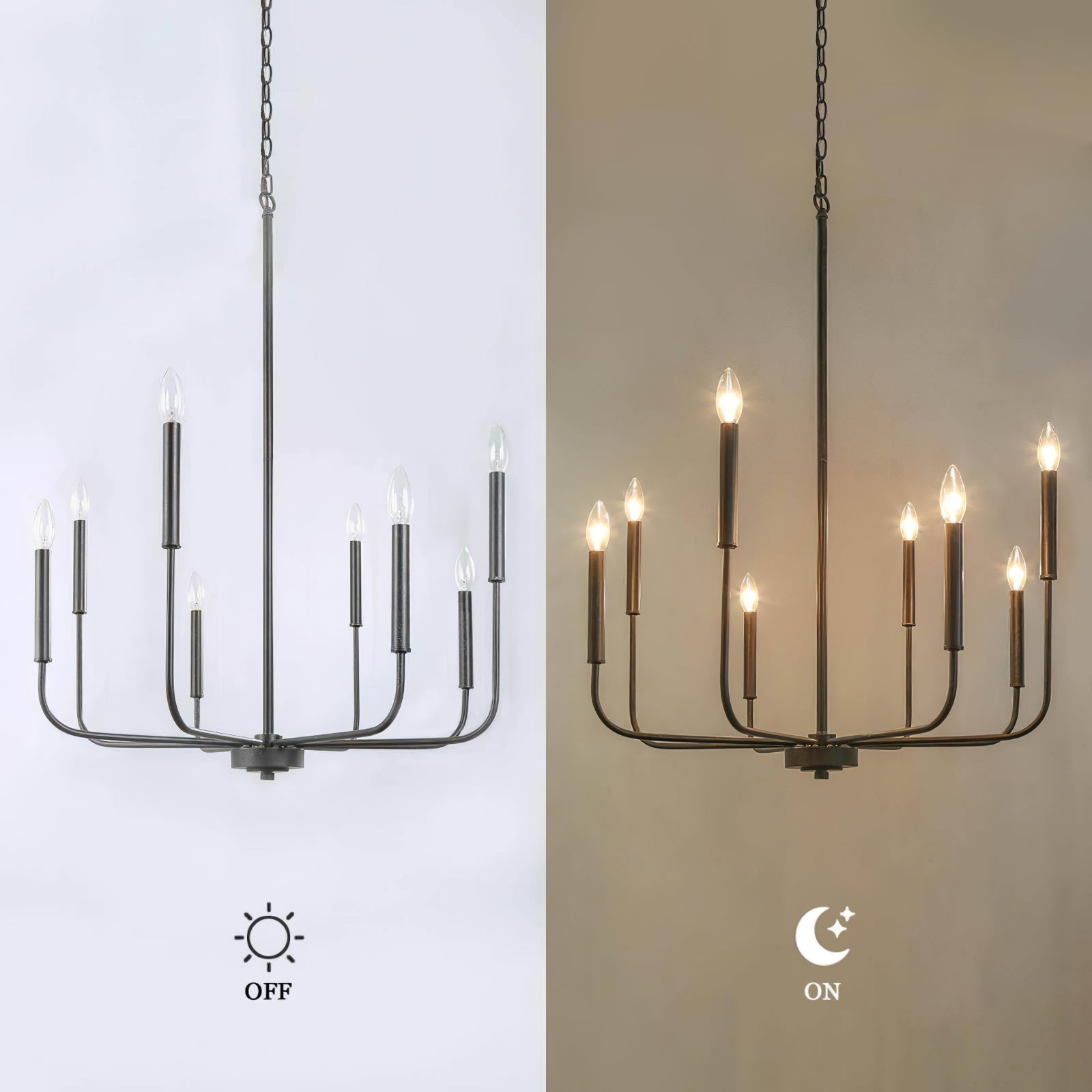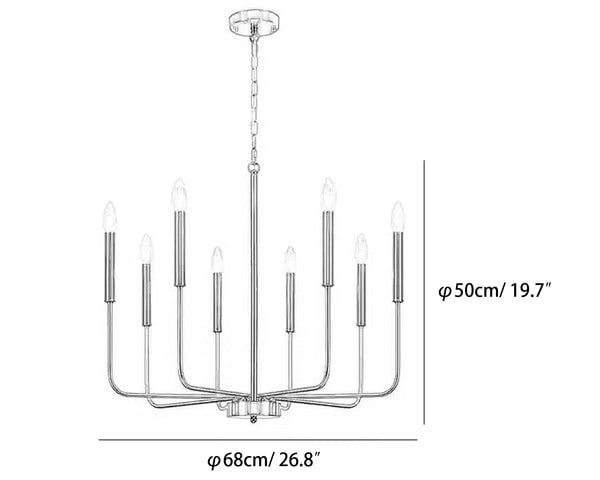 This modern black candlestick chandelier provides soft lighting perfect for any dining experience. Its sleek design adds a touch of sophistication to any room while creating a warm and inviting atmosphere. Elevate your dining experience with this elegant chandelier.