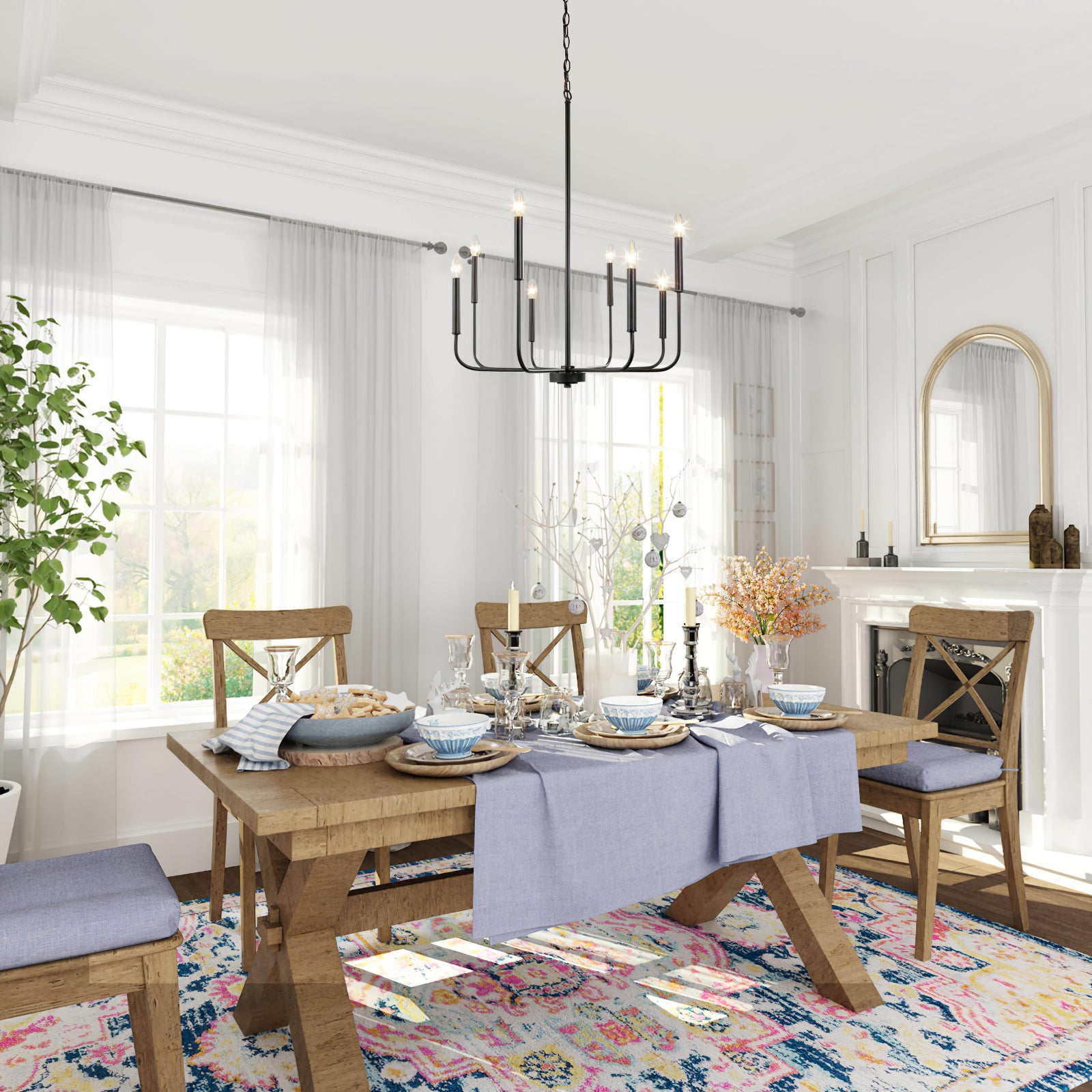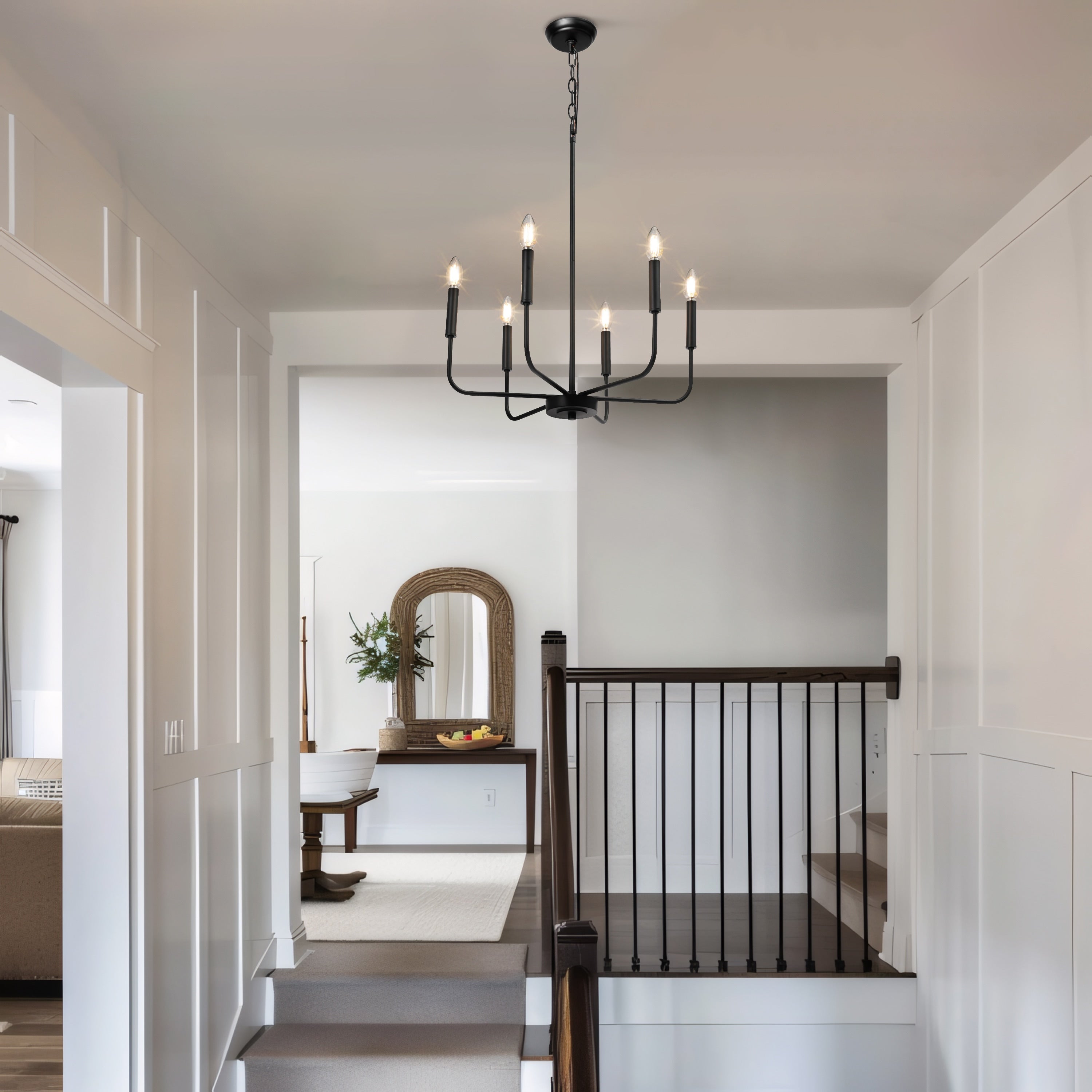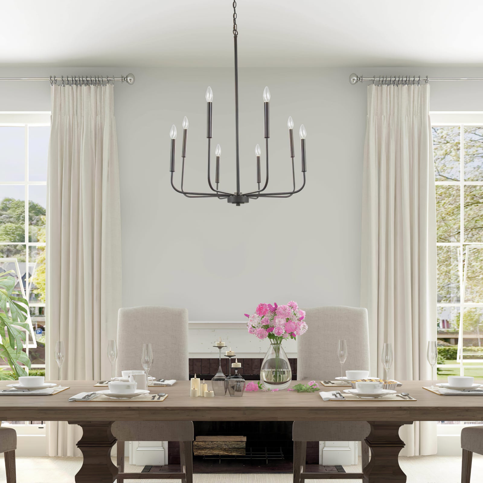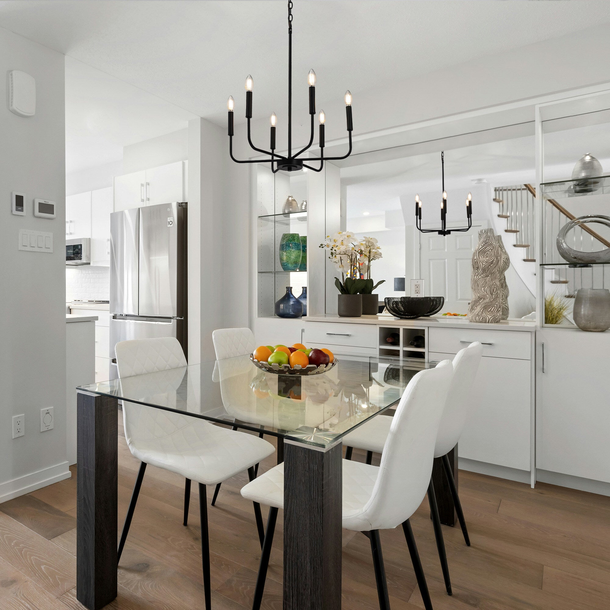 This modern black candlestick chandelier provides soft lighting perfect for any dining experience. Its sleek design adds a touch of sophistication to any room while creating a warm and inviting atmosphere. Elevate your dining experience with this elegant chandelier.