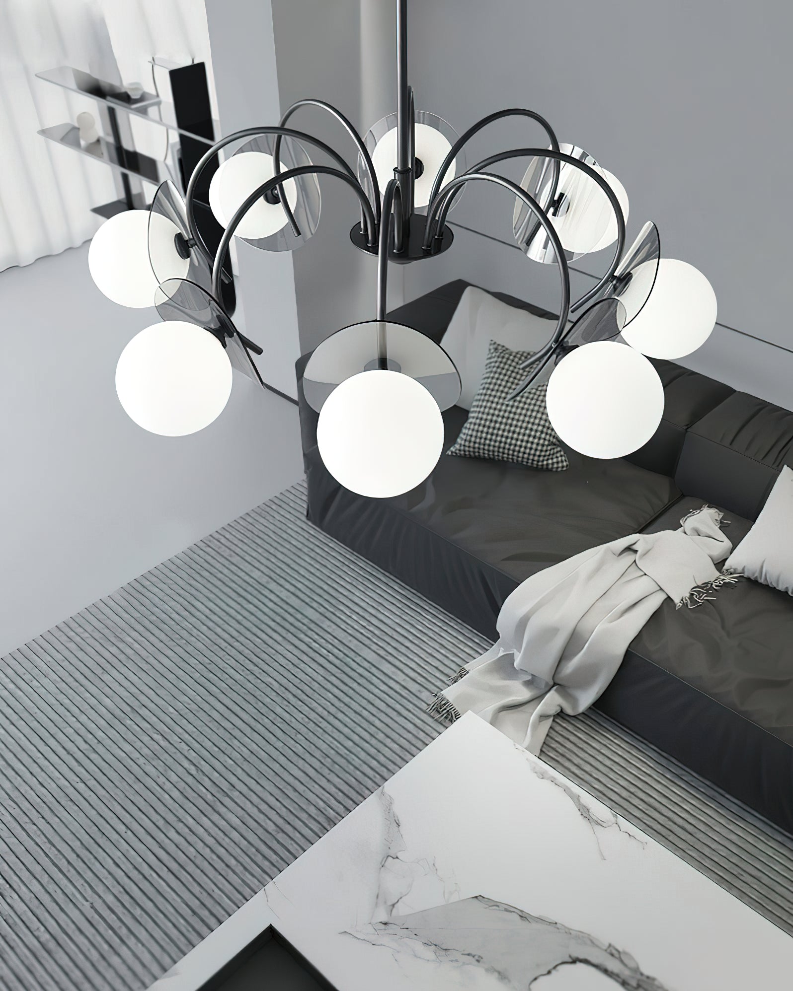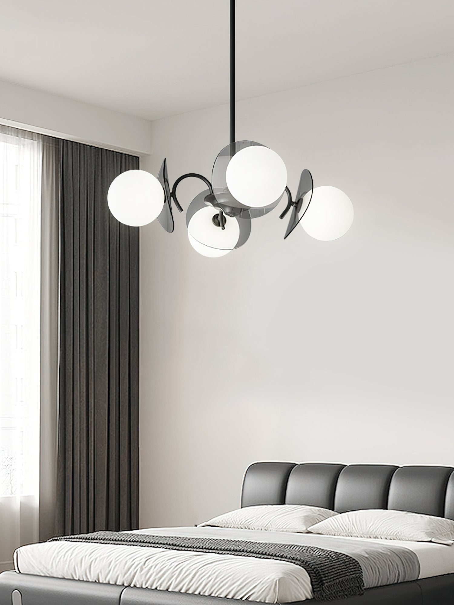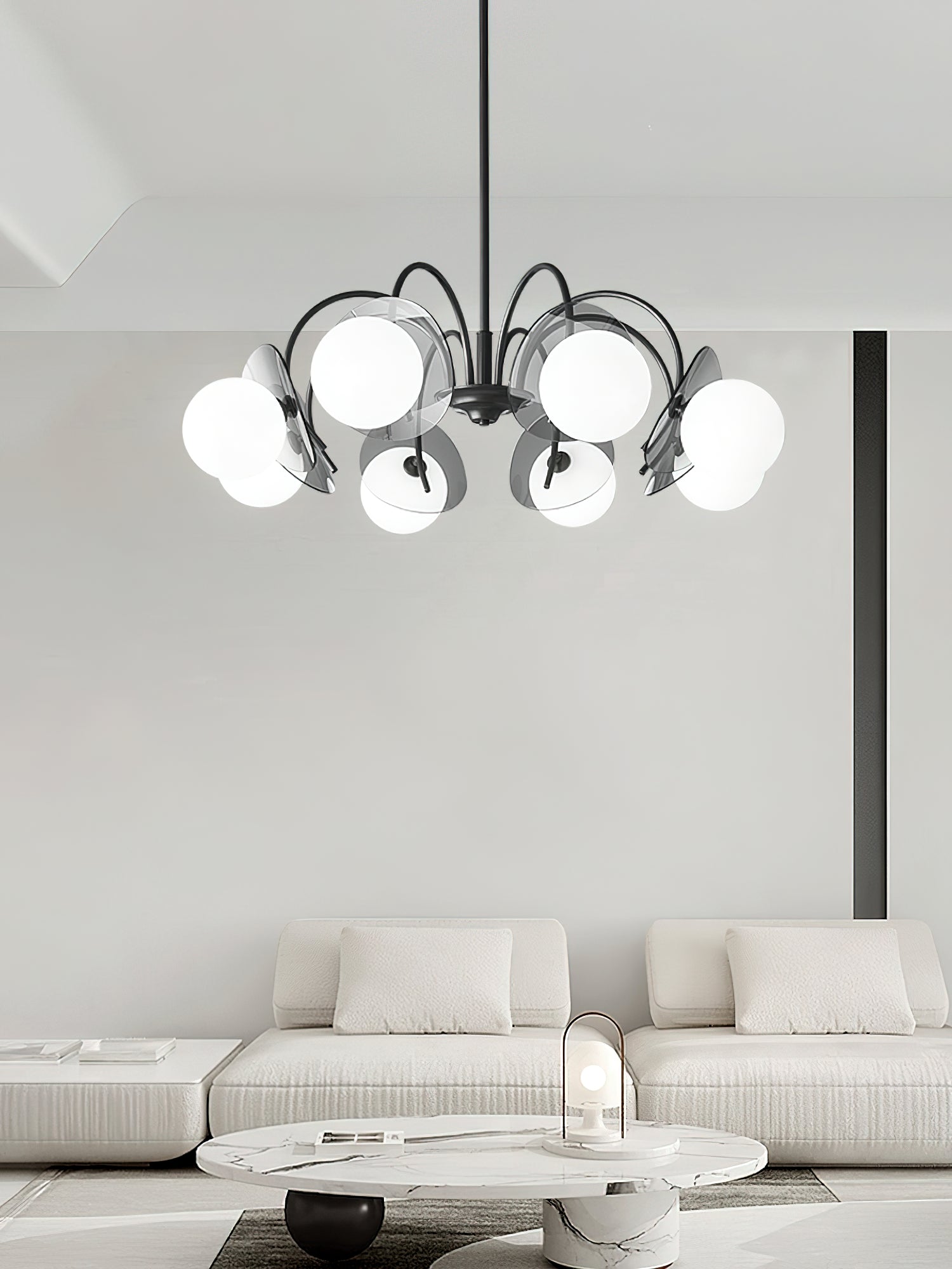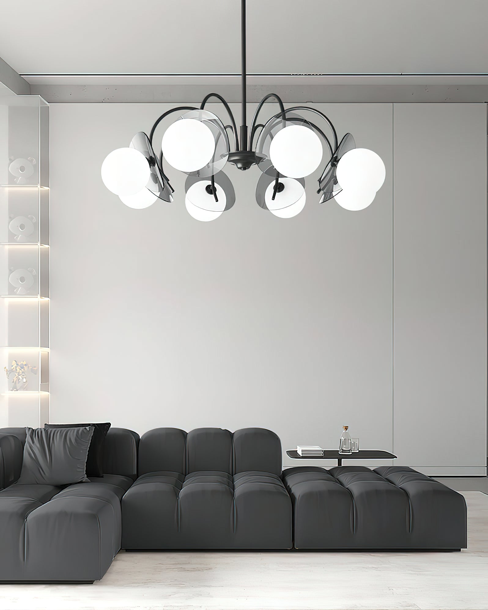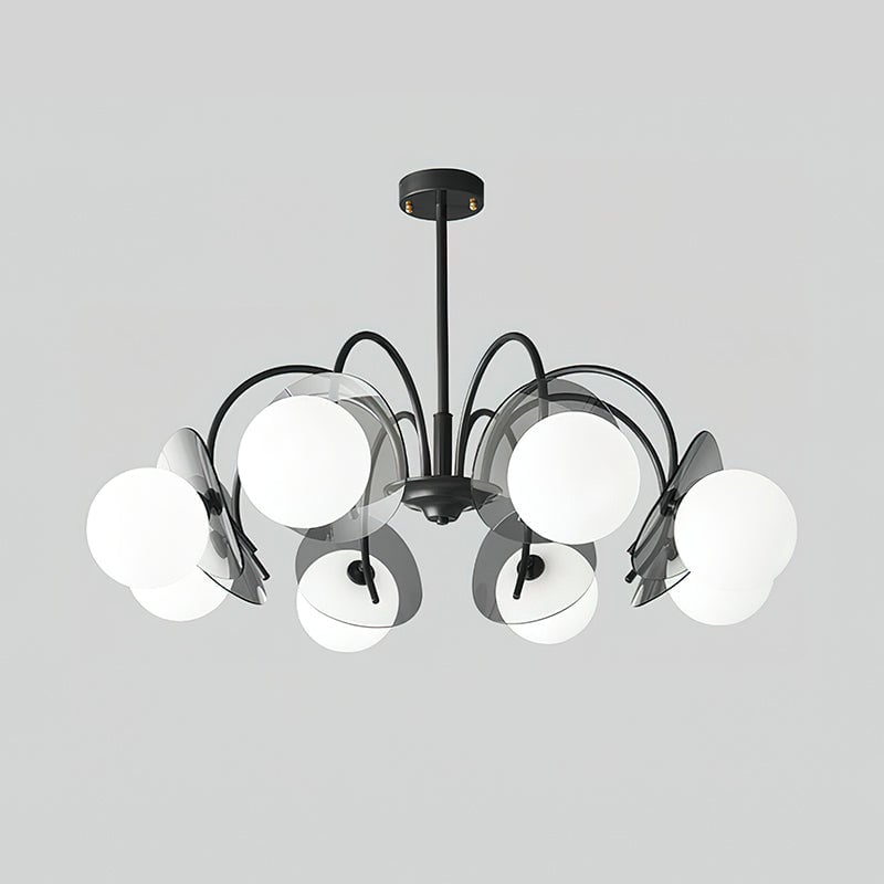 Unleash the allure of a solar eclipse in your home with our Molecular Spherical Glass Chandelier. A black frame and clear glass spheres create a captivating interplay of light and shadow, transforming any room into a modern and intriguing space. Perfect for living rooms, dining rooms, or entryways.